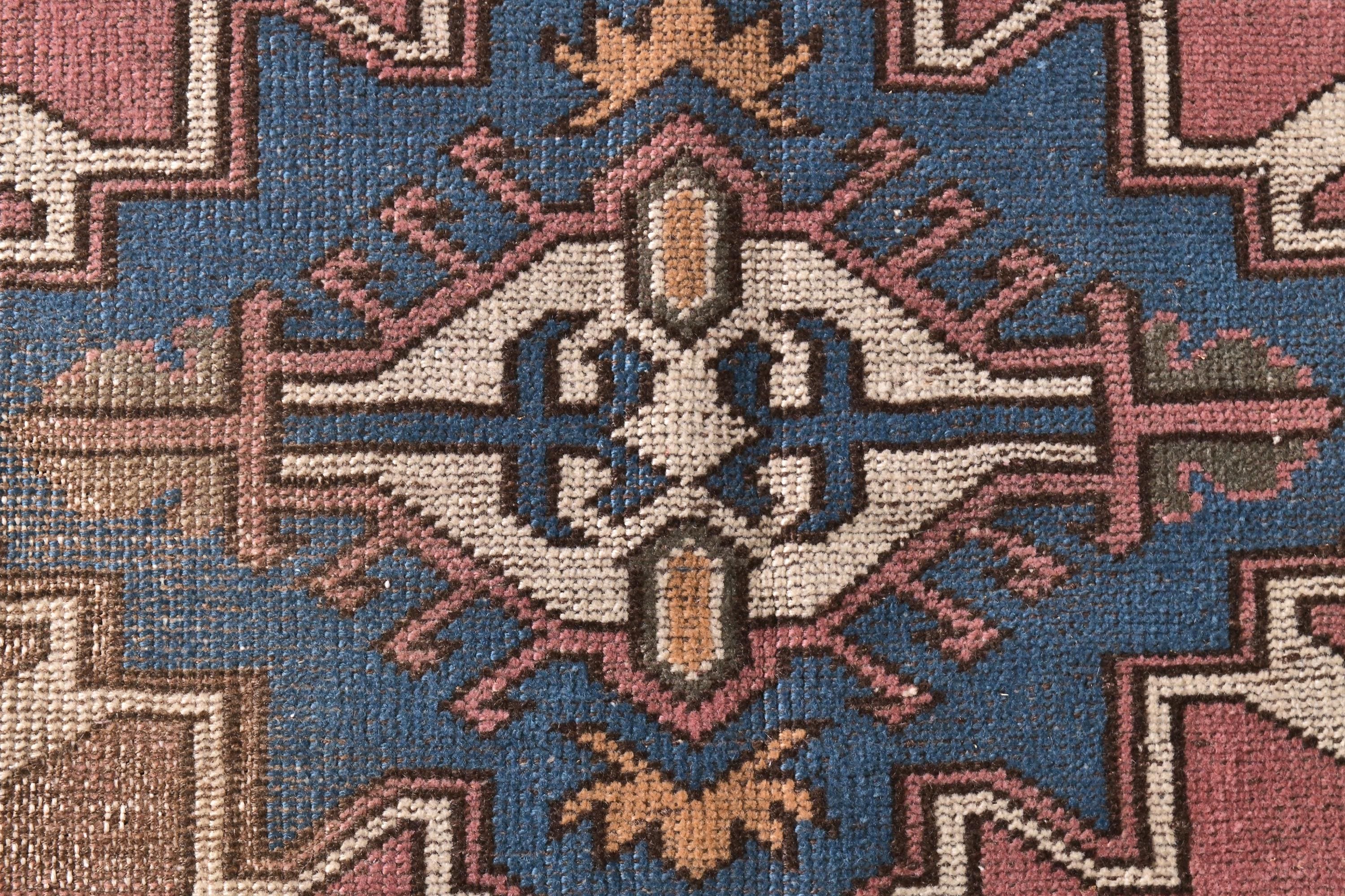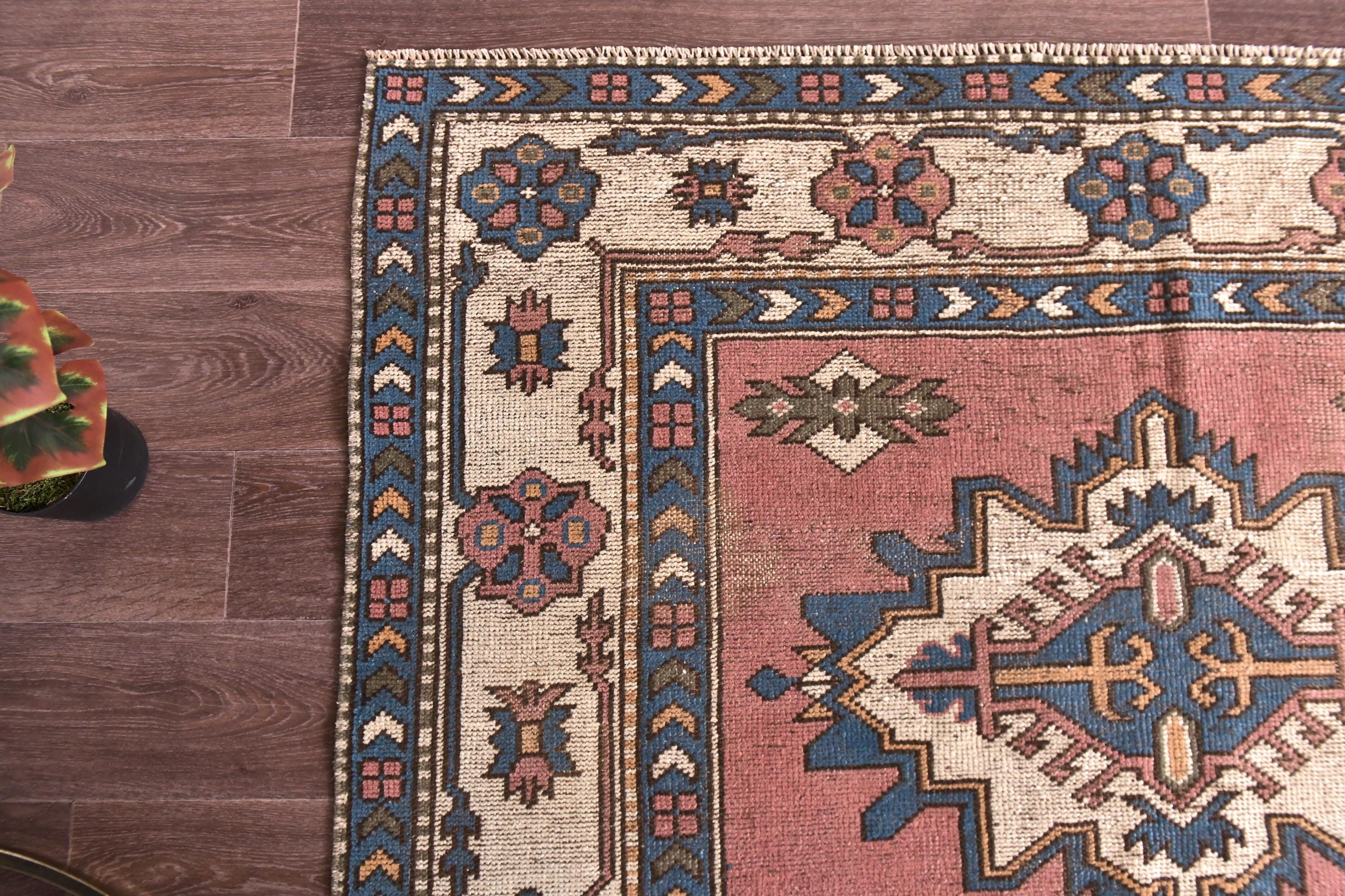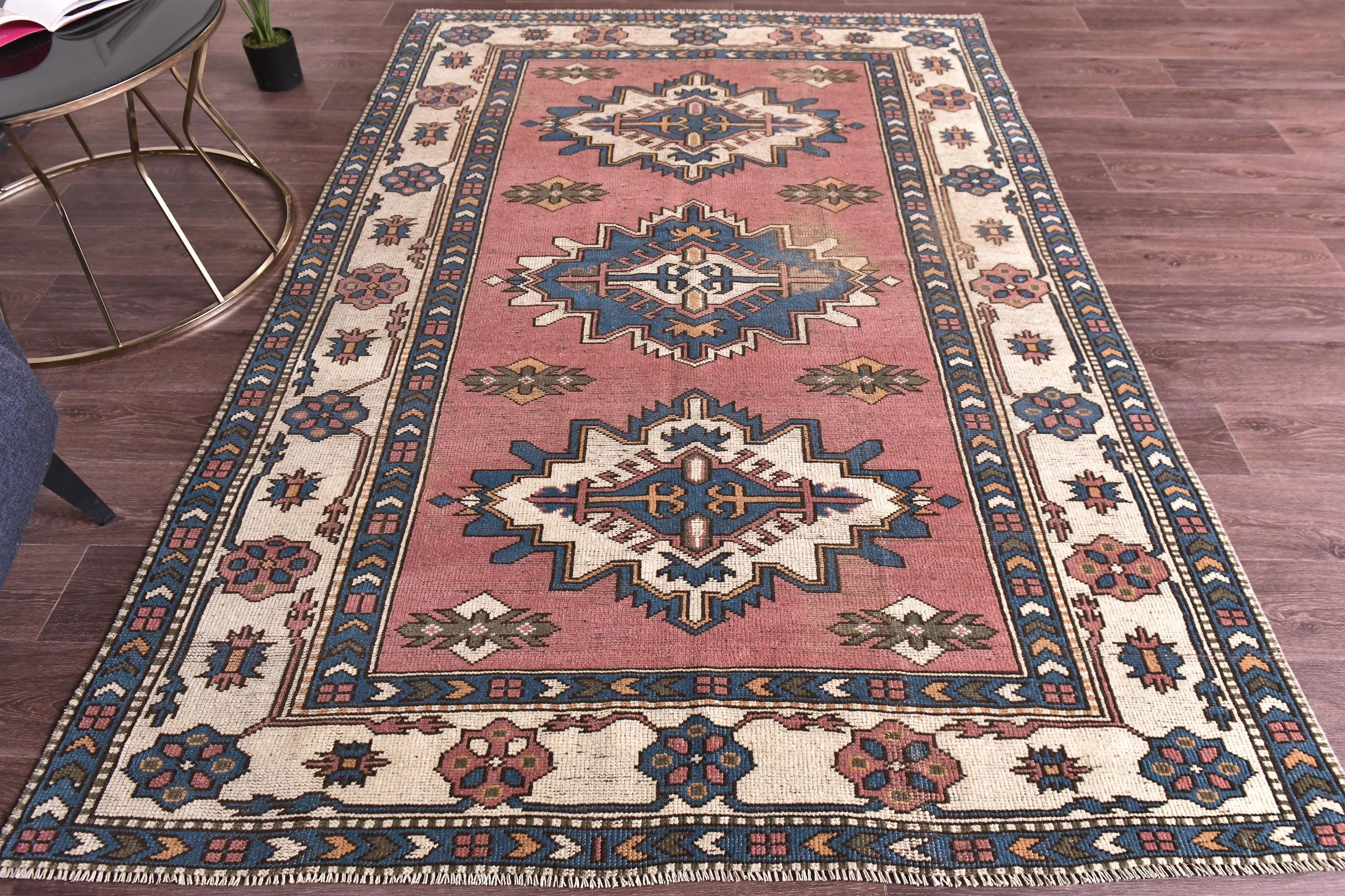 📜📌 Vintage Turkish Kazak runner rug featuring three large geometric star medallions in blue, cream and tan on dusty mauve pink field, with wide ivory borders displaying traditional tribal rosette motifs and geometric patterns, hand-knotted wool construction