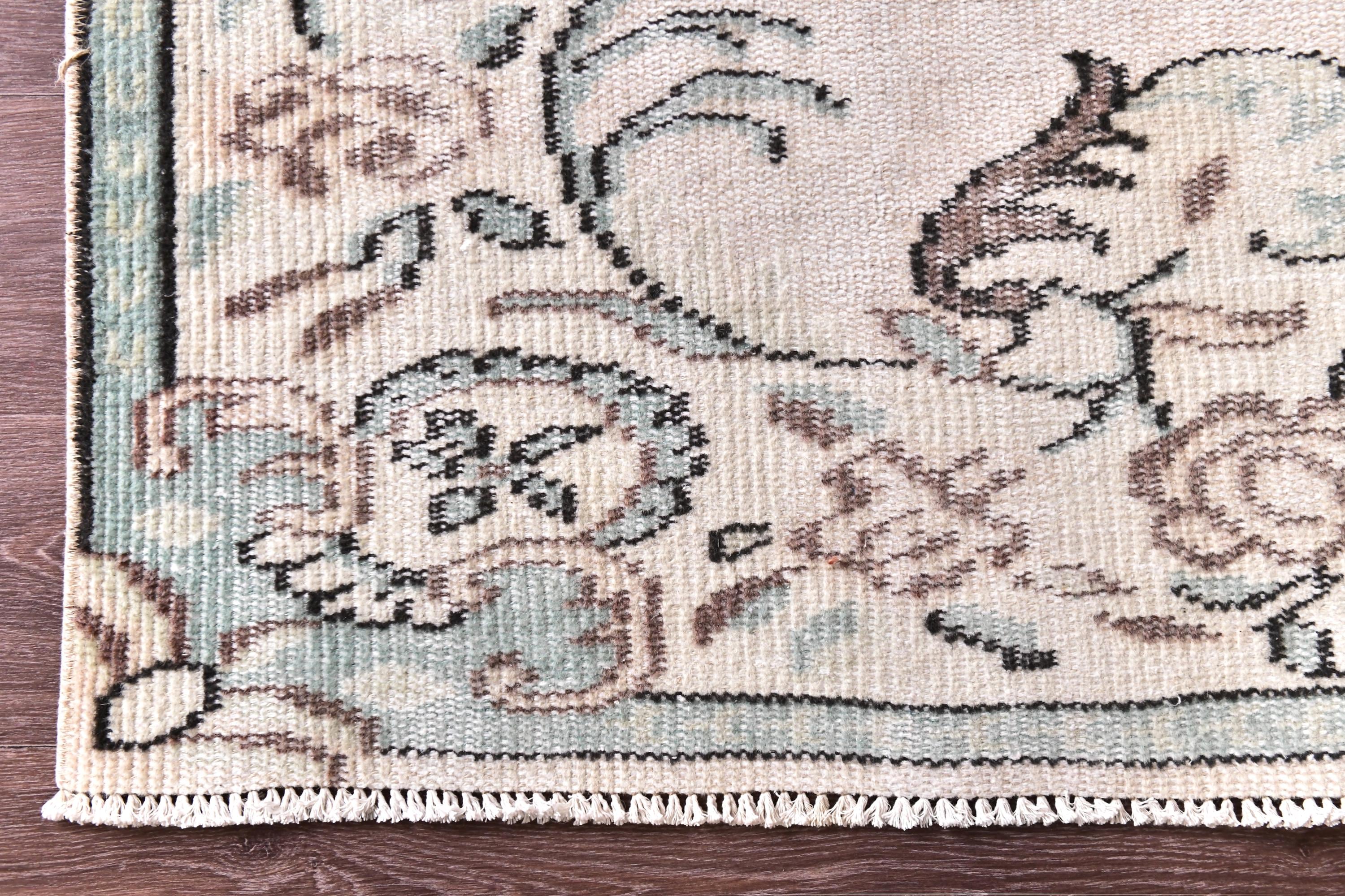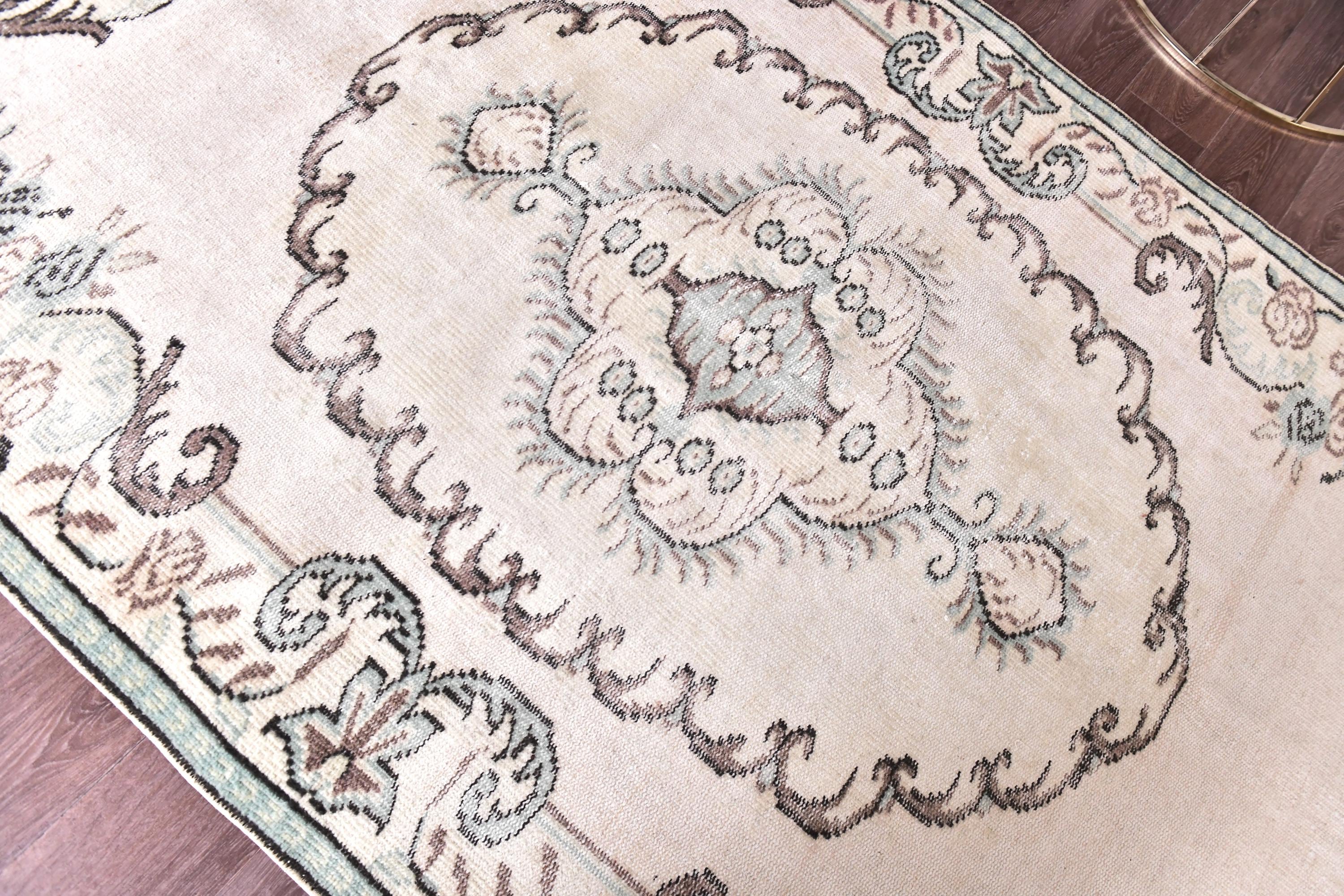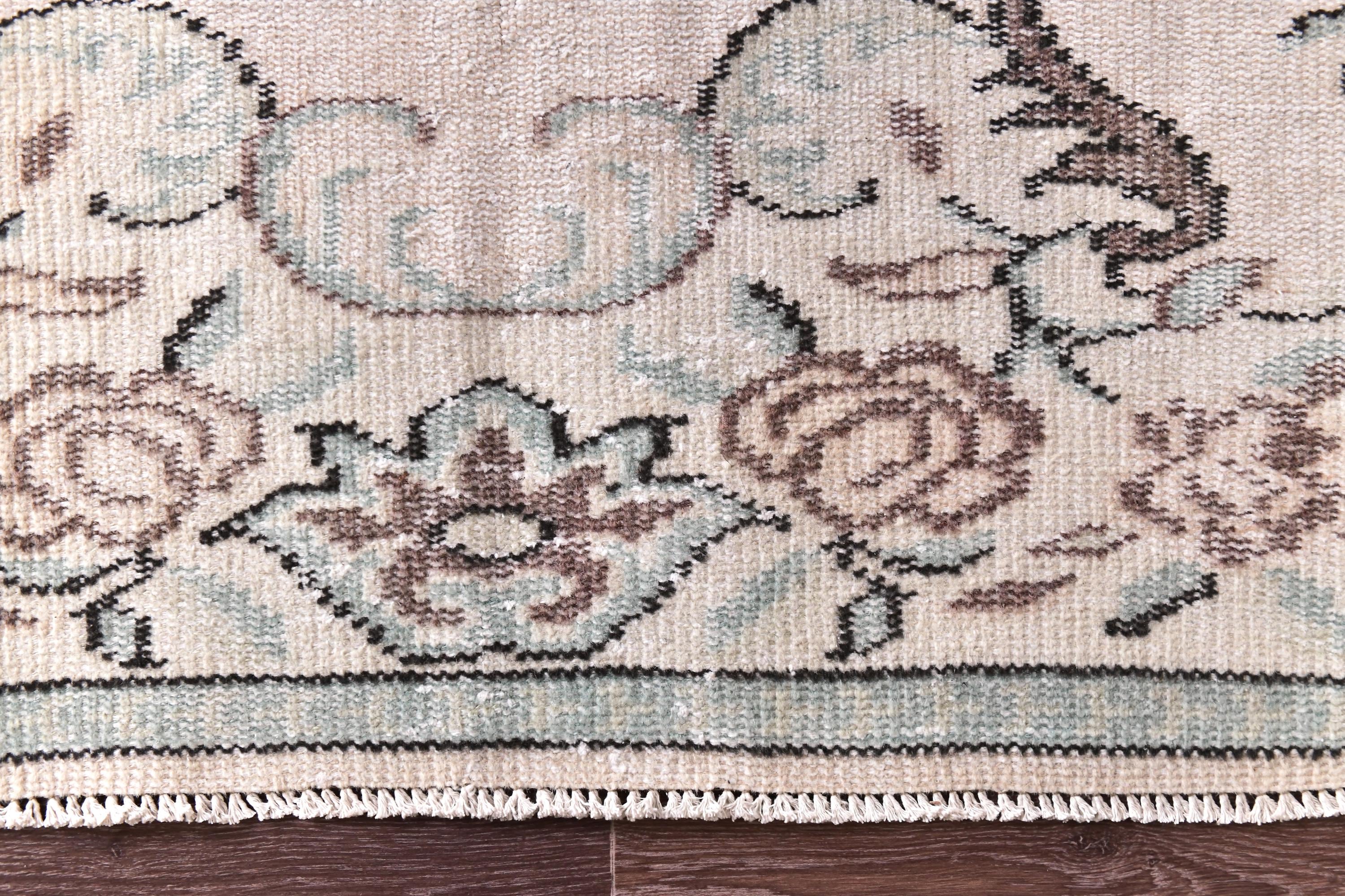📜📌 Vintage Turkish Oushak runner rug with central medallion in soft neutral palette of cream, beige and pale blush pink, featuring delicate floral scrollwork borders and distressed low-pile wool texture, perfect for elegant shabby chic or French country interiors