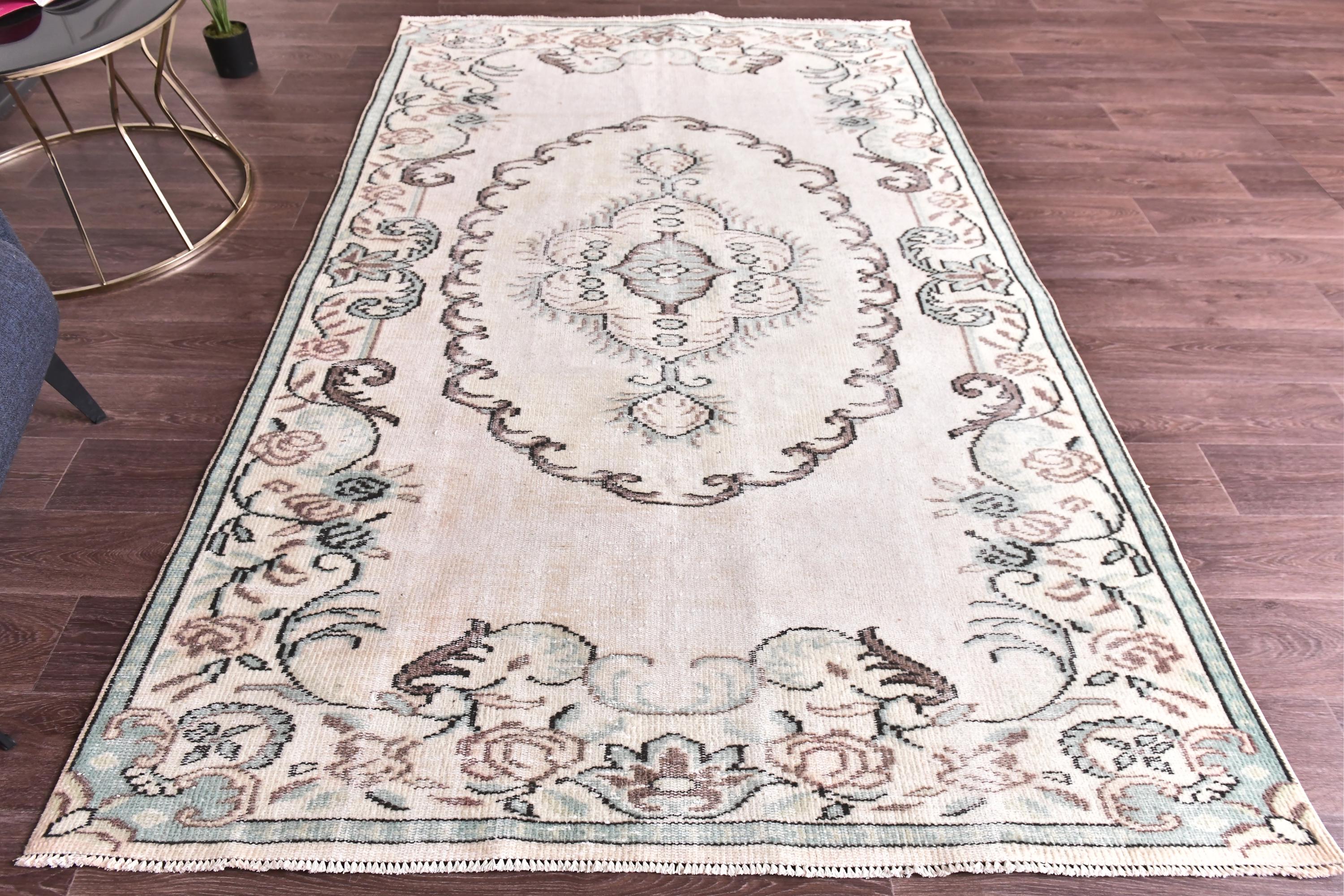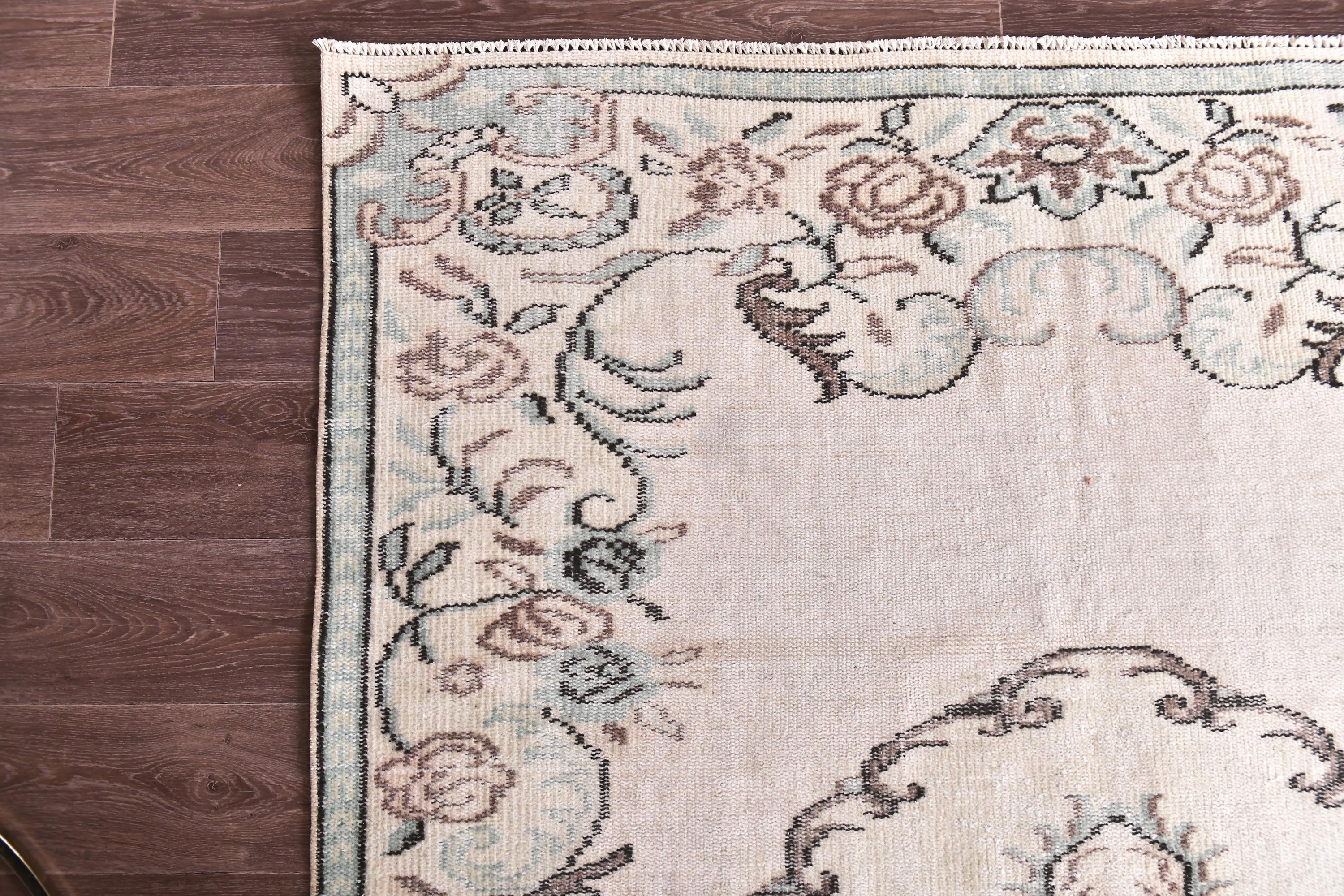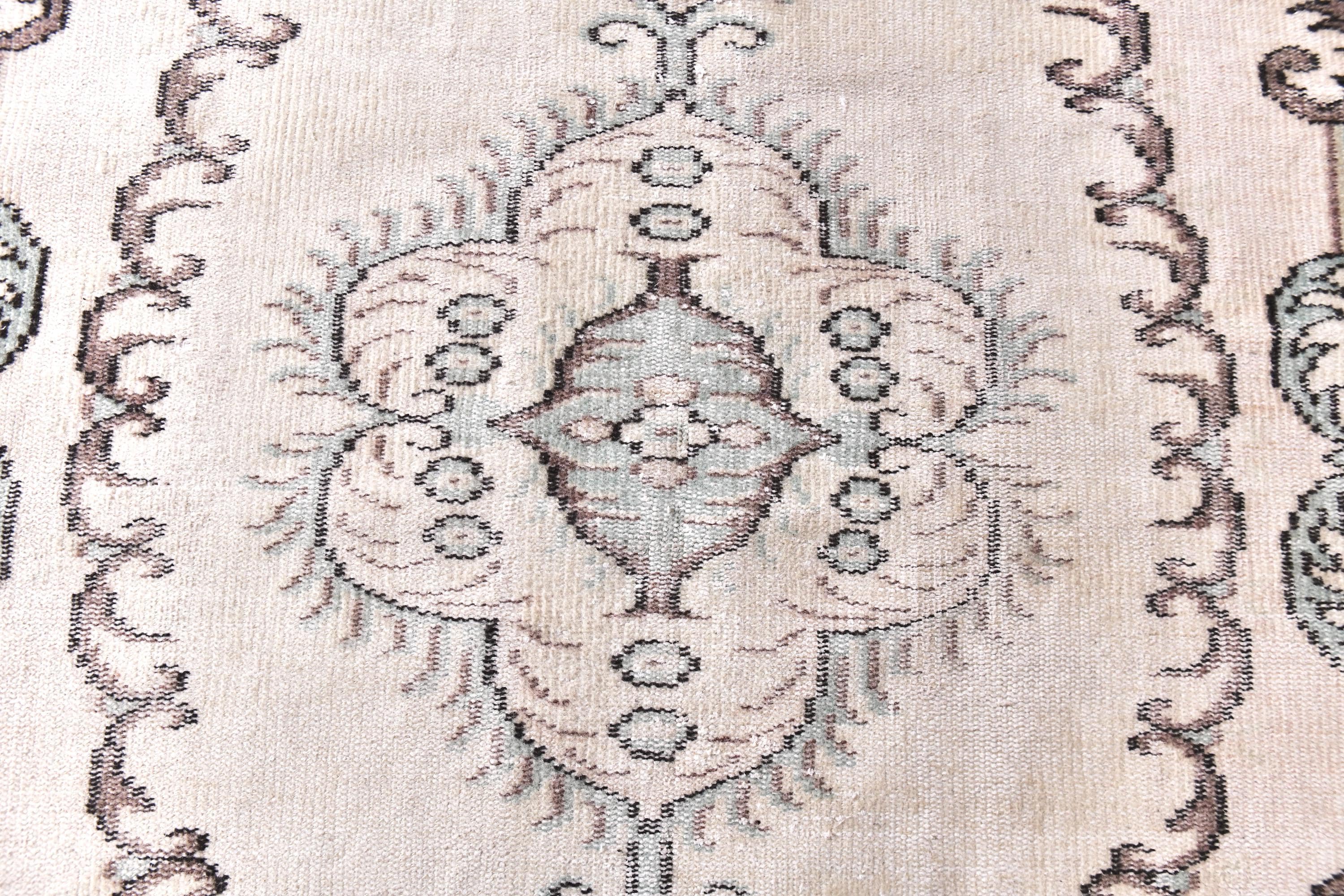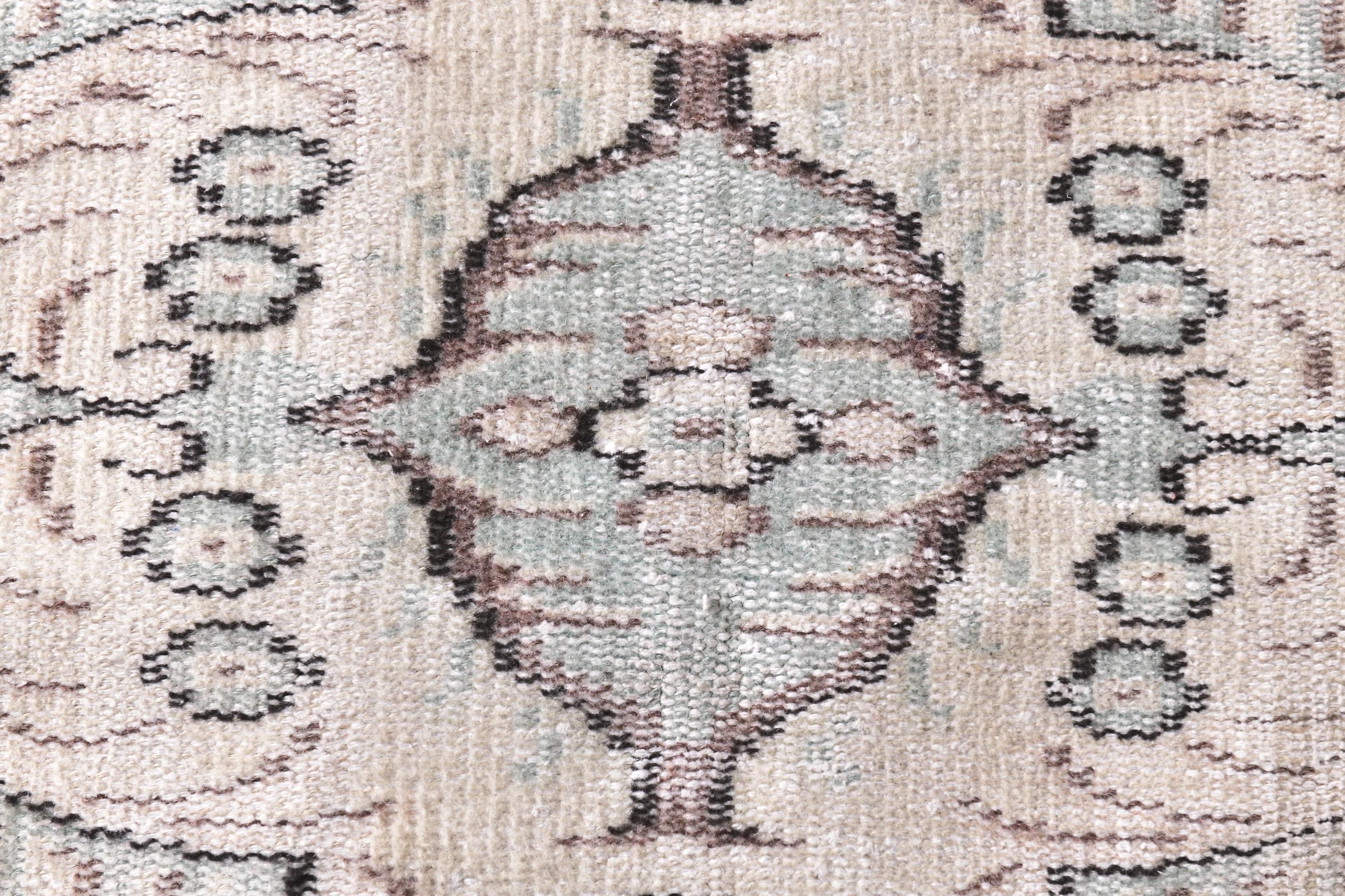 📜📌 Vintage Turkish Oushak runner rug with central medallion in soft neutral palette of cream, beige and pale blush pink, featuring delicate floral scrollwork borders and distressed low-pile wool texture, perfect for elegant shabby chic or French country interiors