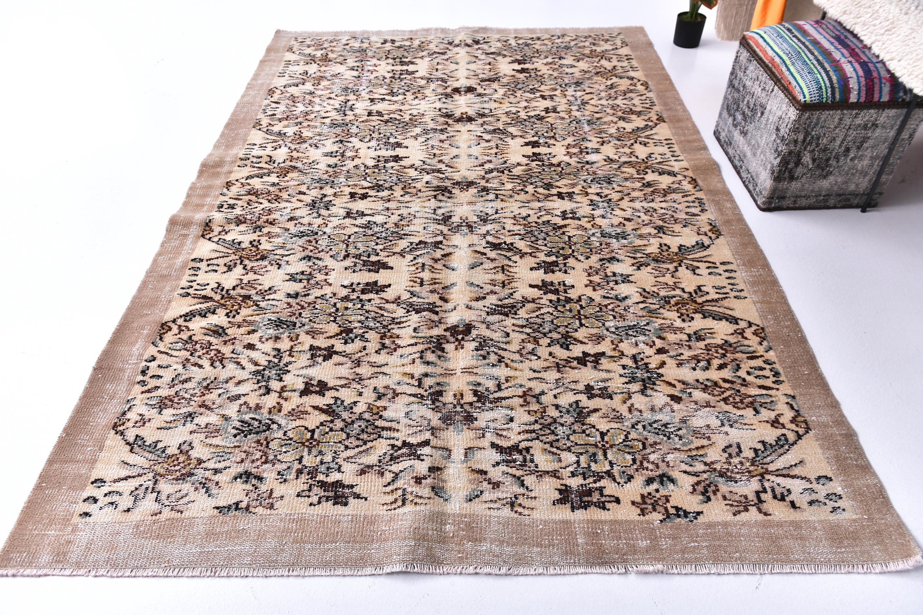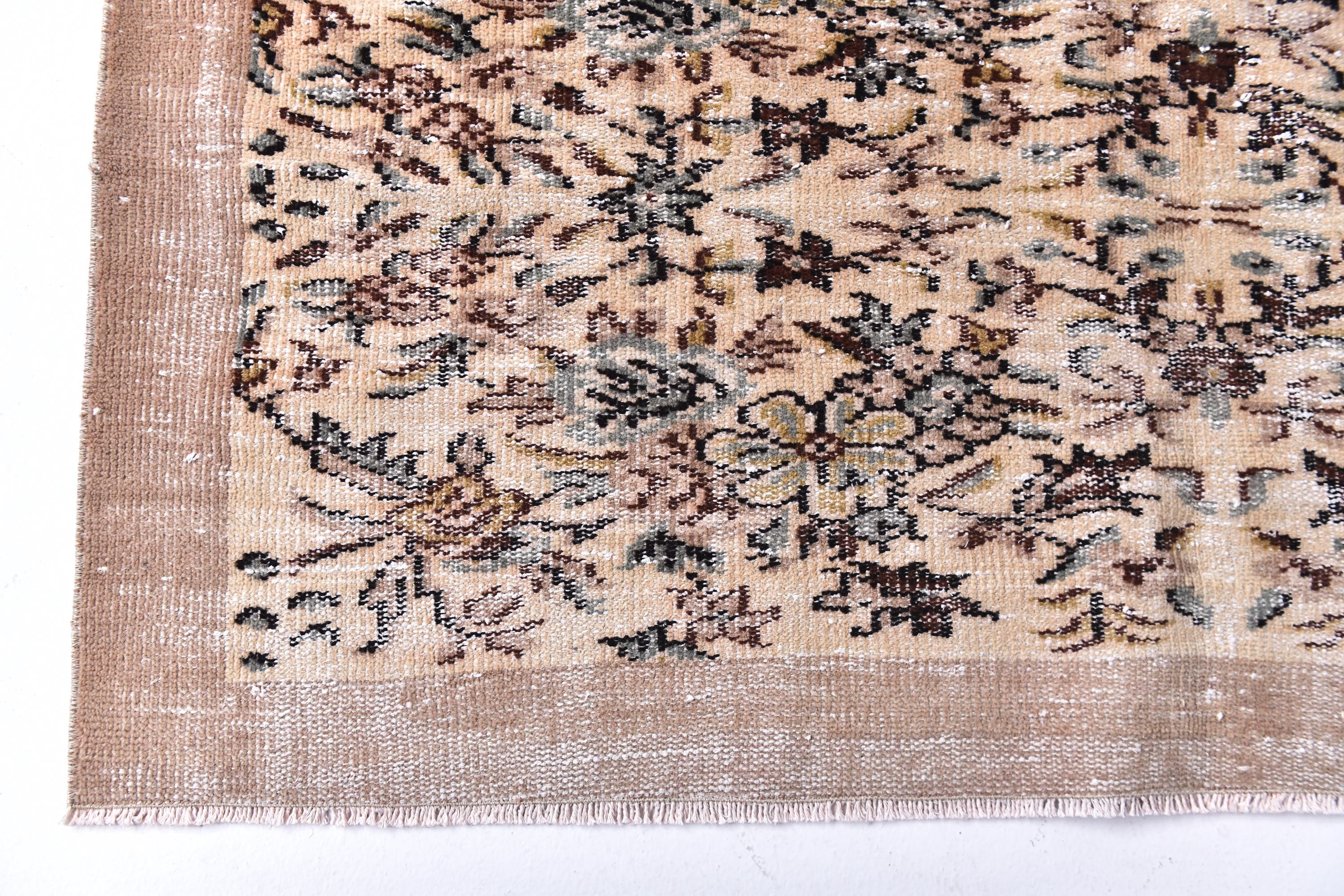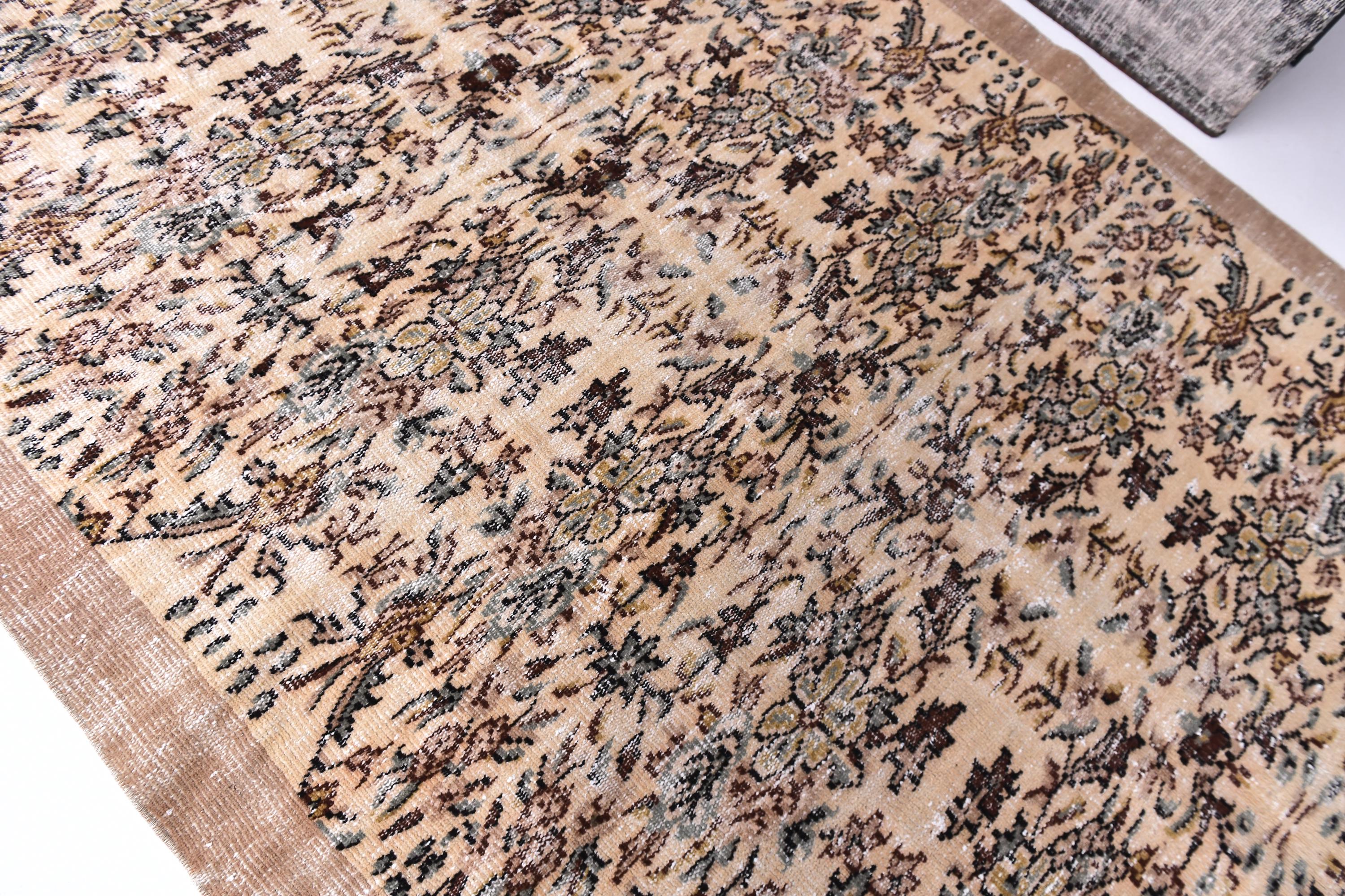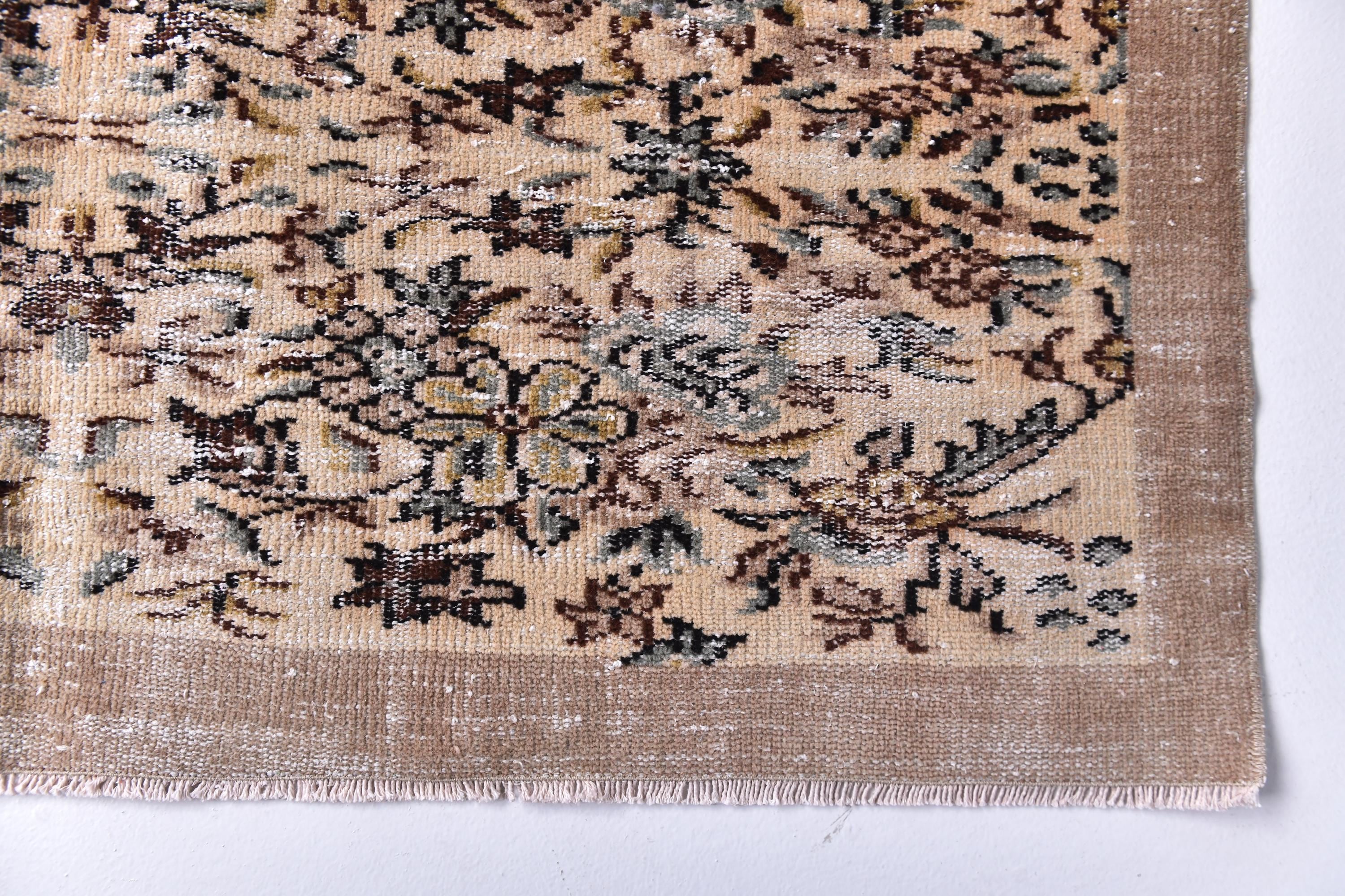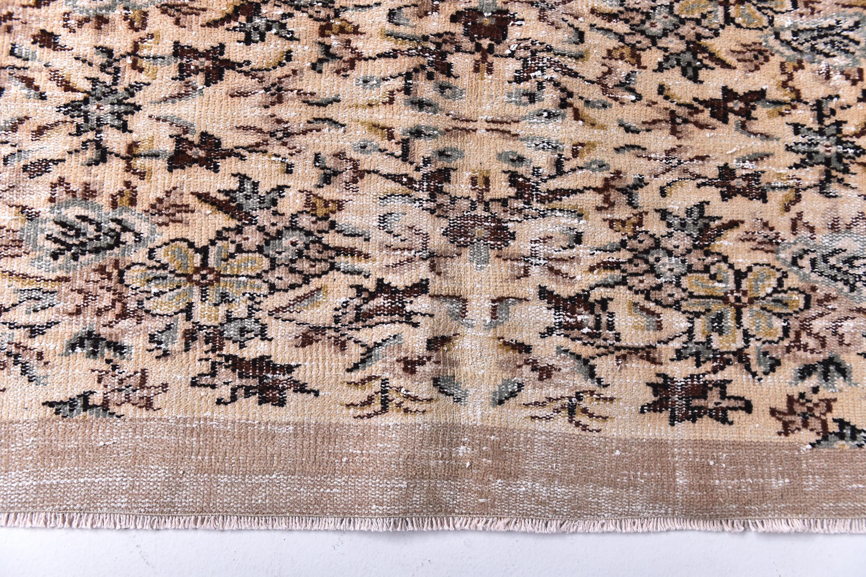 📜📌 Vintage Turkish area rug featuring heavily distressed all-over floral pattern in neutral beige, taupe and brown tones with worn faded effect, hand-knotted low-pile wool construction with authentic aged patina, perfect for modern bohemian interiors