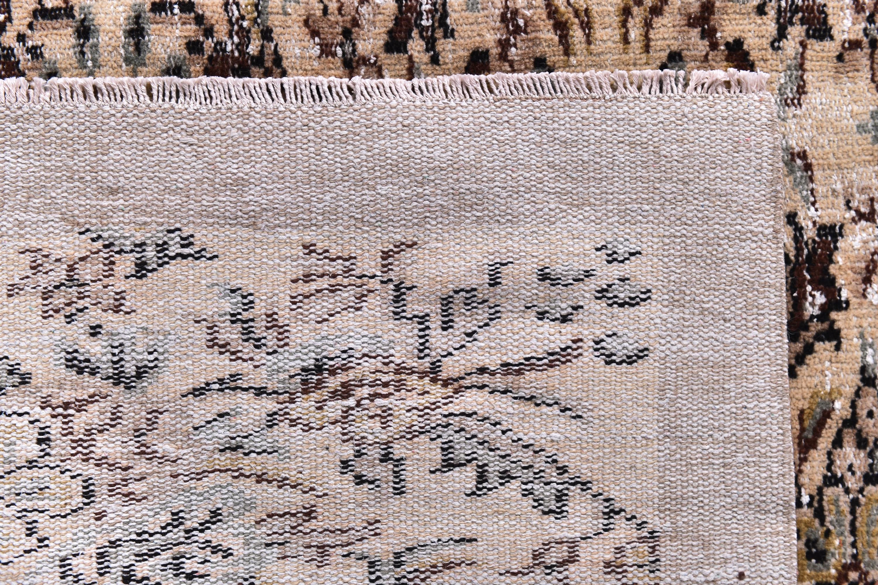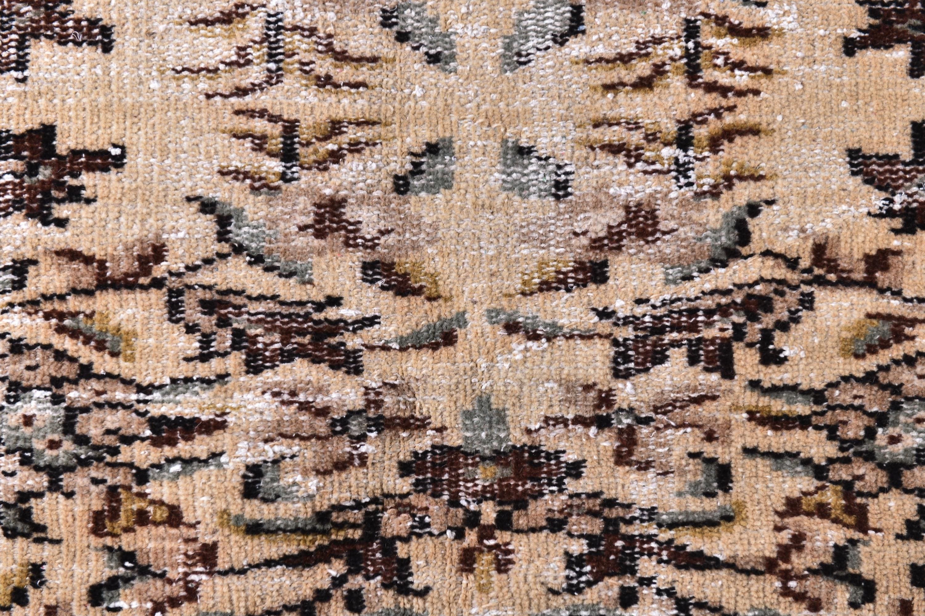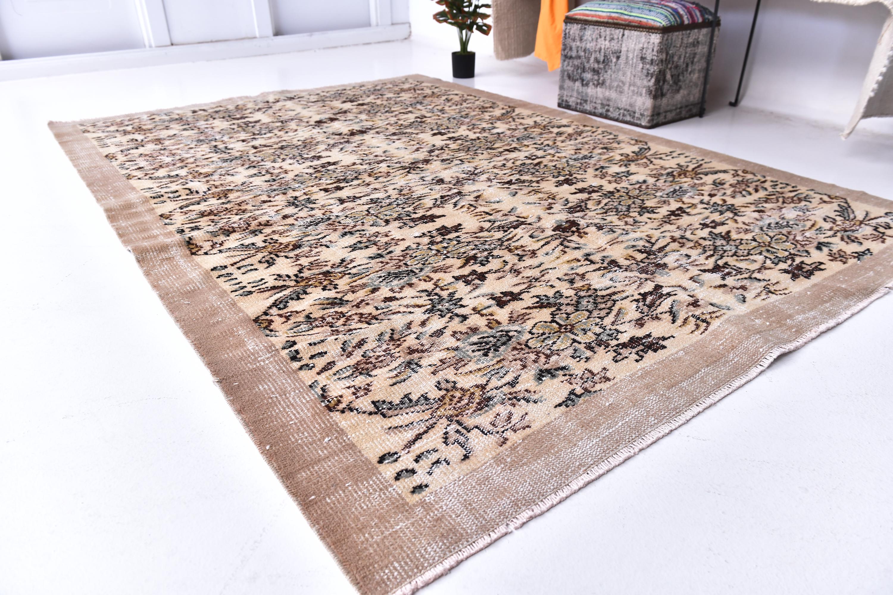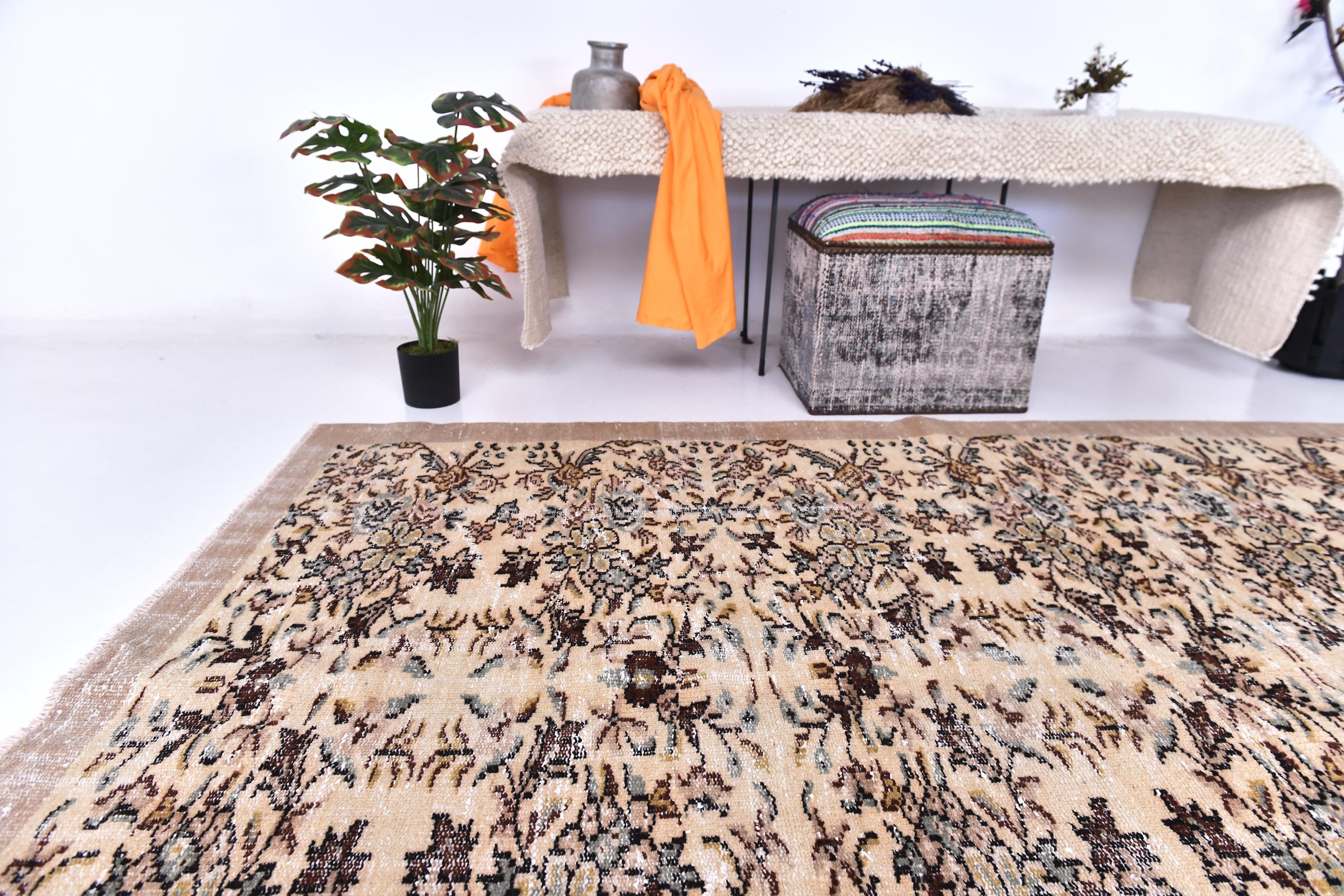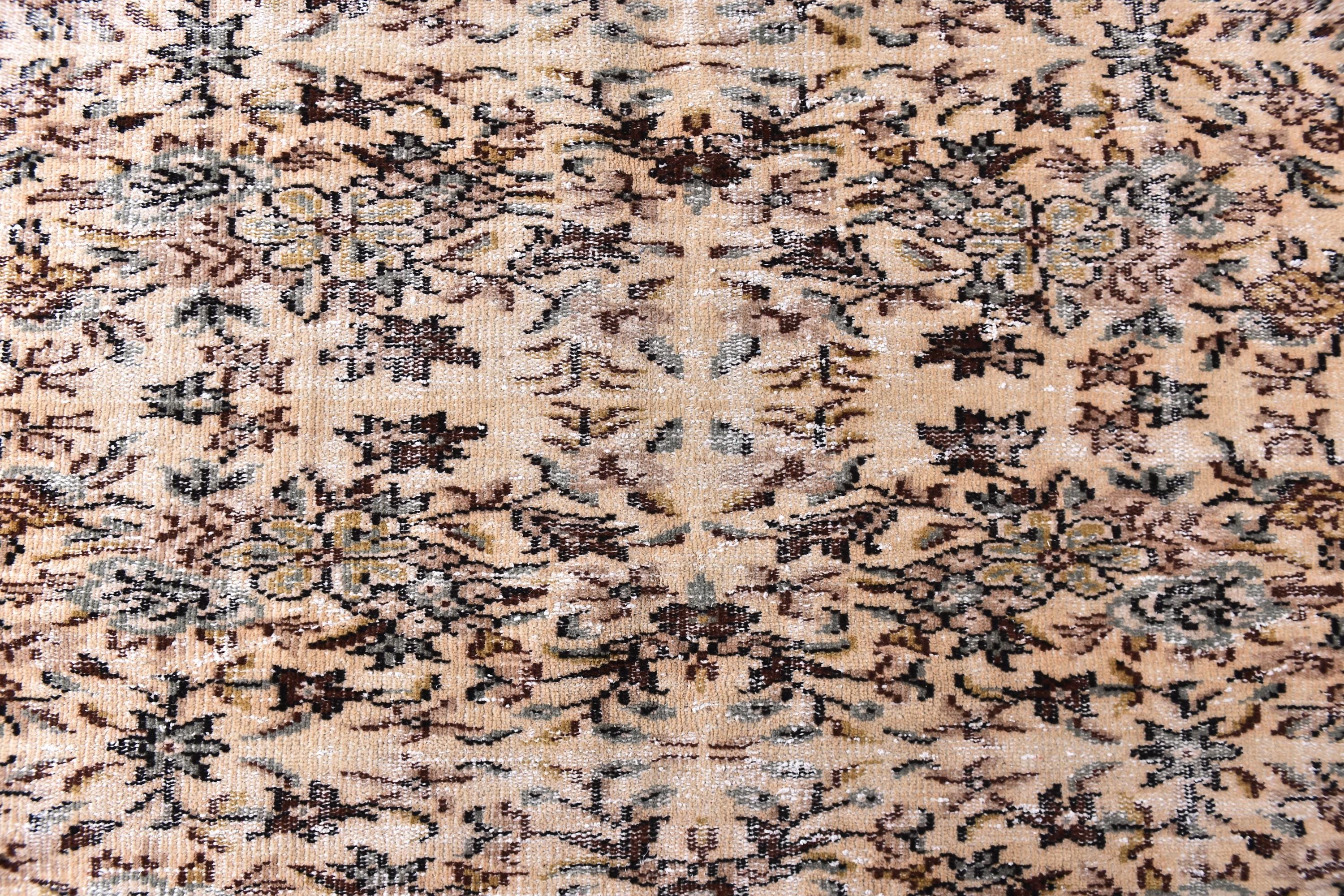 📜📌 Vintage Turkish area rug featuring heavily distressed all-over floral pattern in neutral beige, taupe and brown tones with worn faded effect, hand-knotted low-pile wool construction with authentic aged patina, perfect for modern bohemian interiors