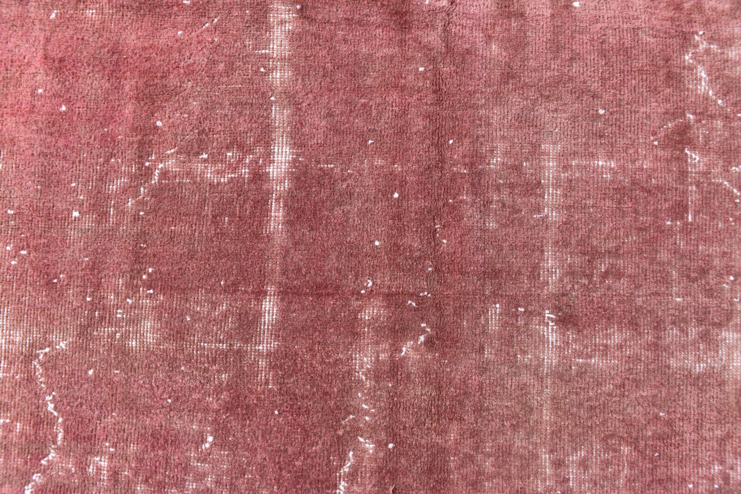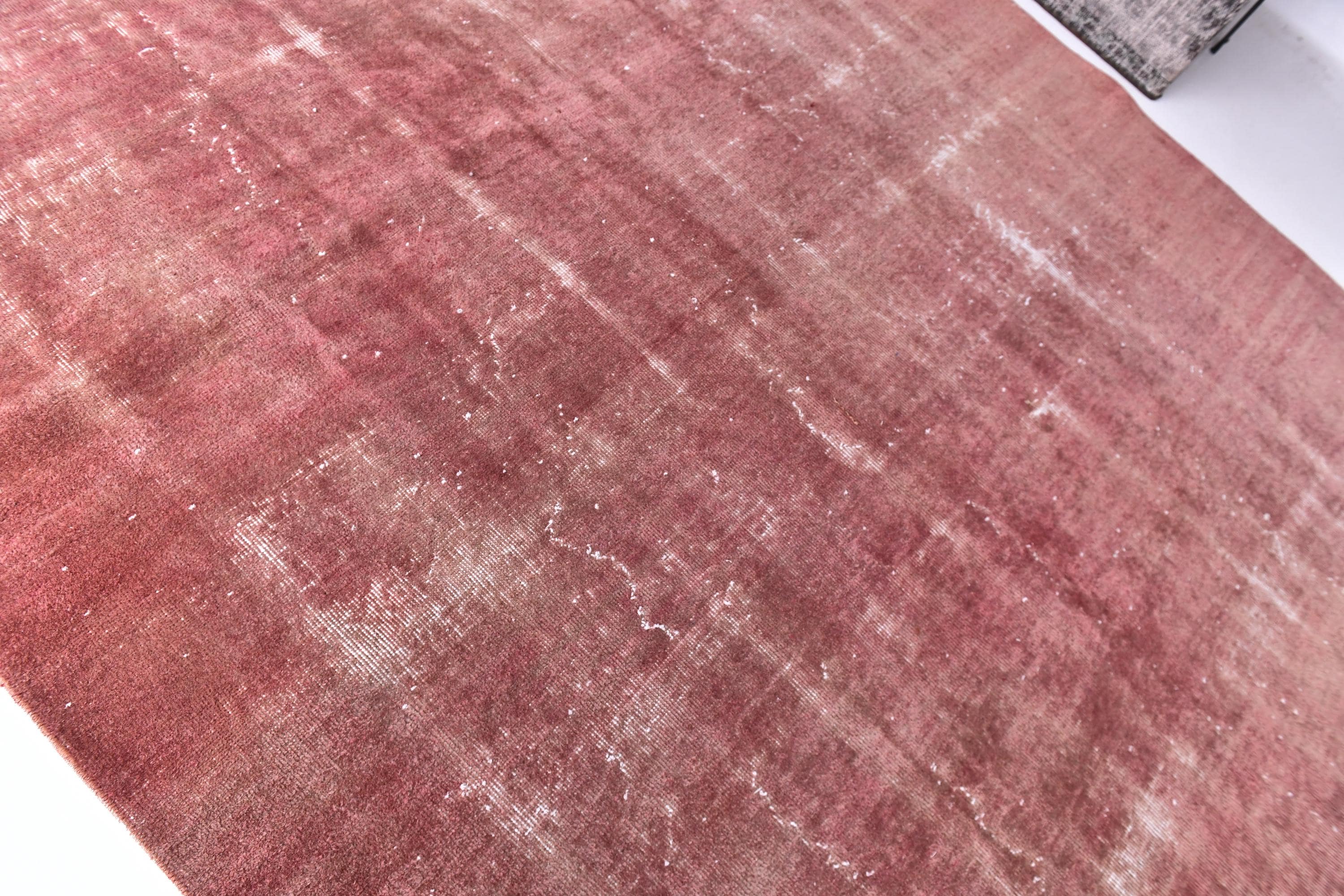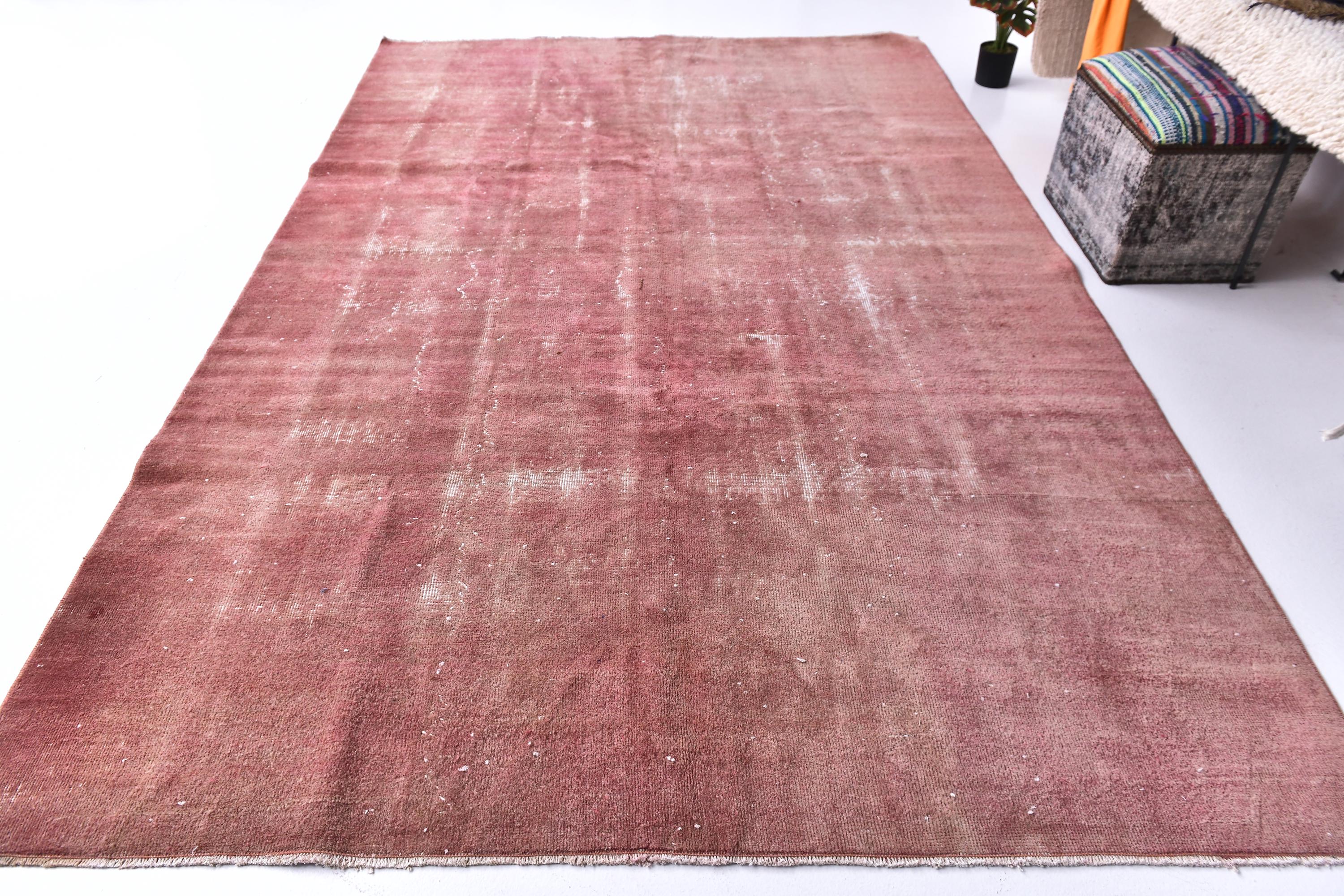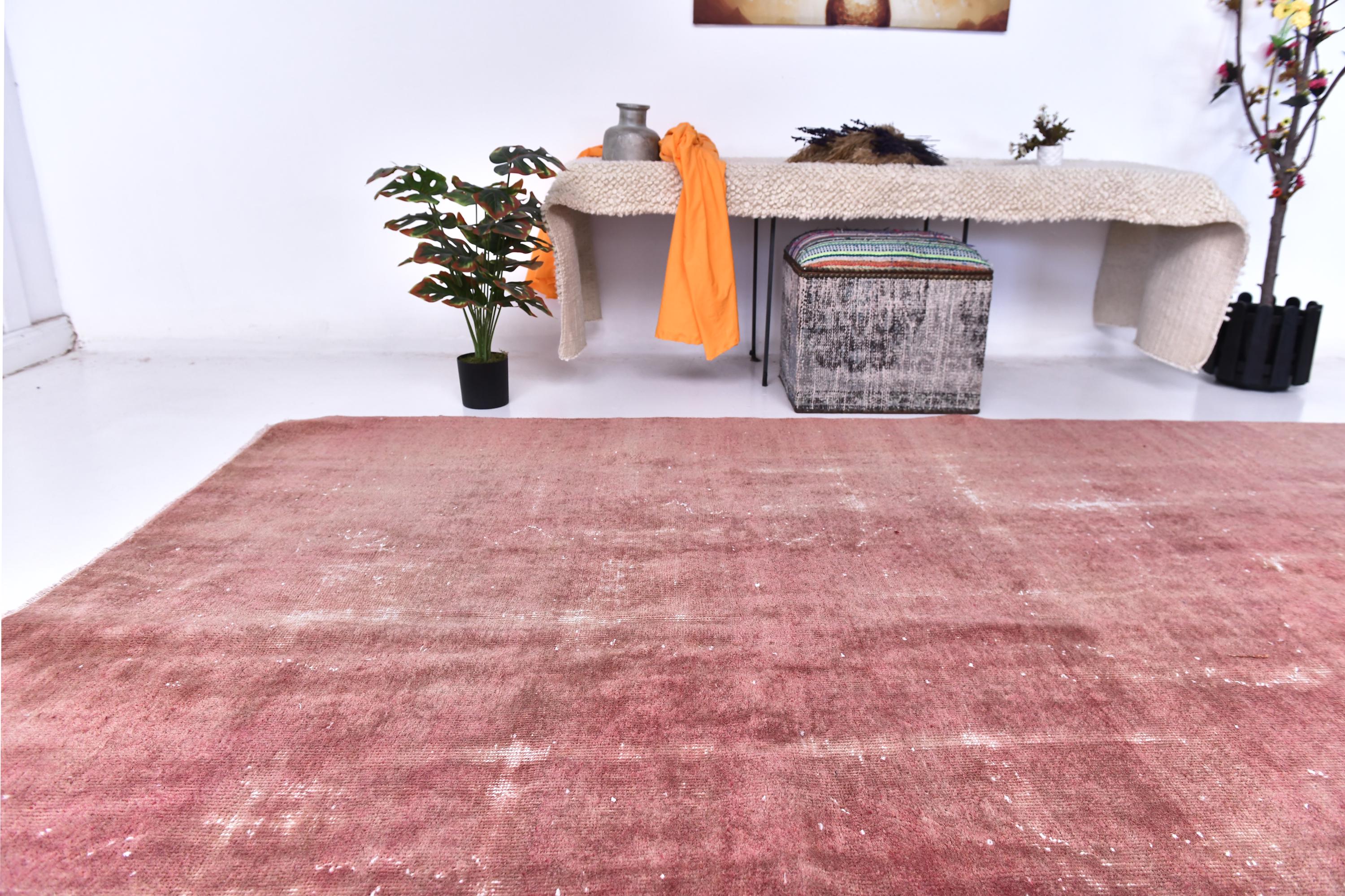 📜📌Large vintage overdyed Turkish area rug in gorgeous dusty rose pink and mauve tones with heavily distressed patina finish, hand-knotted low-pile wool construction showing authentic aged character, solid color design perfect for modern bohemian and contemporary interiors