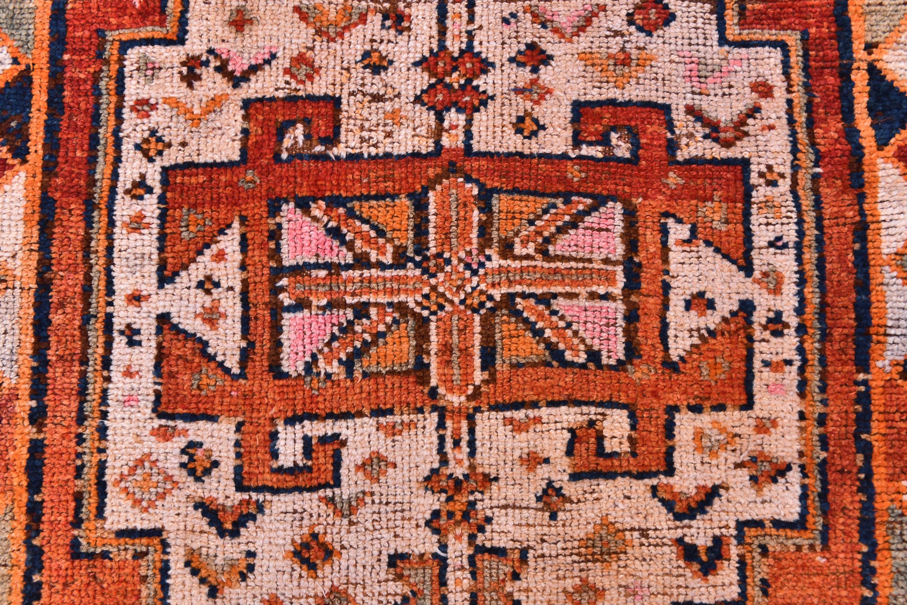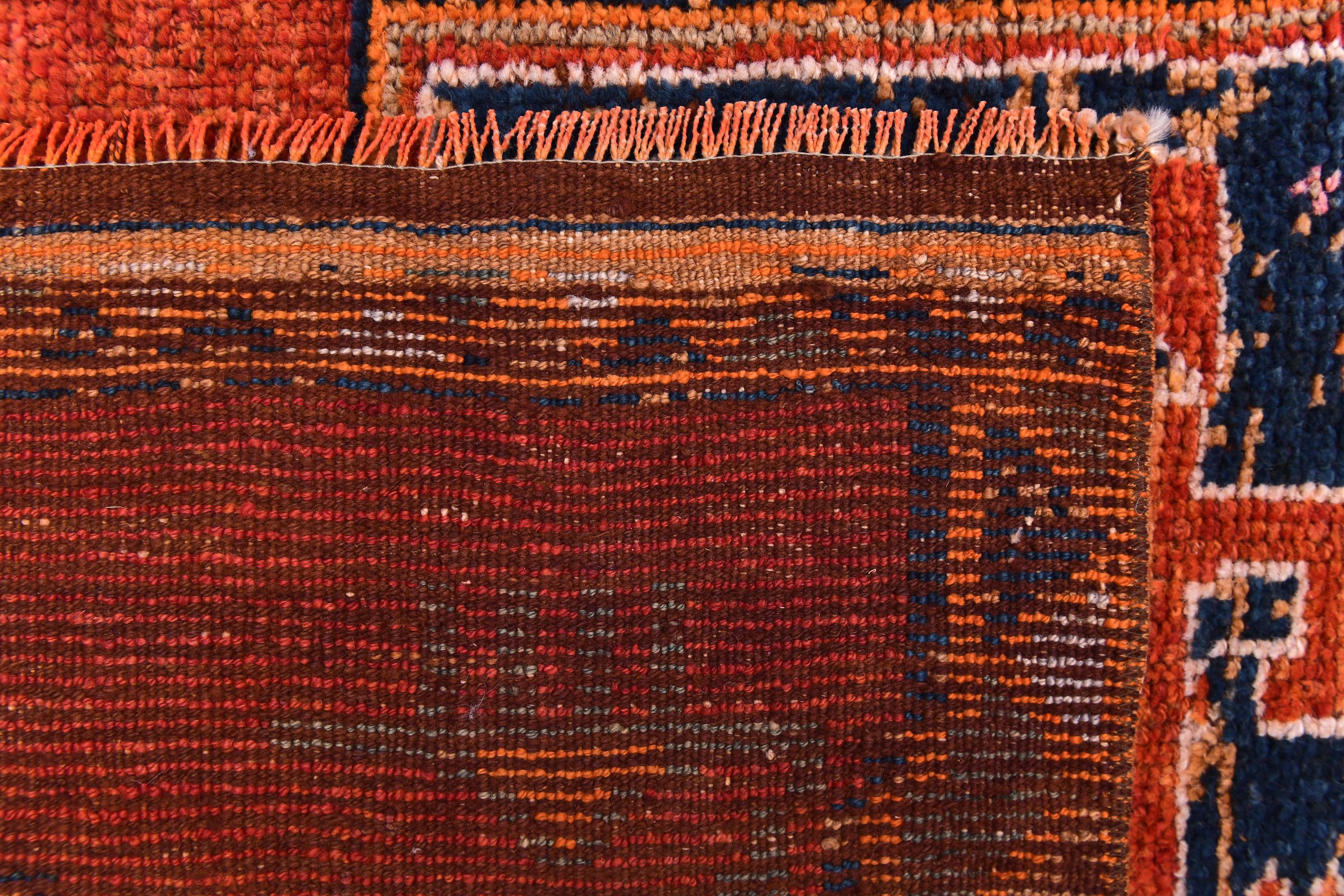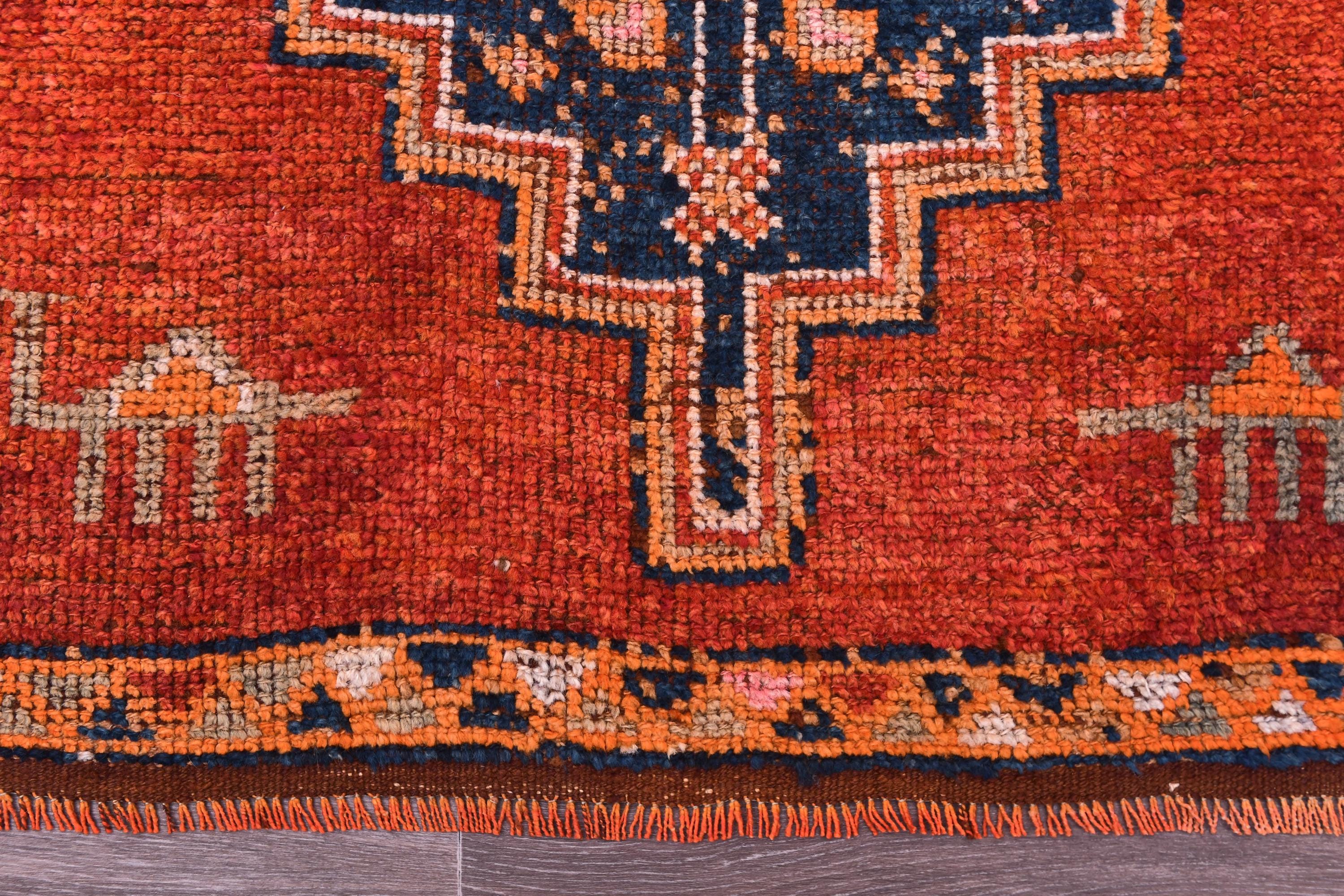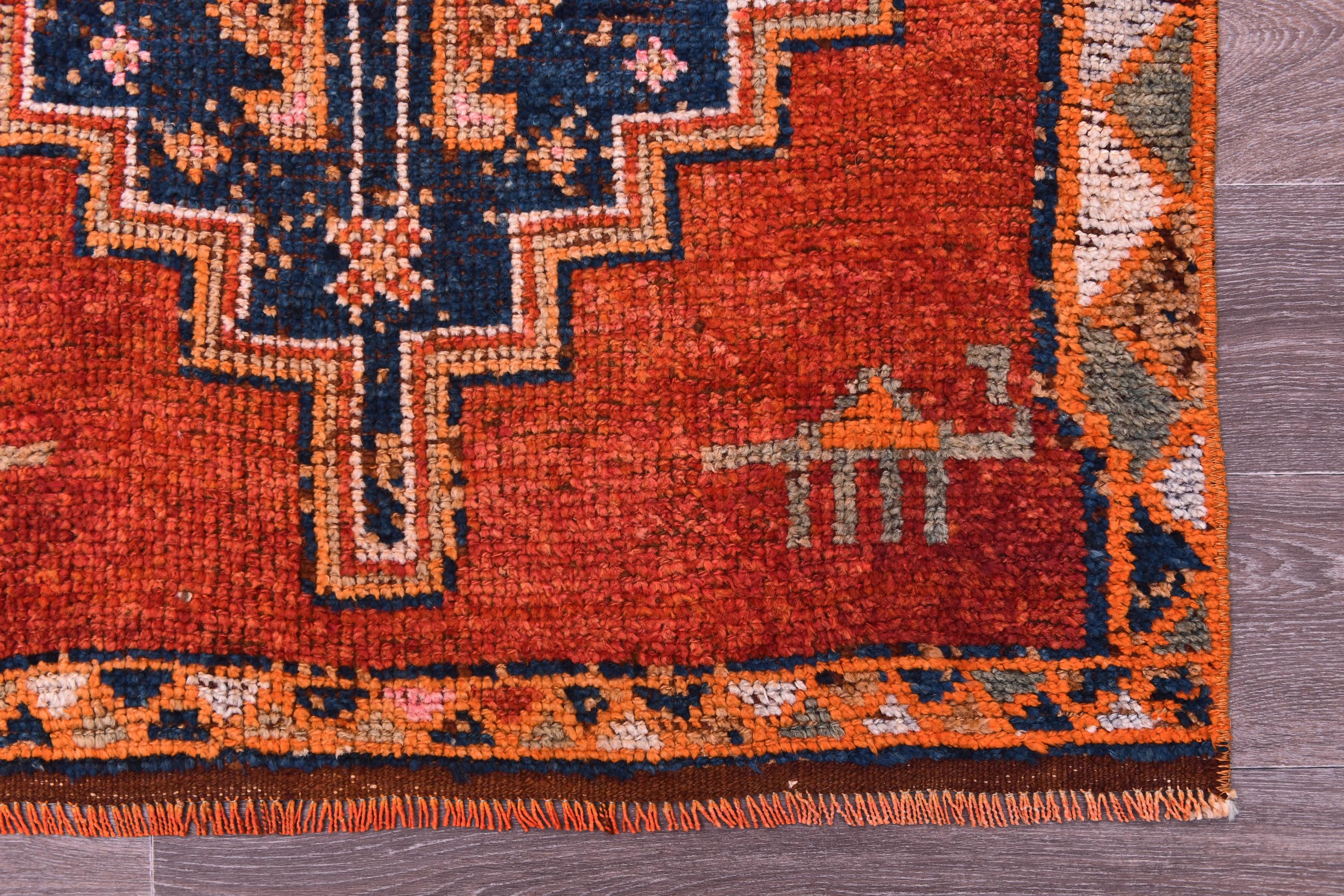 📜📌 Vintage Herki runner rug featuring bold geometric medallion patterns in vibrant red and deep navy blue colors. Hand-knotted wool construction with traditional Herki design elements including a central cream and coral medallion, surrounded by intricate floral motifs. The rug has decorative cream and orange triangular corner designs and a distinctive orange fringe border, displayed on gray wood flooring.