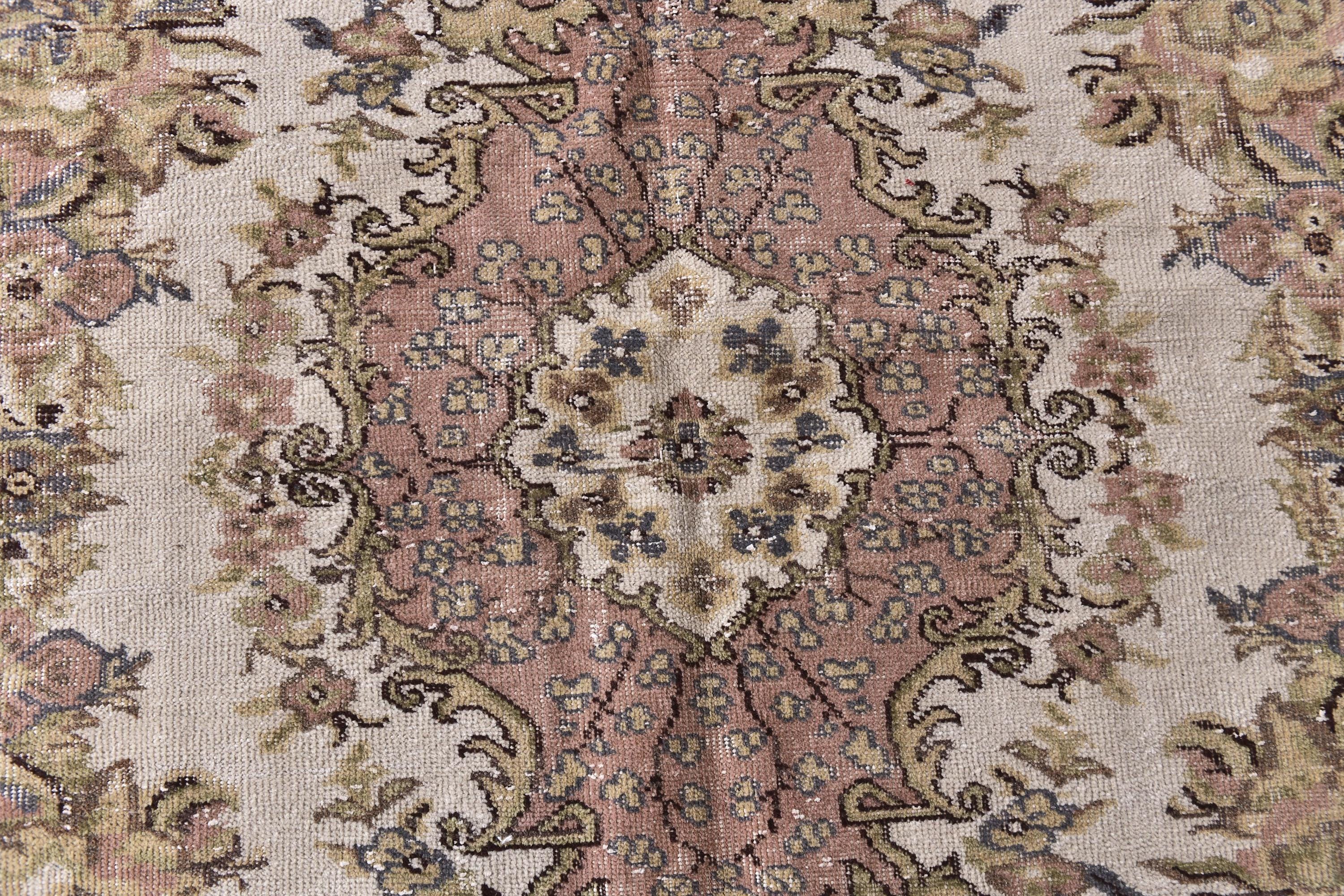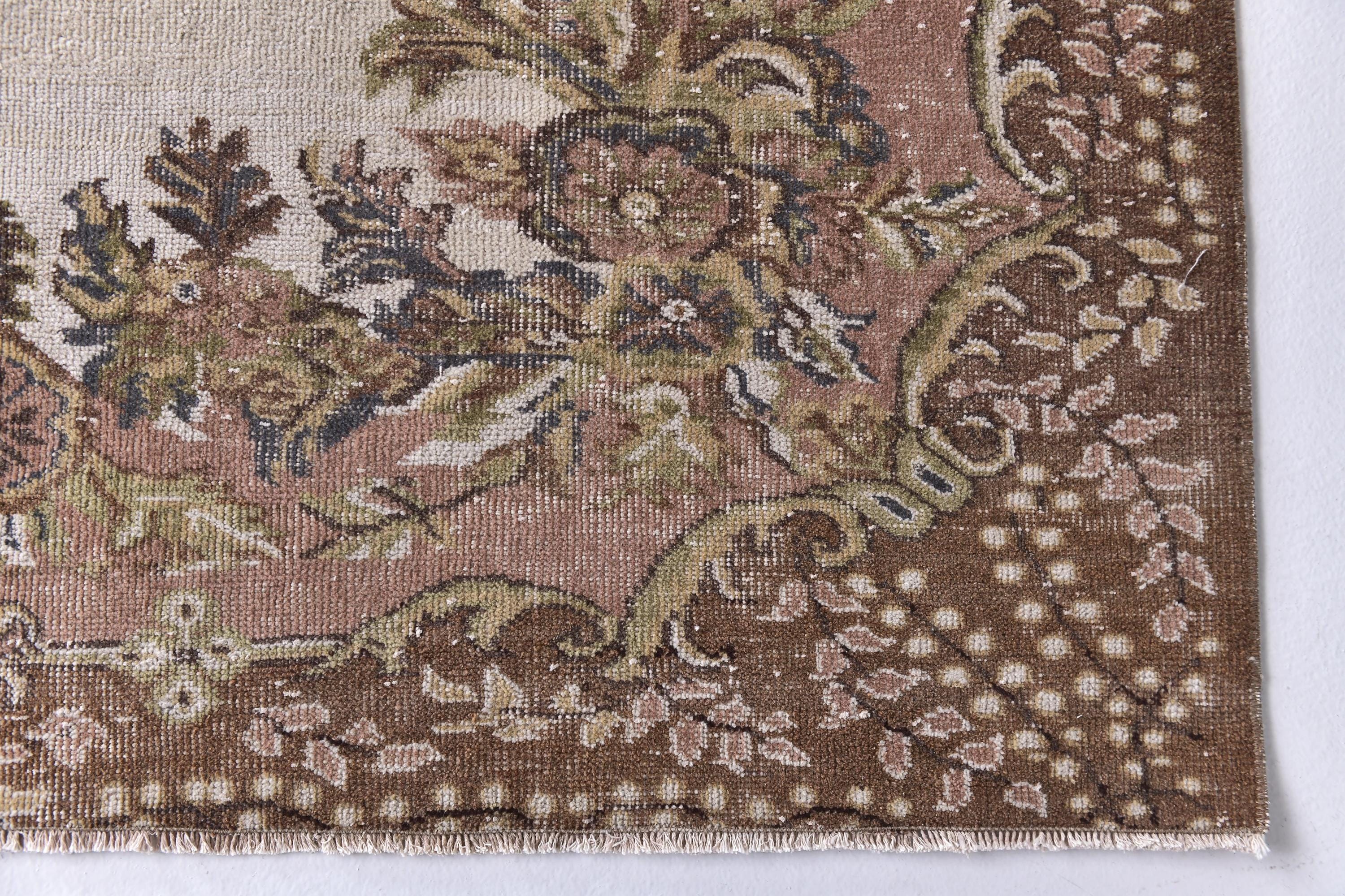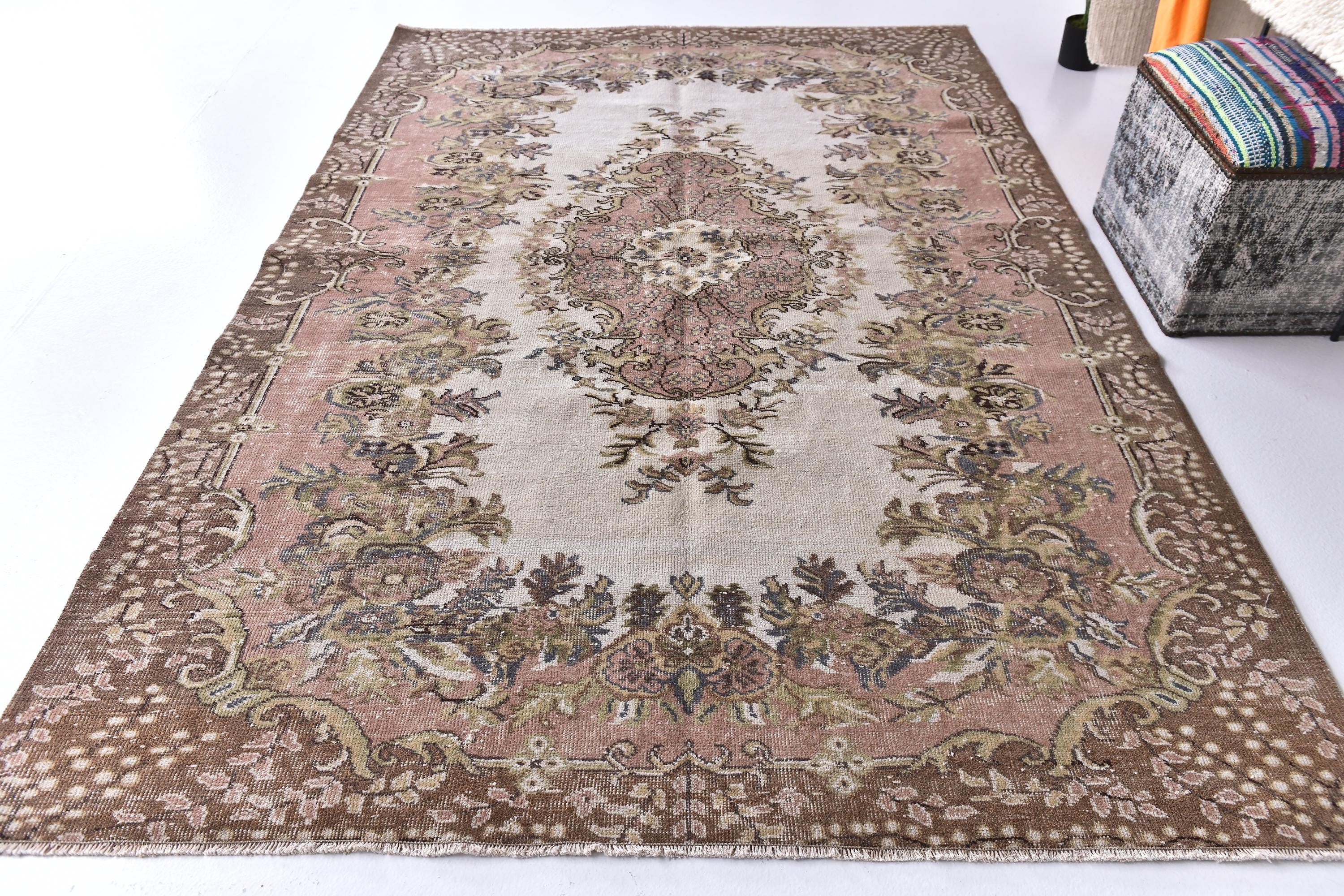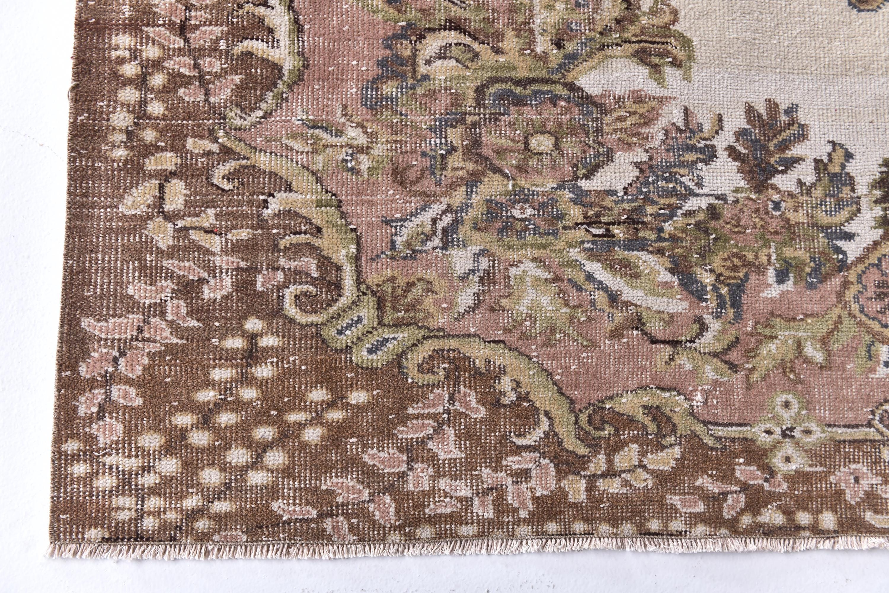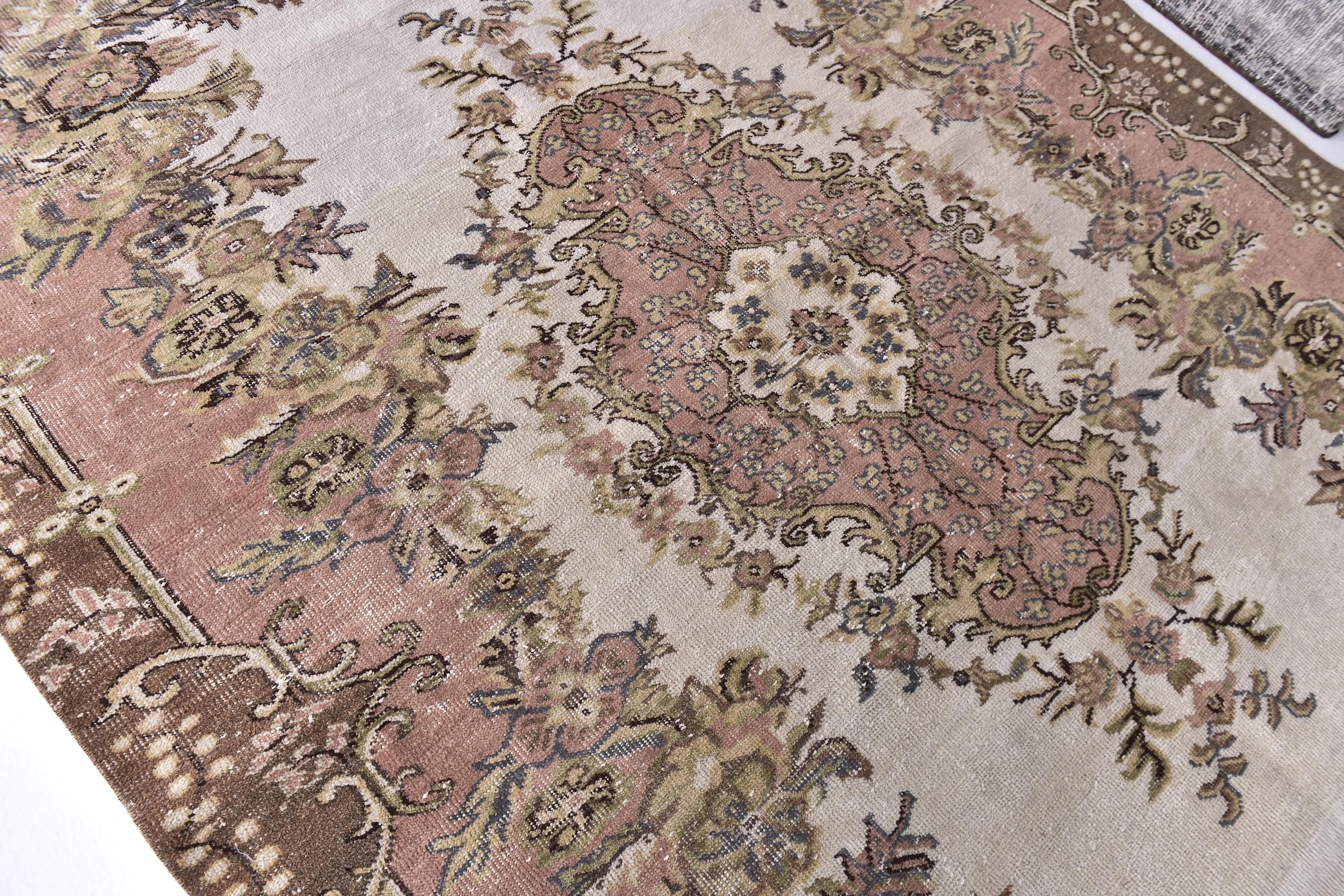 📜📌Vintage overdyed Turkish area rug in muted blush pink, taupe, and brown color palette with distressed appearance. Hand-knotted wool construction featuring central floral medallion surrounded by botanical motifs and scrolling vine patterns in soft faded tones including ivory, olive green, and dusty rose. The rug displays traditional Oushak design with worn patina, decorative borders with repeating geometric patterns, and low pile texture showing authentic vintage character and age.
