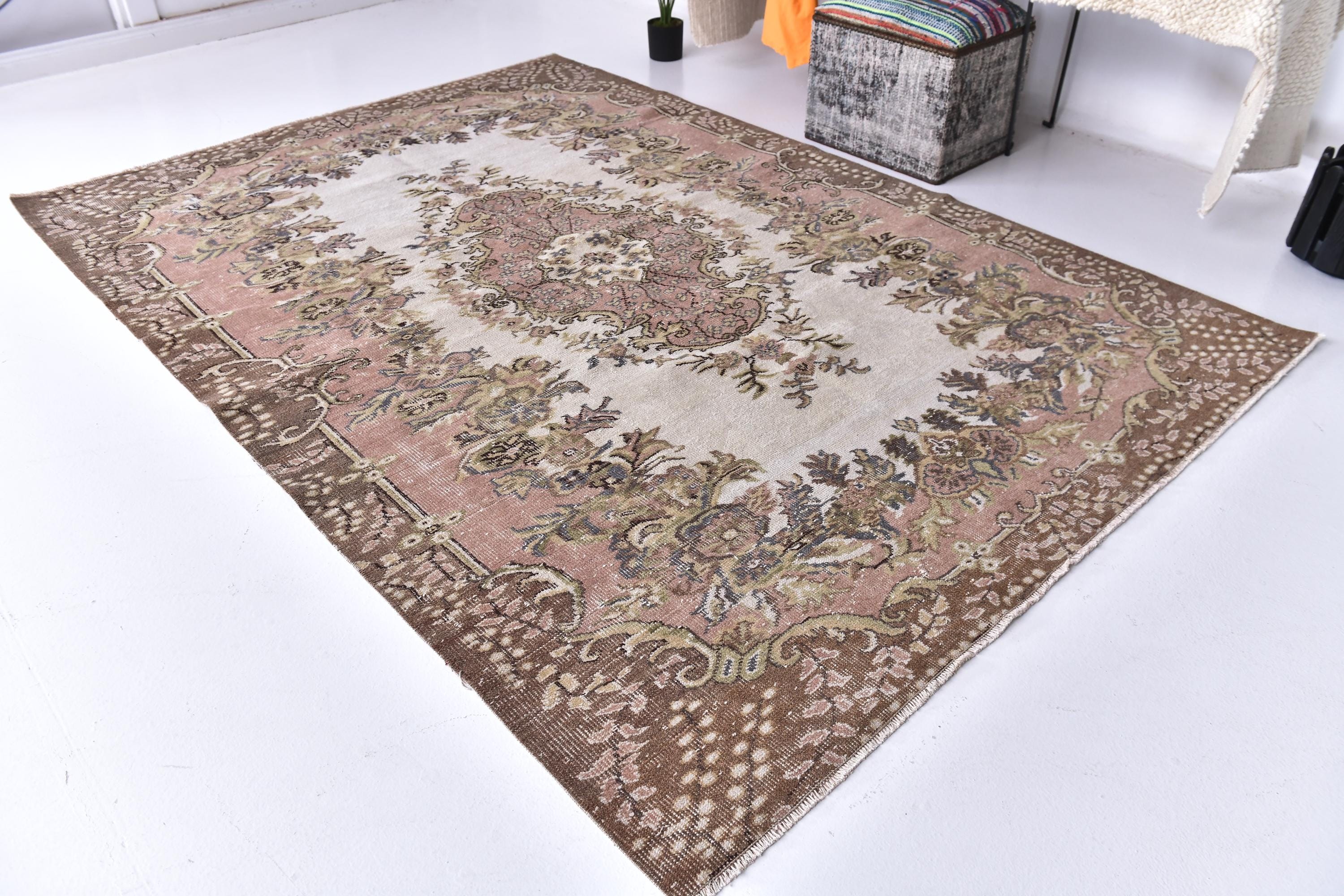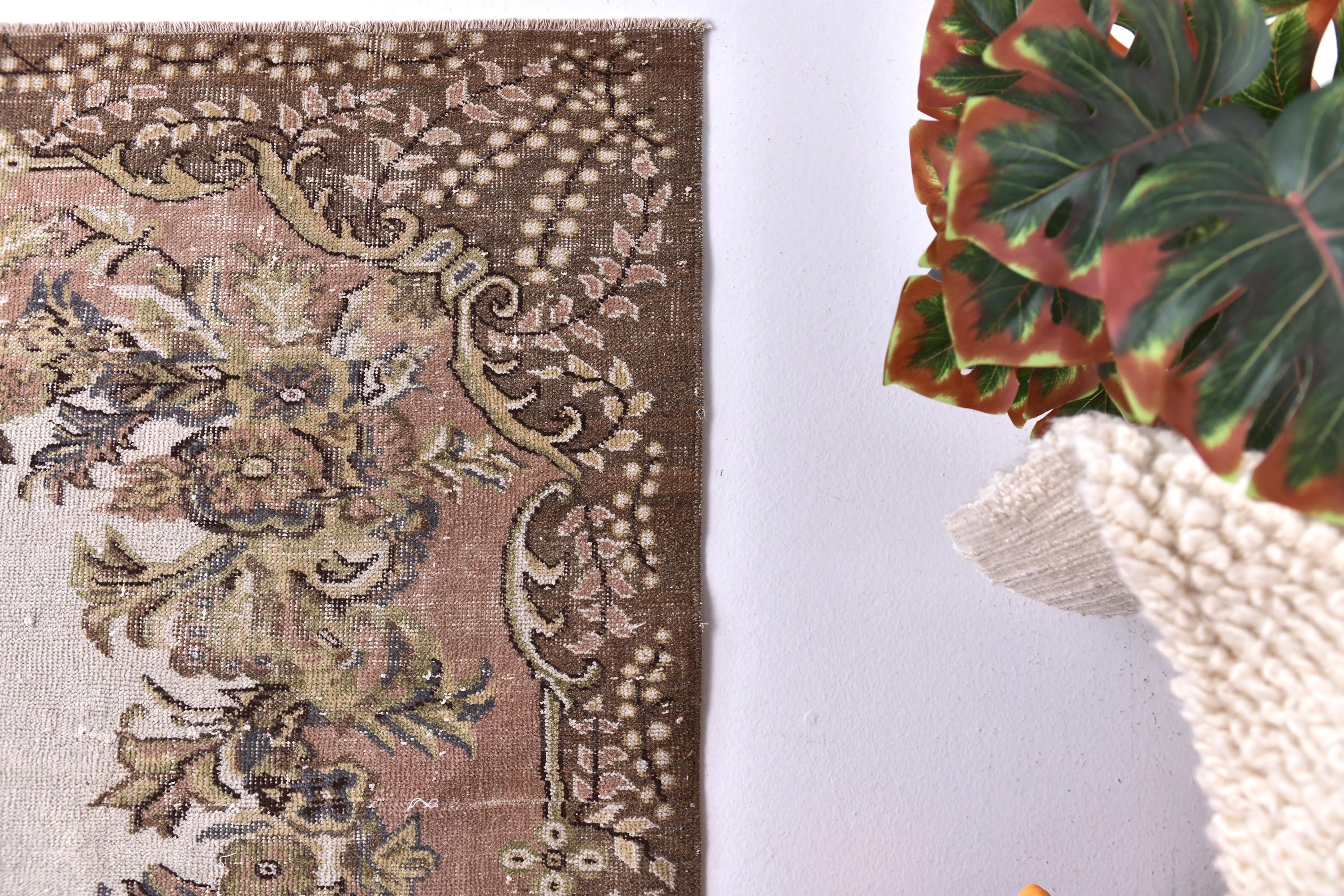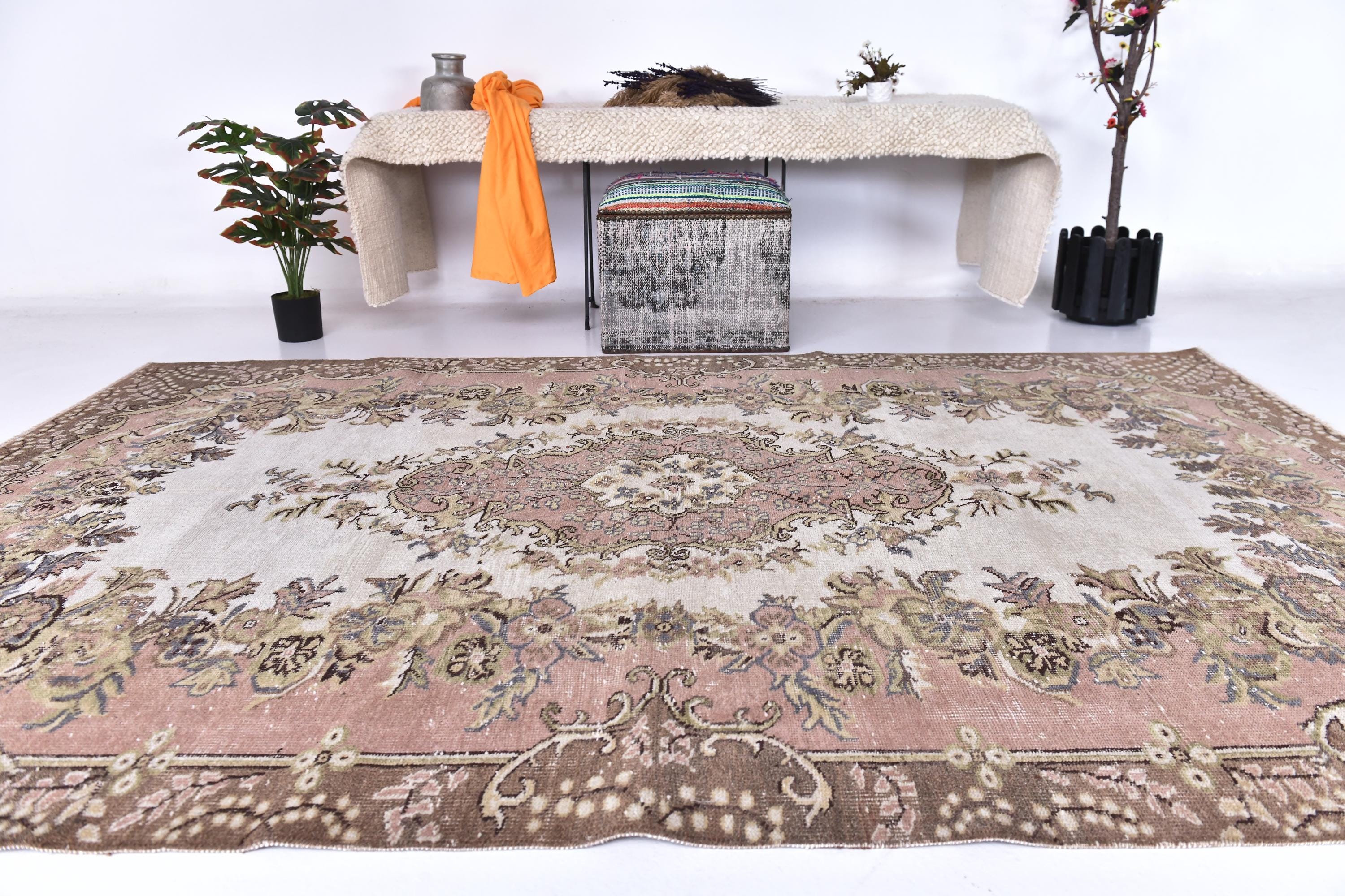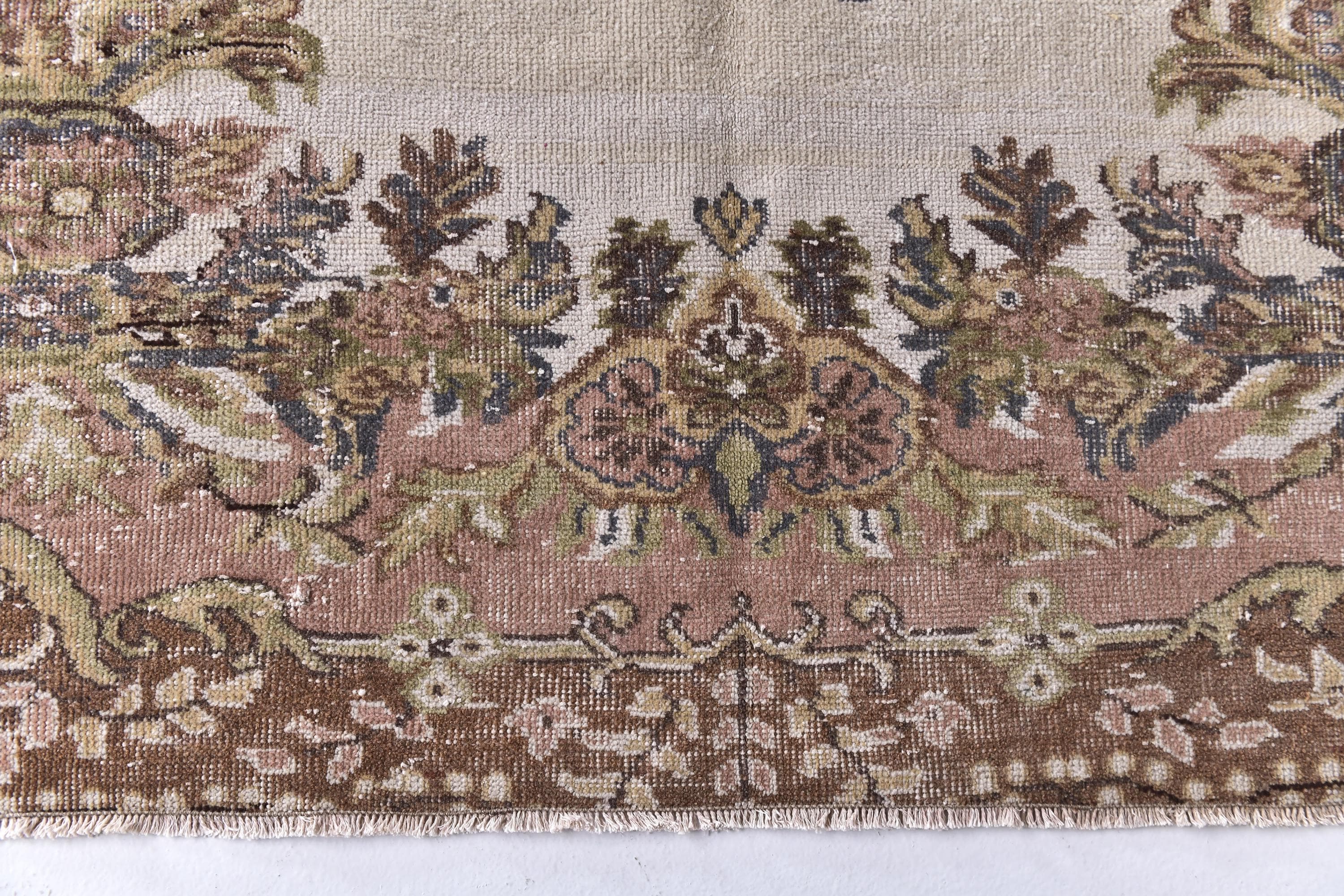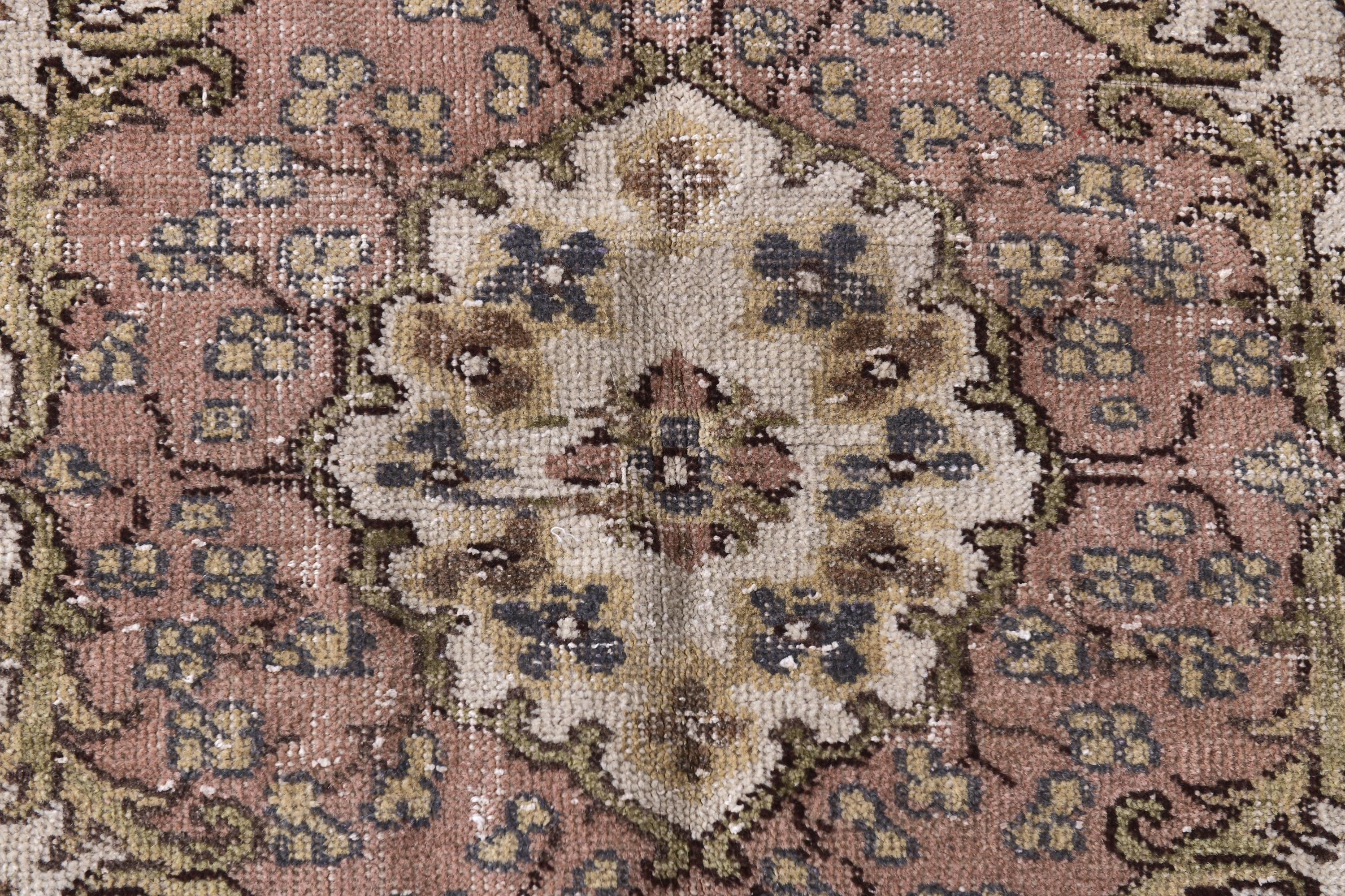 📜📌Vintage overdyed Turkish area rug in muted blush pink, taupe, and brown color palette with distressed appearance. Hand-knotted wool construction featuring central floral medallion surrounded by botanical motifs and scrolling vine patterns in soft faded tones including ivory, olive green, and dusty rose. The rug displays traditional Oushak design with worn patina, decorative borders with repeating geometric patterns, and low pile texture showing authentic vintage character and age.