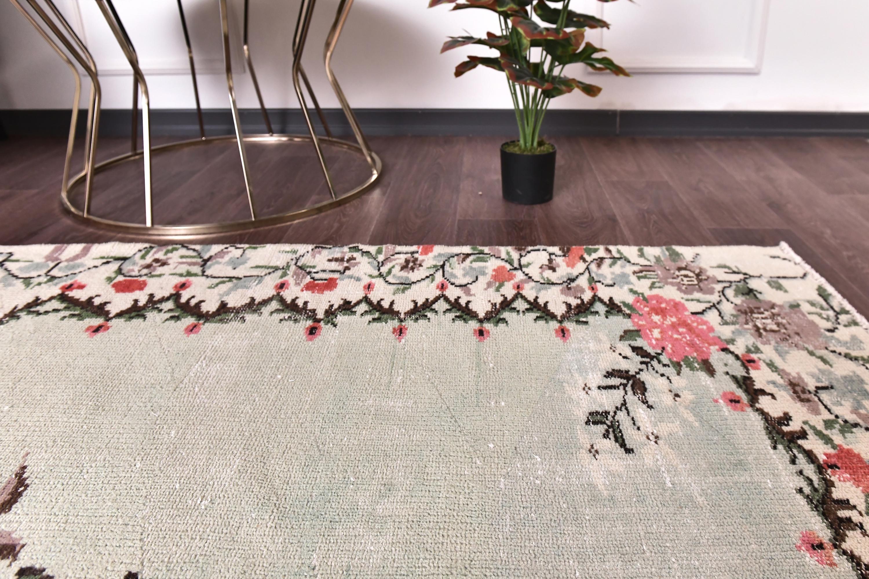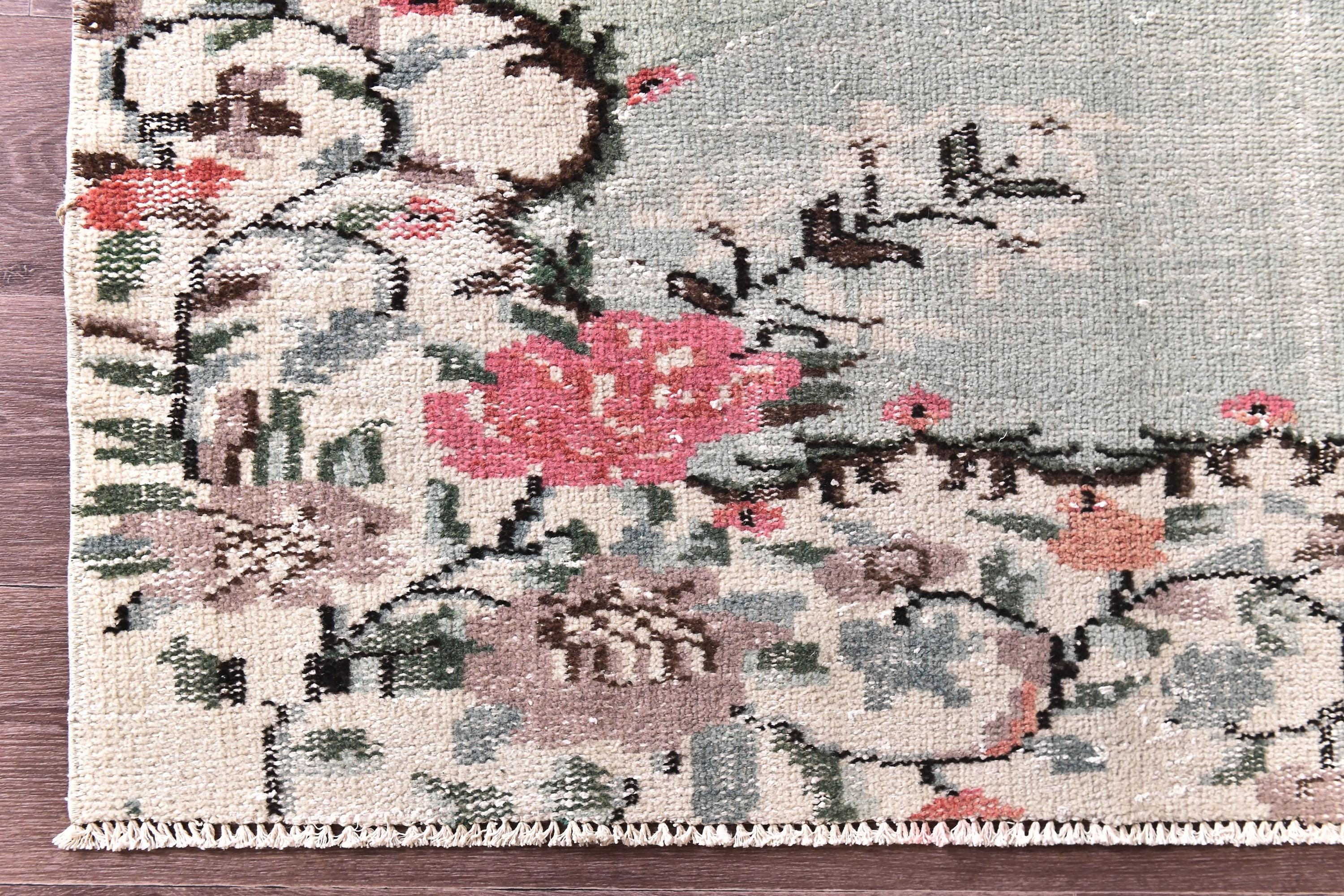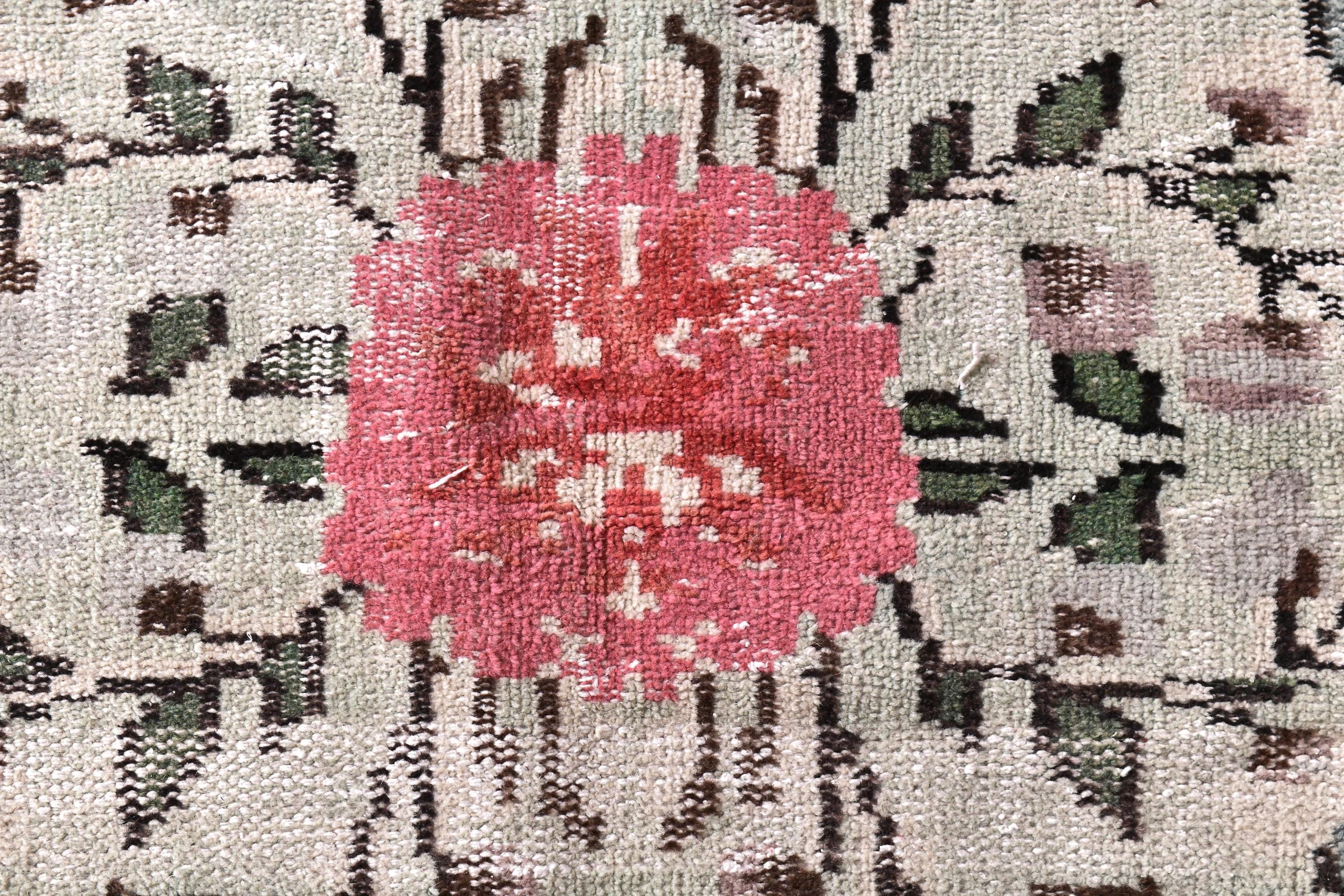 📜📌 Vintage Turkish area rug featuring scattered pink coral floral bouquet pattern on cream beige background with peachy orange border, hand-knotted distressed carpet with romantic cottage style design perfect for shabby chic farmhouse bedroom or living room decor