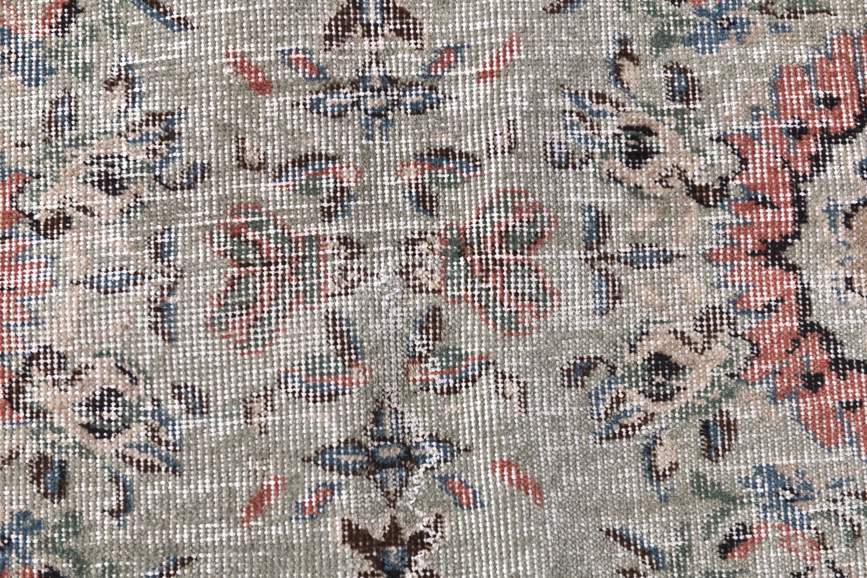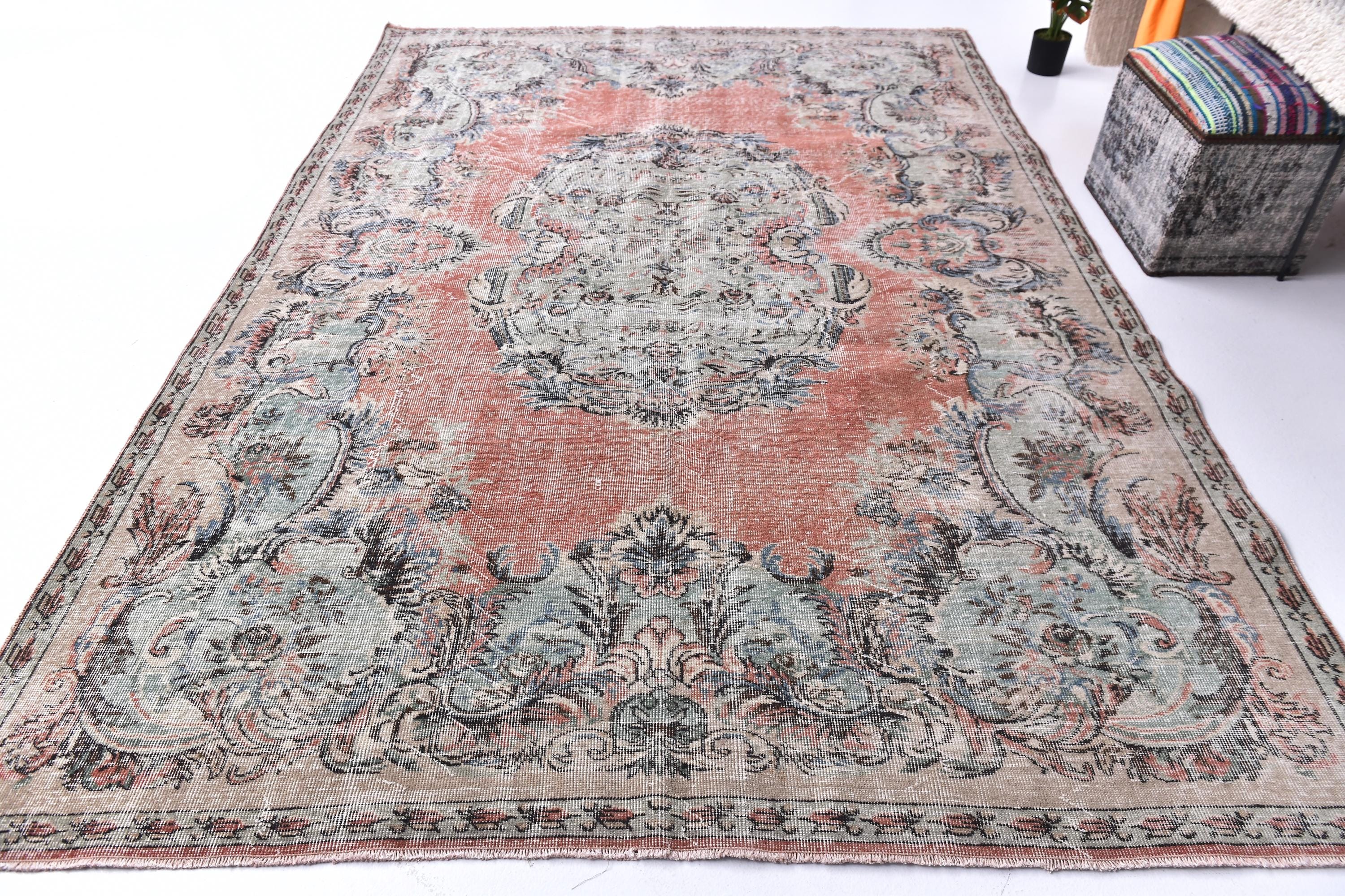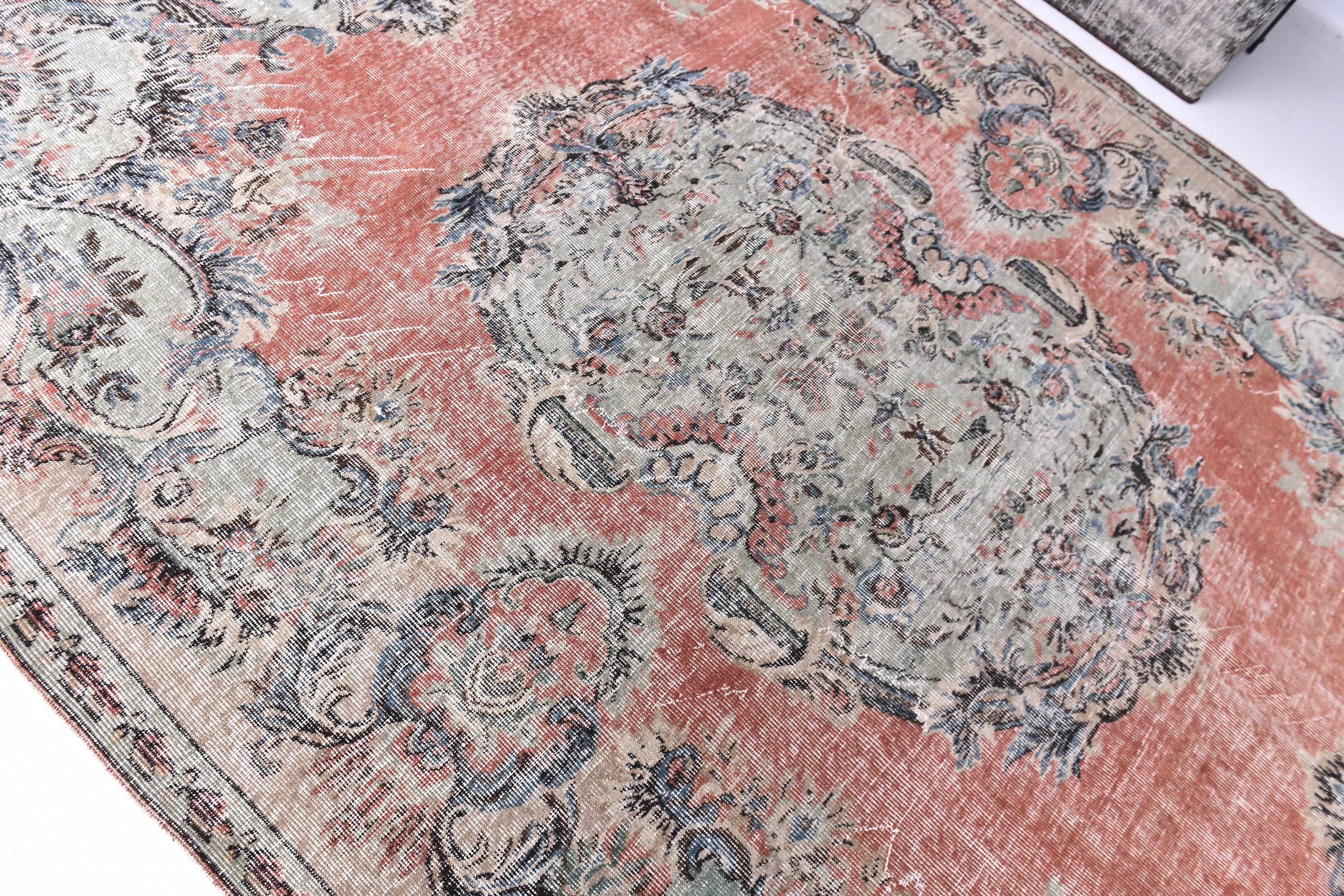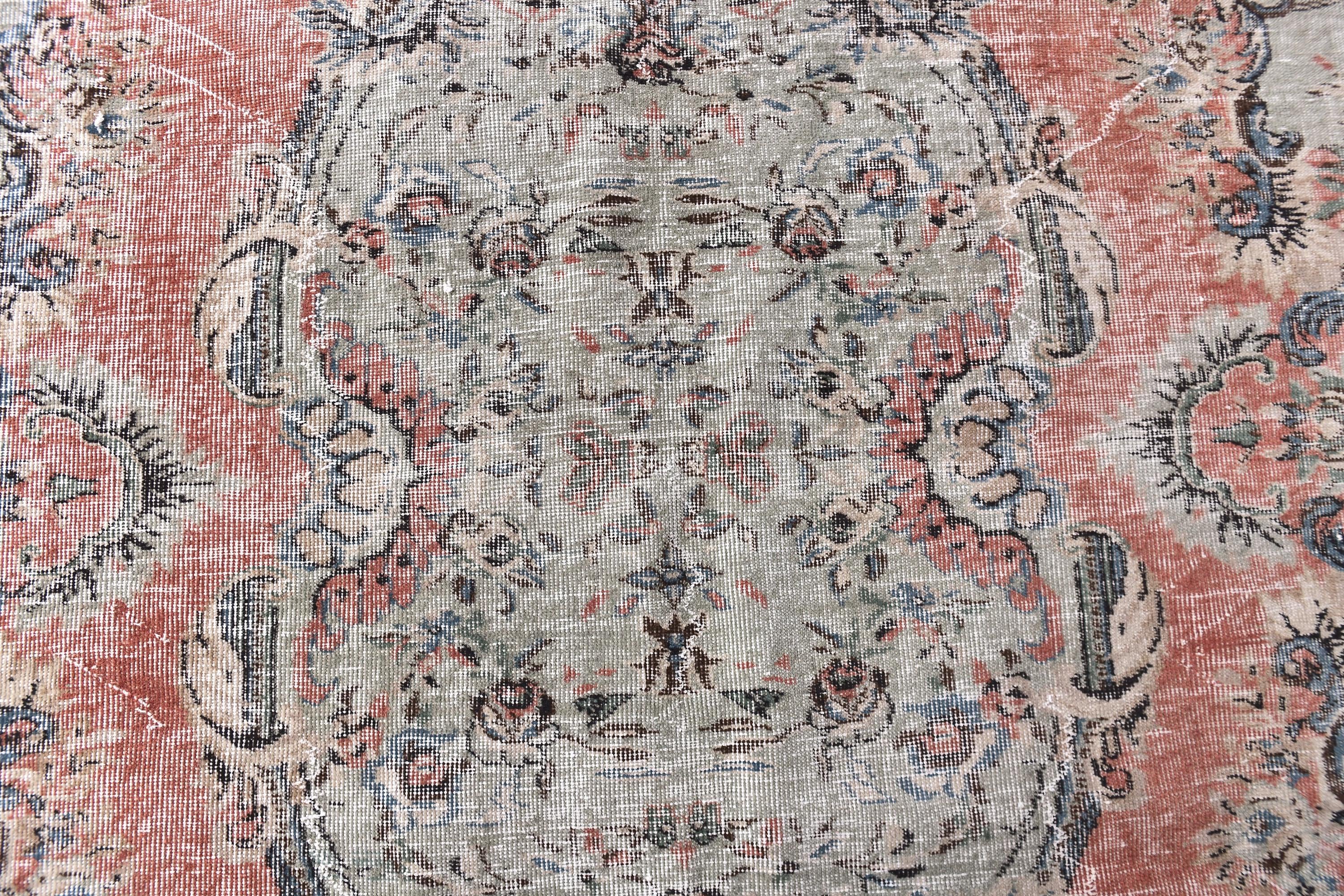 📜📌 Large vintage Turkish Oushak area rug in sophisticated color palette of faded coral pink, sage green, gray, and taupe with distressed patina. Hand-knotted wool construction featuring ornate central floral medallion surrounded by elaborate scrolling vine and botanical designs in muted pastel tones. The rug displays traditional low-pile weave with intentionally worn appearance, multiple decorative borders with paisley and floral motifs, and authentic vintage character showing natural aging and color fading throughout.
