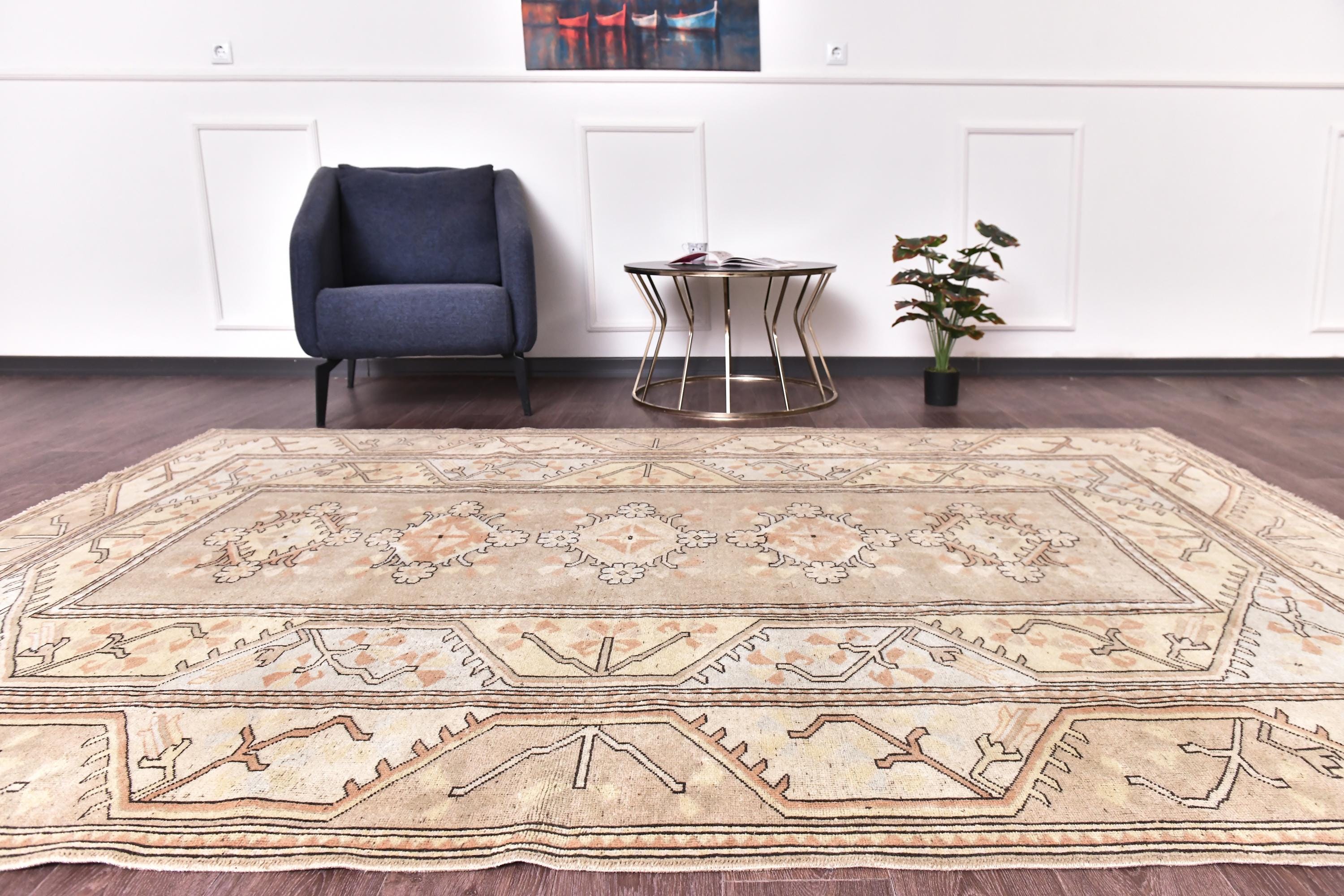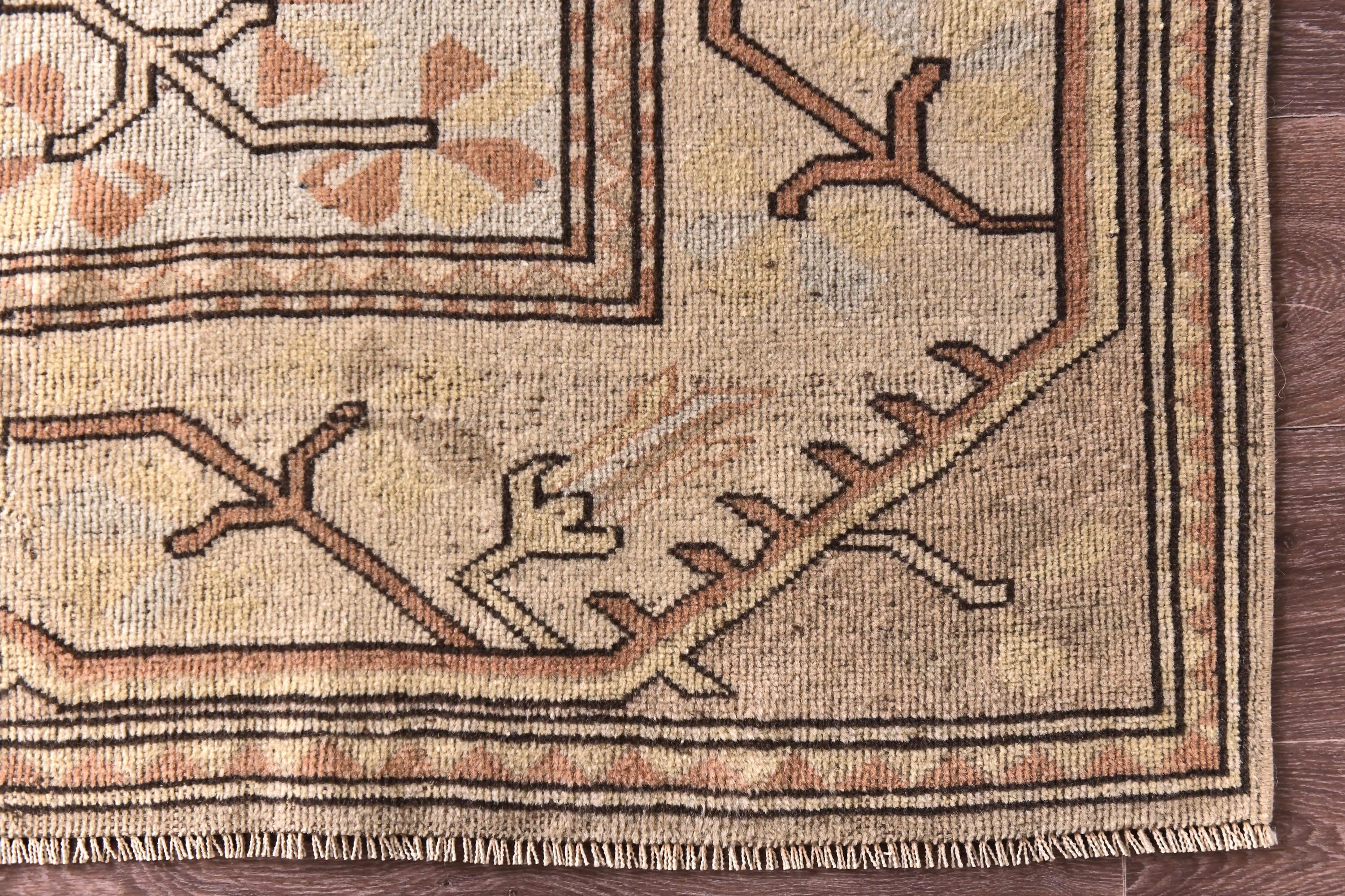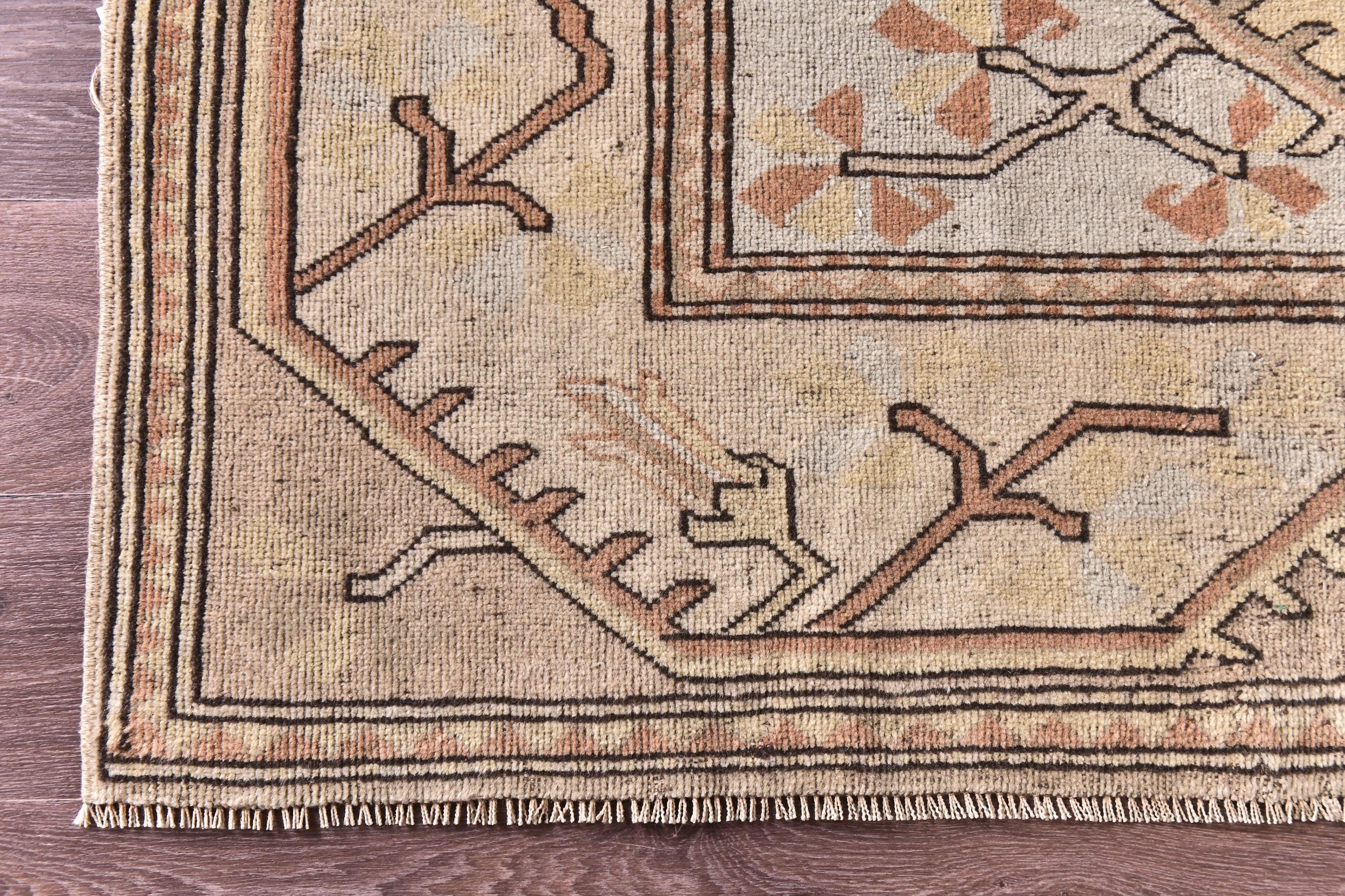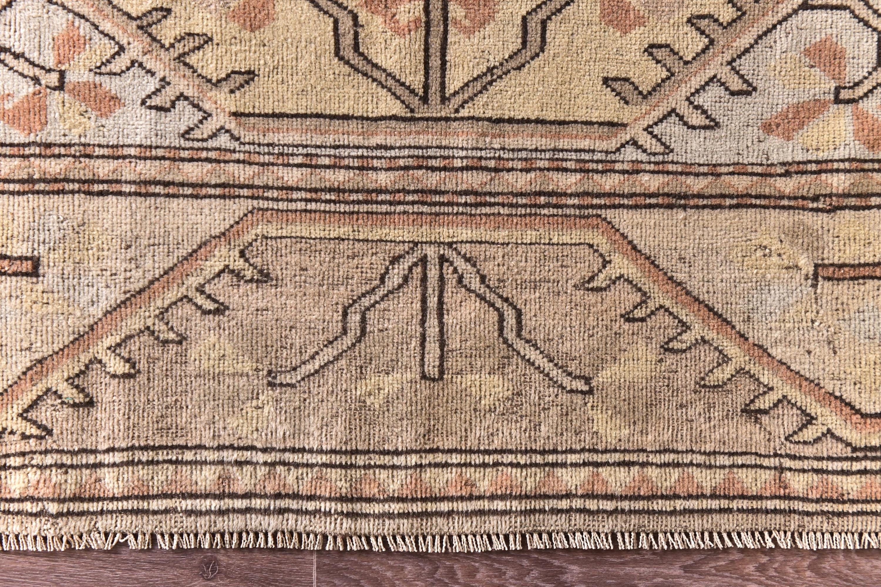 📜📌Vintage Turkish Milas area rug featuring geometric medallions in neutral beige, taupe, and soft peach tones. Hand-knotted wool rug with distressed patina, wide decorative borders with geometric motifs, and traditional Anatolian design. Perfect for living room, bedroom, or dining room.