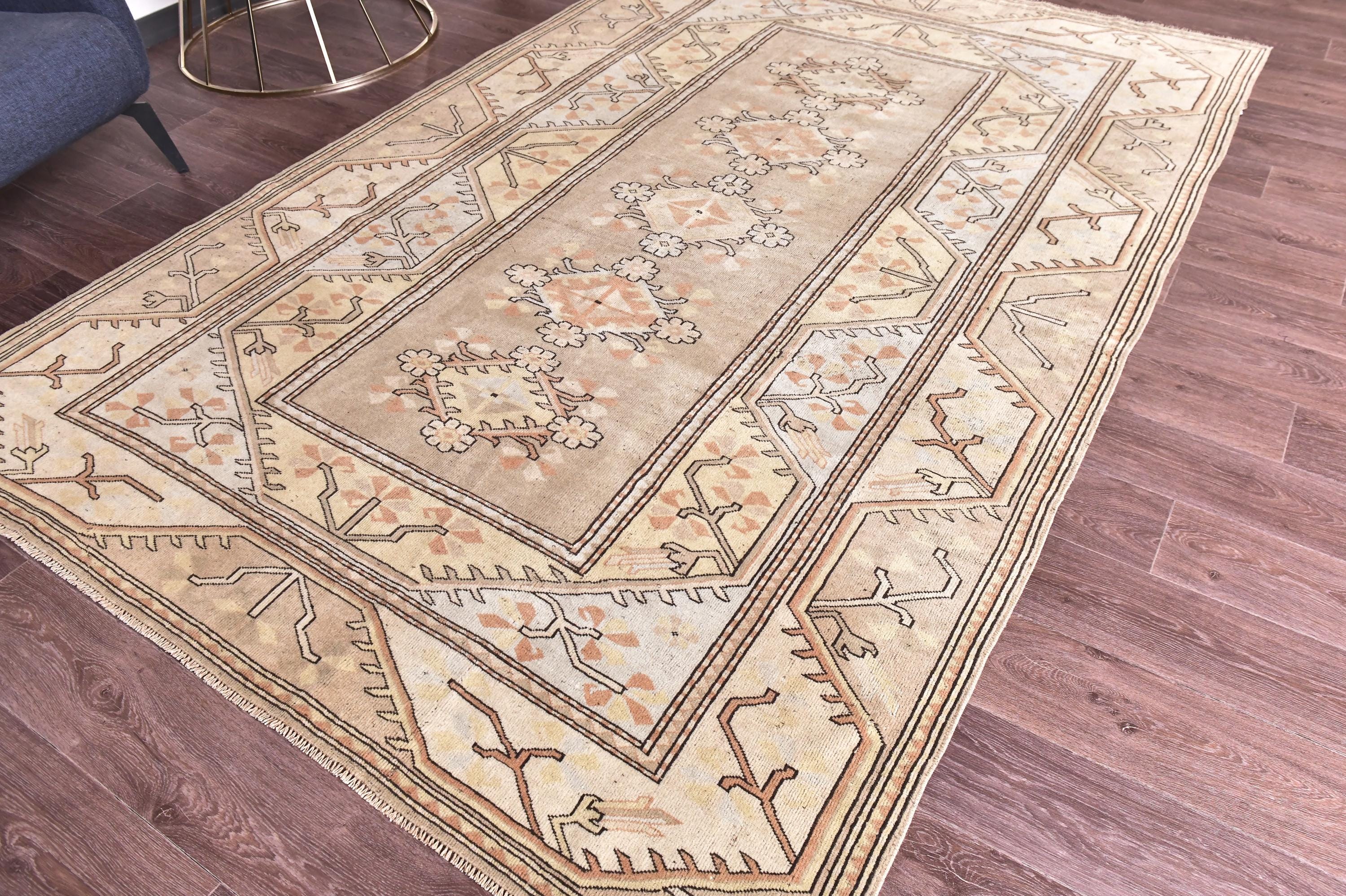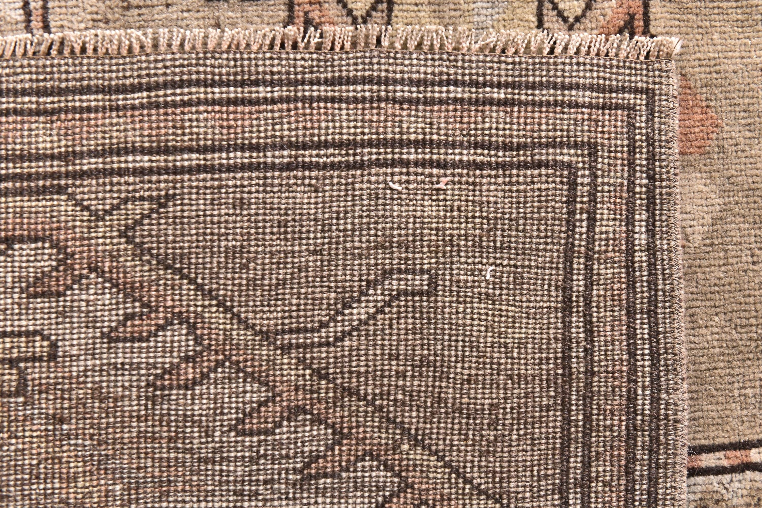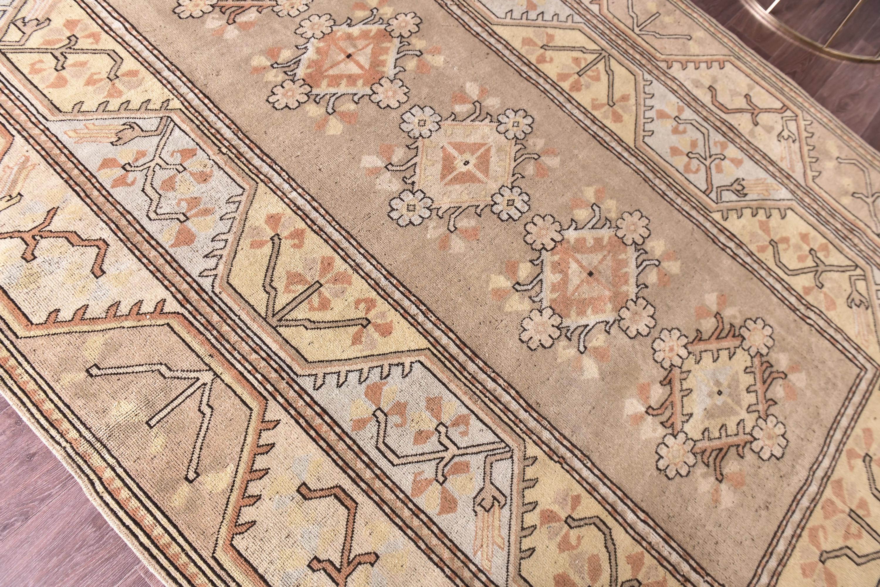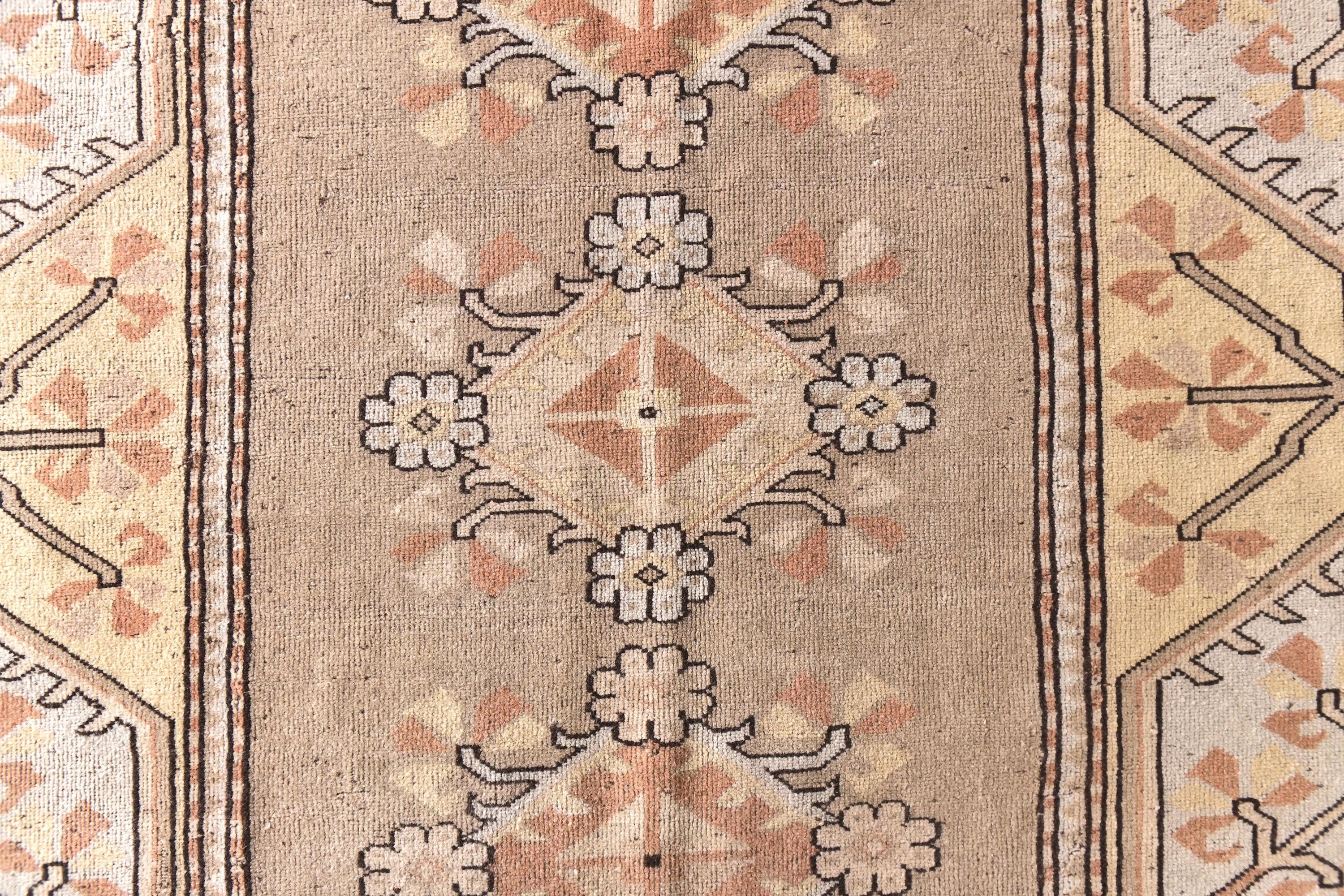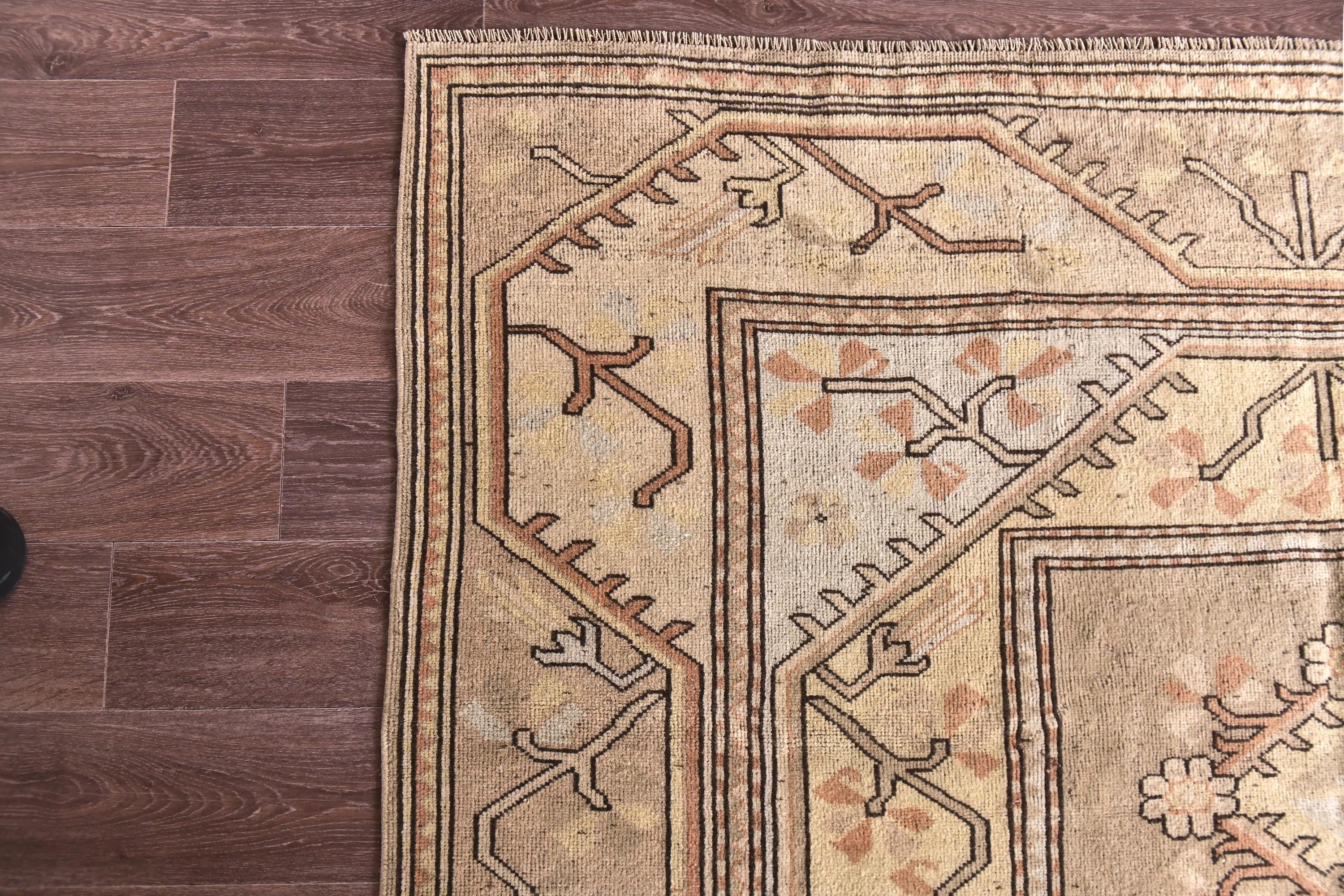 📜📌Vintage Turkish Milas area rug featuring geometric medallions in neutral beige, taupe, and soft peach tones. Hand-knotted wool rug with distressed patina, wide decorative borders with geometric motifs, and traditional Anatolian design. Perfect for living room, bedroom, or dining room.