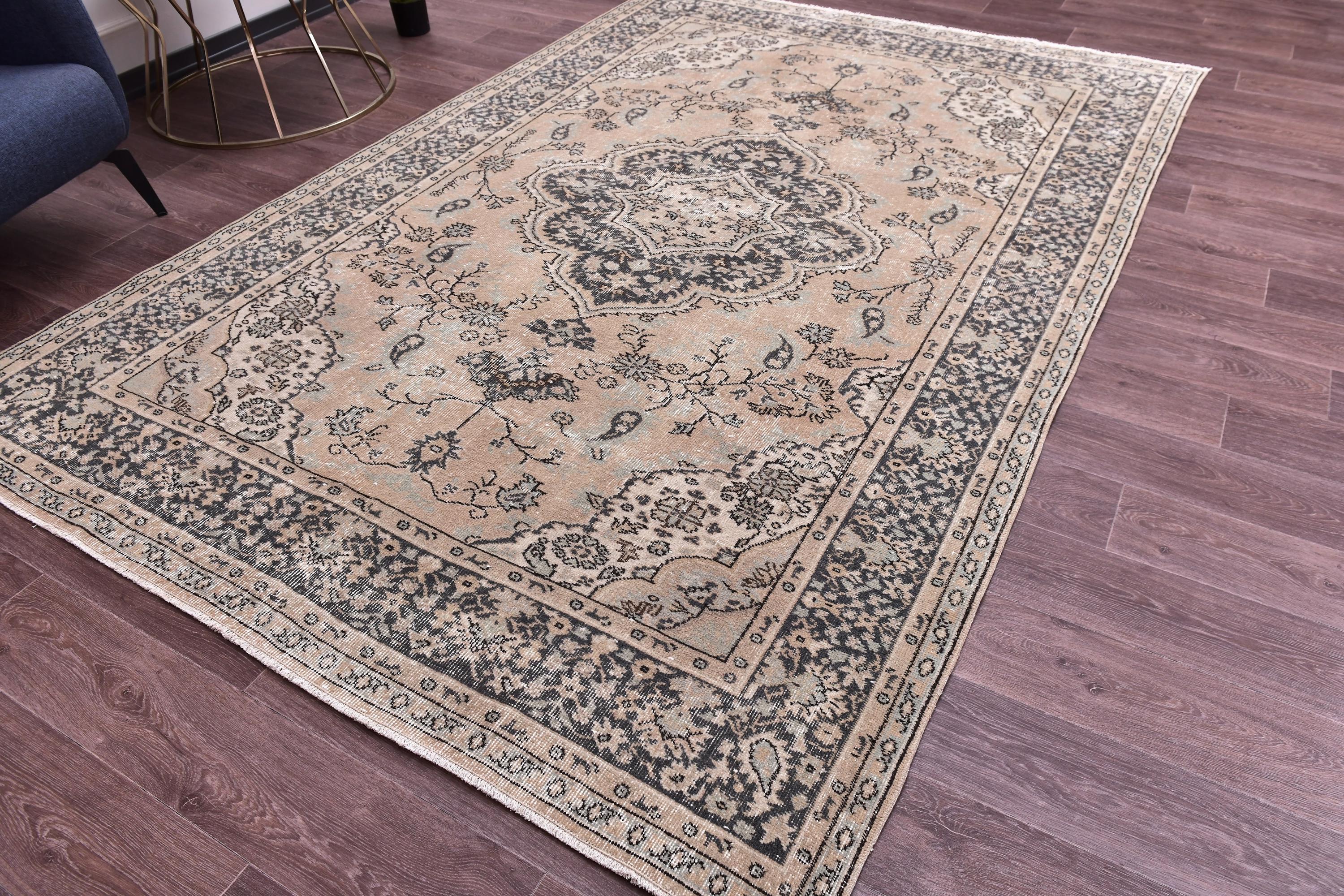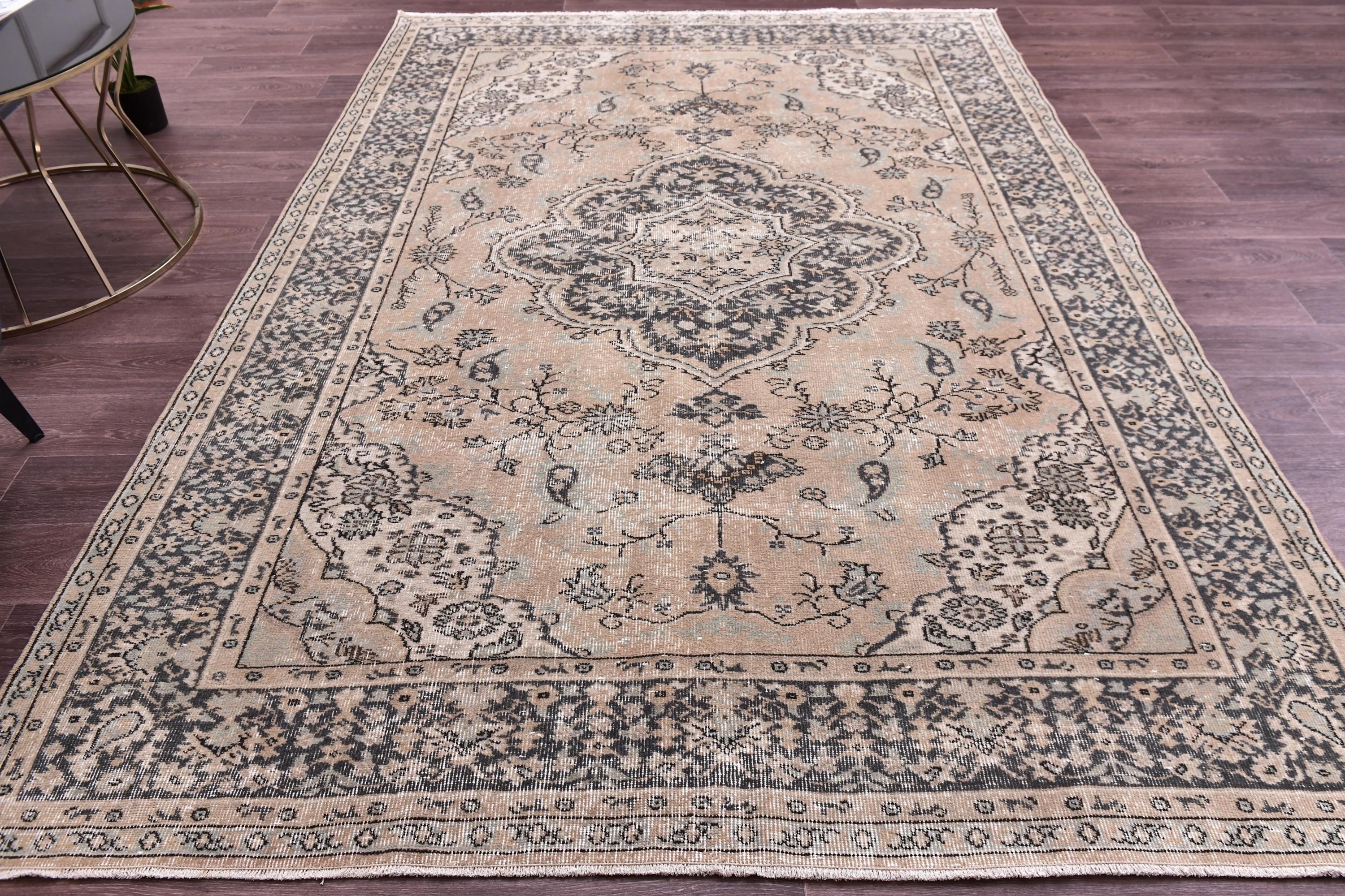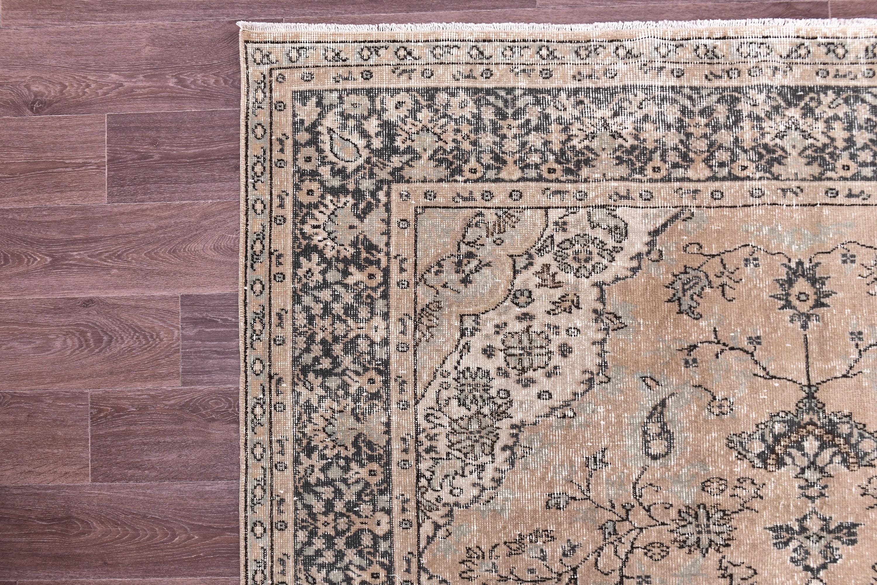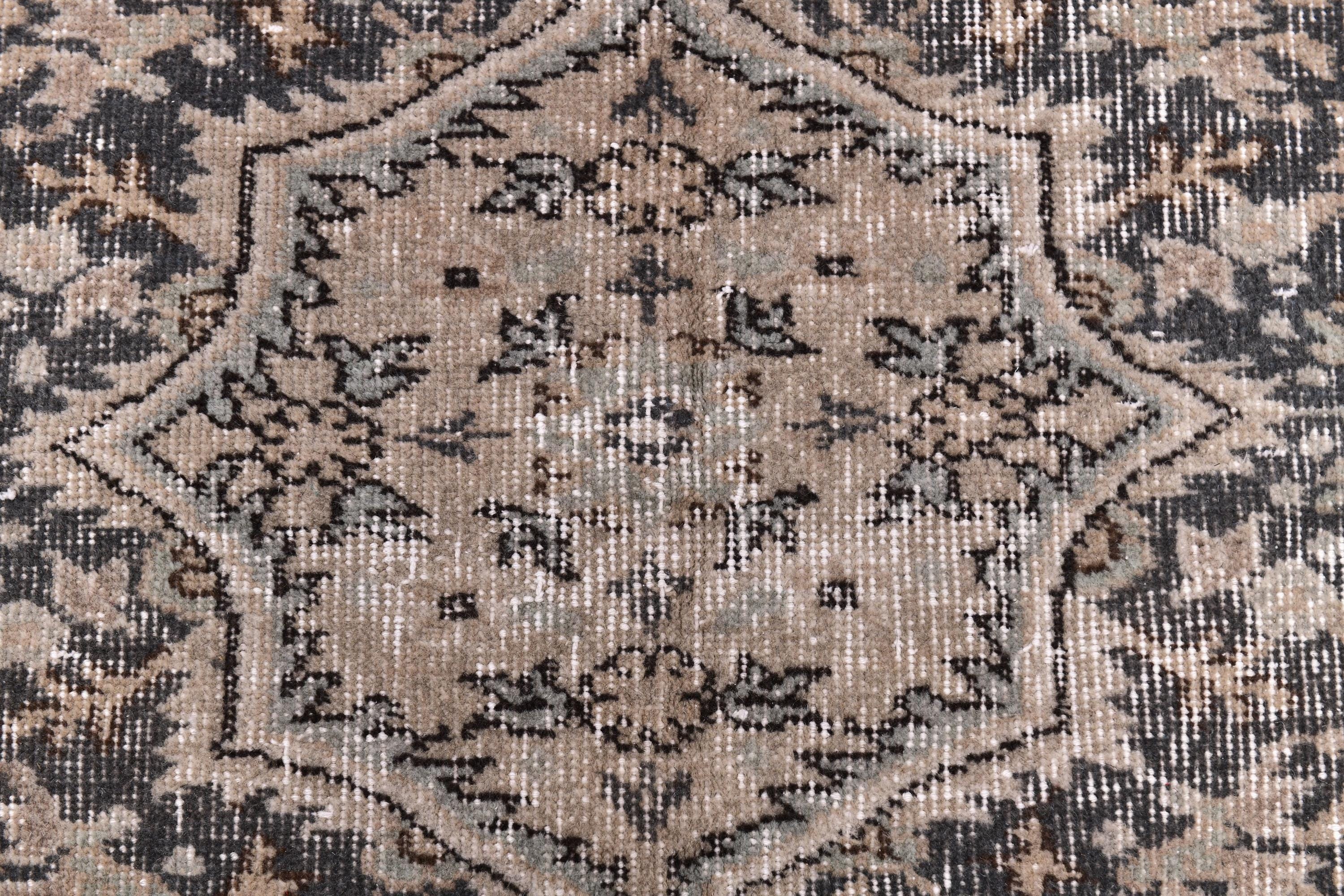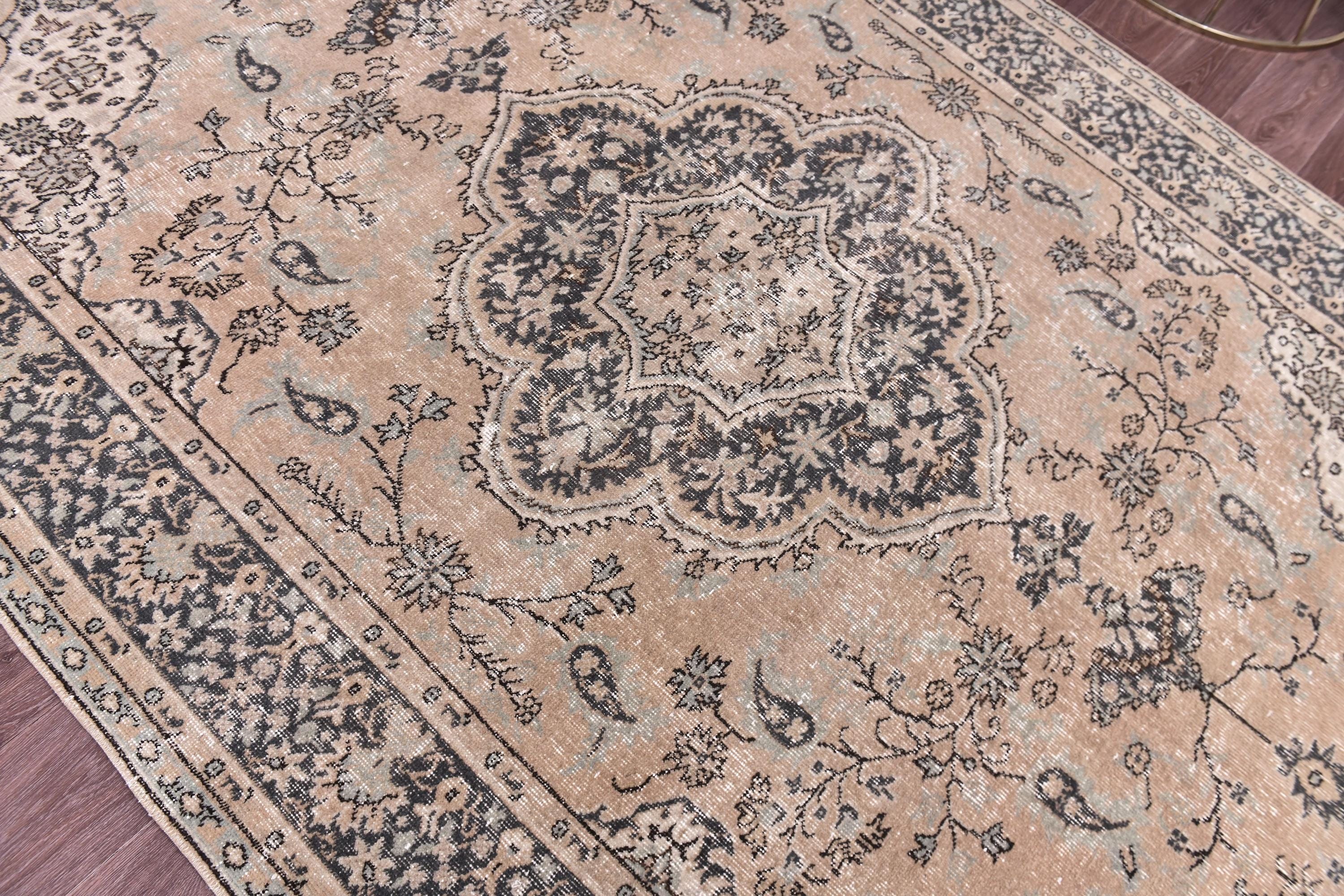 📜📌📌 Antique Turkish area rug with salmon and black field featuring ornate floral medallion center surrounded by delicate botanical motifs. Hand-knotted wool rug with charcoal gray and cream floral borders, low pile with distressed vintage patina, and Persian-inspired symmetrical design. Perfect for neutral, modern farmhouse, or traditional living room decor.