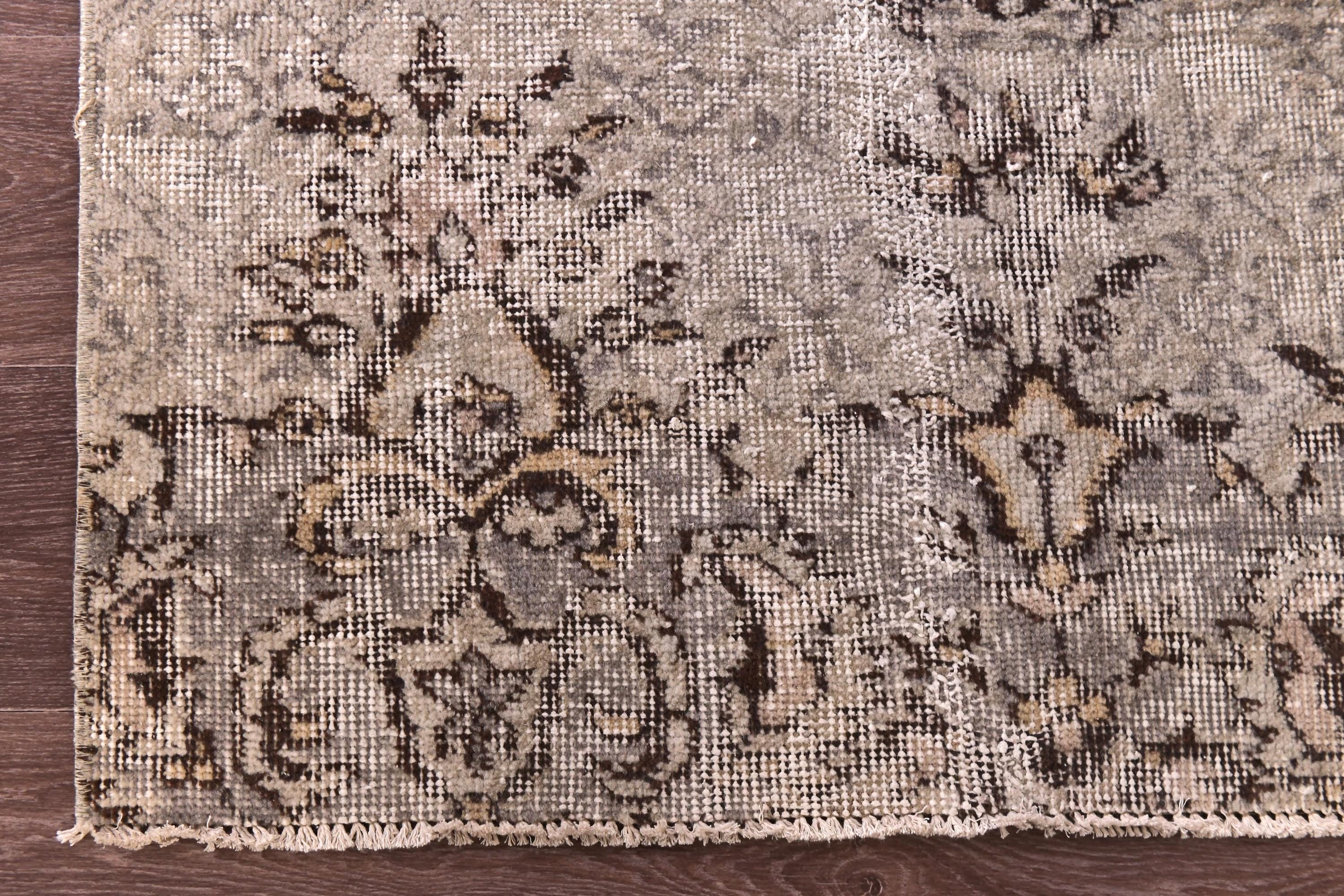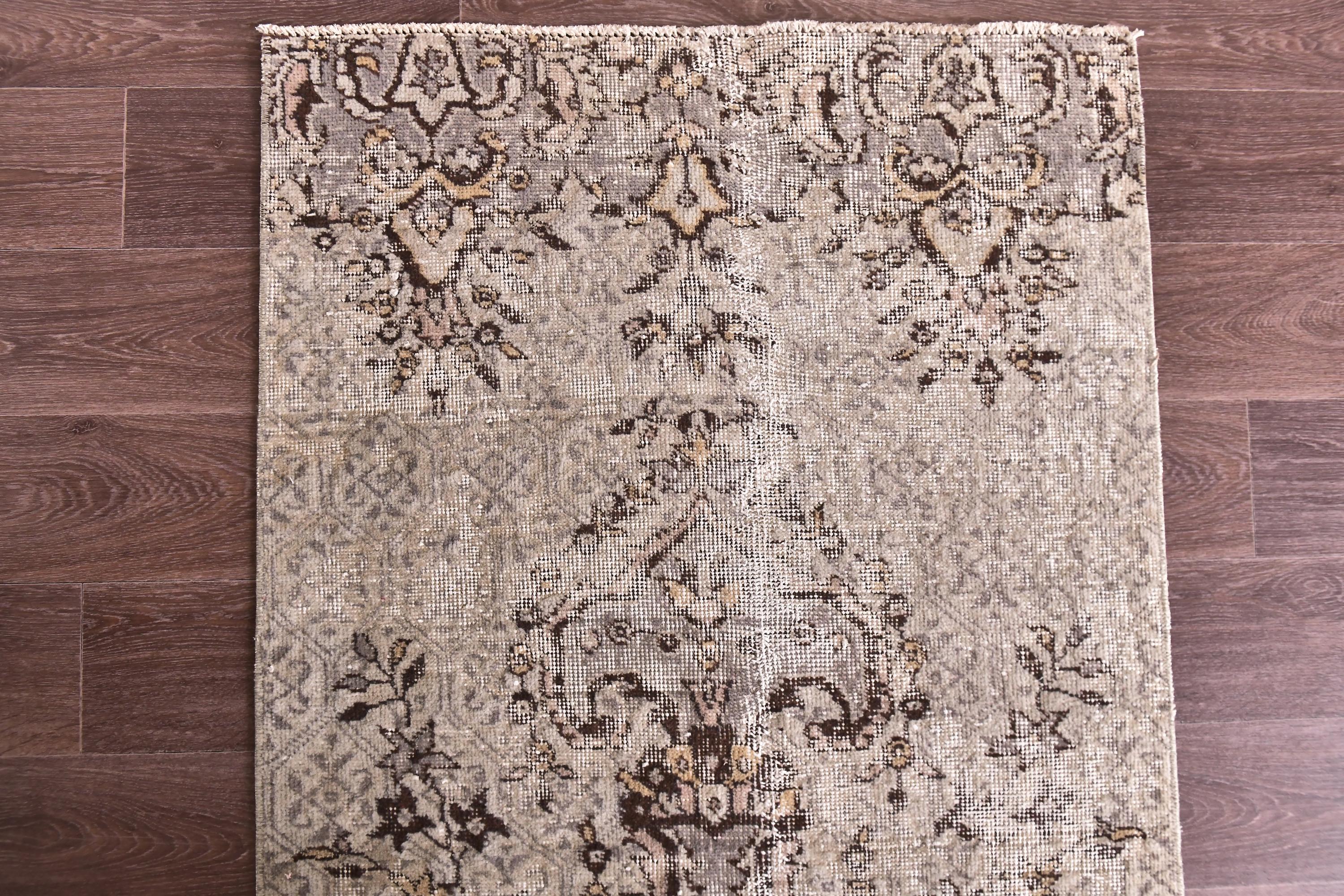 📜📌 Vintage Turkish runner rug in neutral beige and taupe tones with distressed appearance. This long narrow hallway carpet features triple medallion design with intricate floral and geometric motifs throughout. The hand-knotted wool runner displays faded earth tones including cream, brown, gray, and sandy beige. Low pile texture with authentic vintage wear creates a timeless aesthetic perfect for hallways, entryways, or kitchen spaces.