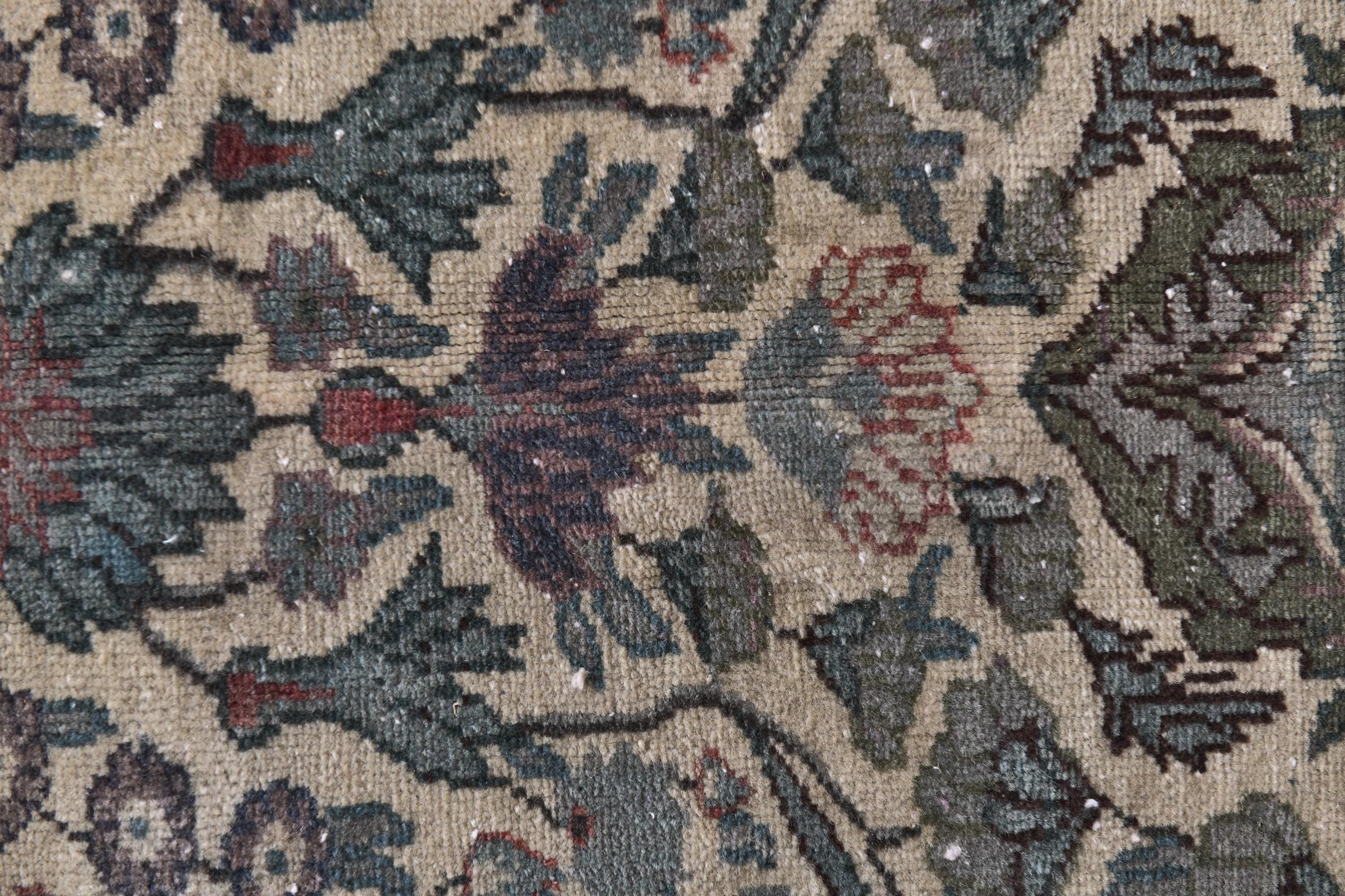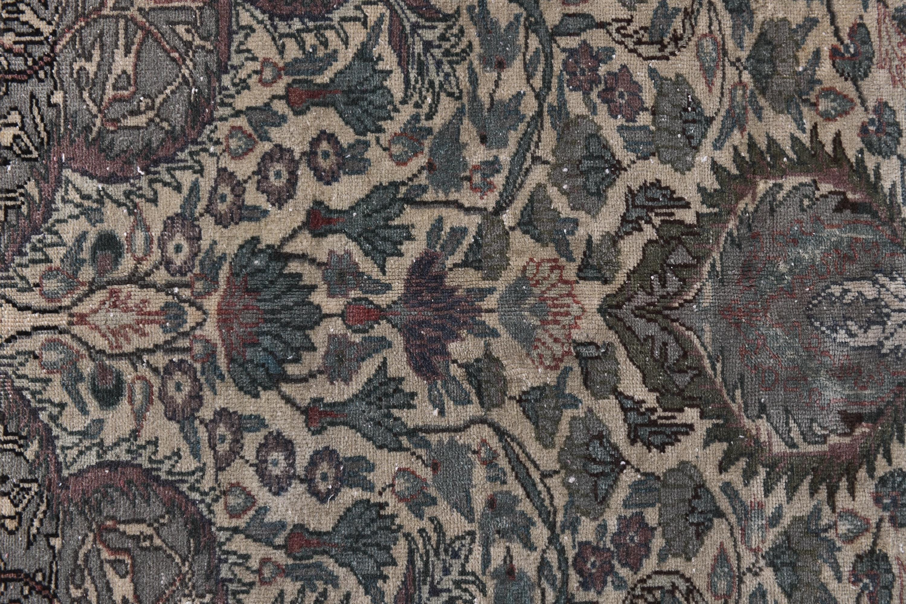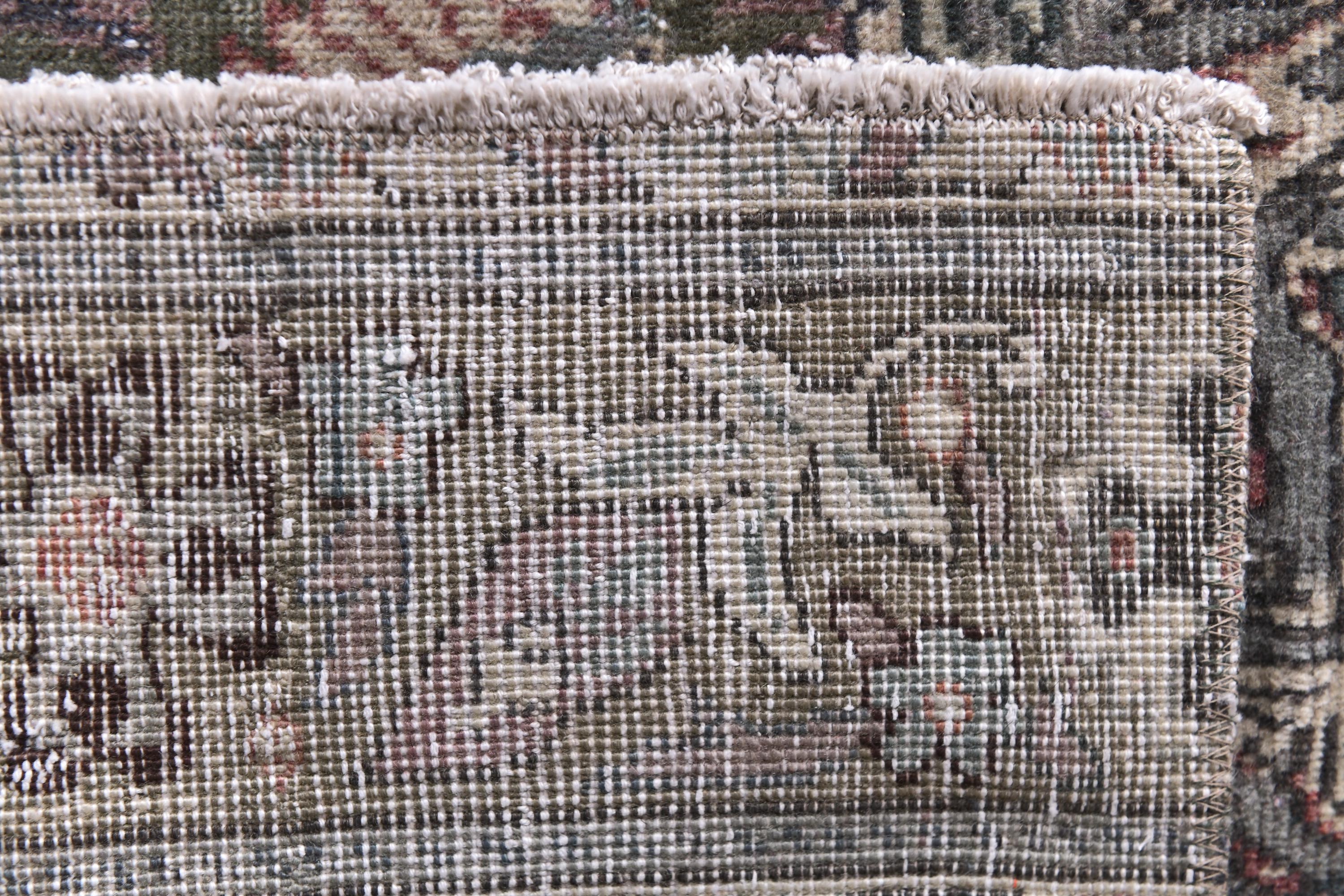 📜📌 Close-up detail of an antique-style Persian style rug showing complex paisley patterns and floral medallions. The carpet features a rich color palette of olive green, cream, rust, and dark accents with fine knotting and traditional Middle Eastern craftsmanship.