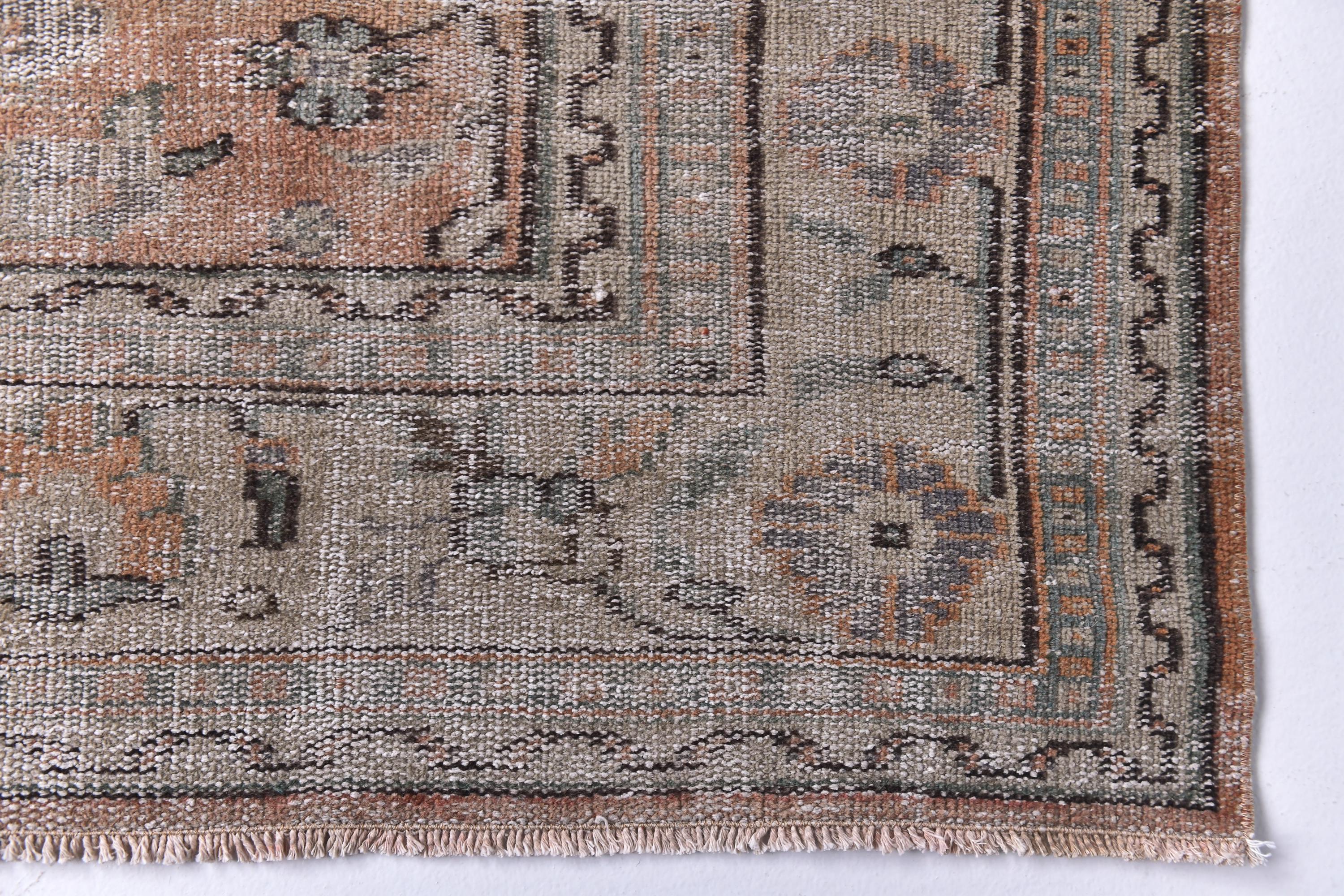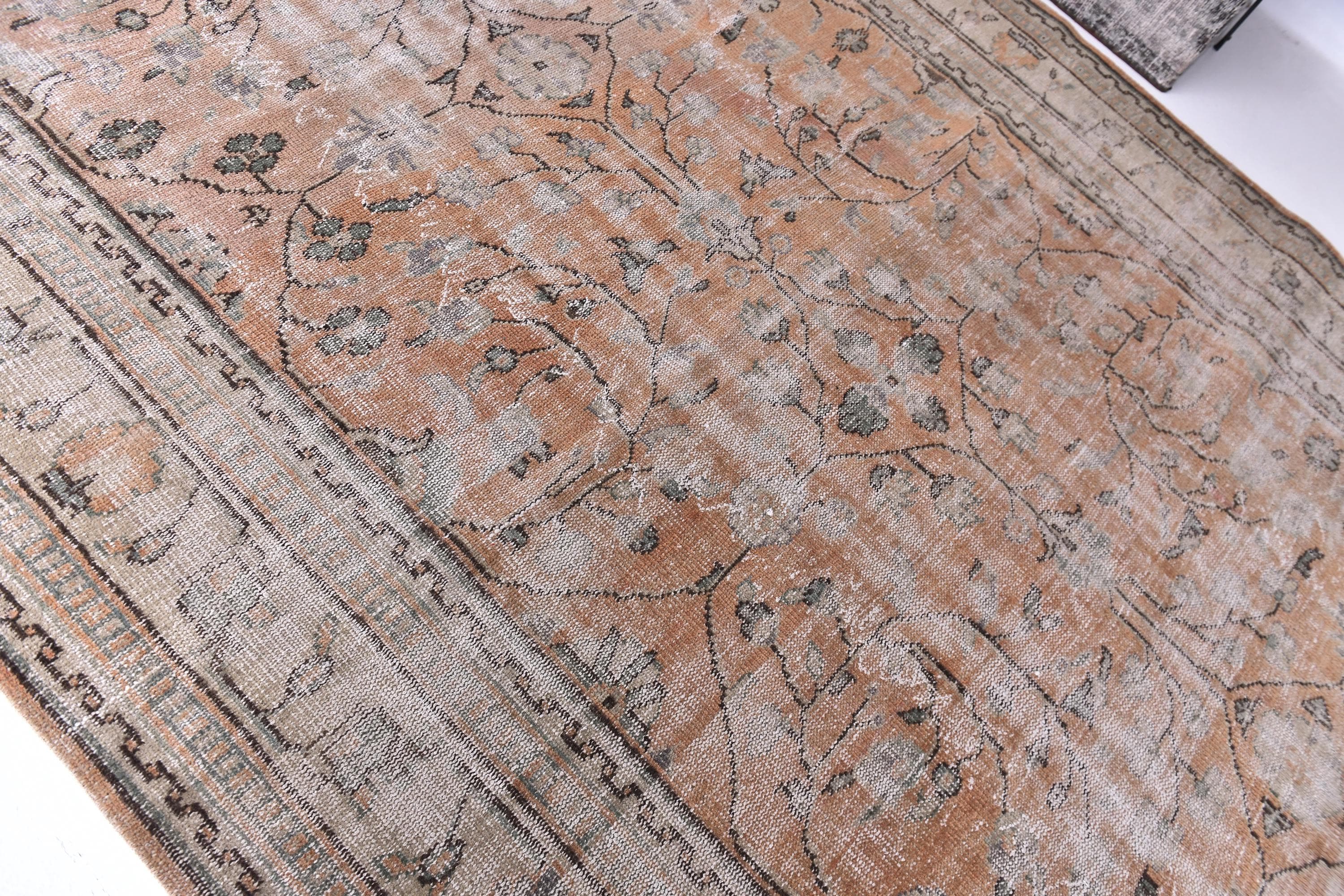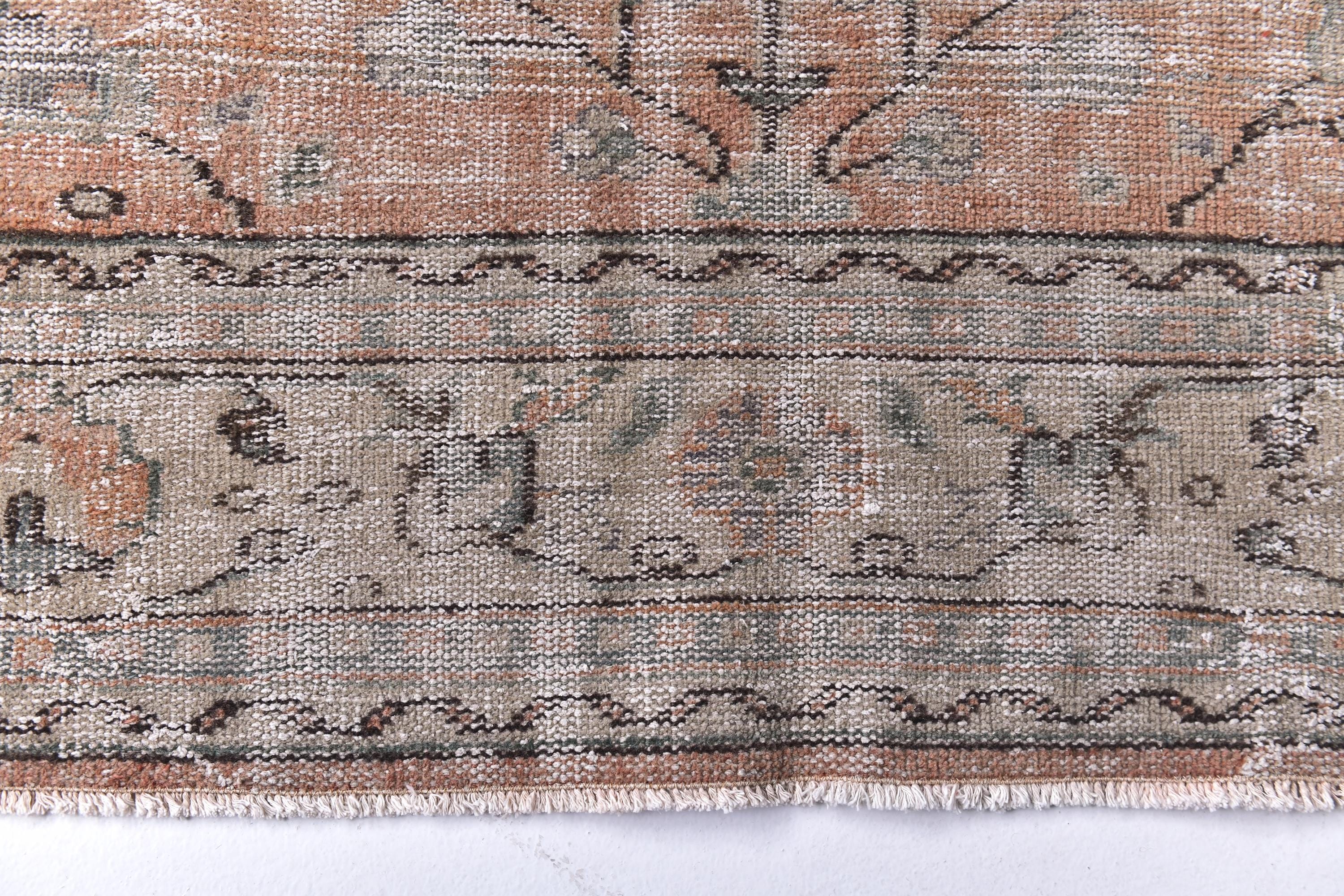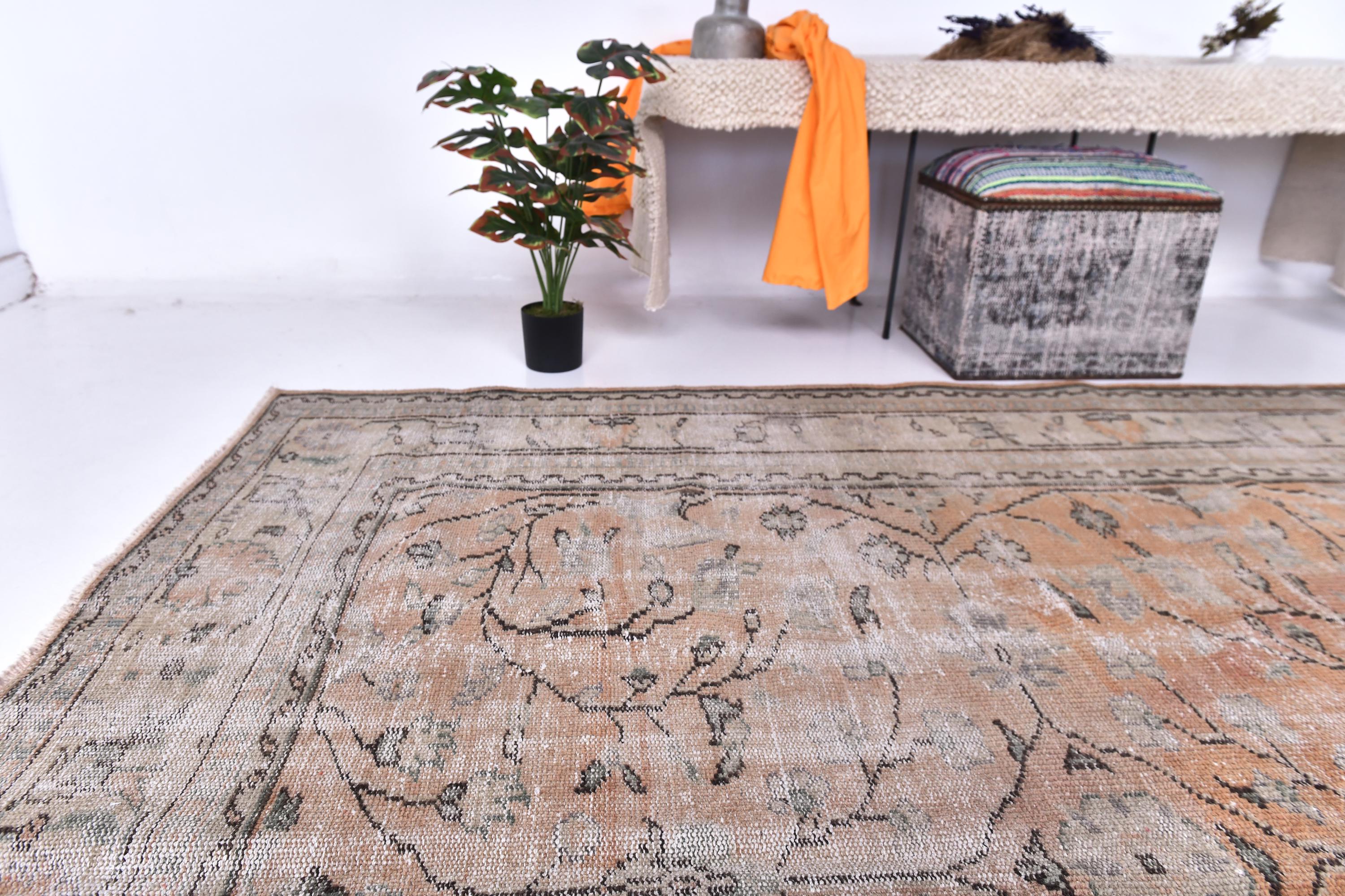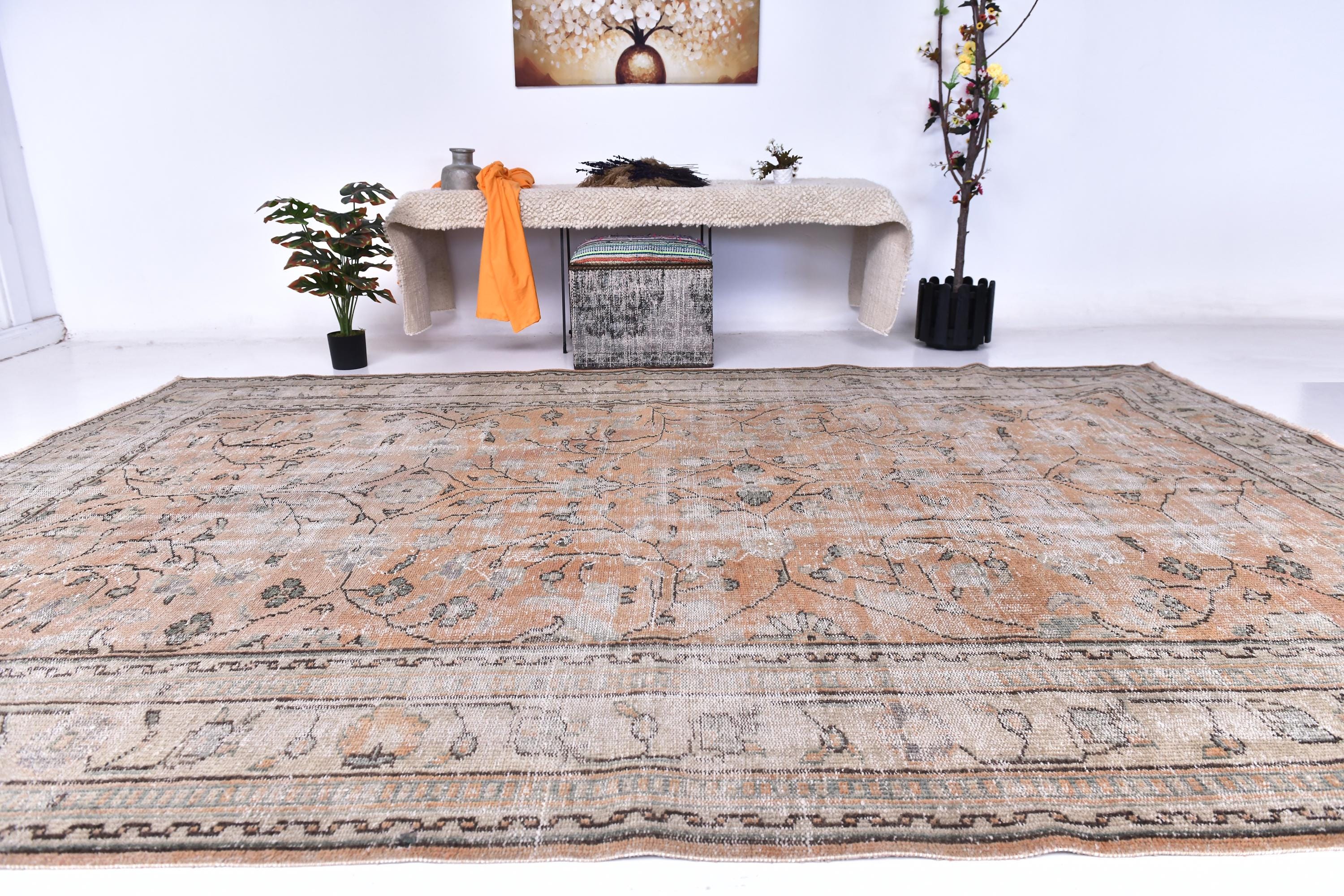 📜📌 Hand-woven Turkish wool rug displaying a heavily weathered patina in neutral peach and silver-gray palette. The vintage Oushak carpet features intricate all-over floral and vine patterns covering the entire field without a central medallion. Close-up detail reveals the authentic low pile texture and faded coloration characteristic of genuine antique rugs. The muted earth tones including rust, sage, and cream create a versatile foundation for contemporary or traditional spaces.