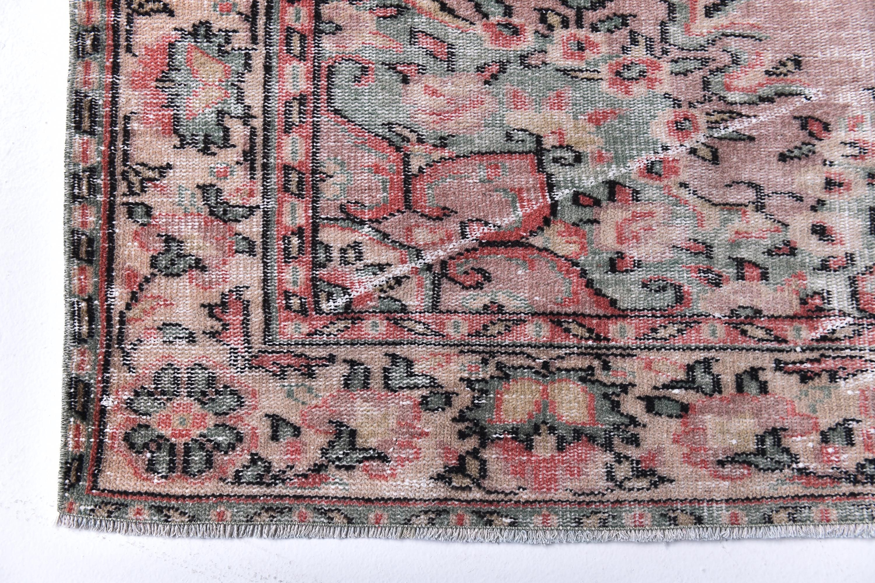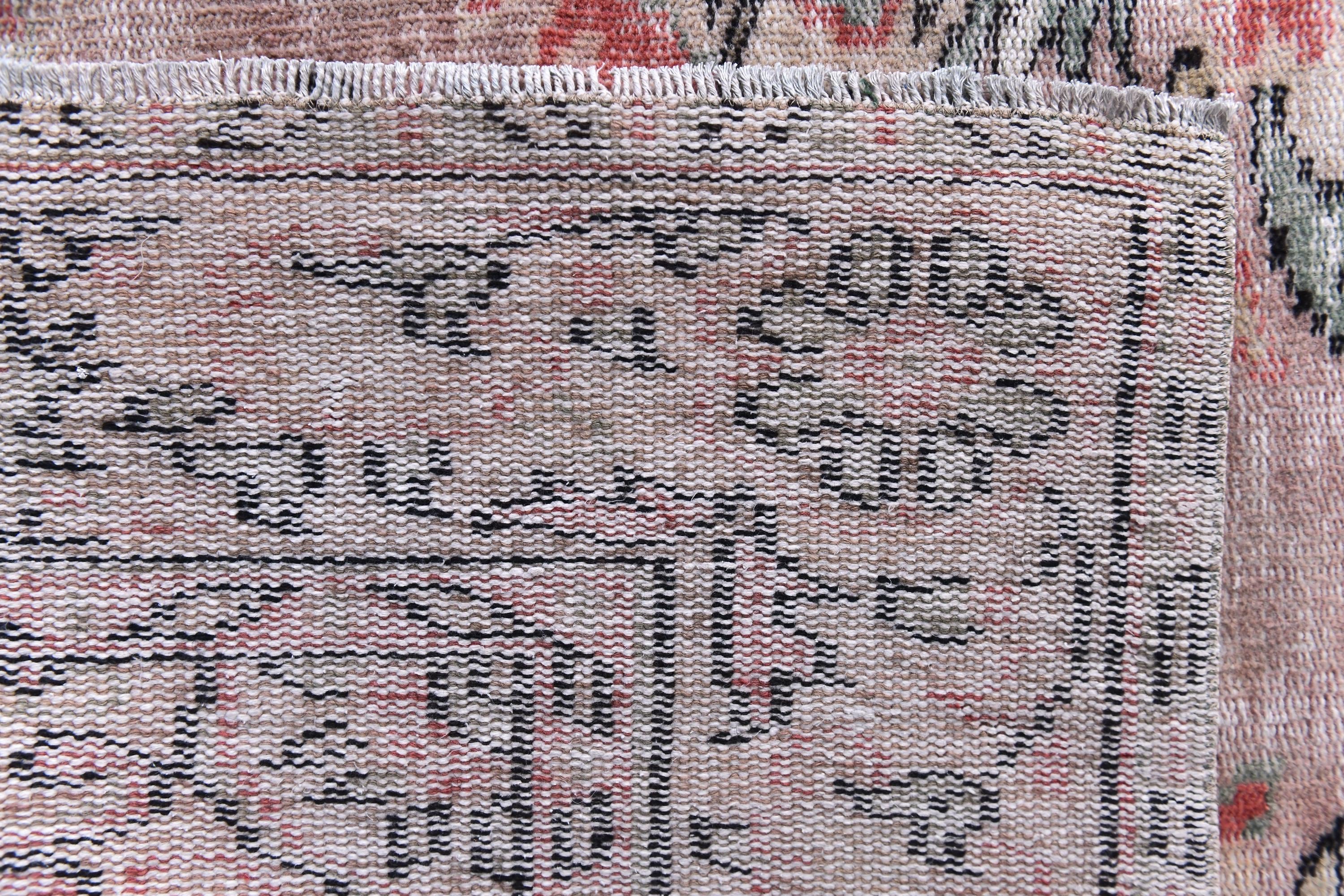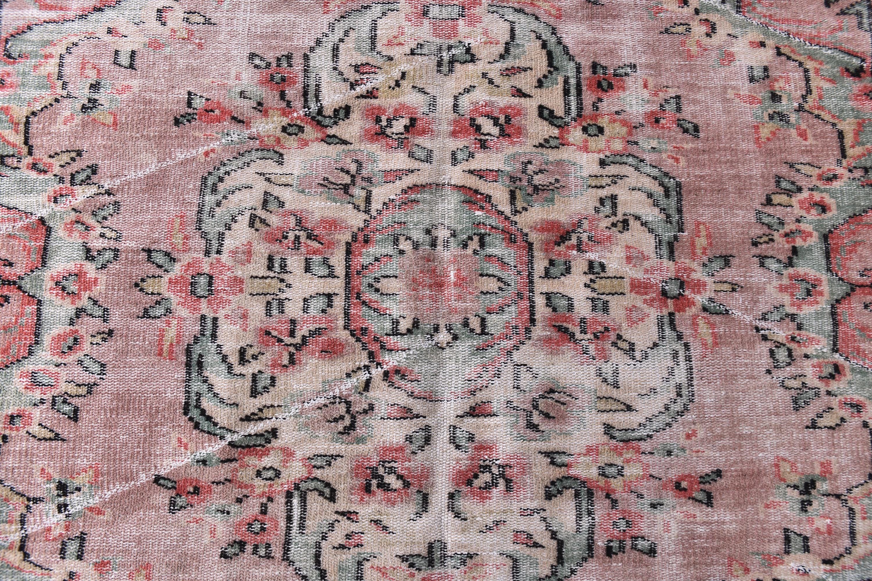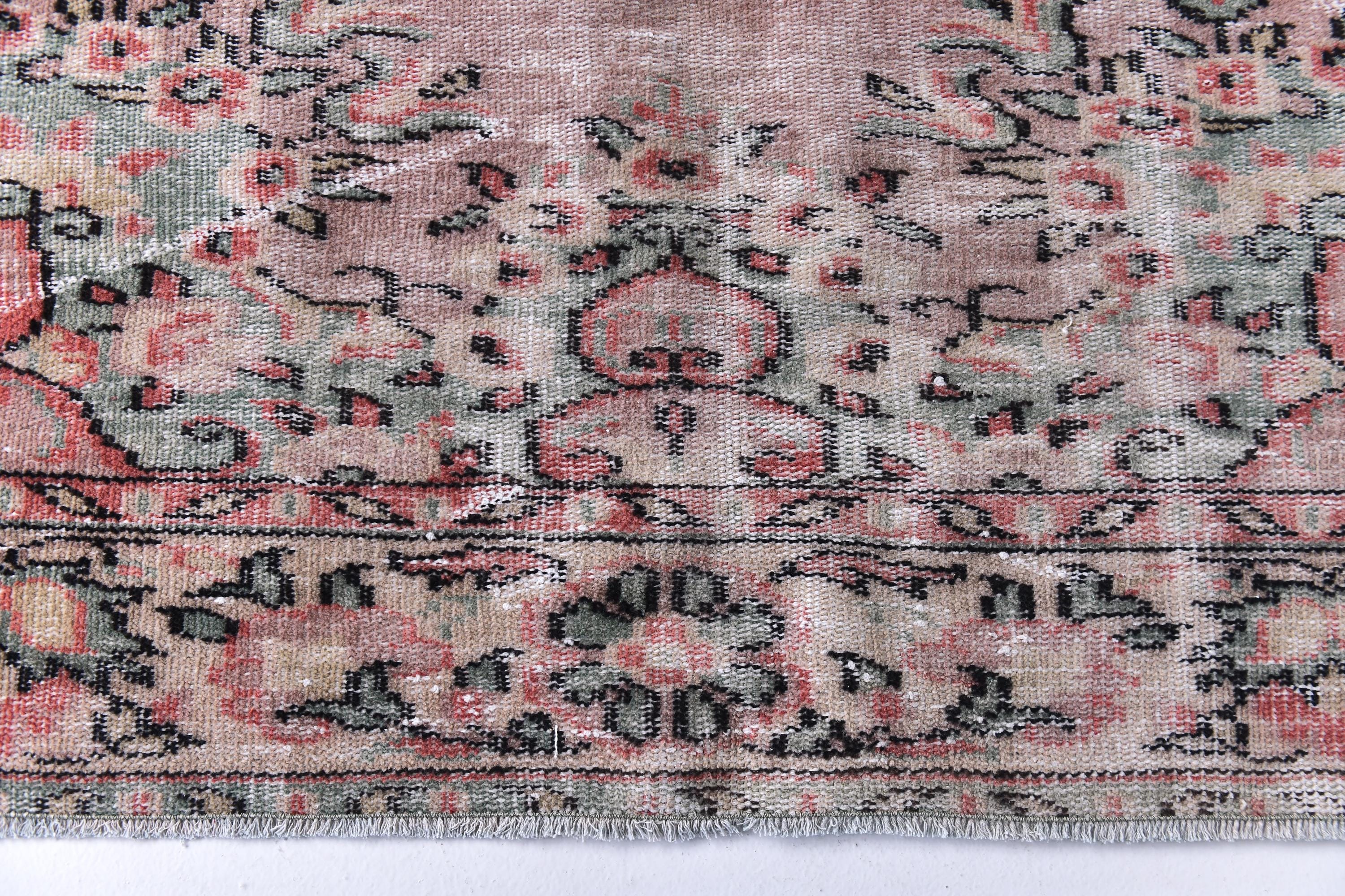 📜📌 Faded pink vintage area rug displaying intricate hand-knotted floral designs and geometric patterns. The rug features a distressed, low-pile texture in soft coral, mint green, and beige hues with traditional Persian-inspired medallions and an ornamental border running throughout.