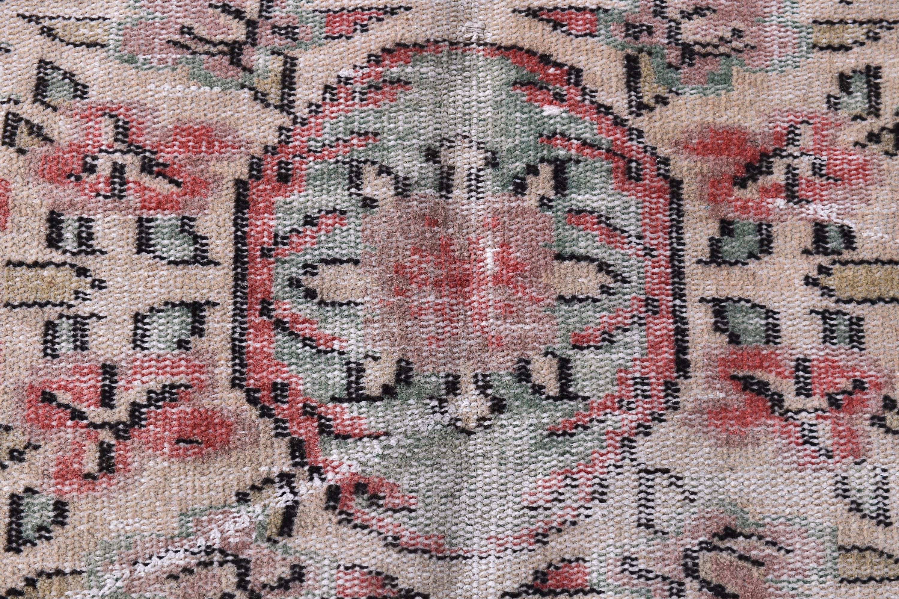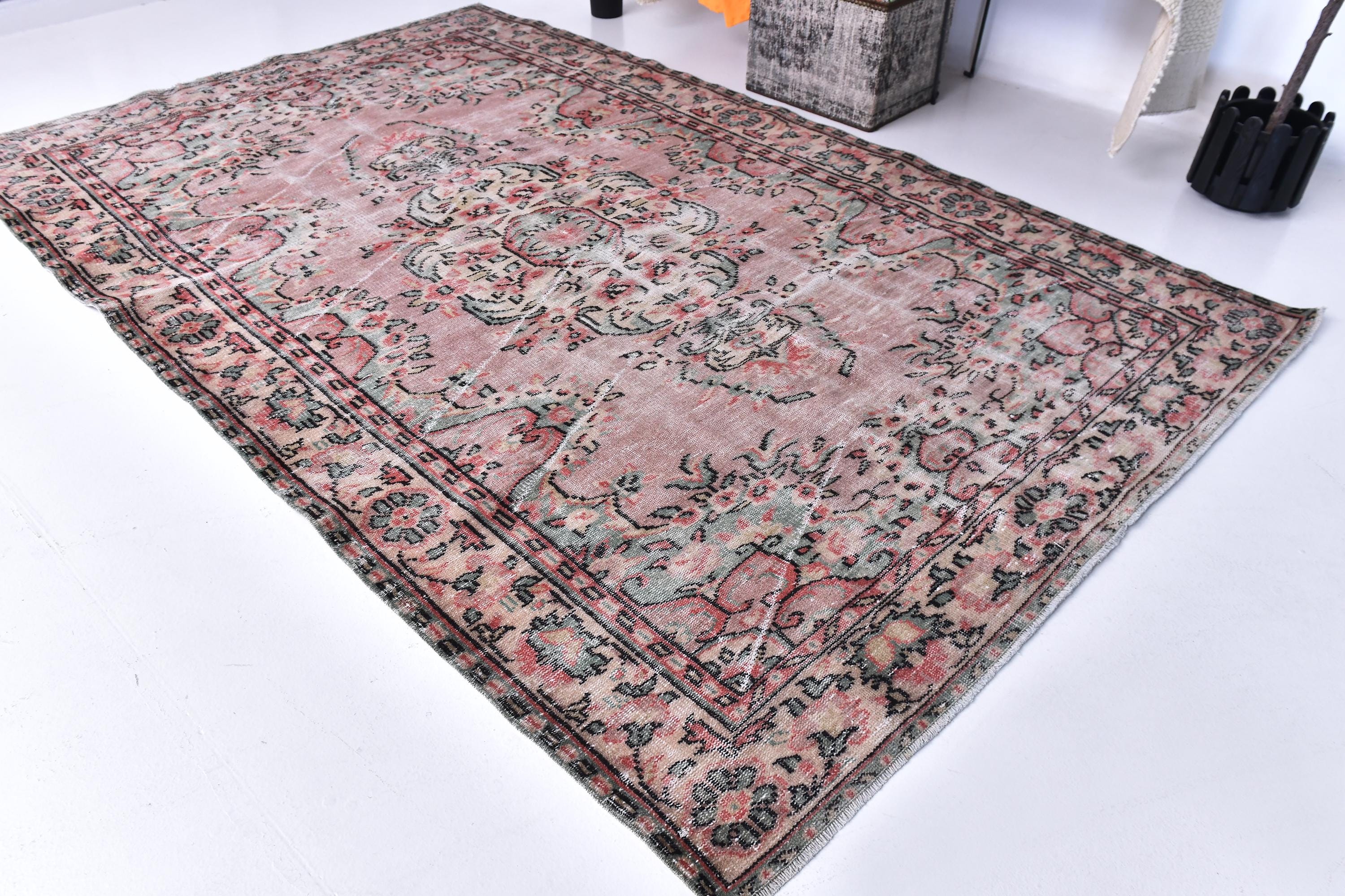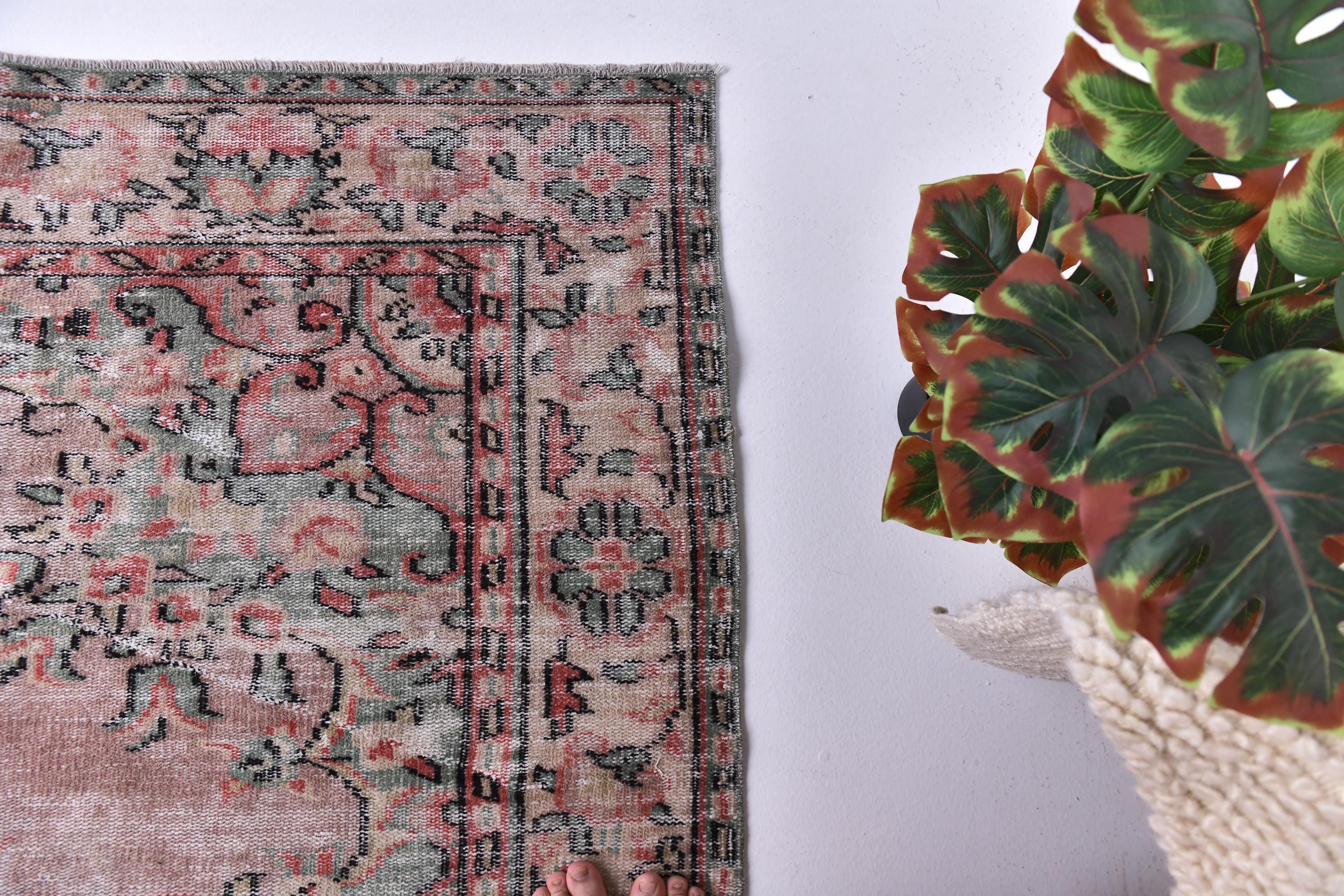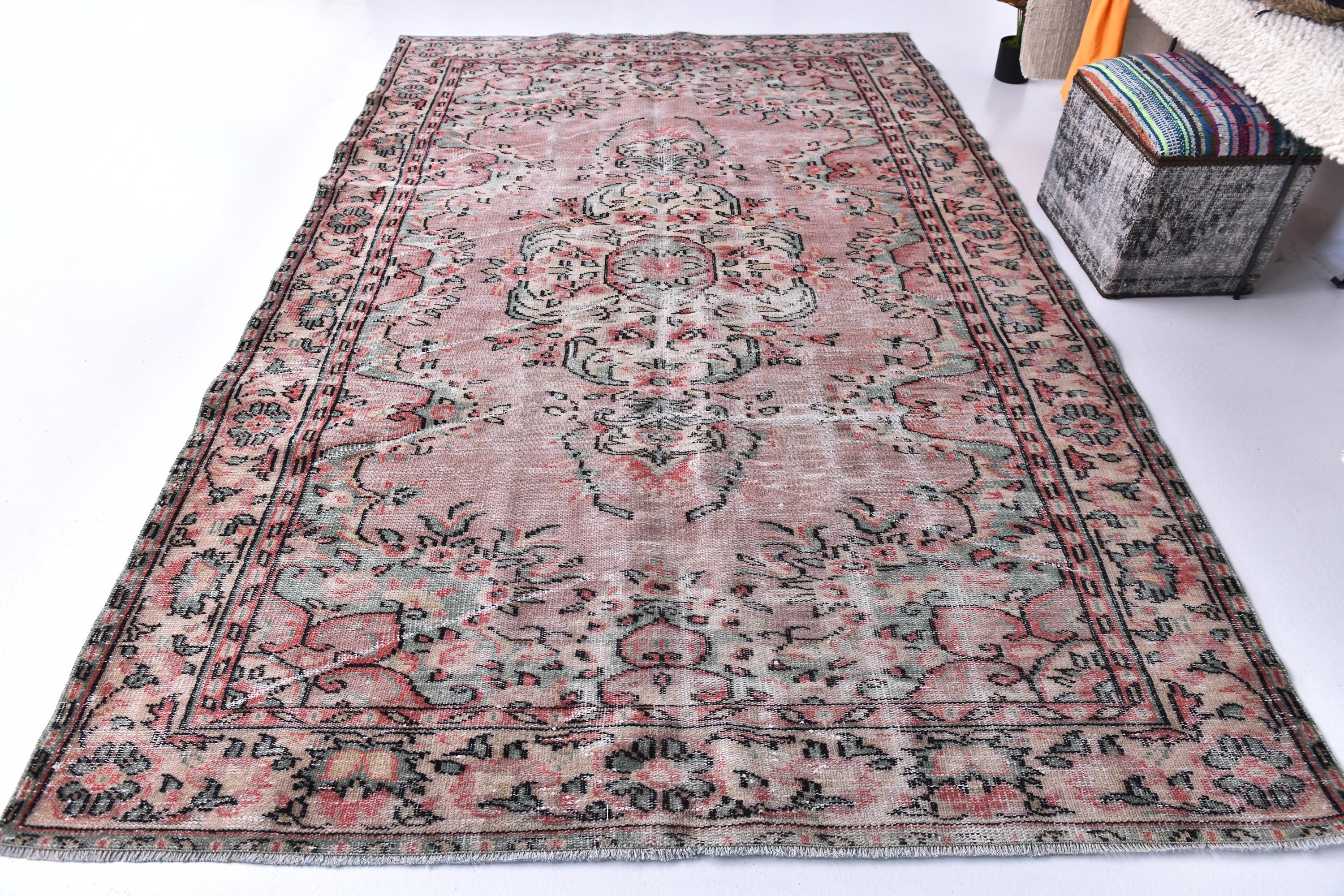 📜📌 Faded pink vintage area rug displaying intricate hand-knotted floral designs and geometric patterns. The rug features a distressed, low-pile texture in soft coral, mint green, and beige hues with traditional Persian-inspired medallions and an ornamental border running throughout.