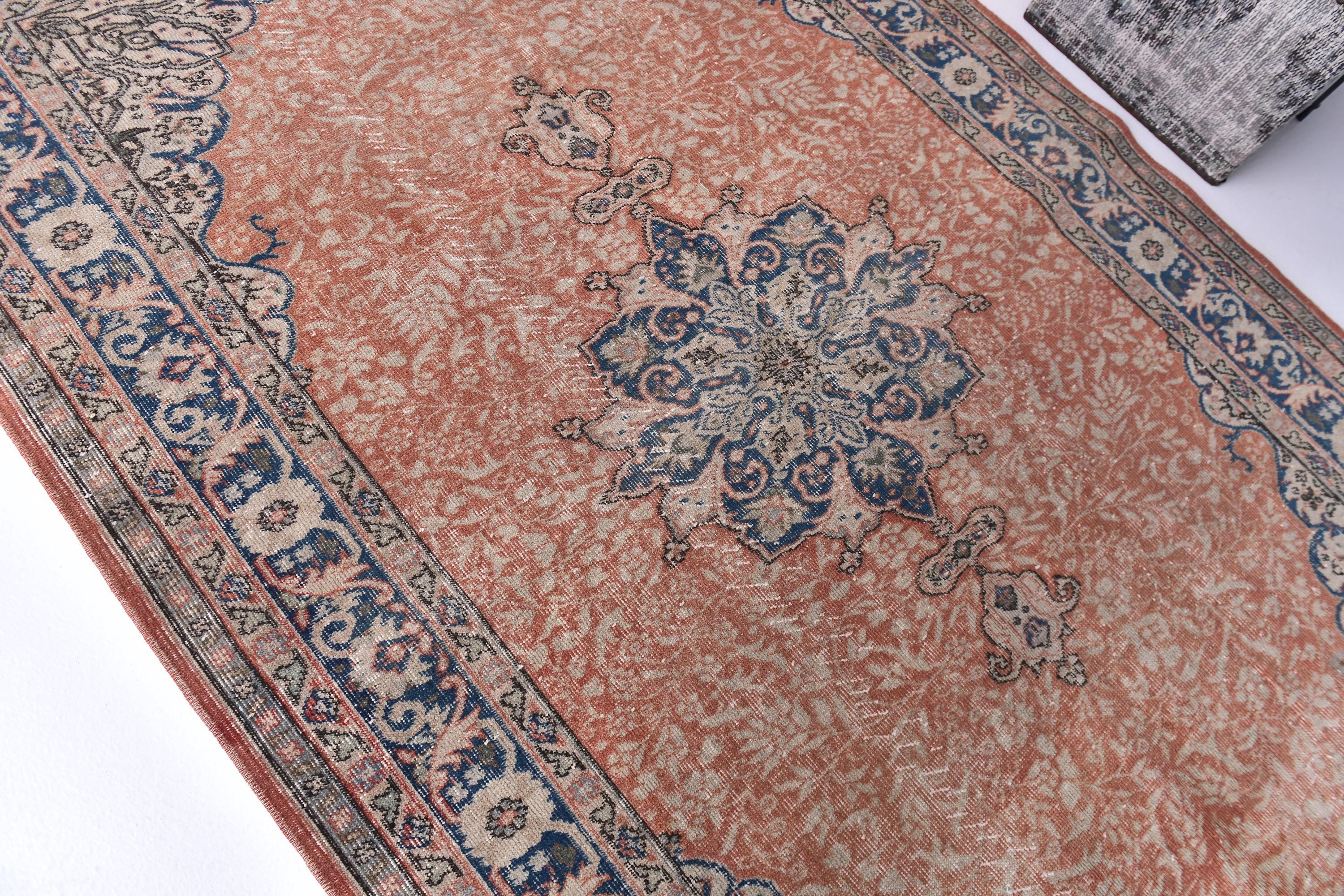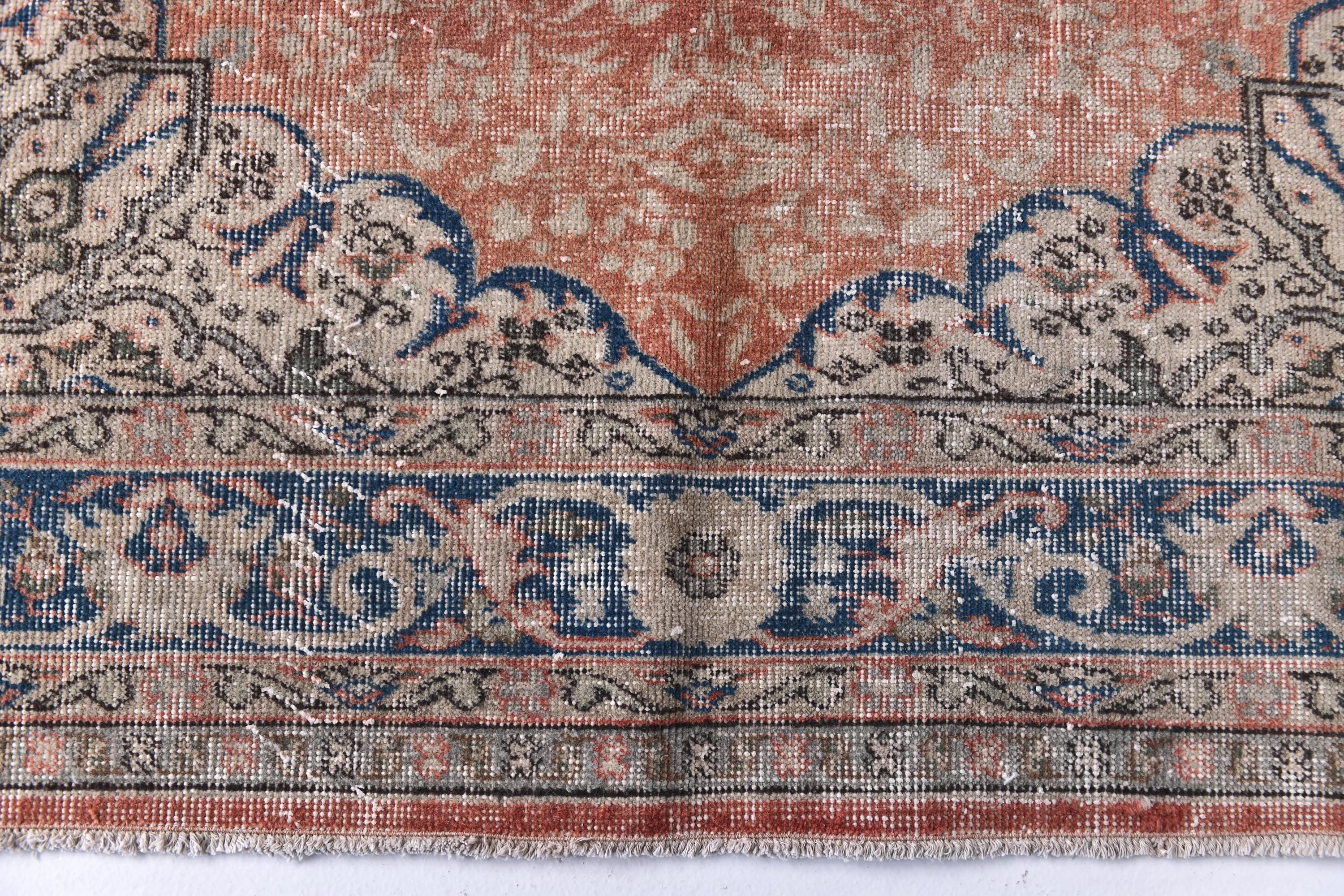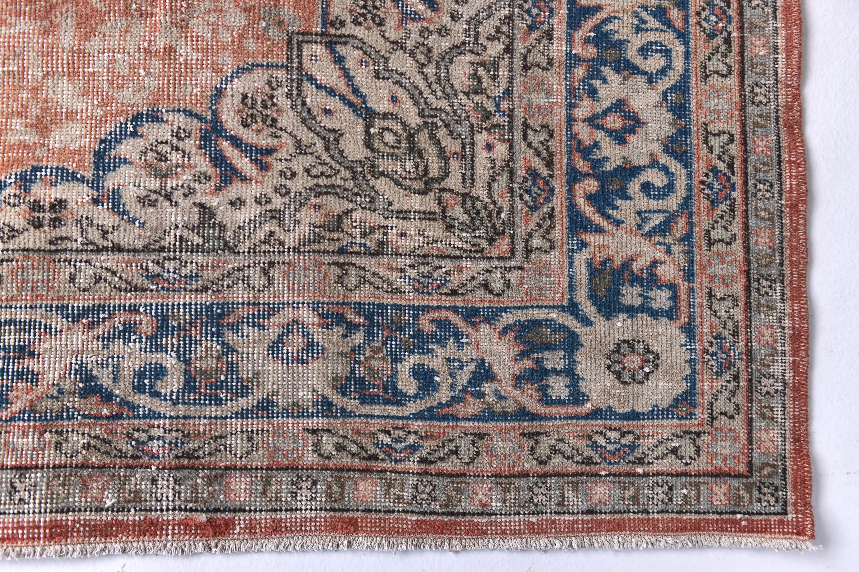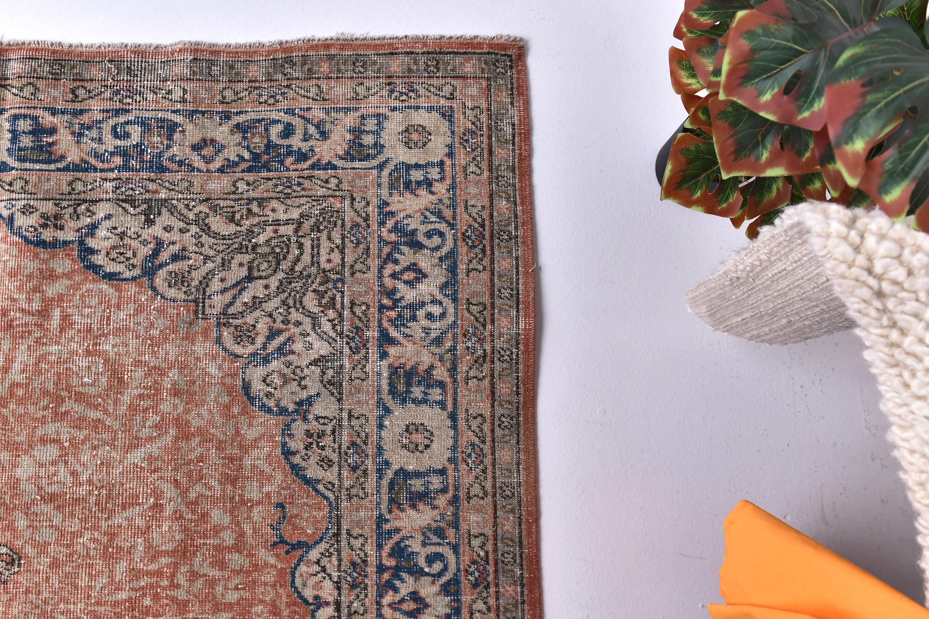 📜📌 Vintage distressed Turkish area rug featuring a faded coral terracotta field with navy blue and beige decorative borders. This antique-style runner showcases traditional geometric medallion patterns in the center with ornate floral motifs along the deep blue border, perfect for bohemian and eclectic home decor with its low-pile, worn texture.
