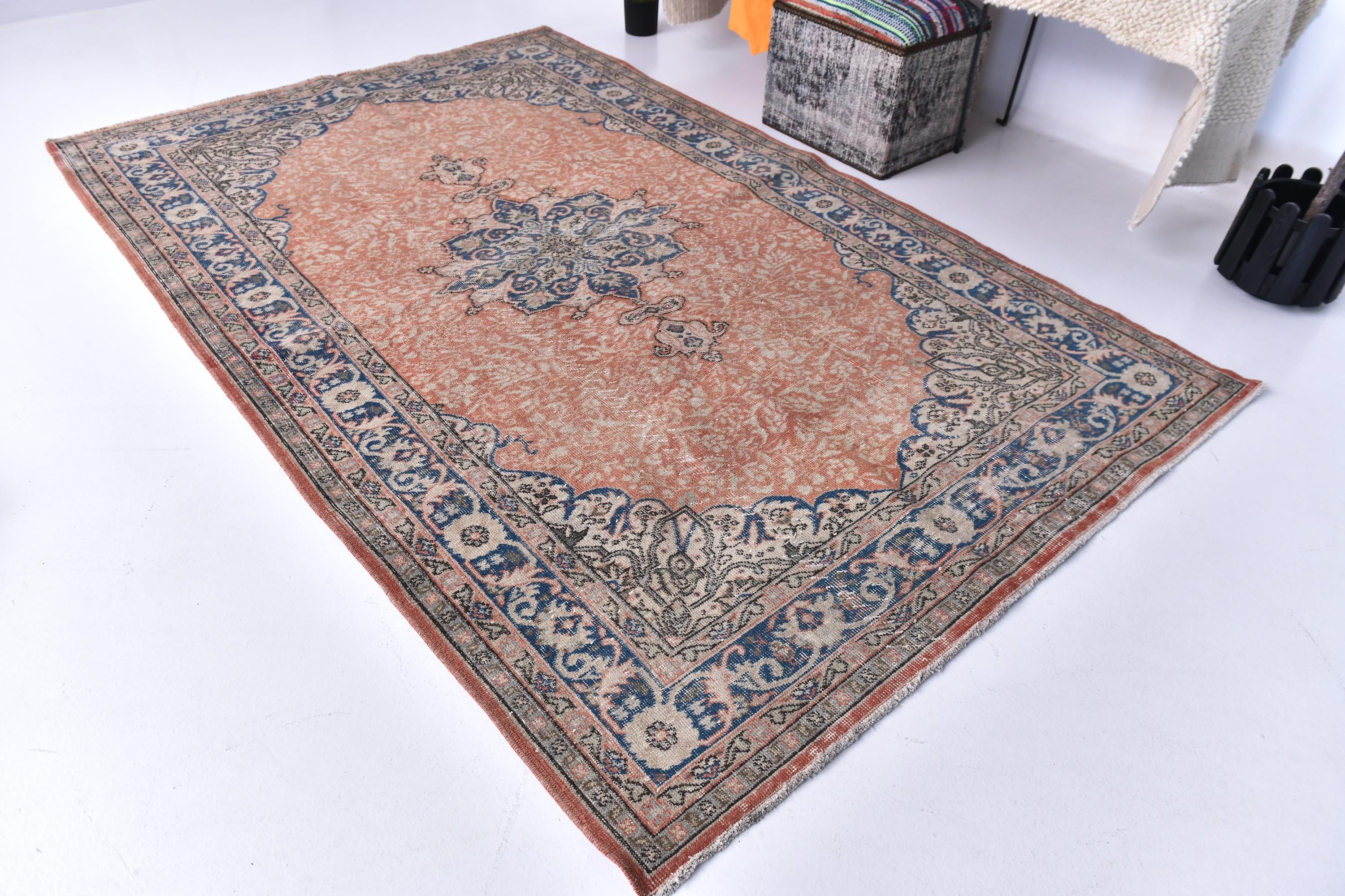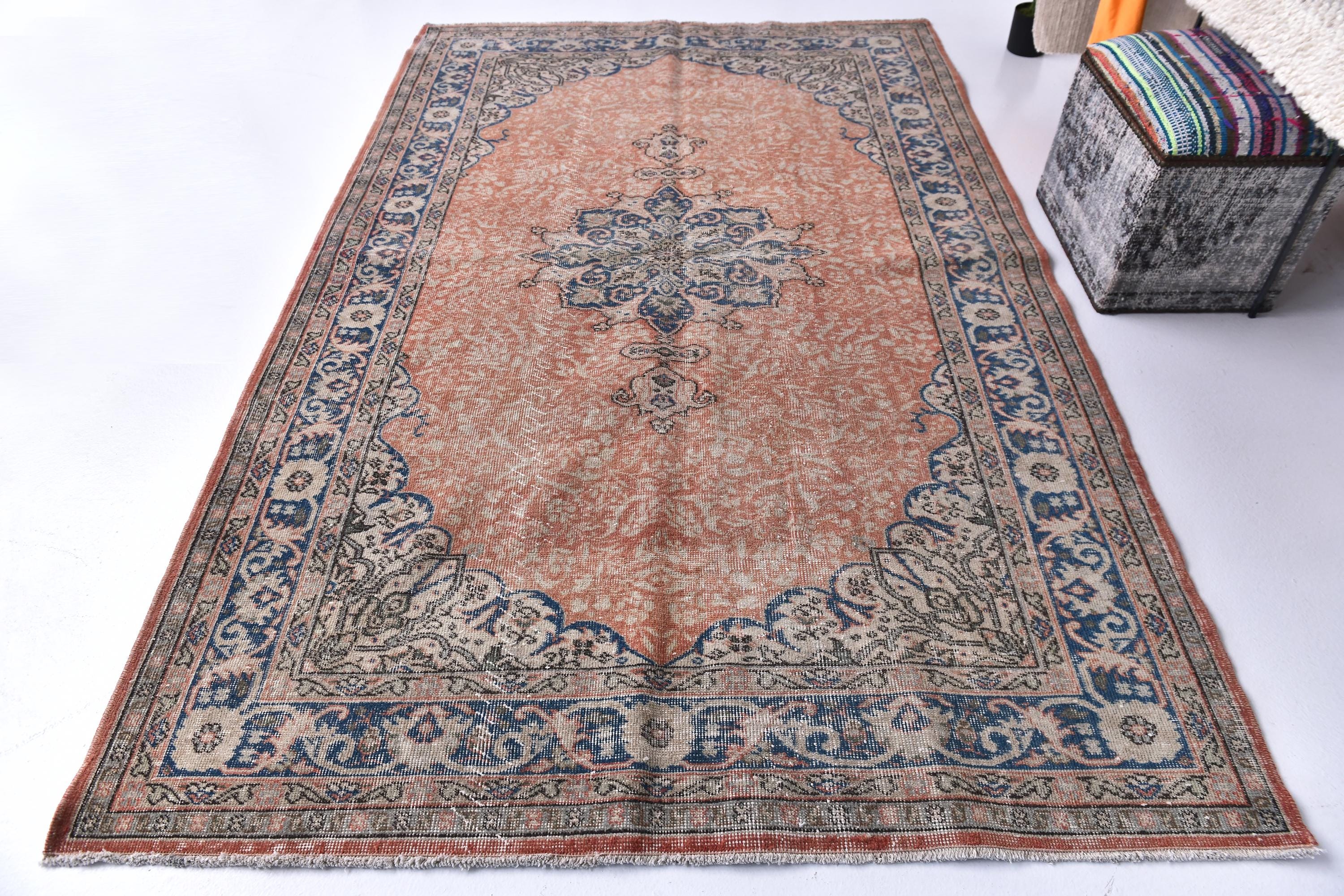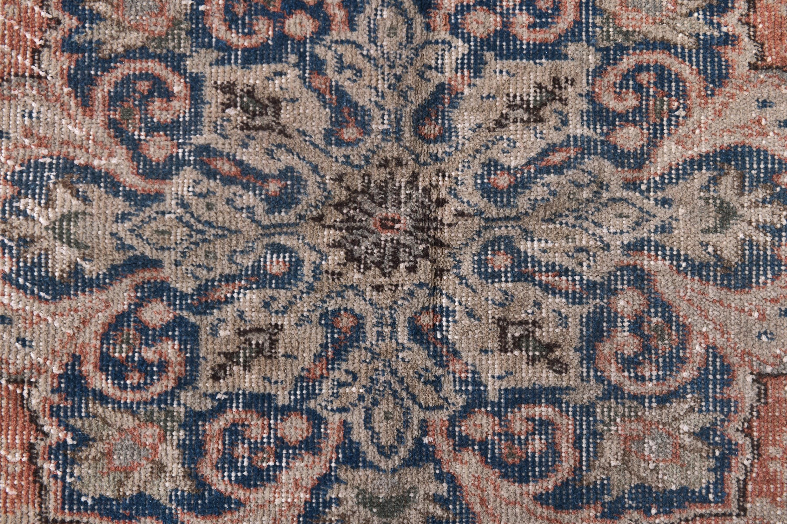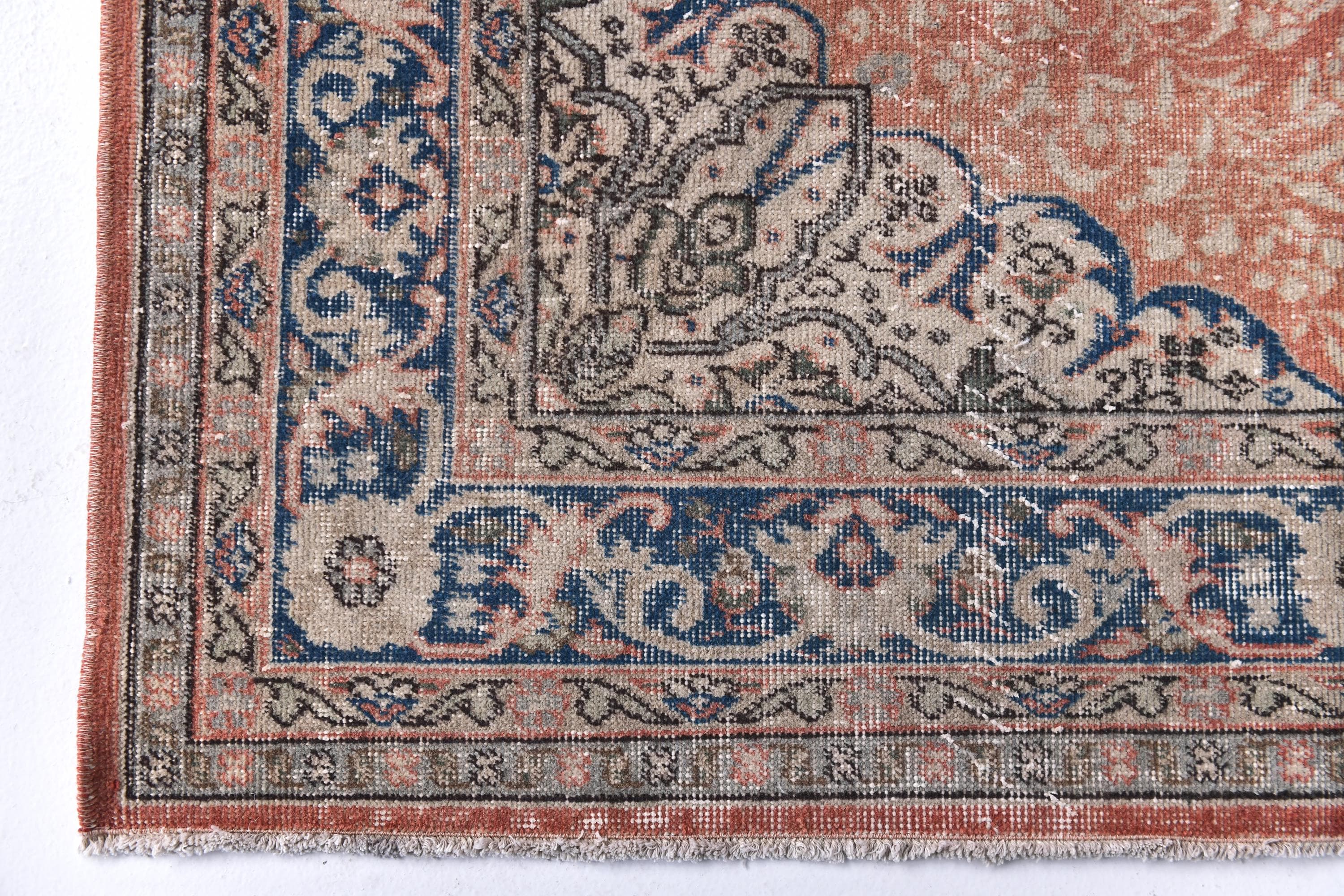 📜📌 Vintage distressed Turkish area rug featuring a faded coral terracotta field with navy blue and beige decorative borders. This antique-style runner showcases traditional geometric medallion patterns in the center with ornate floral motifs along the deep blue border, perfect for bohemian and eclectic home decor with its low-pile, worn texture.
