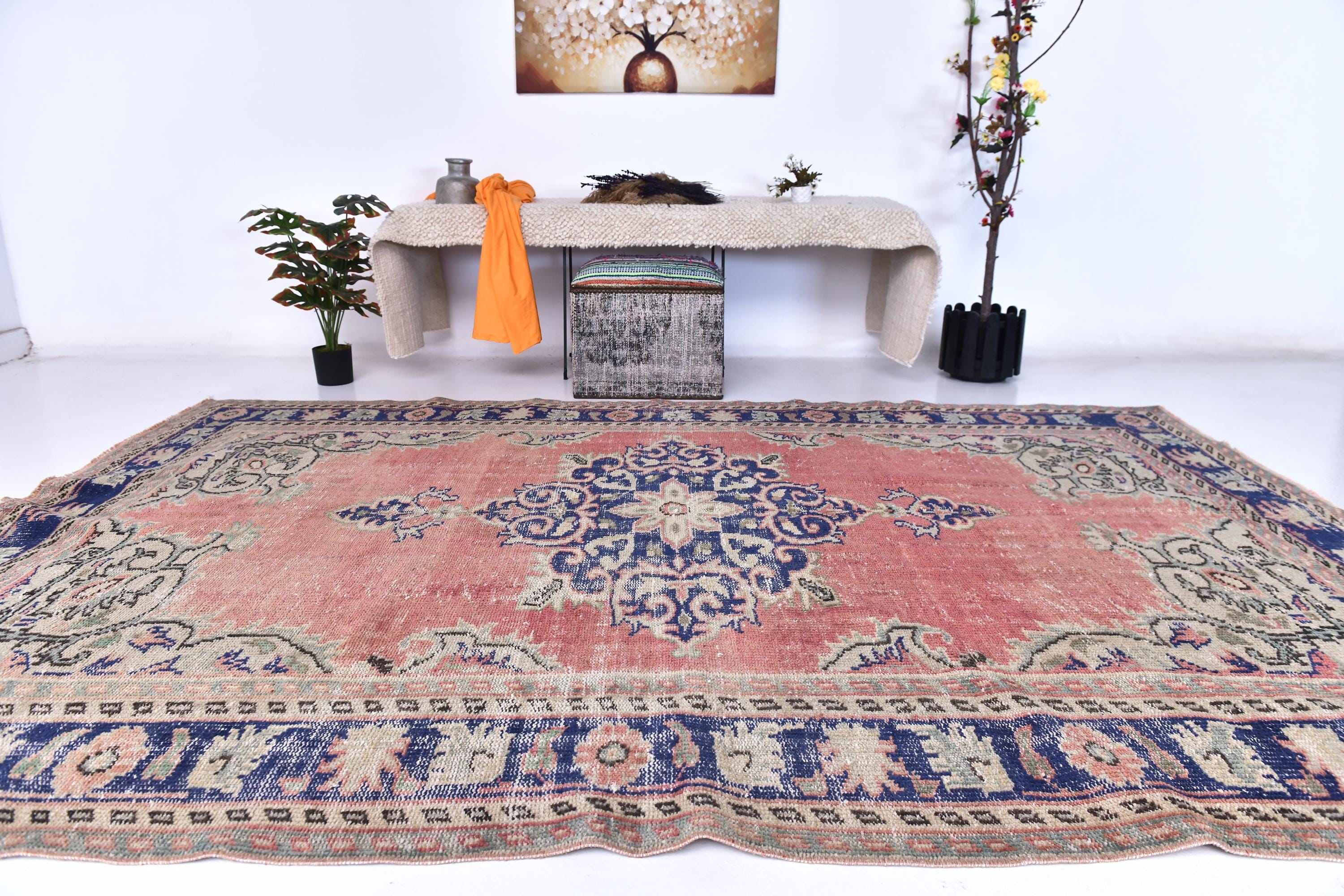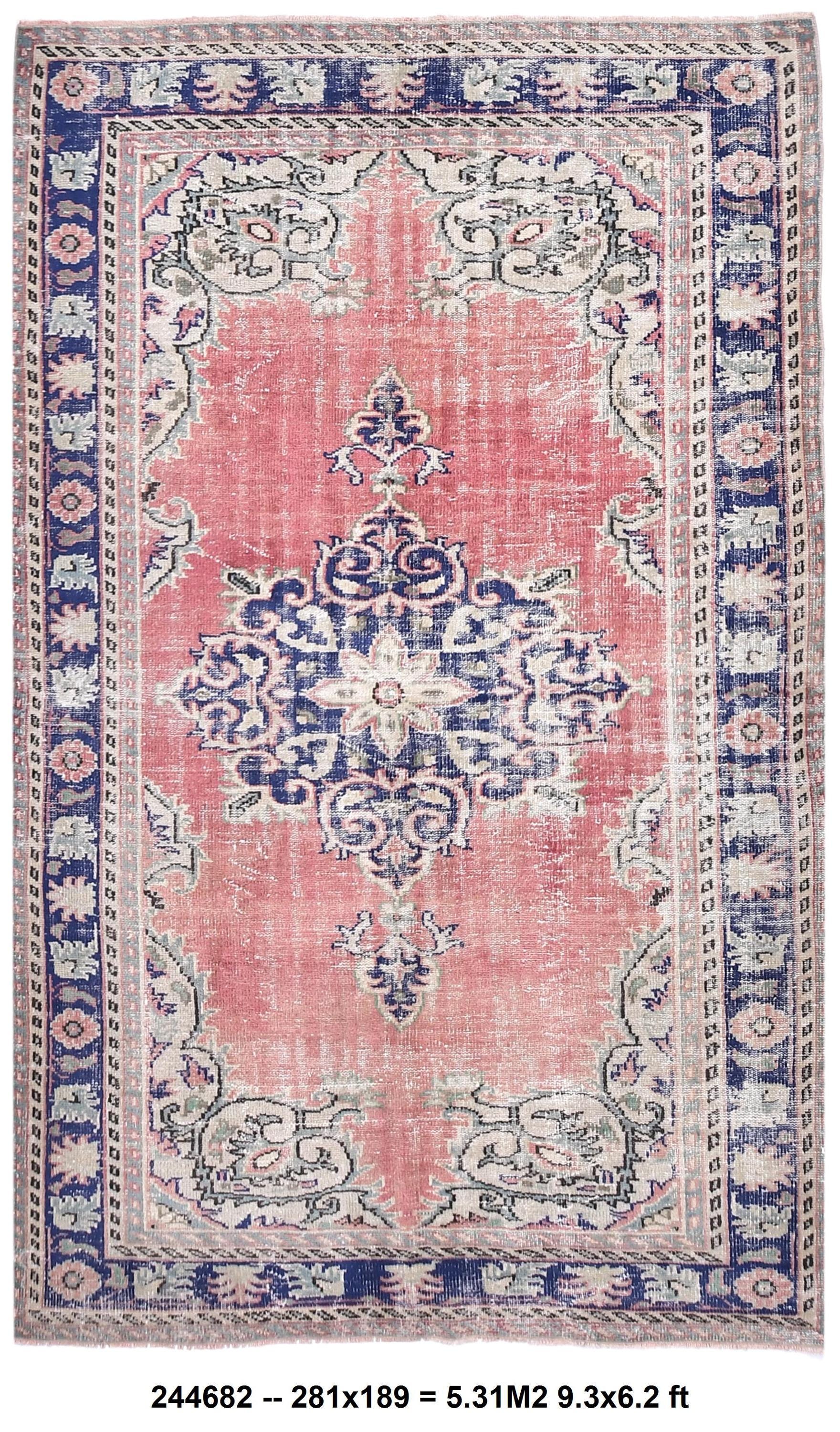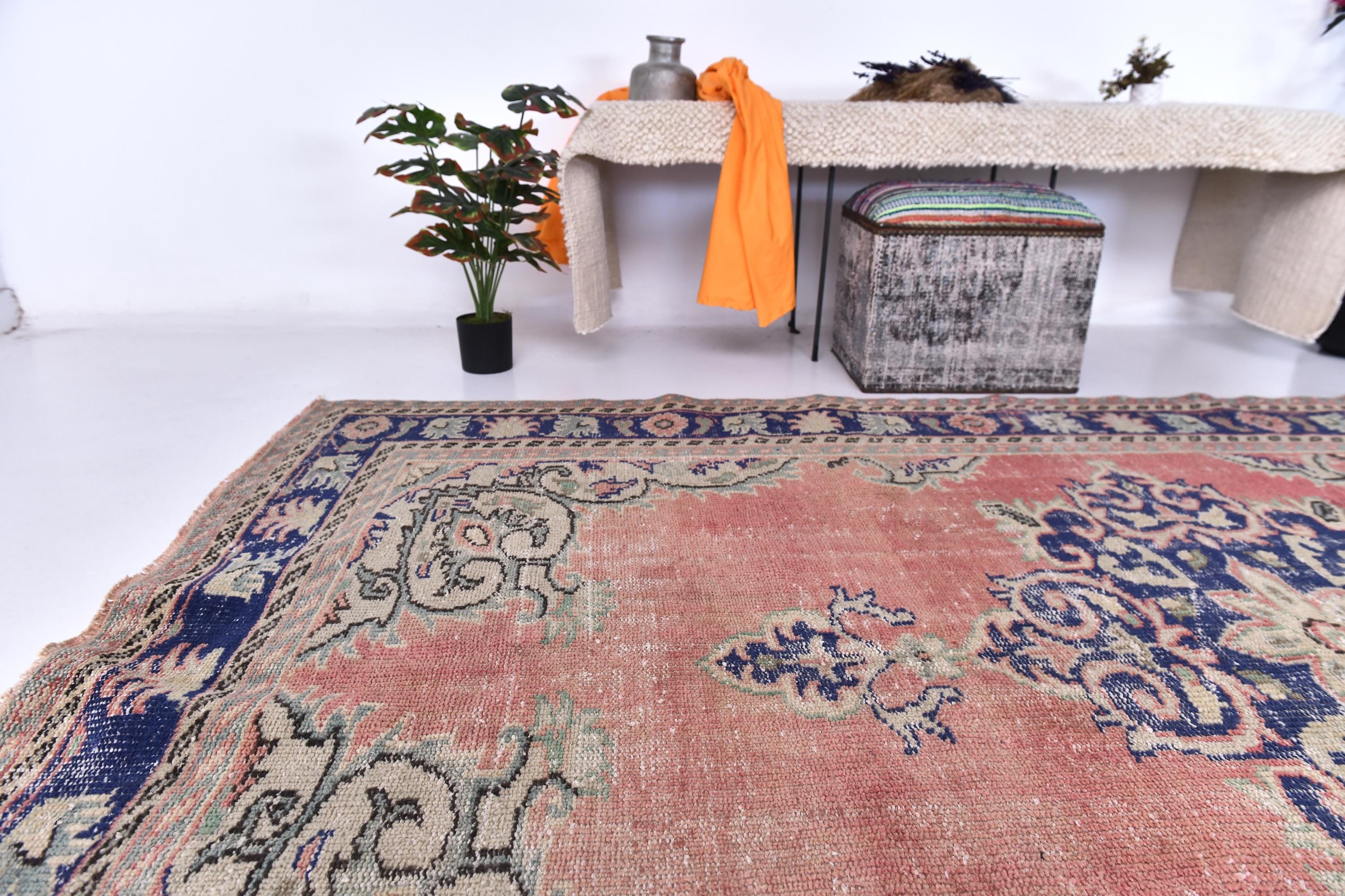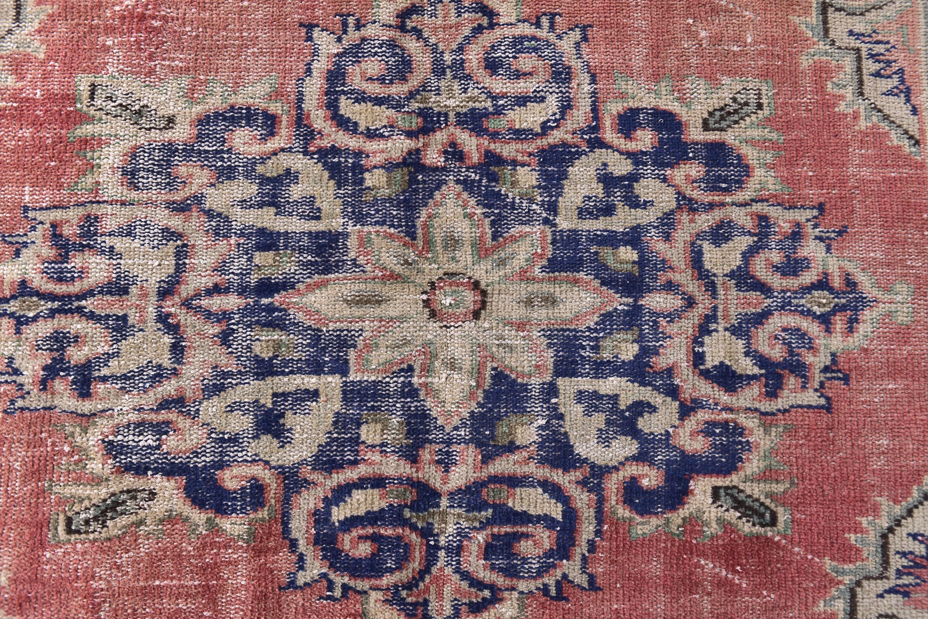 📜📌Antique style Turkish rug with salmon pink background and bold navy blue central medallion design. The low-pile wool carpet showcases intricate botanical corner spandrels in sage green and cream tones, with a wide decorative border in deep indigo blue featuring rosettes and tribal patterns, ideal for adding character to traditional or contemporary spaces.