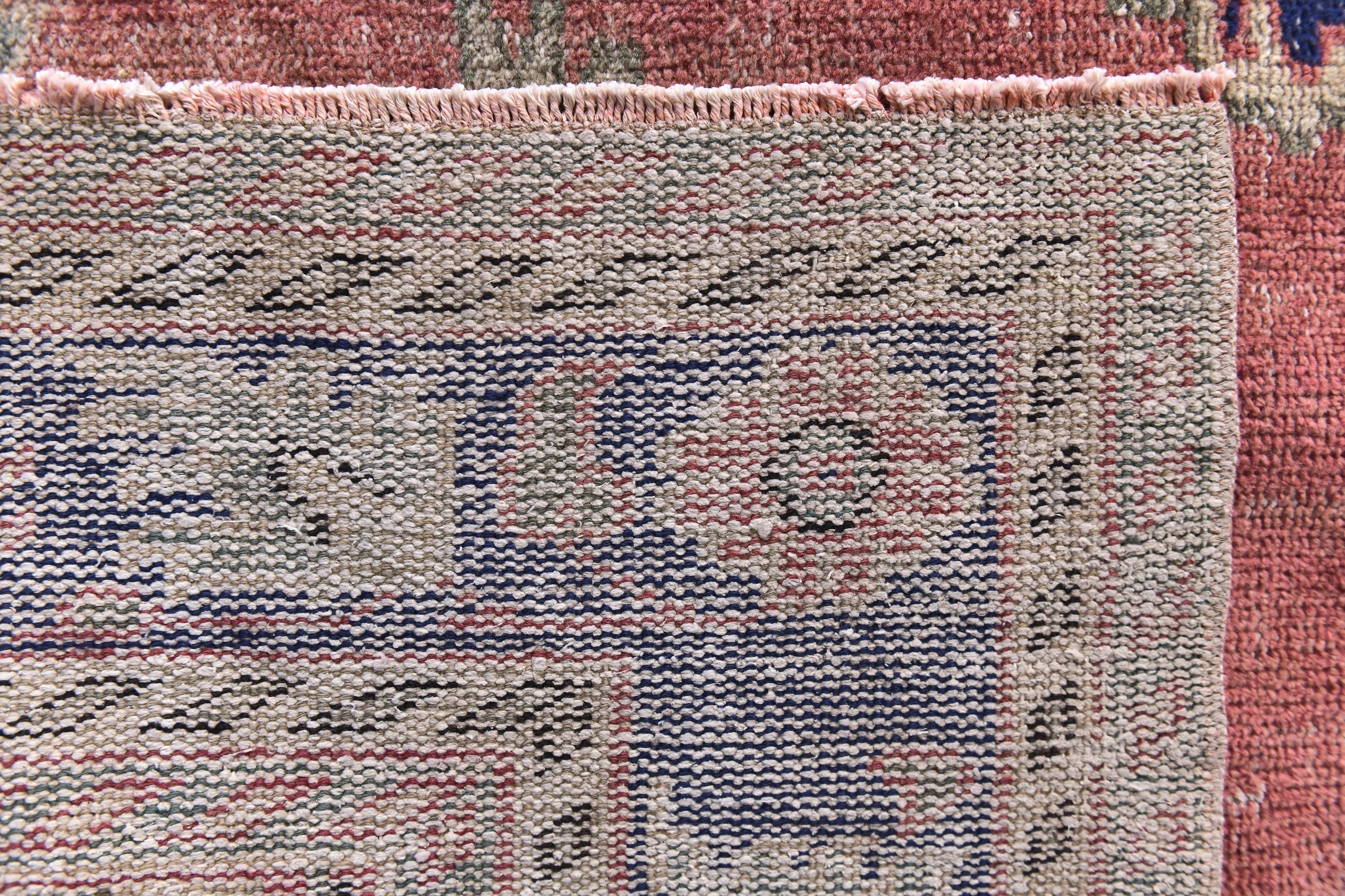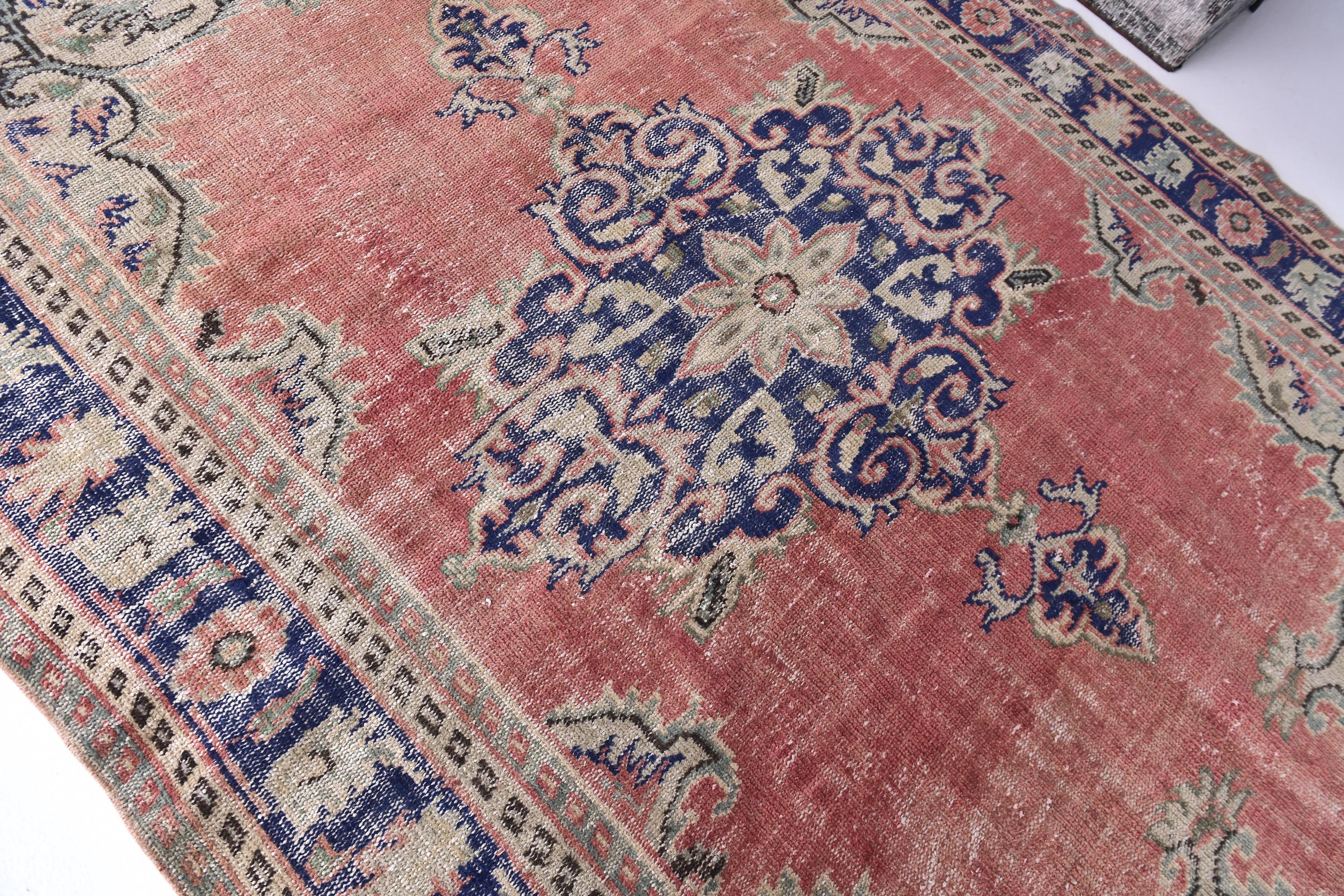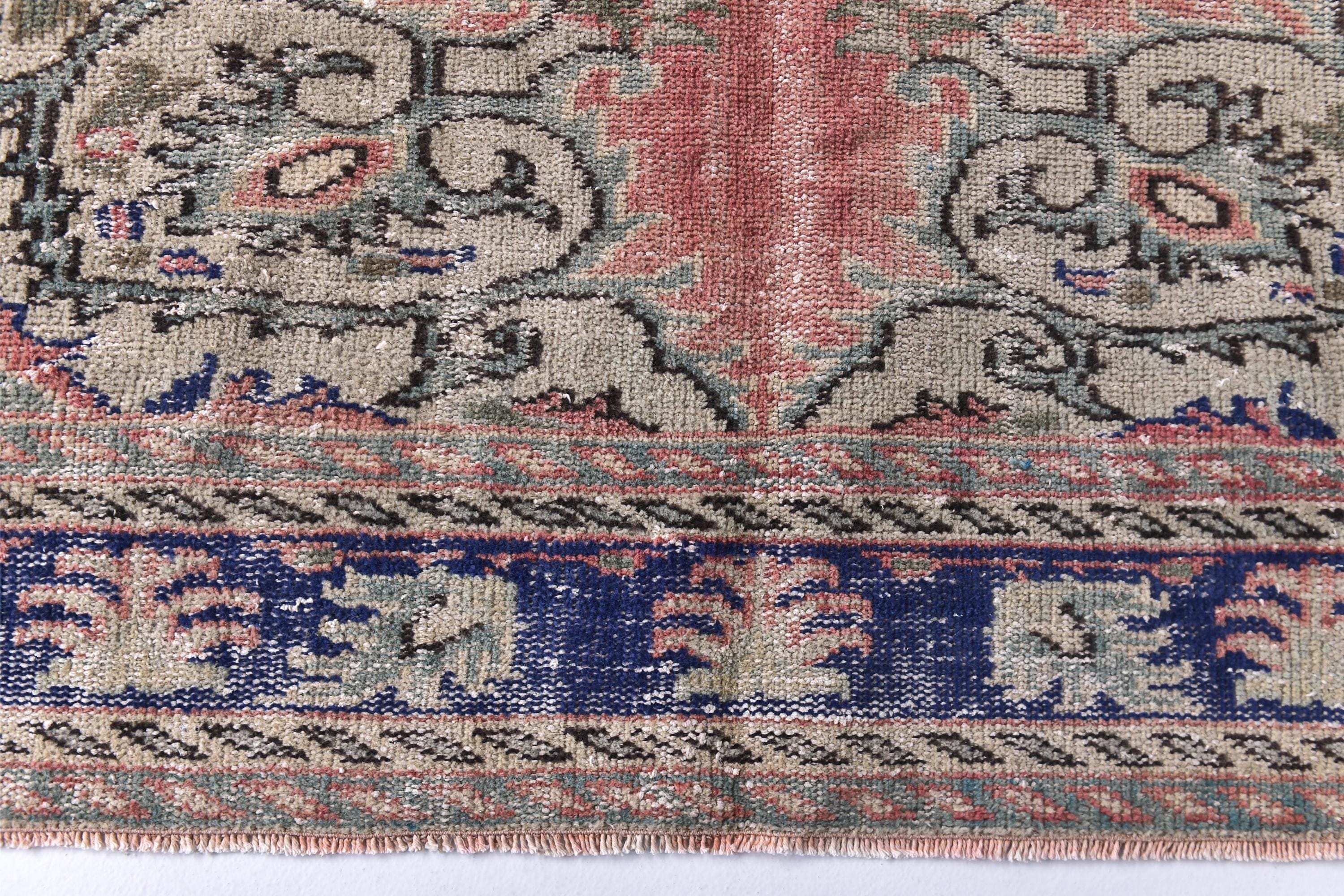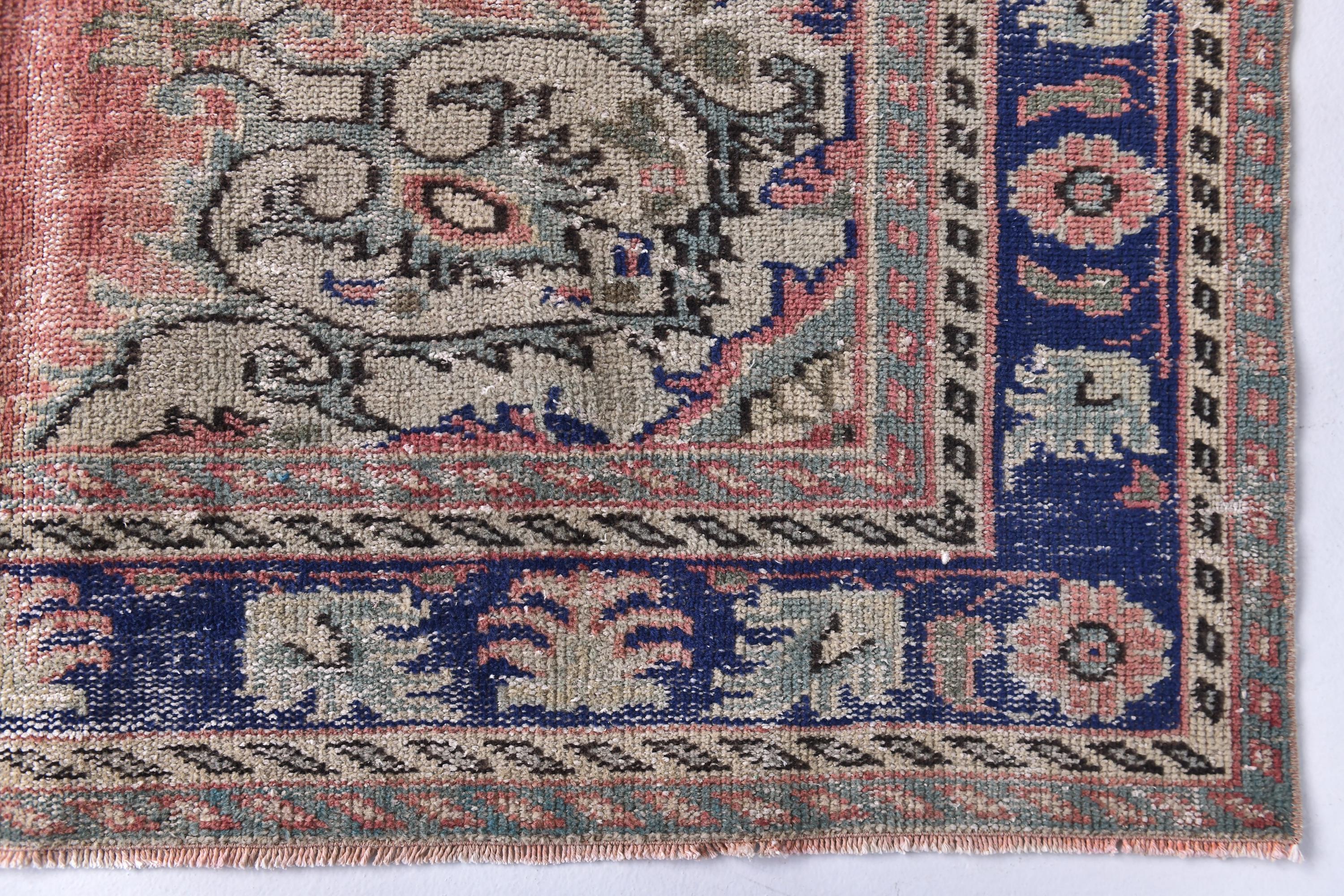 📜📌Antique style Turkish rug with salmon pink background and bold navy blue central medallion design. The low-pile wool carpet showcases intricate botanical corner spandrels in sage green and cream tones, with a wide decorative border in deep indigo blue featuring rosettes and tribal patterns, ideal for adding character to traditional or contemporary spaces.