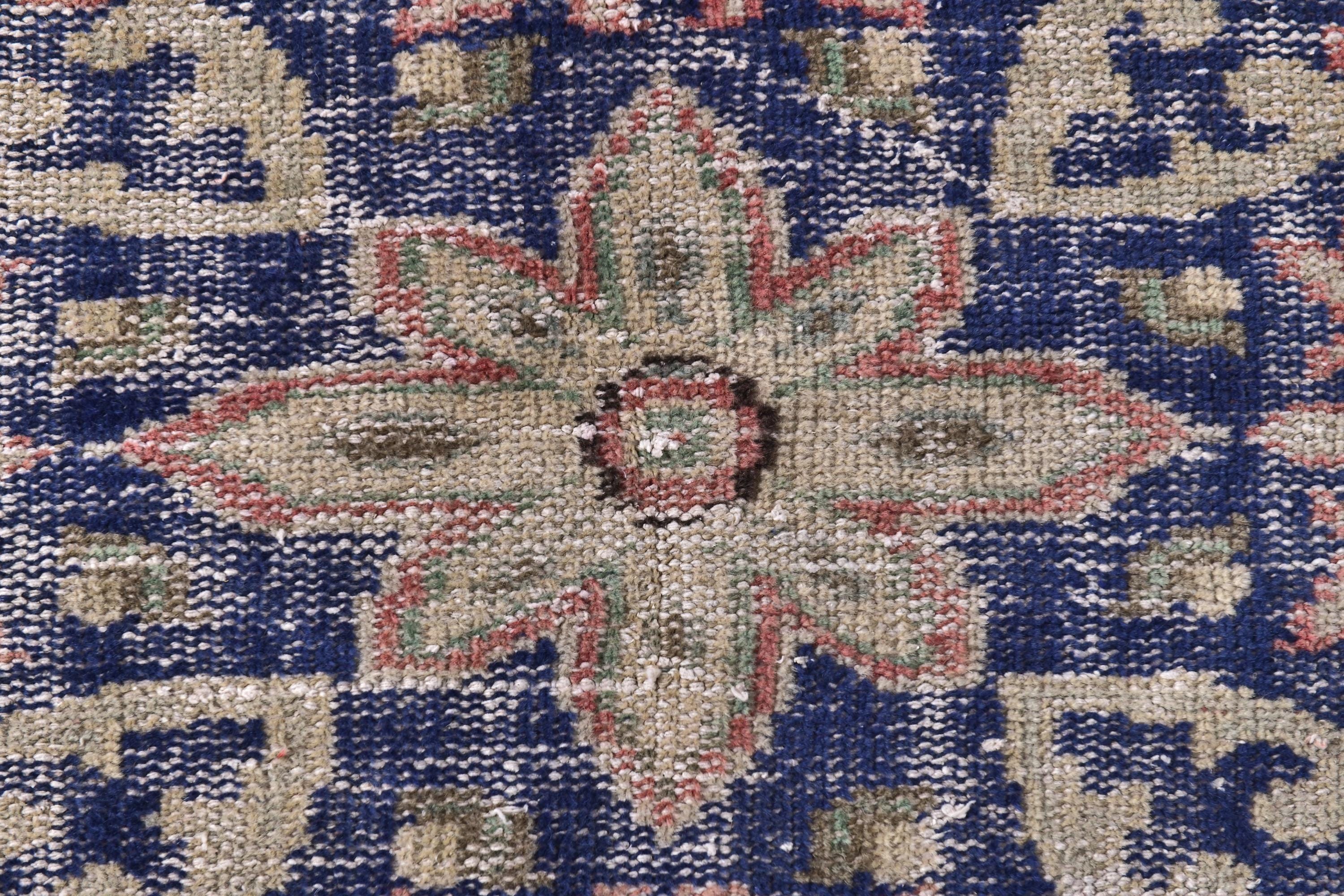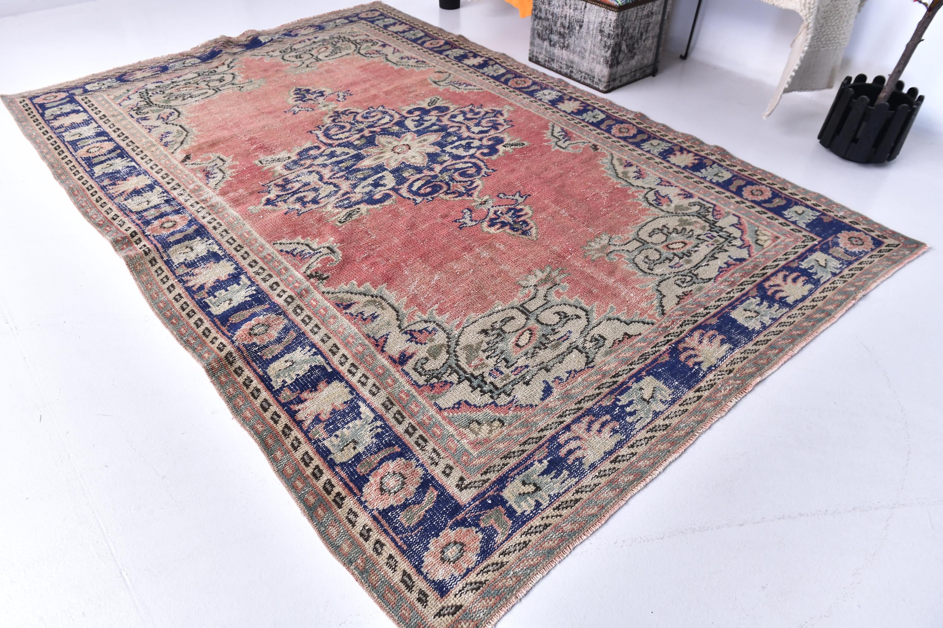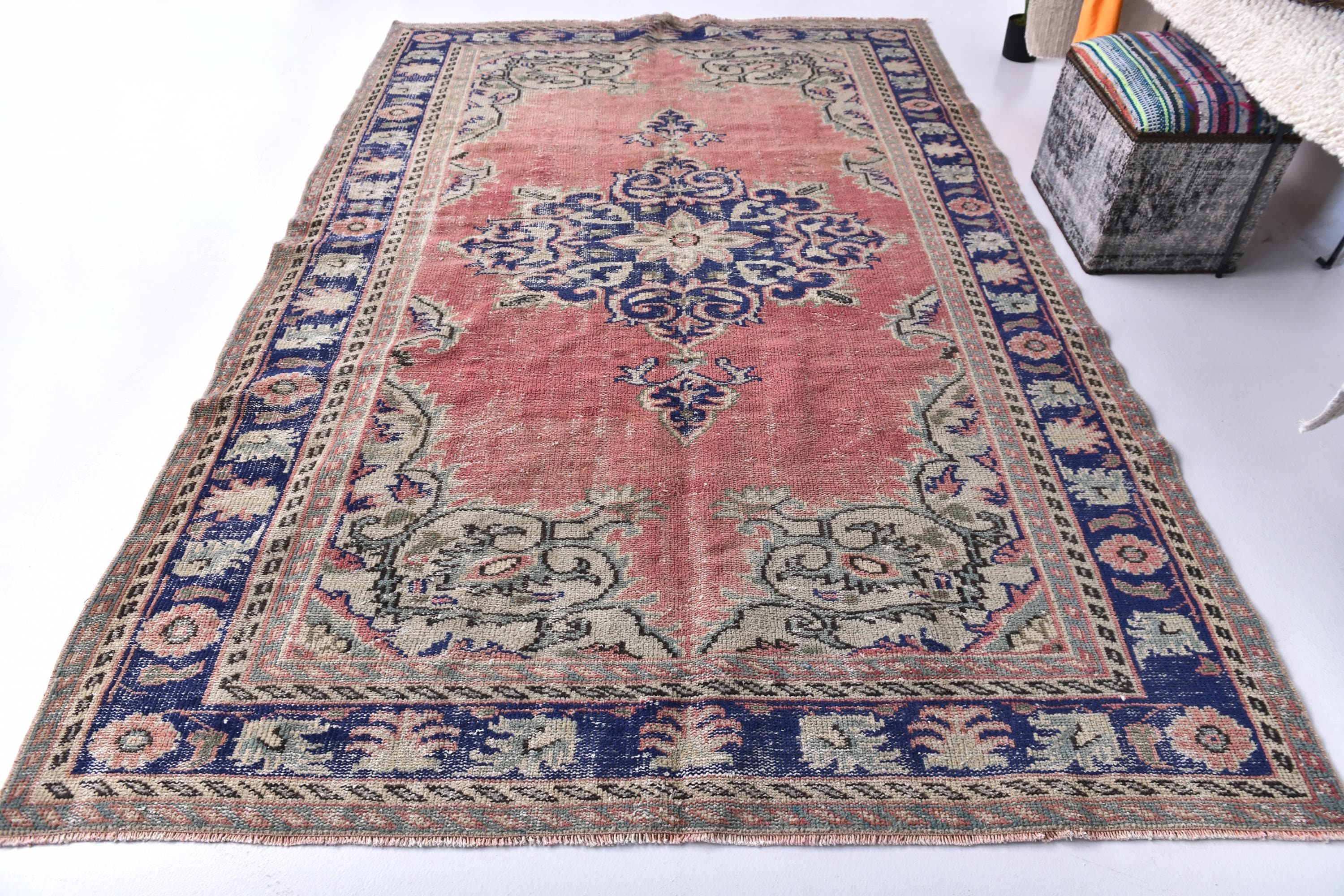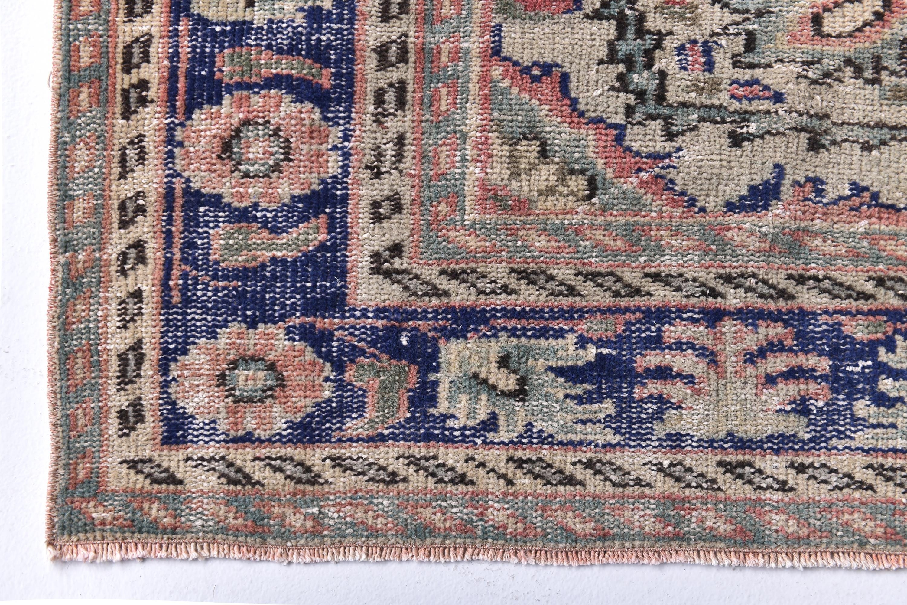 📜📌Antique style Turkish rug with salmon pink background and bold navy blue central medallion design. The low-pile wool carpet showcases intricate botanical corner spandrels in sage green and cream tones, with a wide decorative border in deep indigo blue featuring rosettes and tribal patterns, ideal for adding character to traditional or contemporary spaces.