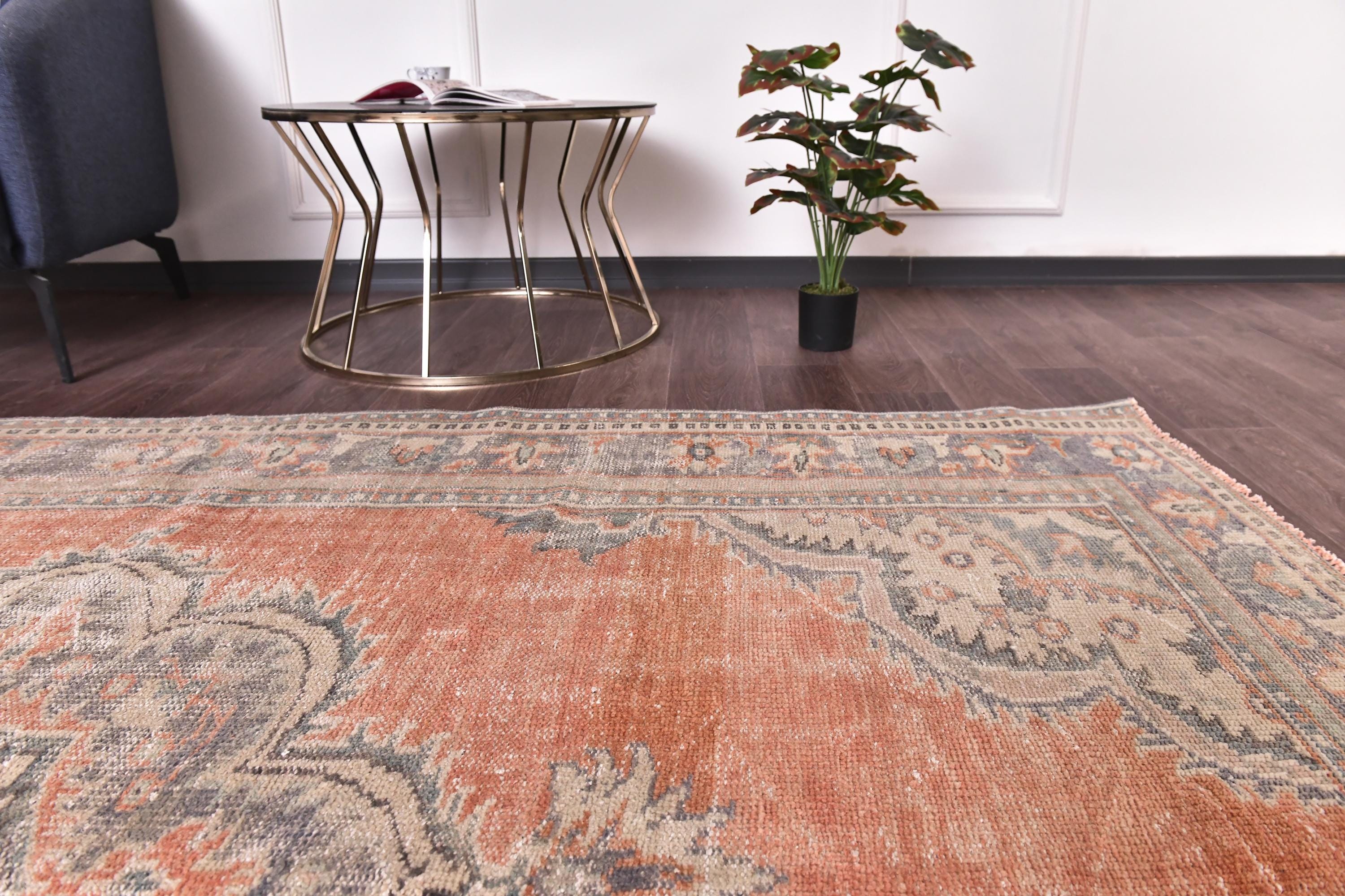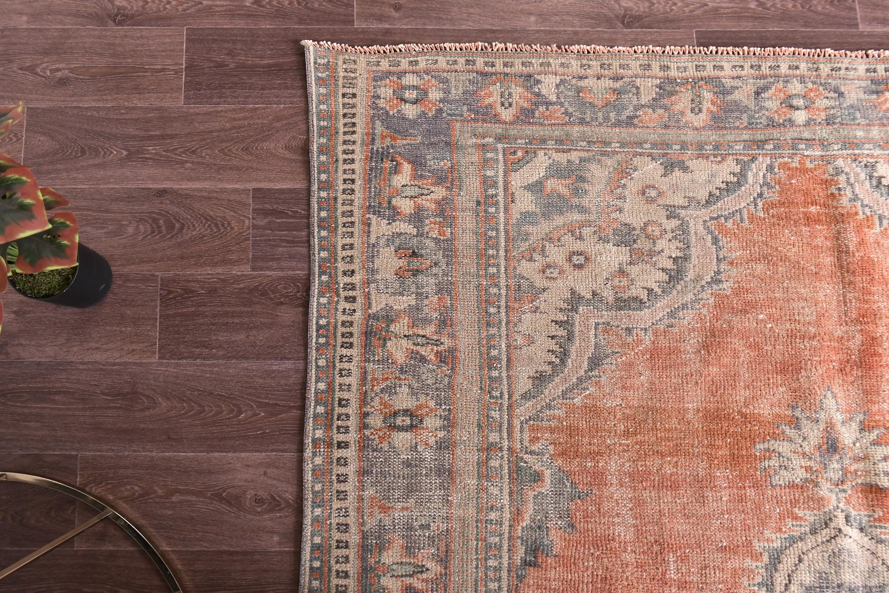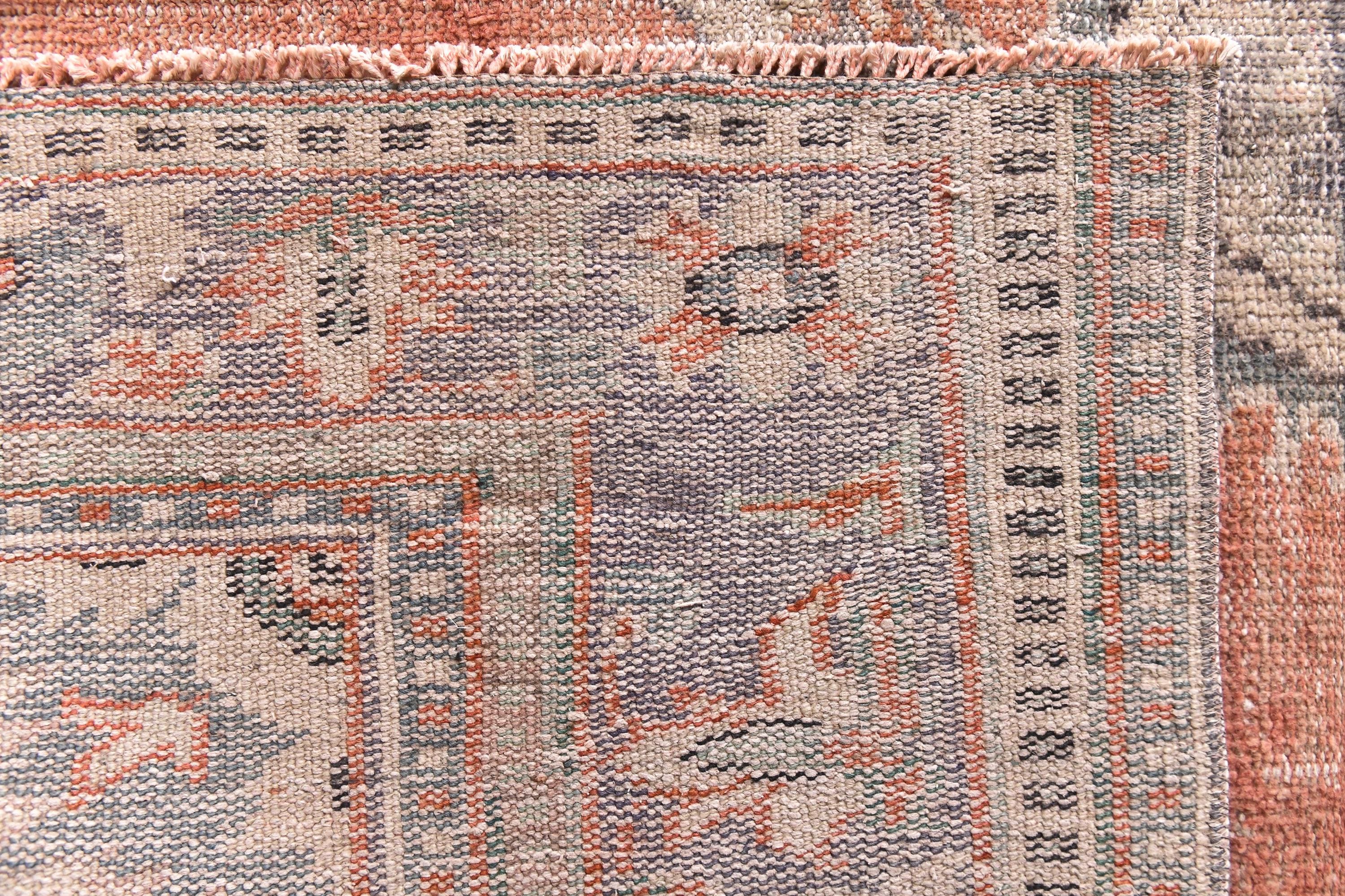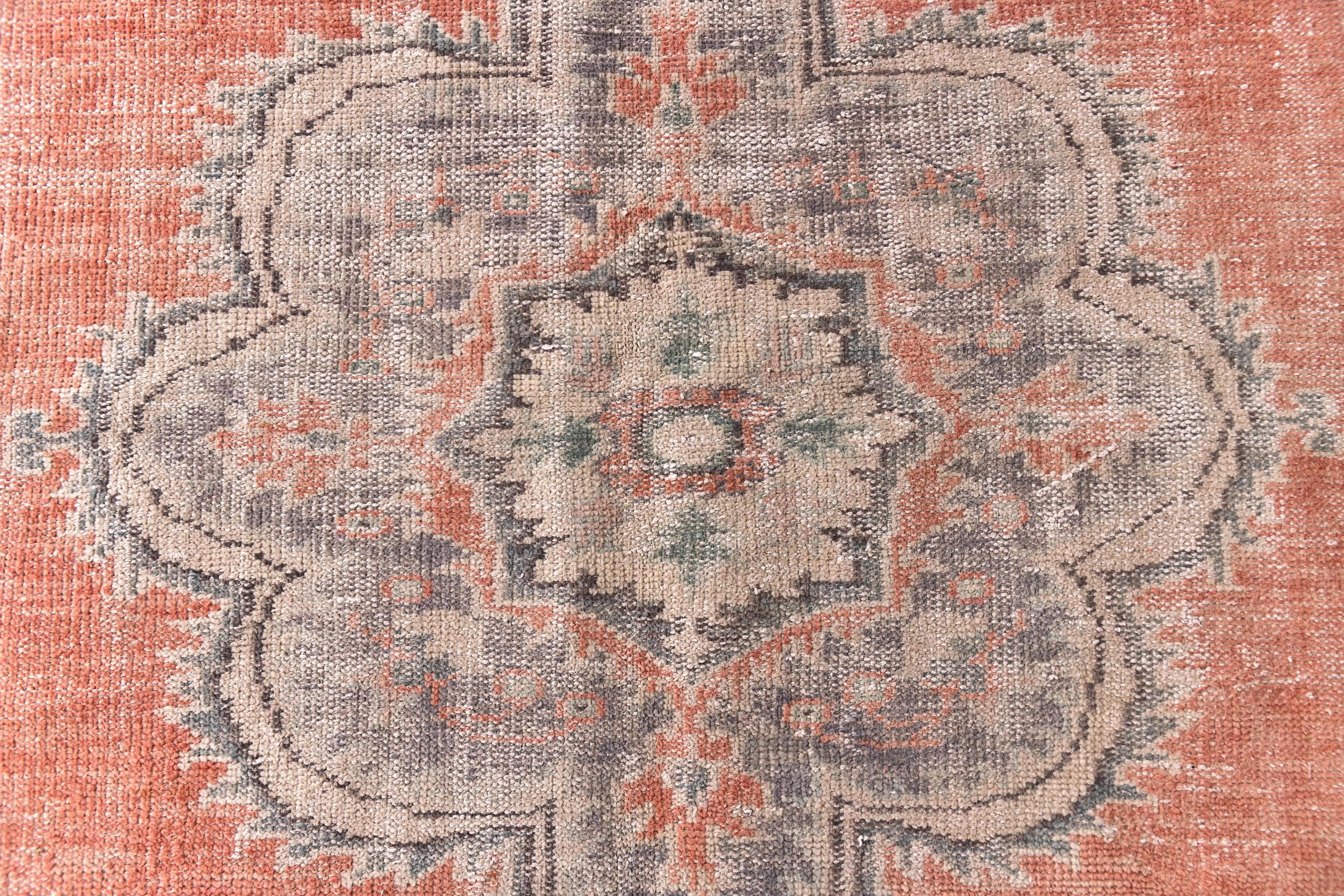 📜📌Vintage hand-knotted Turkish area rug featuring soft coral orange field with distressed gray-blue floral medallion center, ornate botanical border in faded beige, peach and blue tones, showing authentic low pile worn patina on hardwood floor