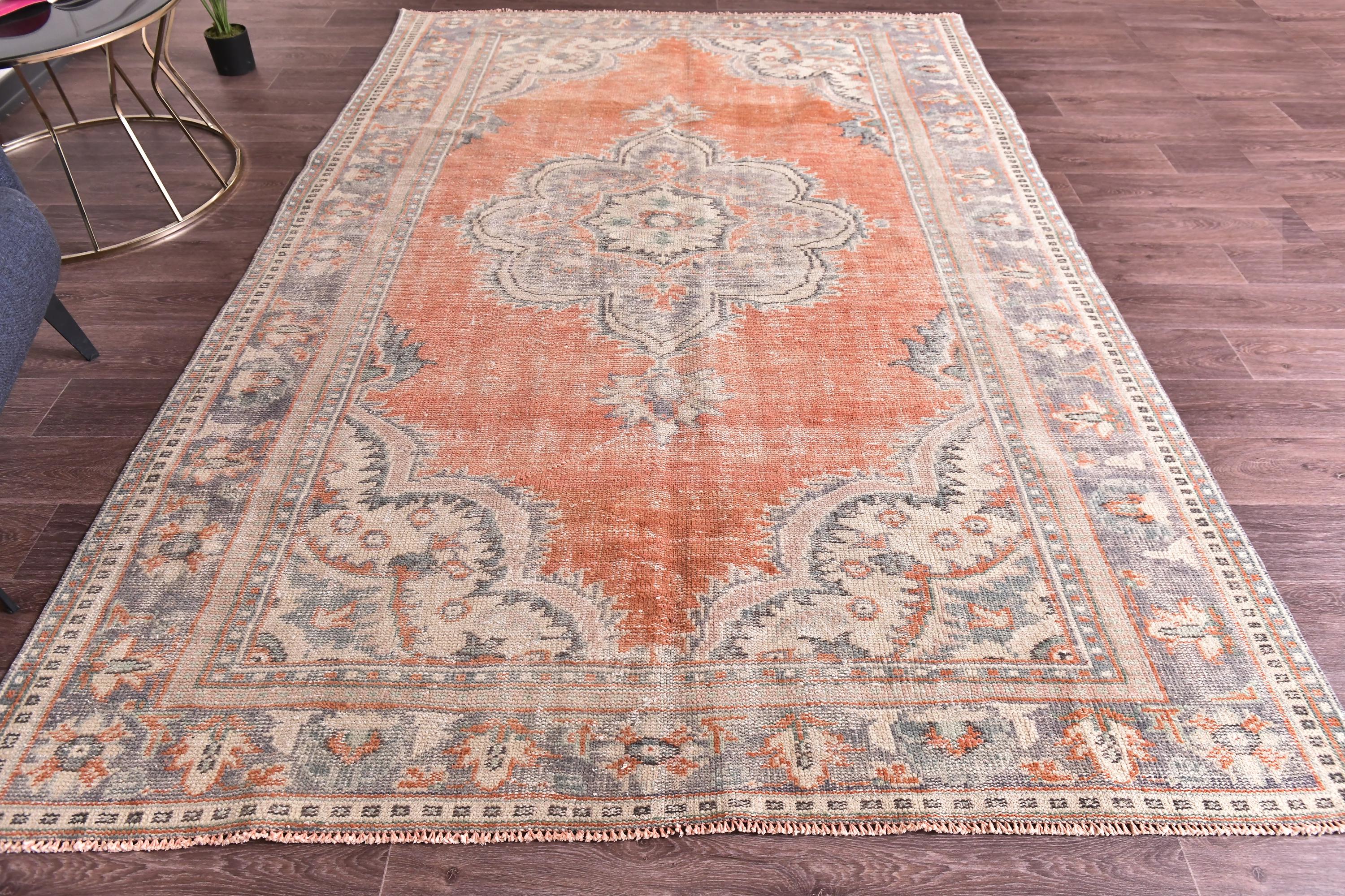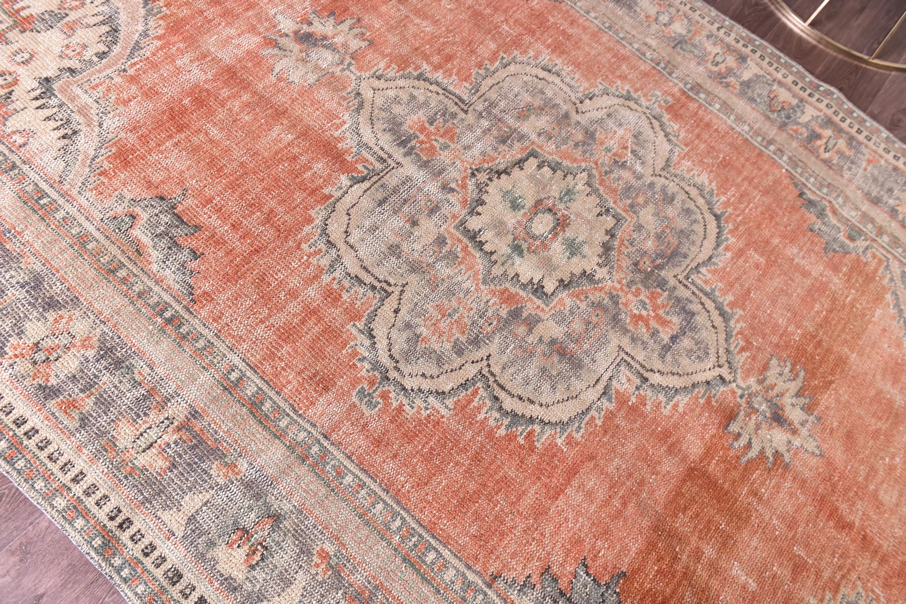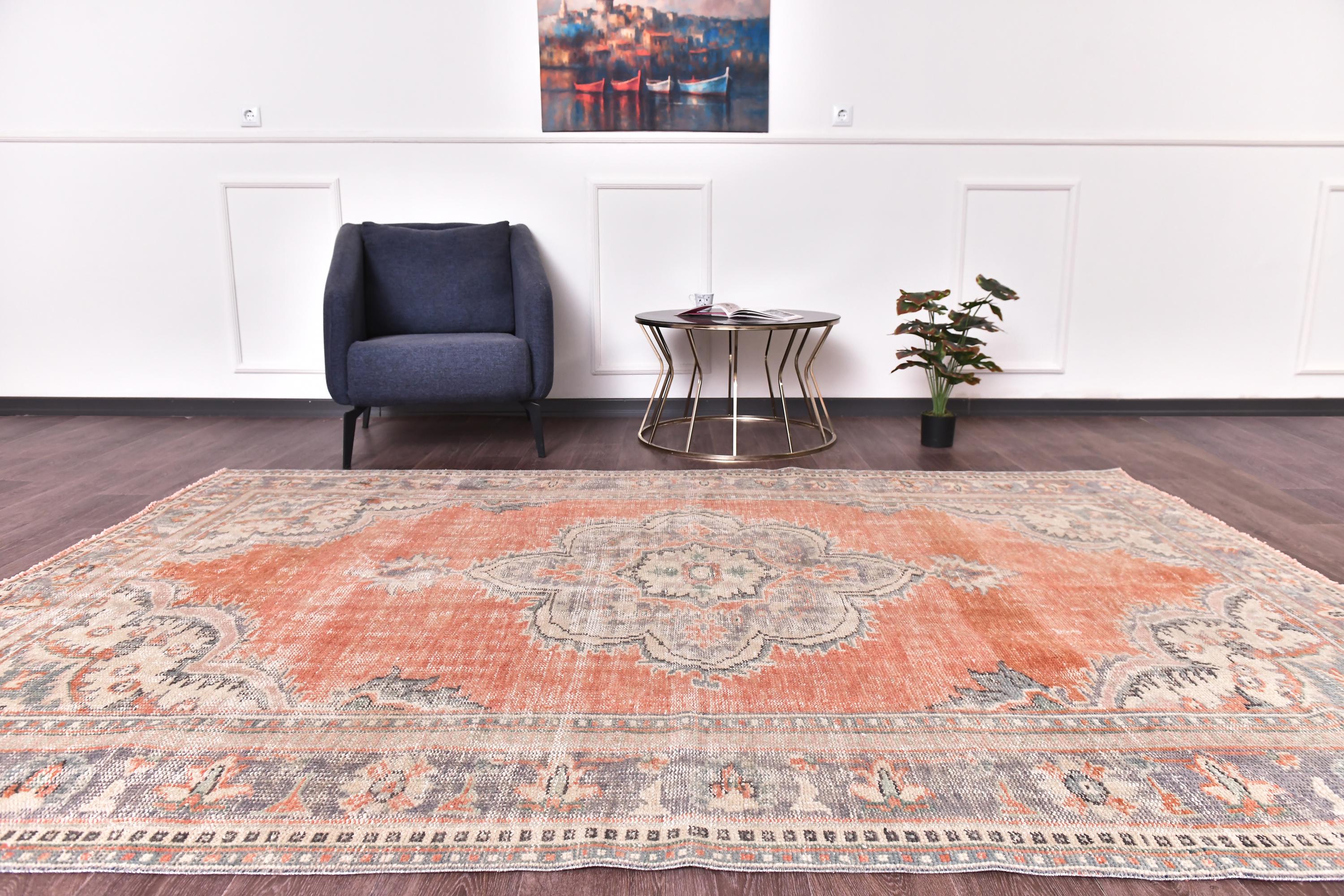 📜📌Vintage hand-knotted Turkish area rug featuring soft coral orange field with distressed gray-blue floral medallion center, ornate botanical border in faded beige, peach and blue tones, showing authentic low pile worn patina on hardwood floor