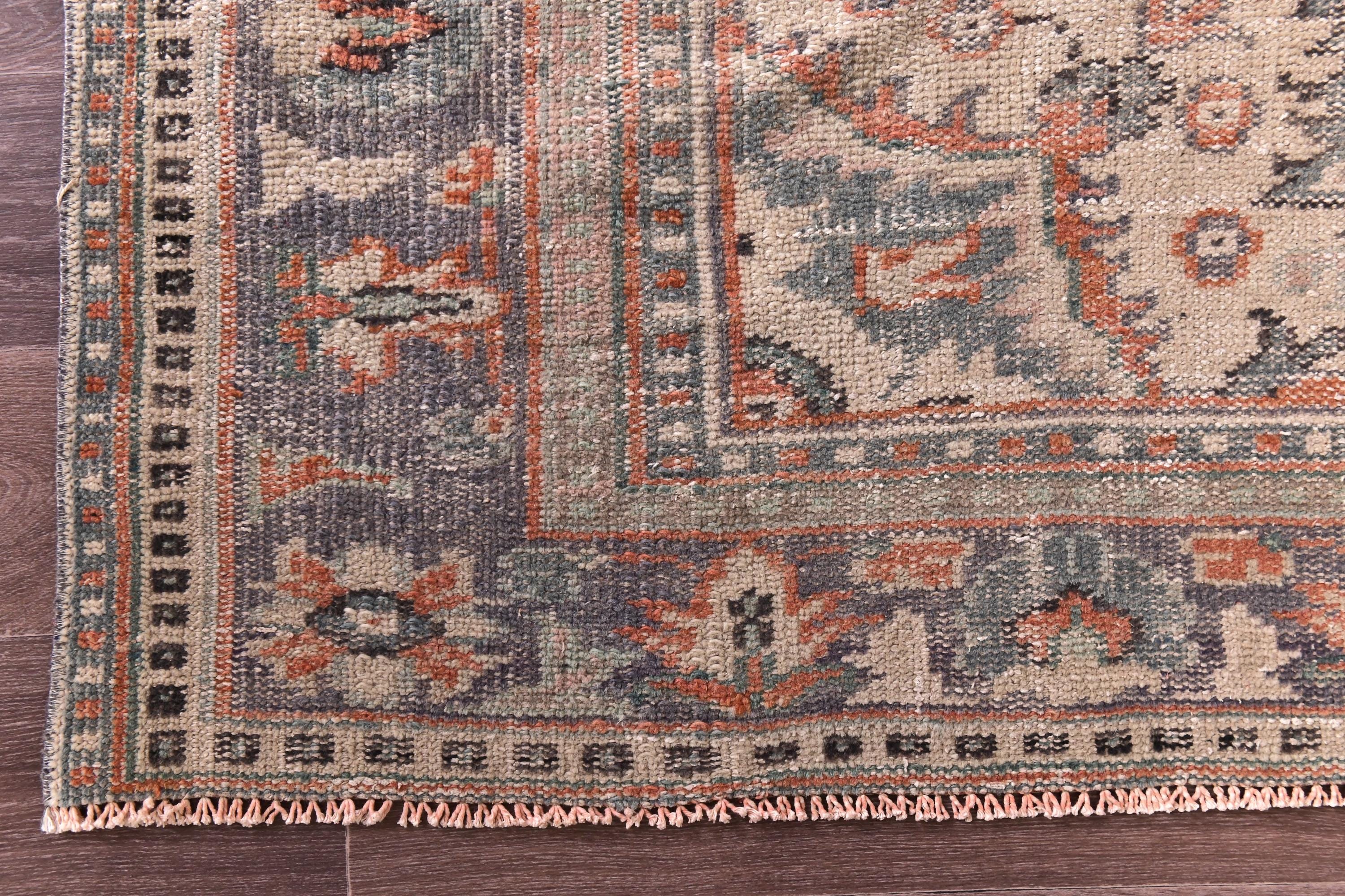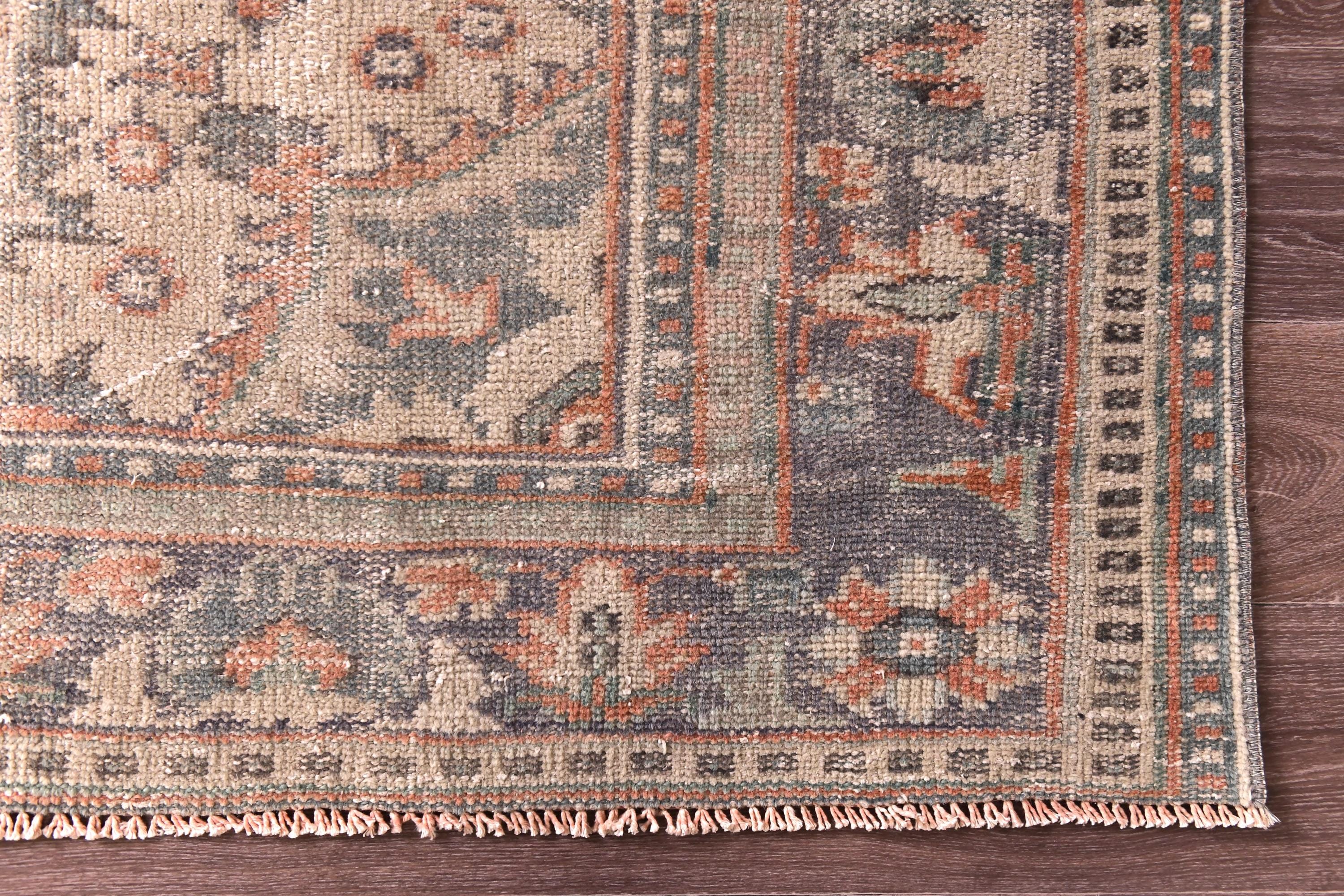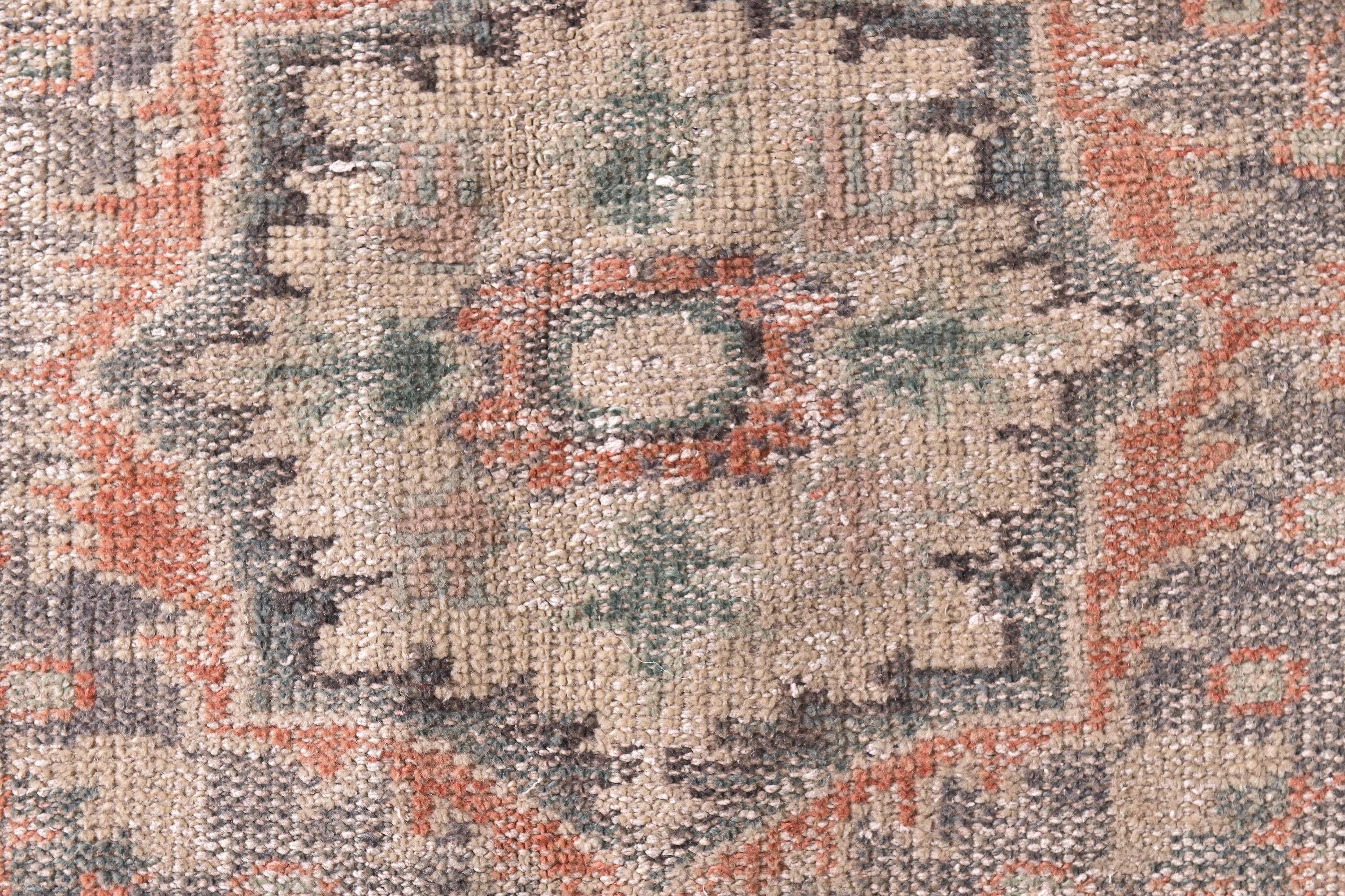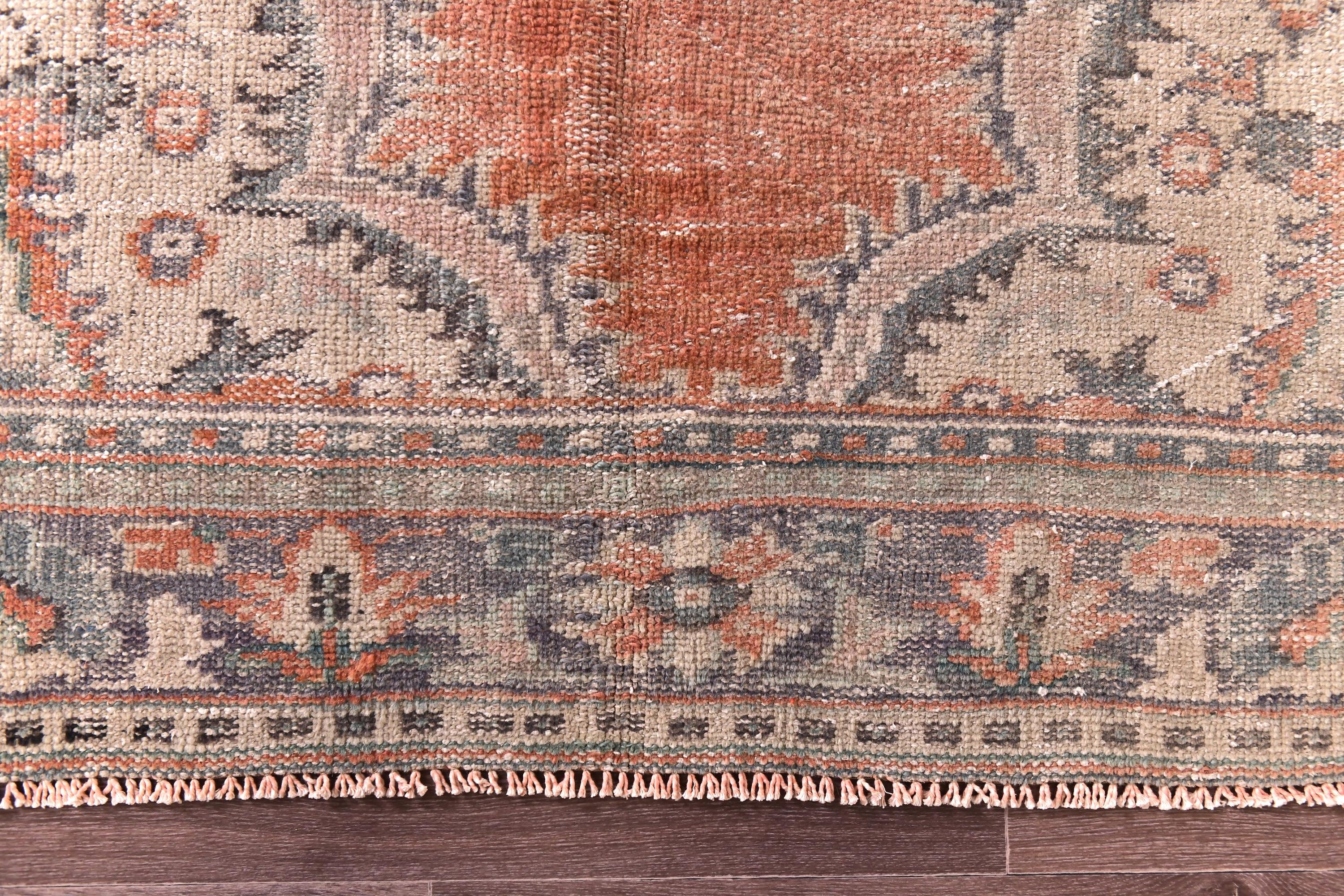 📜📌Vintage hand-knotted Turkish area rug featuring soft coral orange field with distressed gray-blue floral medallion center, ornate botanical border in faded beige, peach and blue tones, showing authentic low pile worn patina on hardwood floor