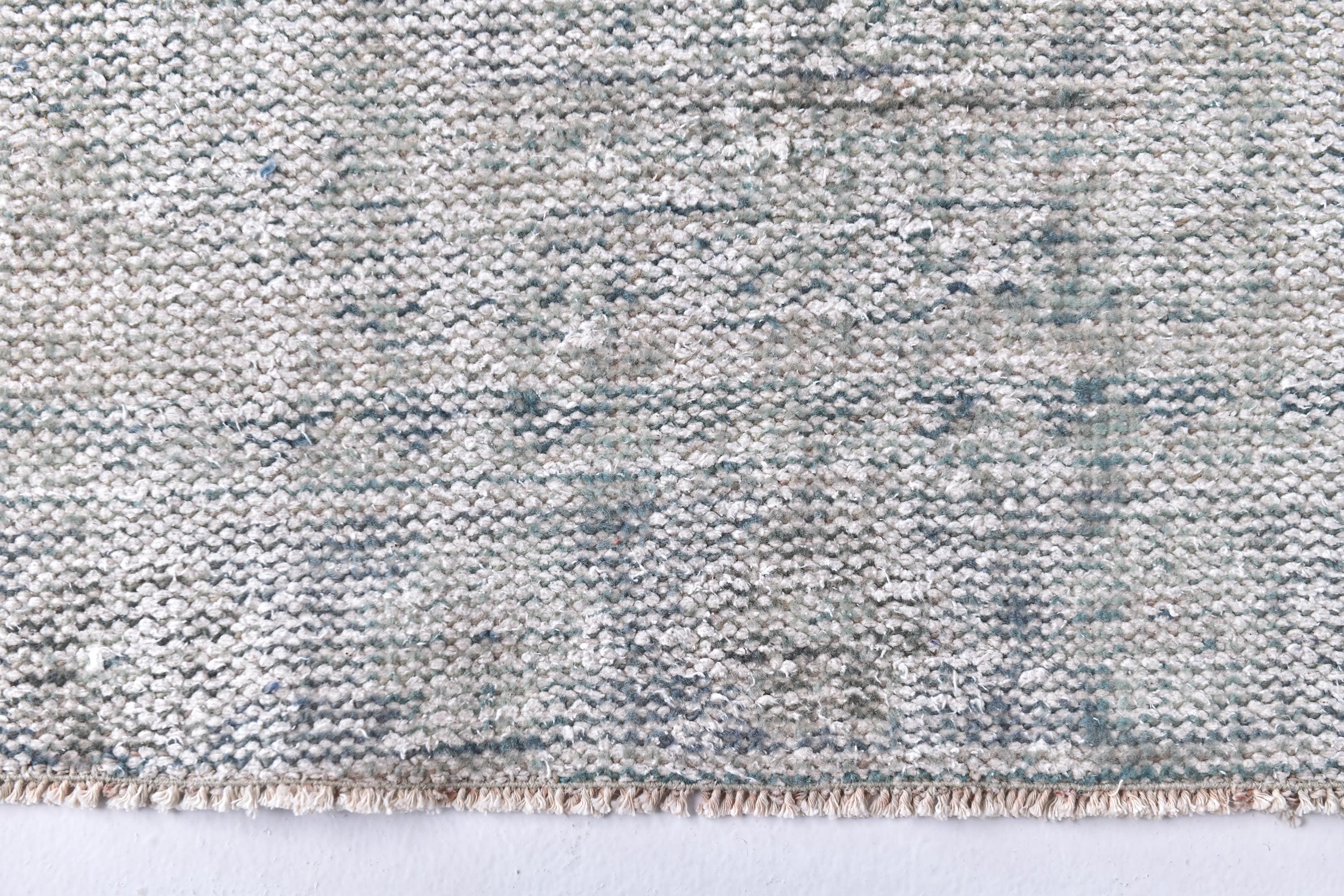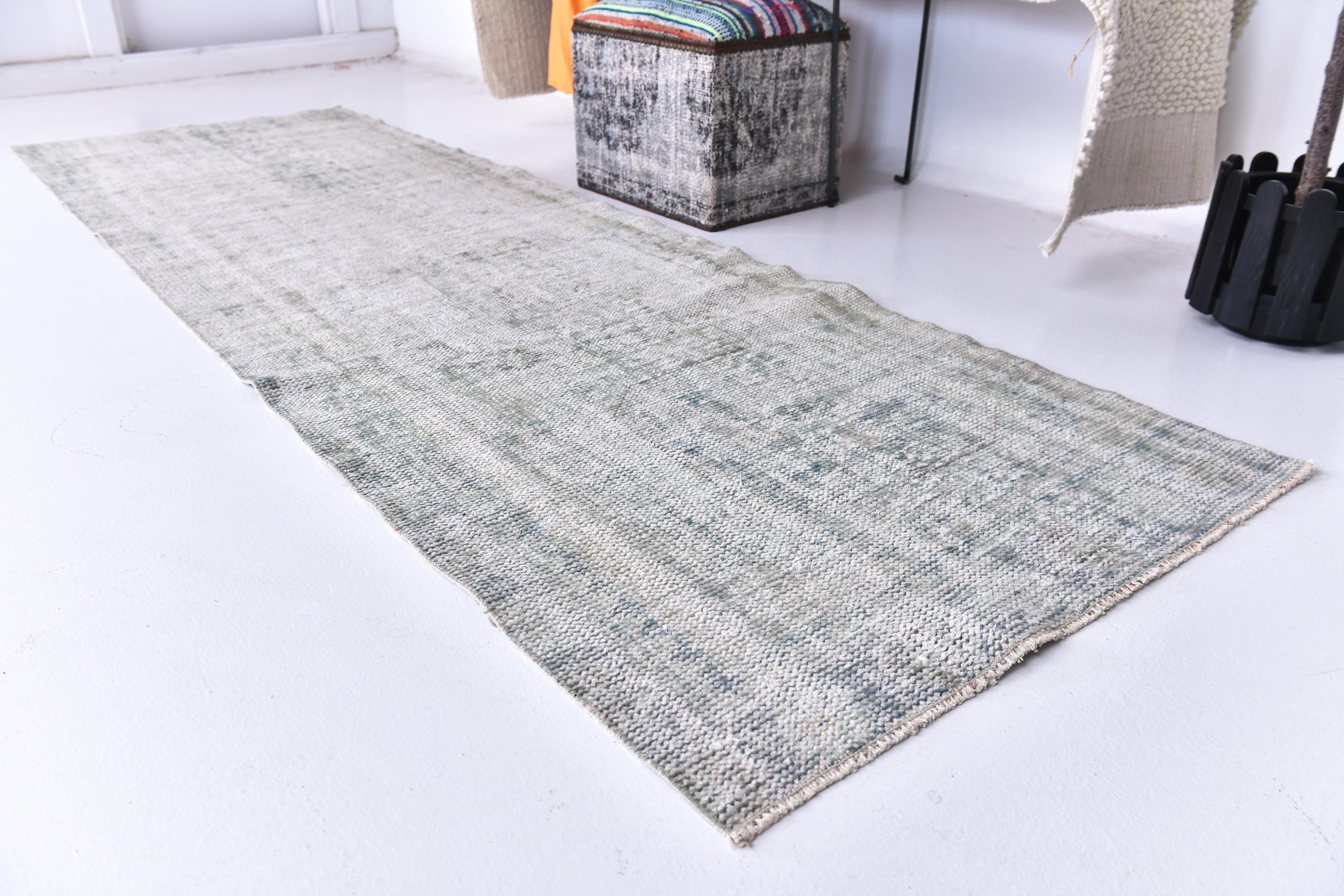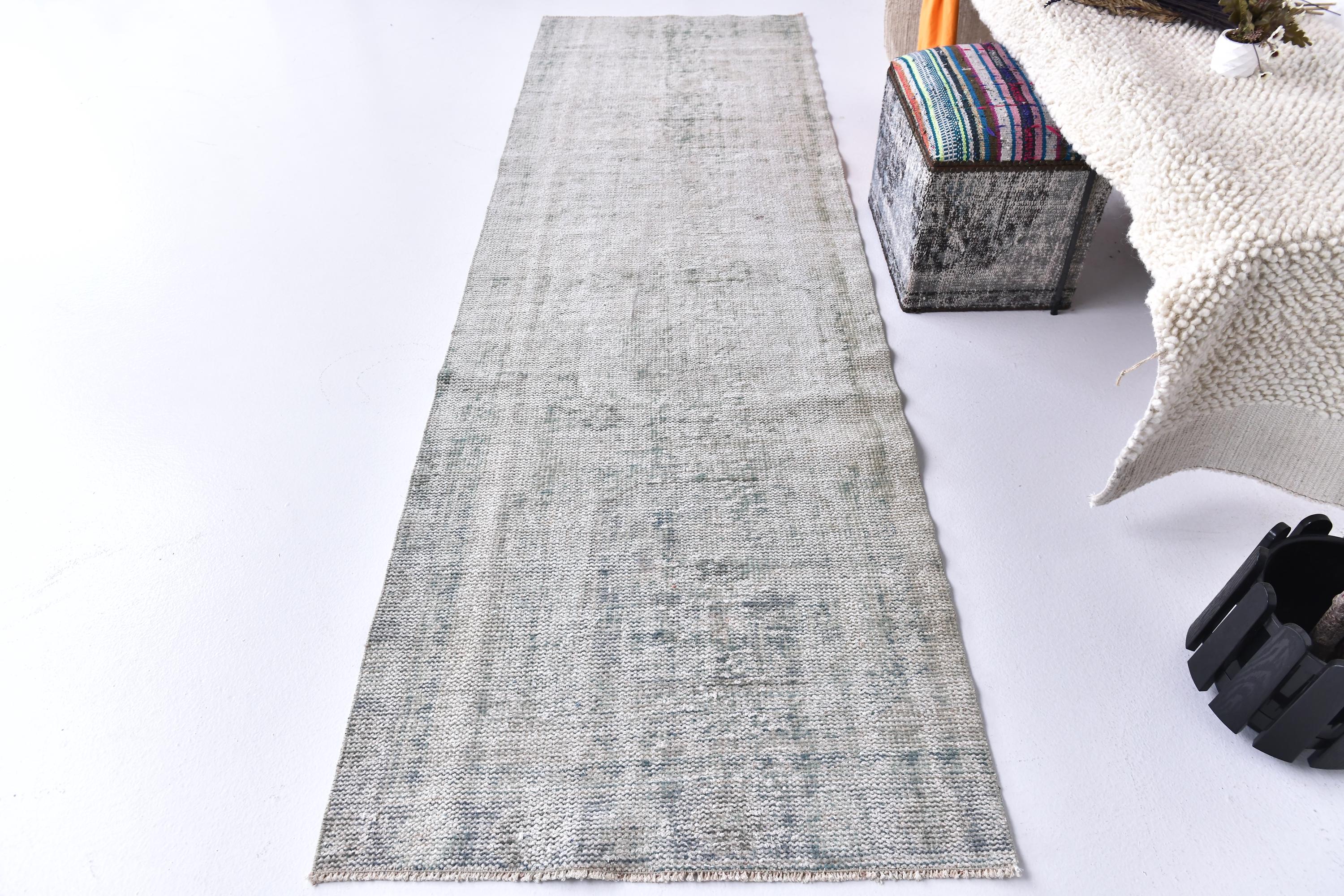 📜📌 Vintage Turkish runner rug in pale grey and sage green tones with subtle distressed finish and faded geometric patterns. Long narrow hand-knotted wool carpet with low pile construction, perfect for hallways, entryways, or kitchen spaces, featuring minimalist overdyed aesthetic.