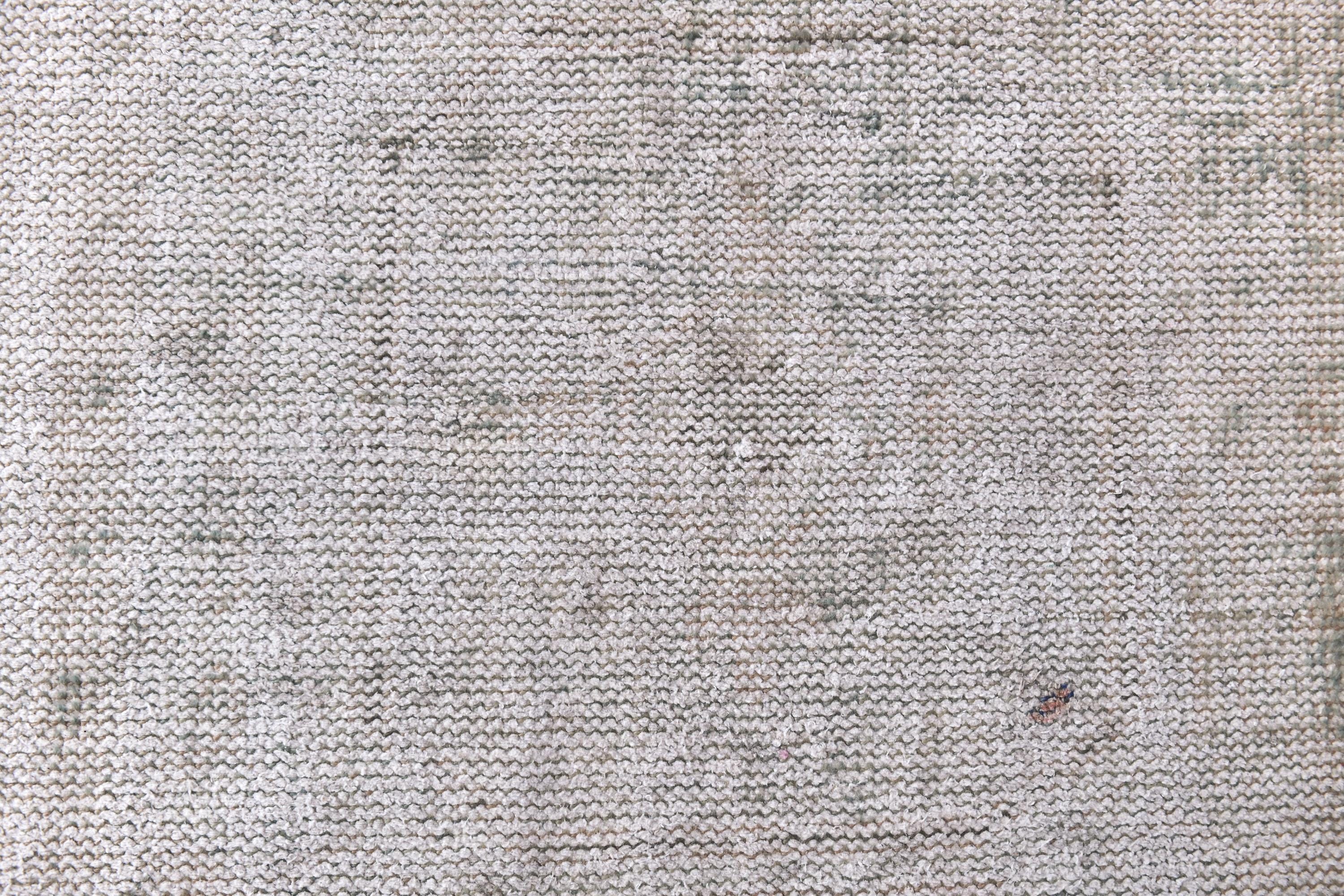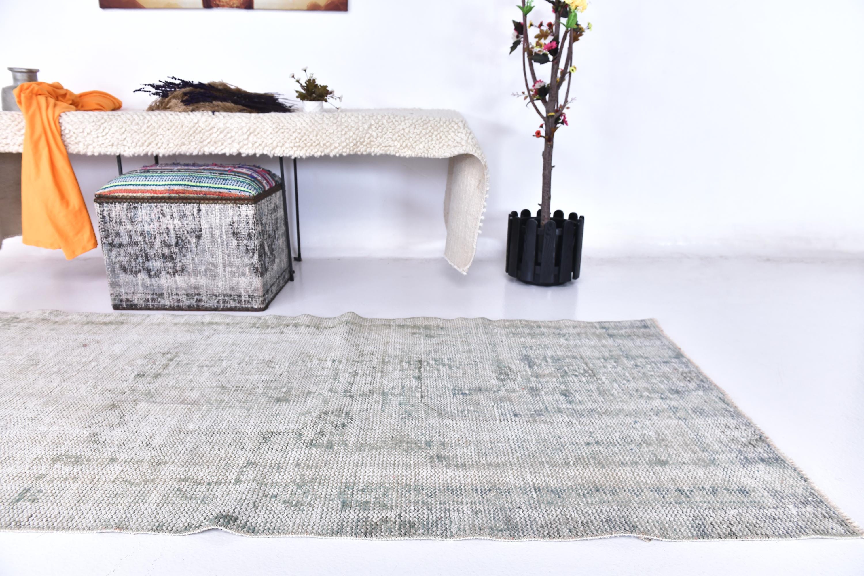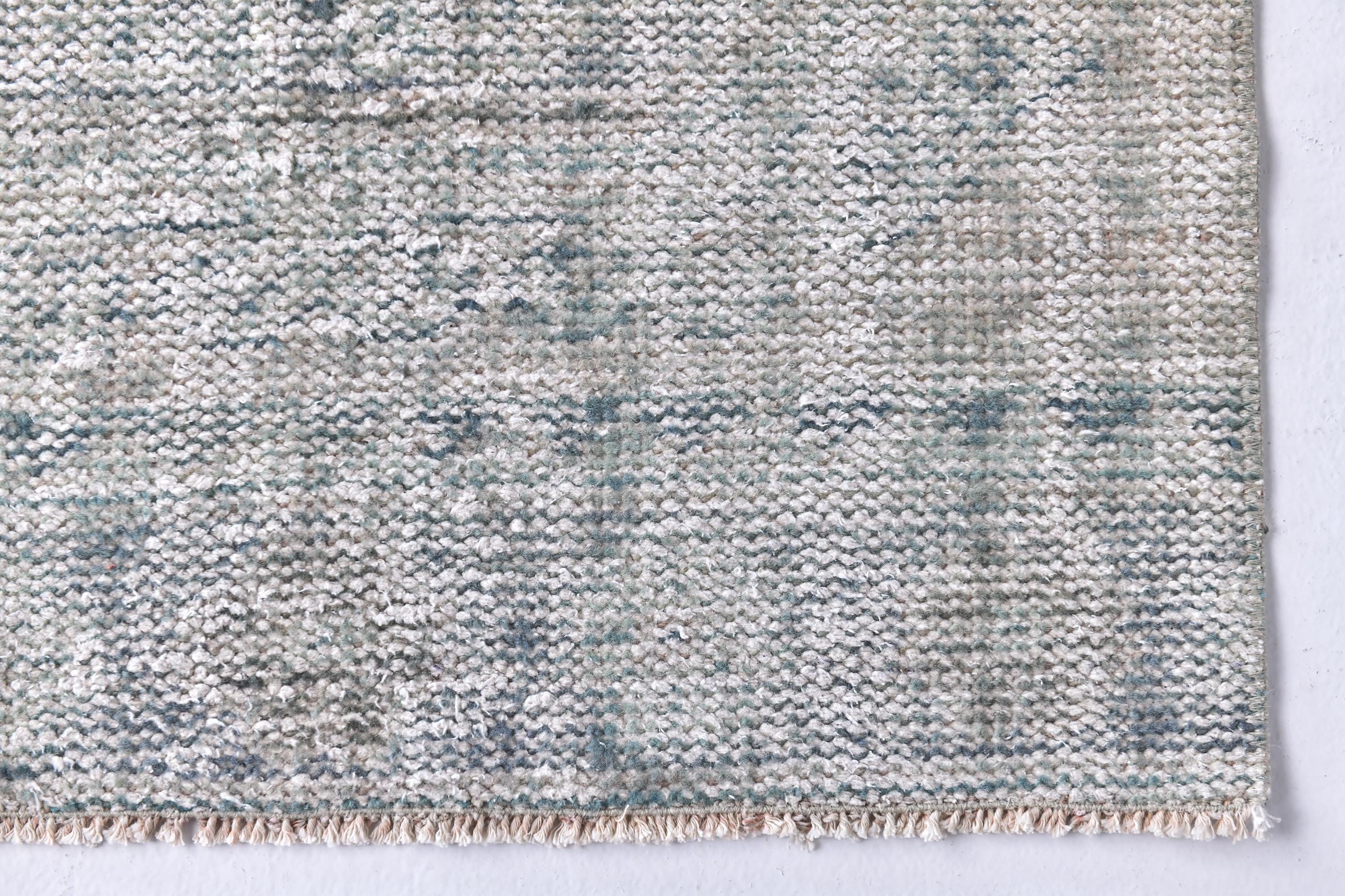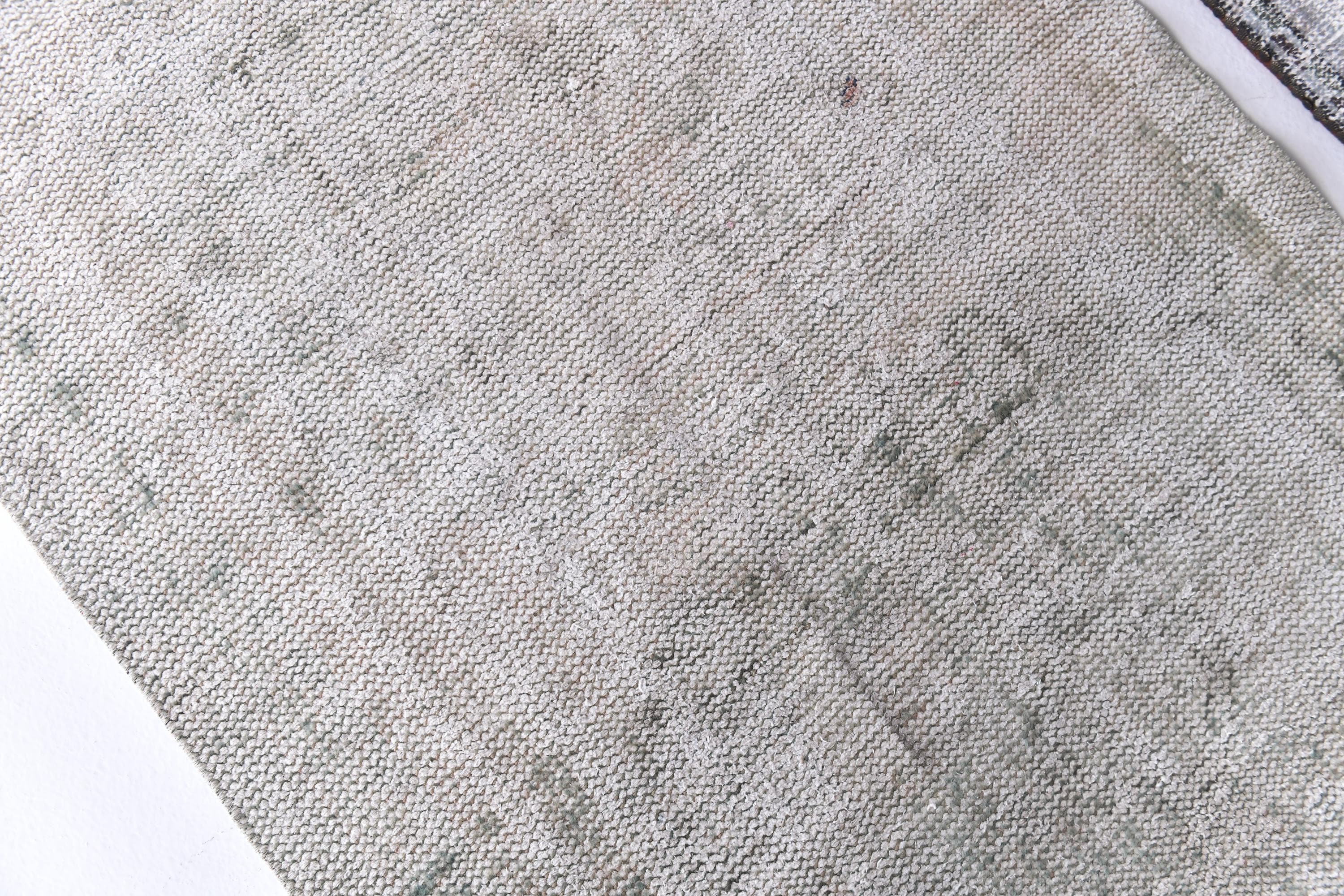 📜📌 Vintage Turkish runner rug in pale grey and sage green tones with subtle distressed finish and faded geometric patterns. Long narrow hand-knotted wool carpet with low pile construction, perfect for hallways, entryways, or kitchen spaces, featuring minimalist overdyed aesthetic.