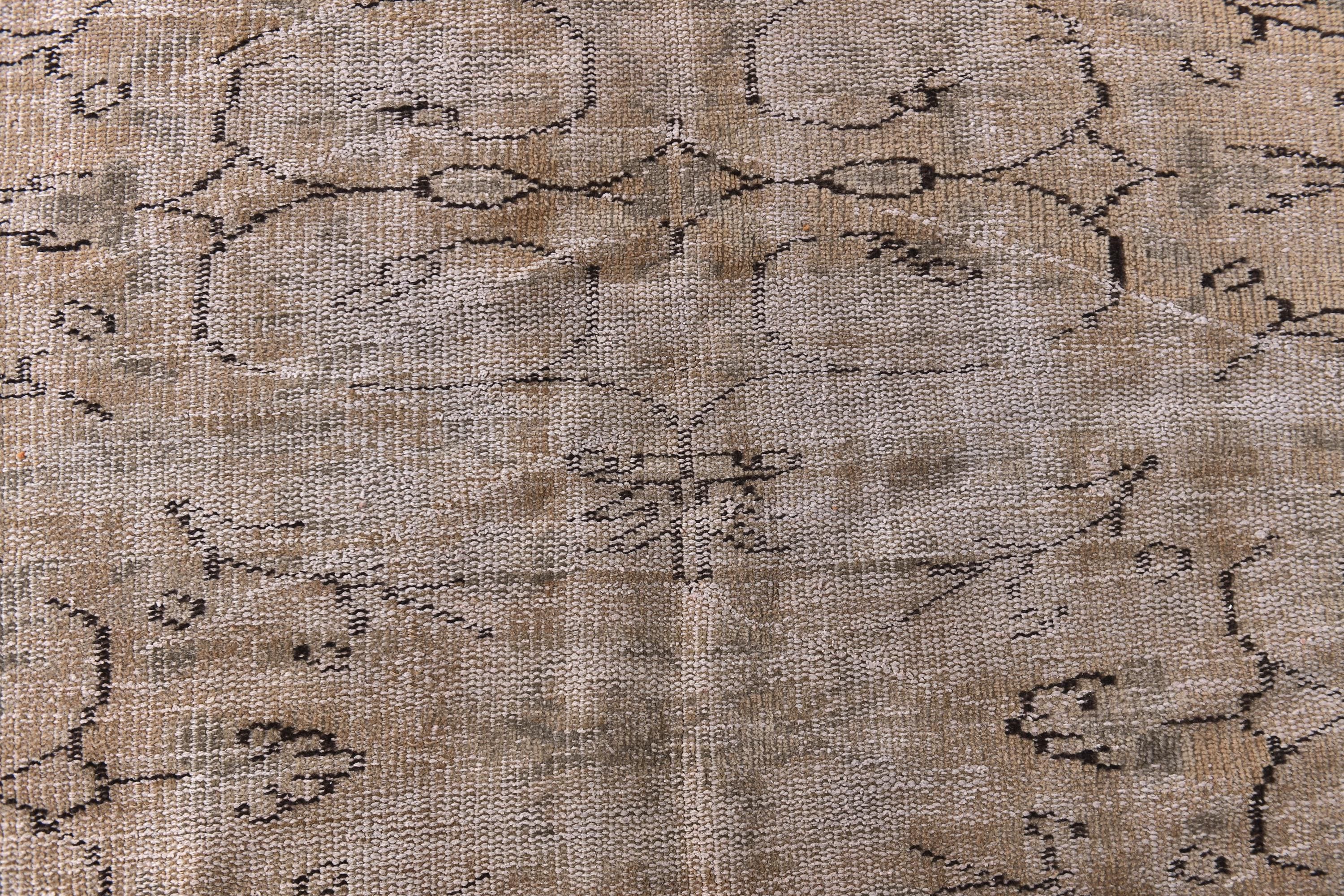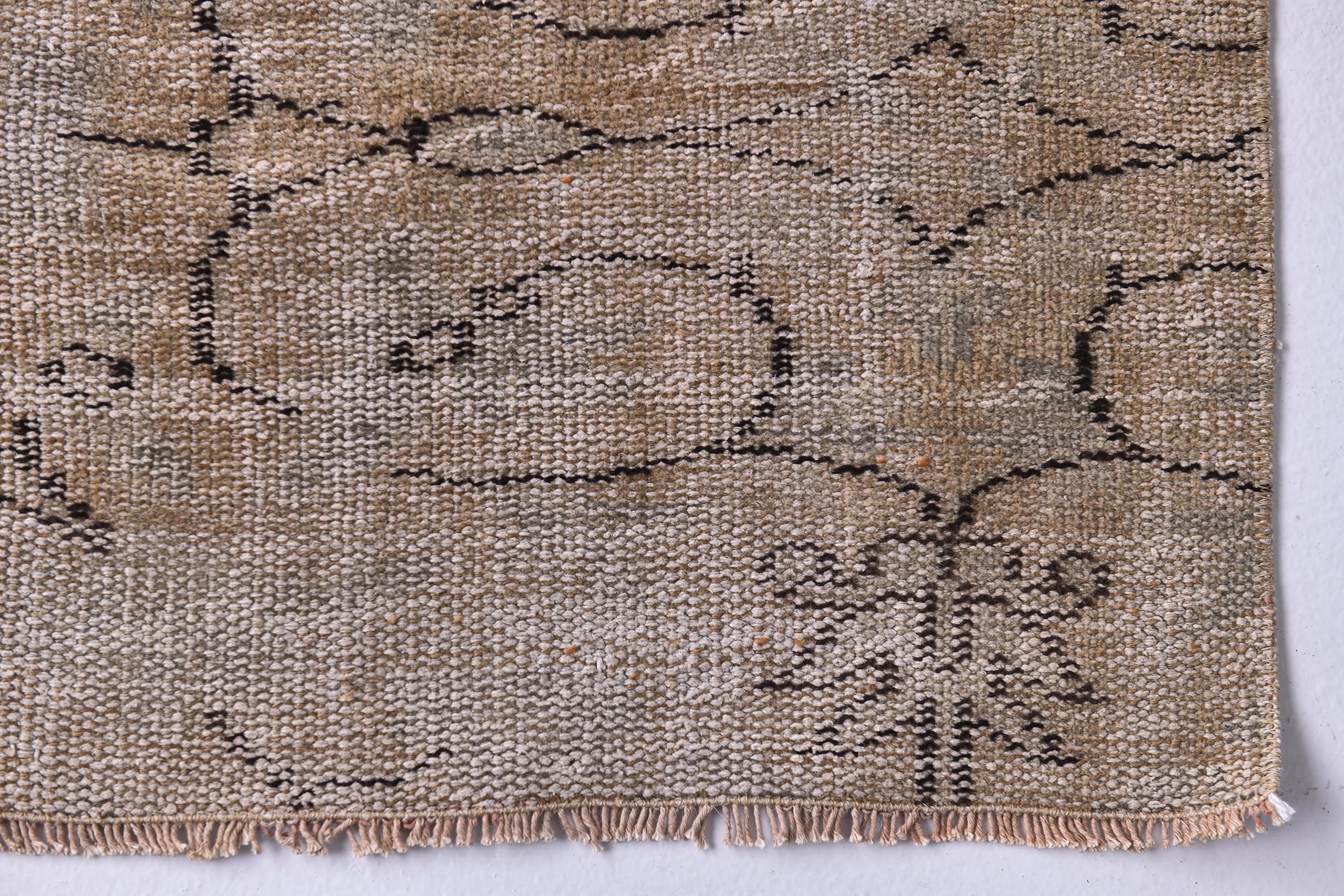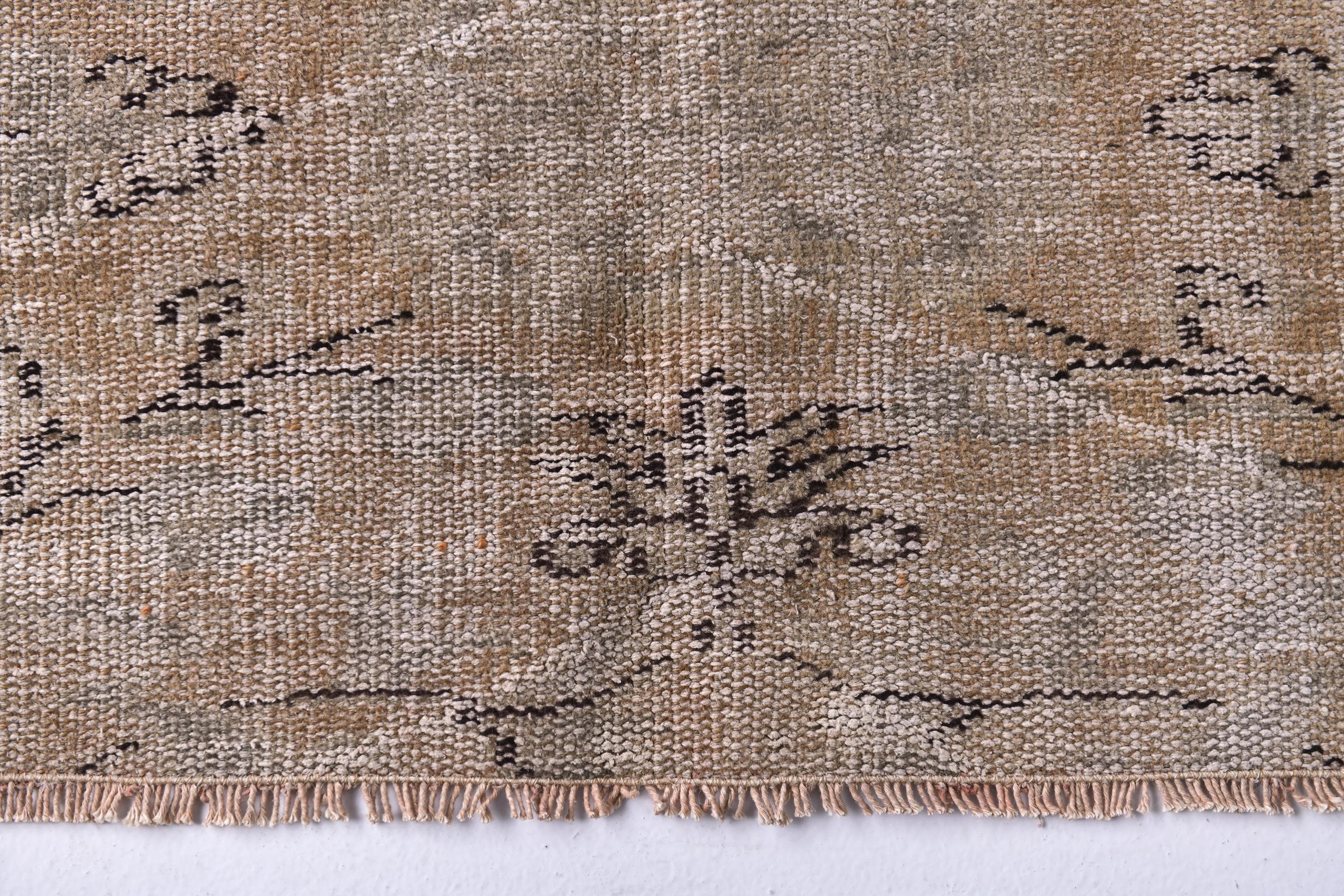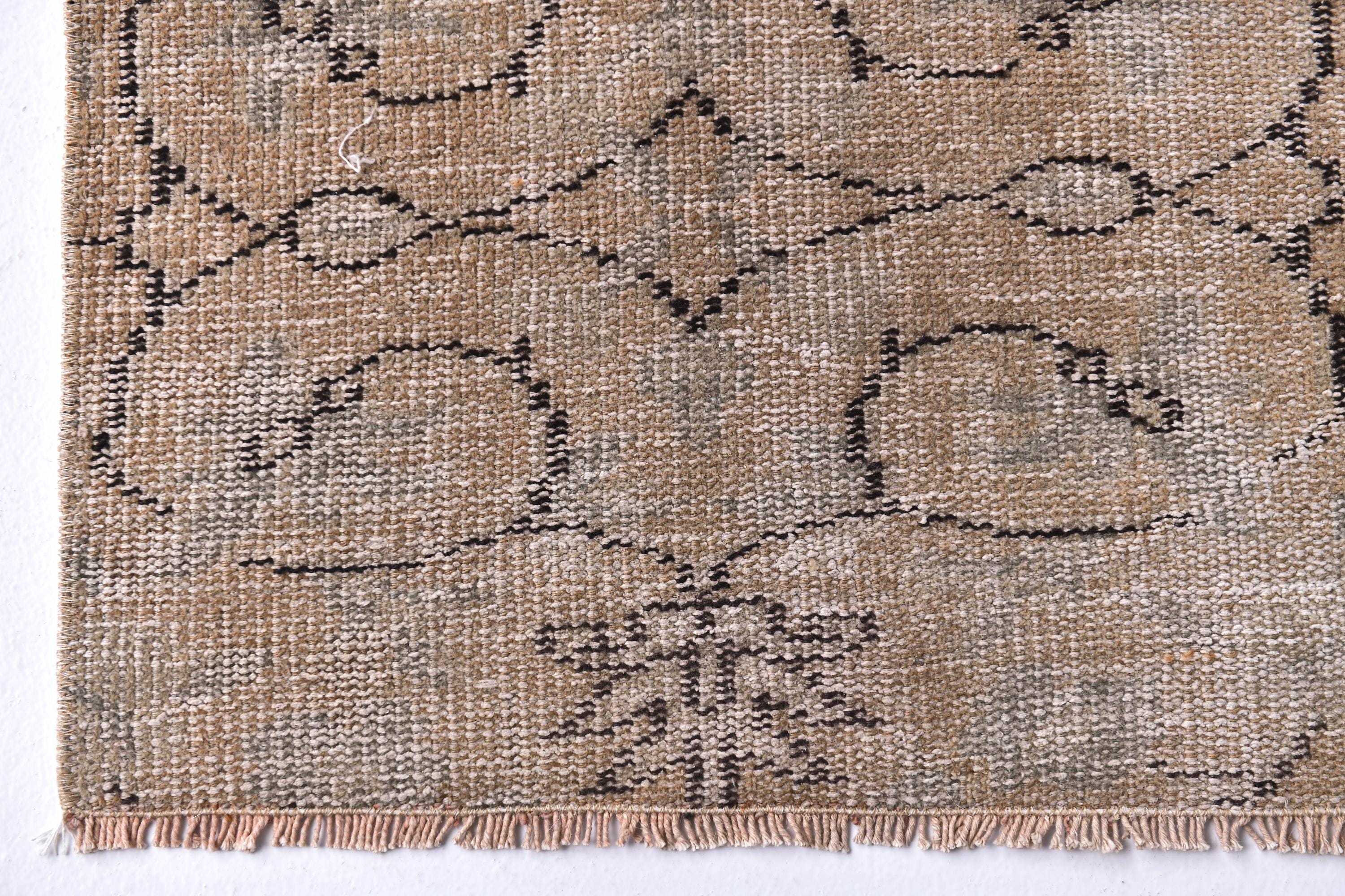 📜📌 Vintage beige Turkish rug featuring distressed floral vine motifs and geometric rosettes in dark brown on neutral taupe background. Hand-knotted wool carpet with faded overdyed finish and natural fringe edges, displaying traditional Oushak-style botanical patterns.