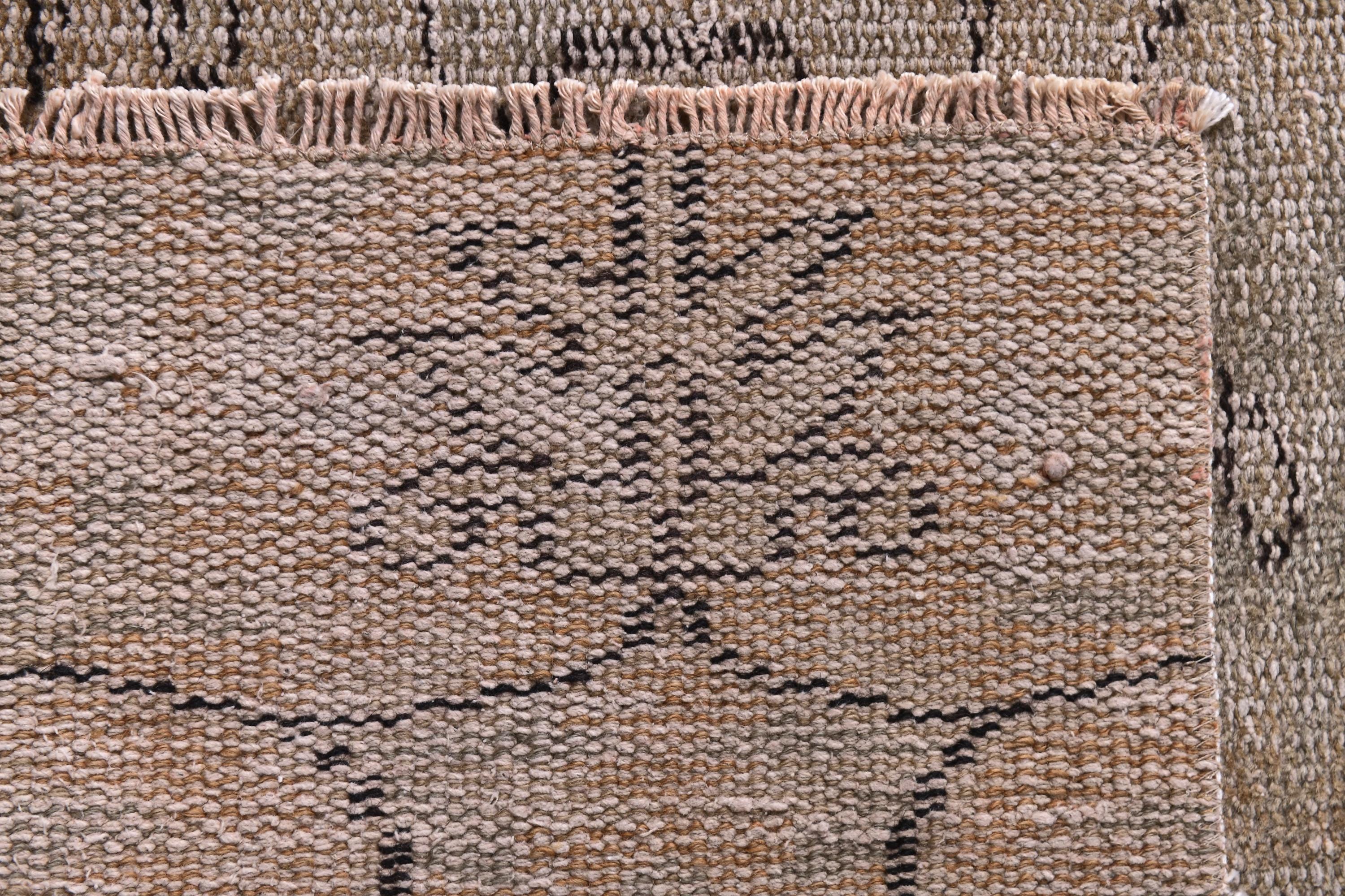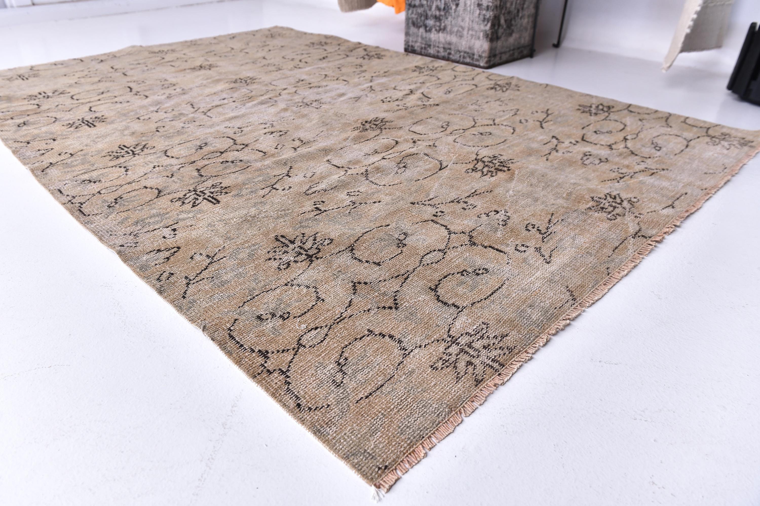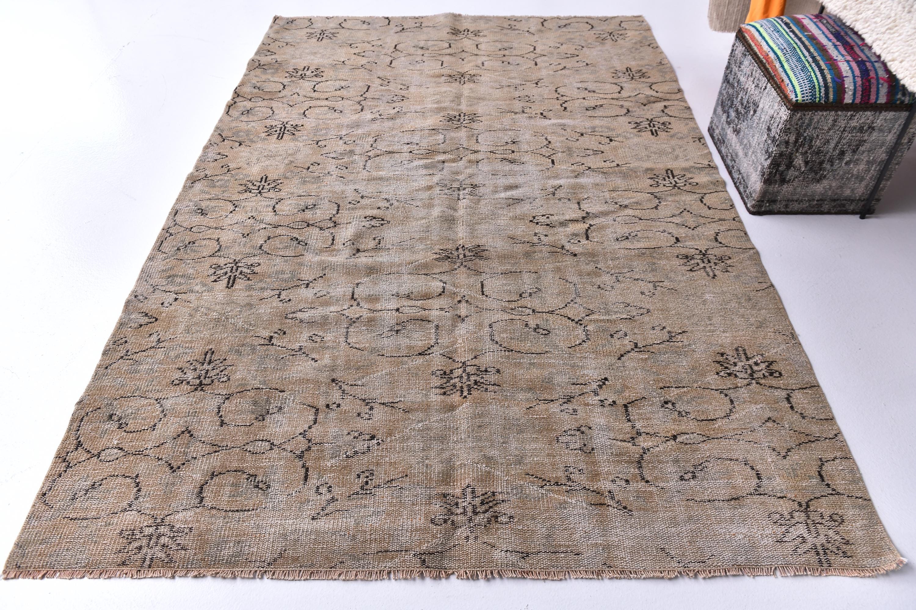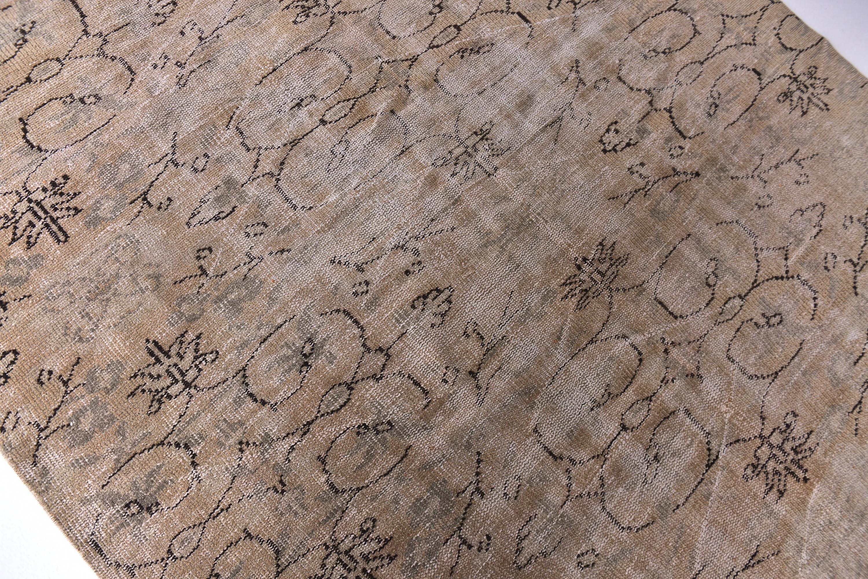 📜📌 Vintage beige Turkish rug featuring distressed floral vine motifs and geometric rosettes in dark brown on neutral taupe background. Hand-knotted wool carpet with faded overdyed finish and natural fringe edges, displaying traditional Oushak-style botanical patterns.