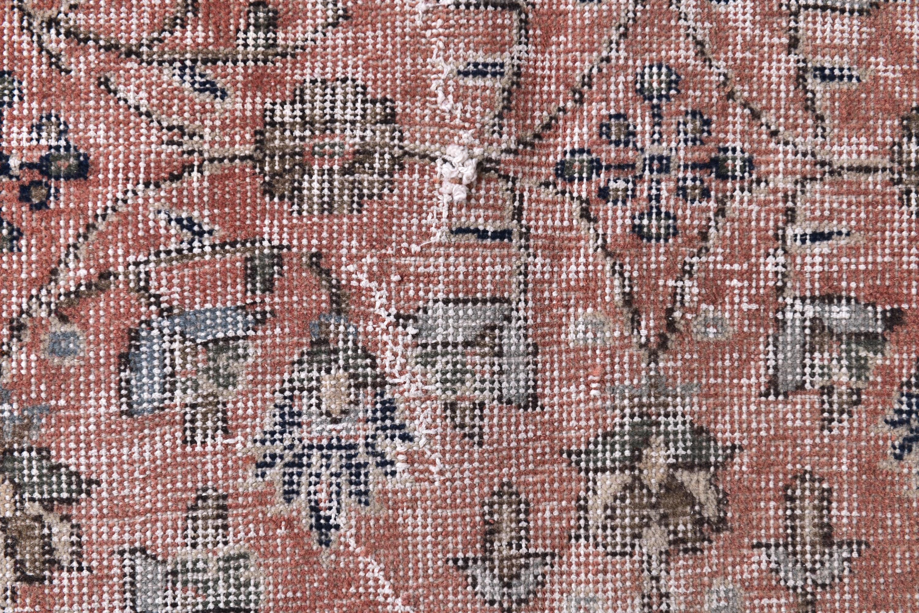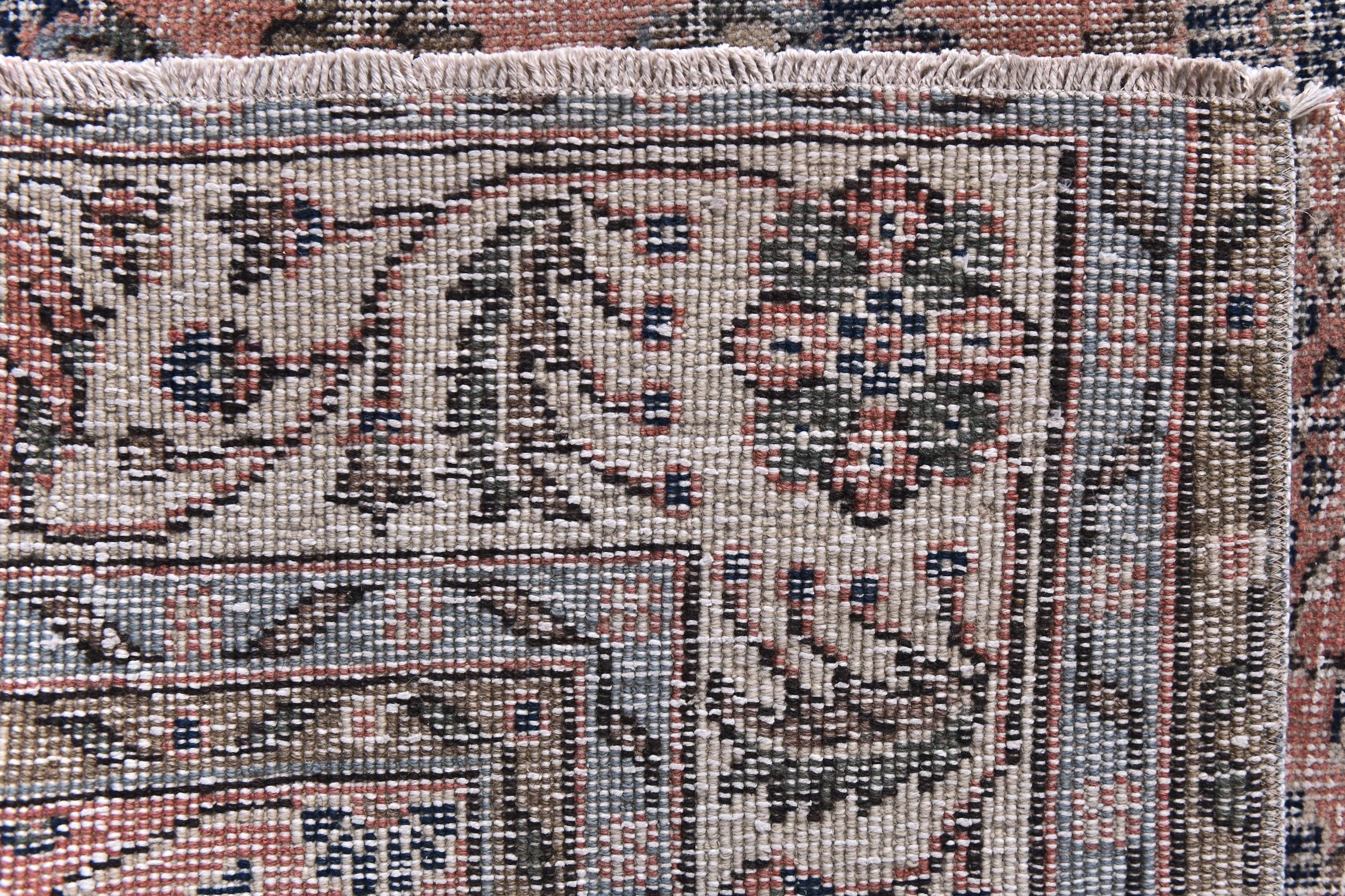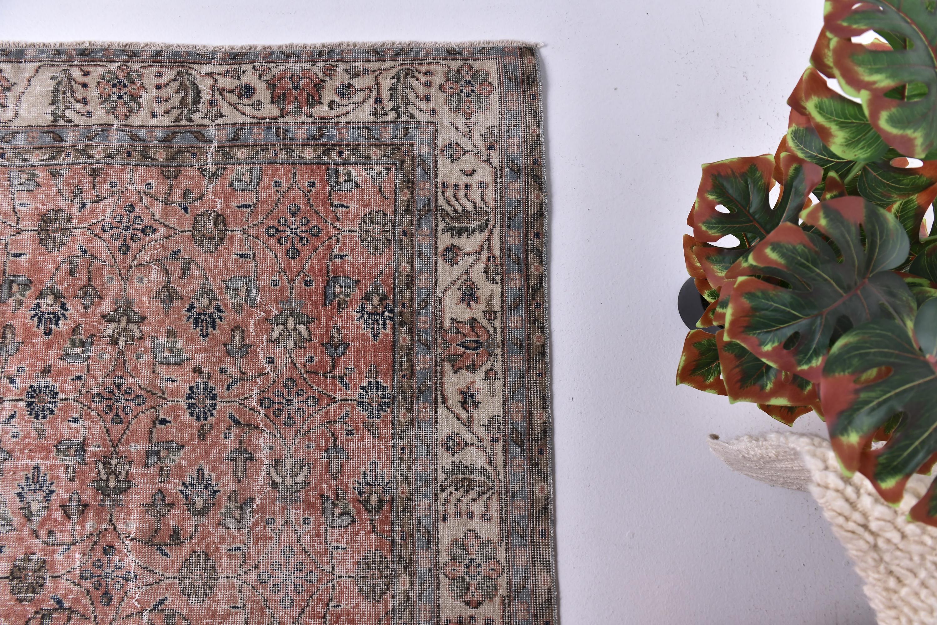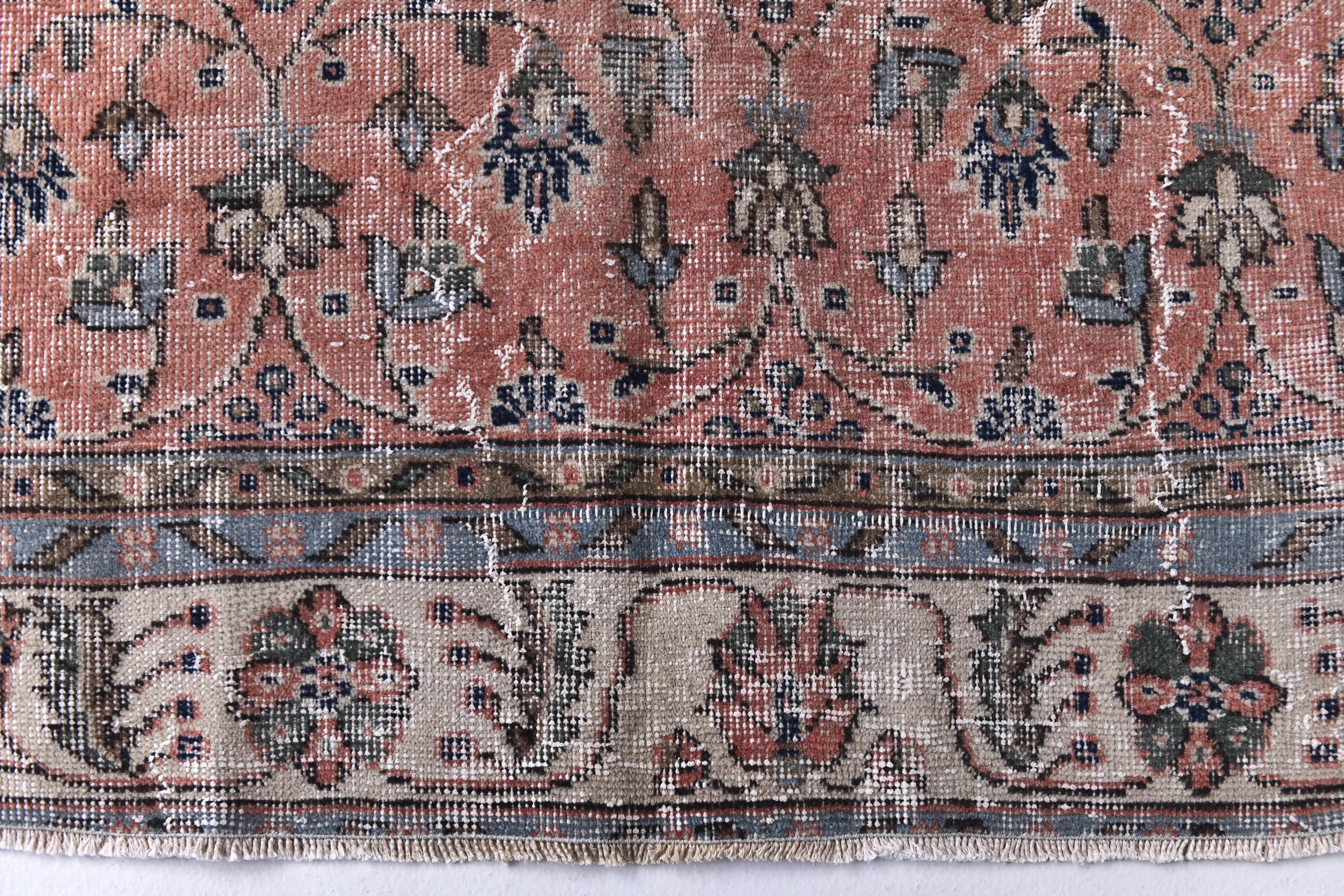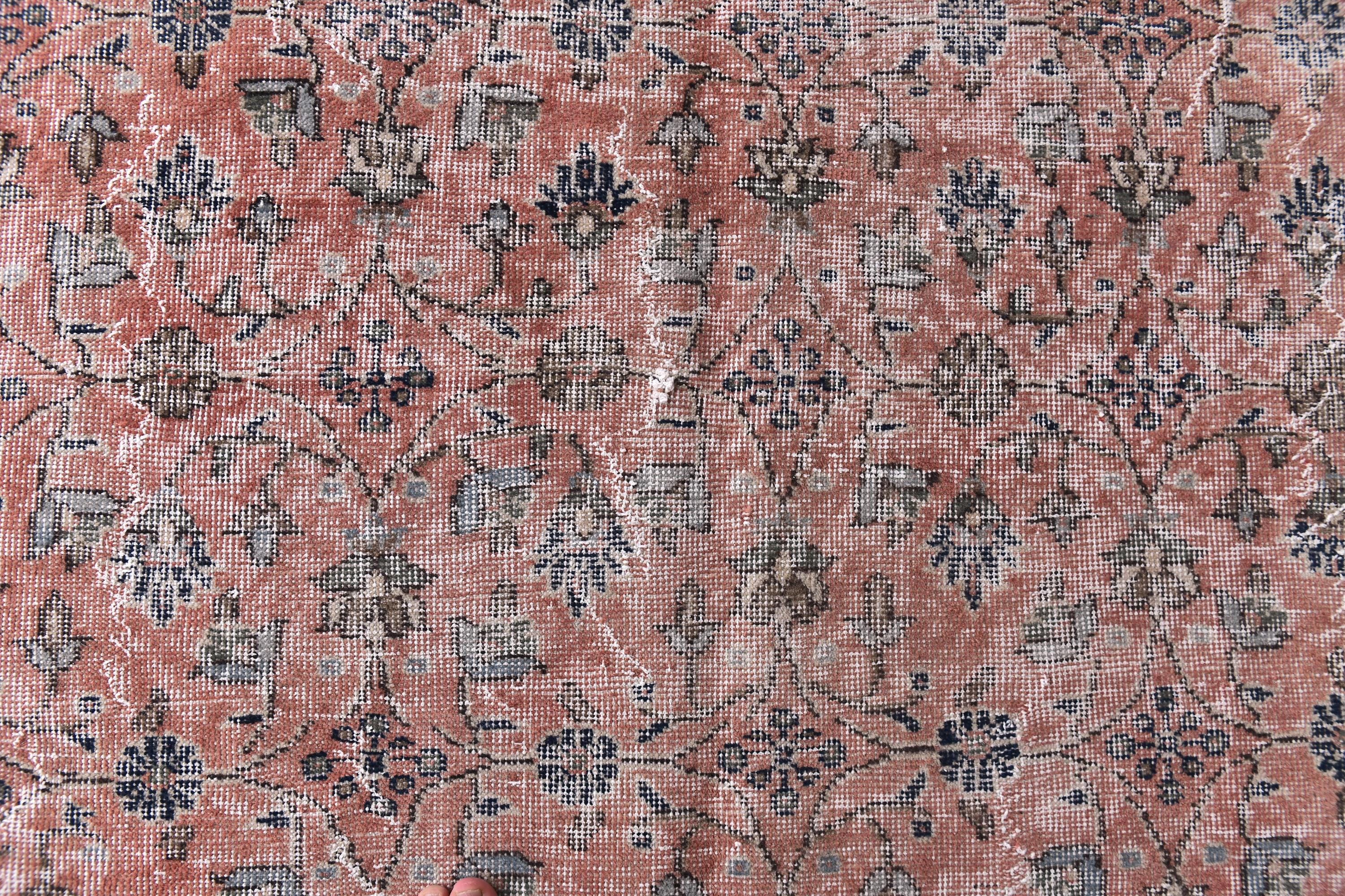📜📌Antique Anatolian wool carpet with faded salmon-coral central field decorated with all-over floral rosette patterns in navy blue, beige, and soft green. Wide cream border displays classic vine and palmette designs. The distressed low-pile texture reveals the rug's age and authentic vintage character, ideal for farmhouse or boho-chic home decor.