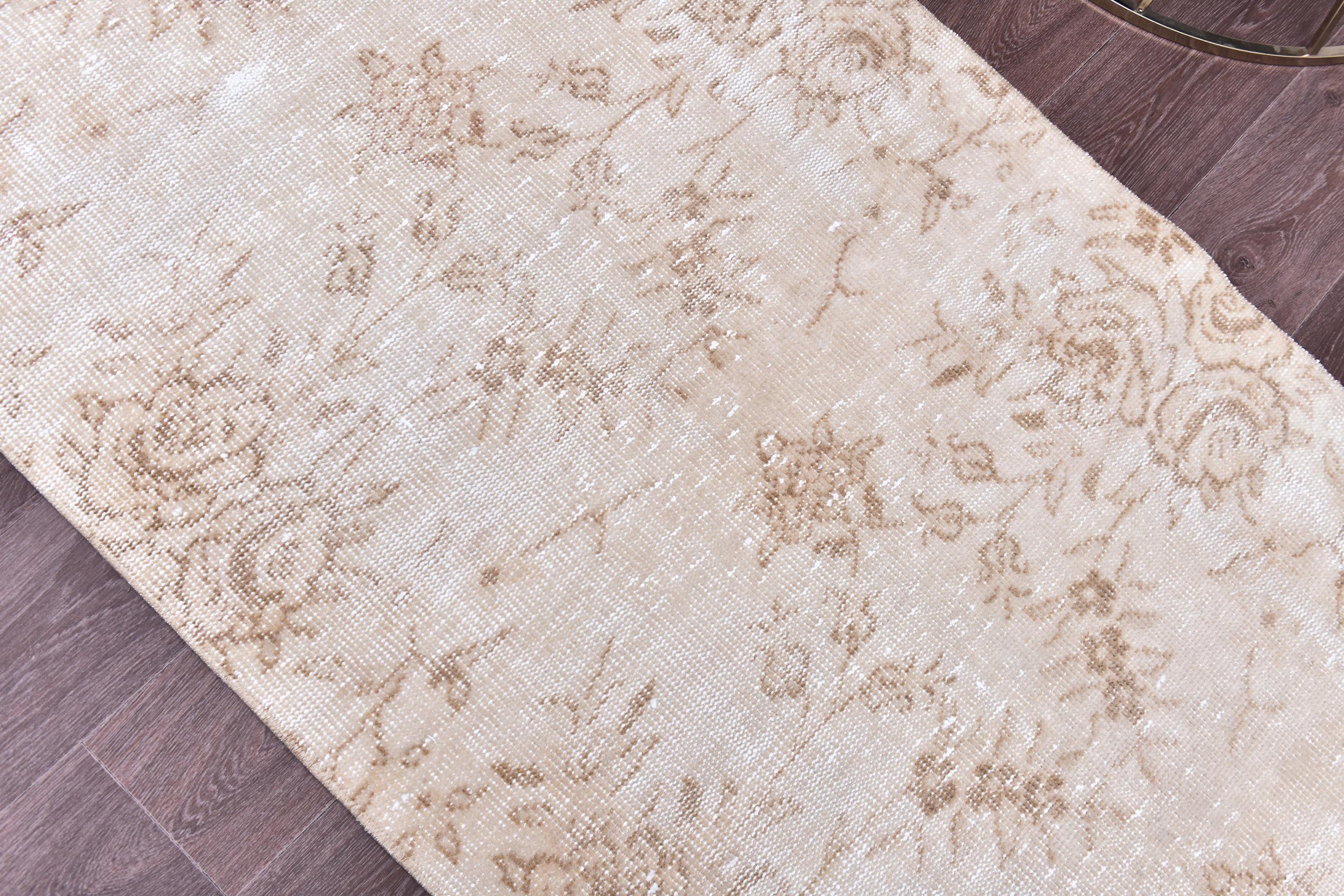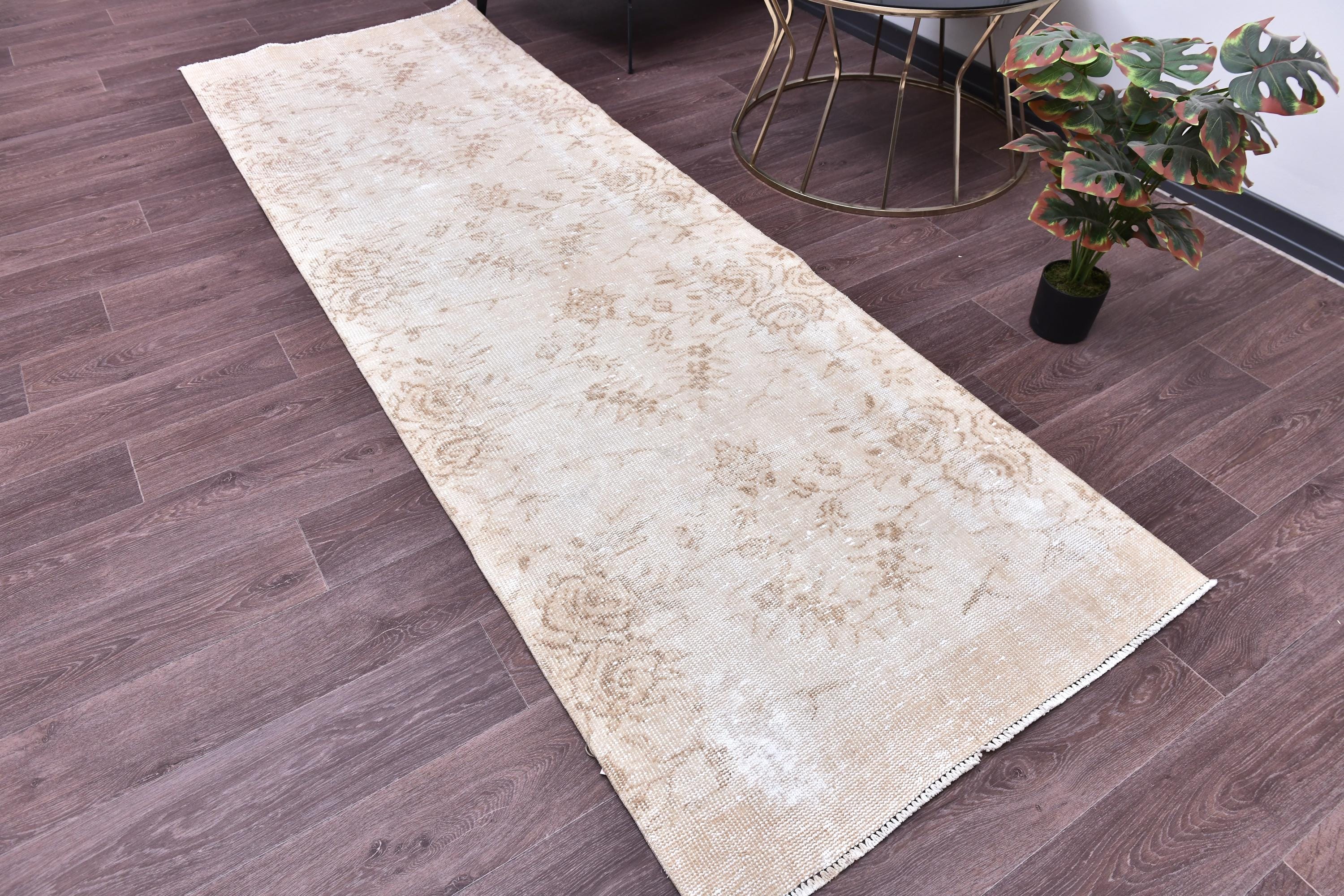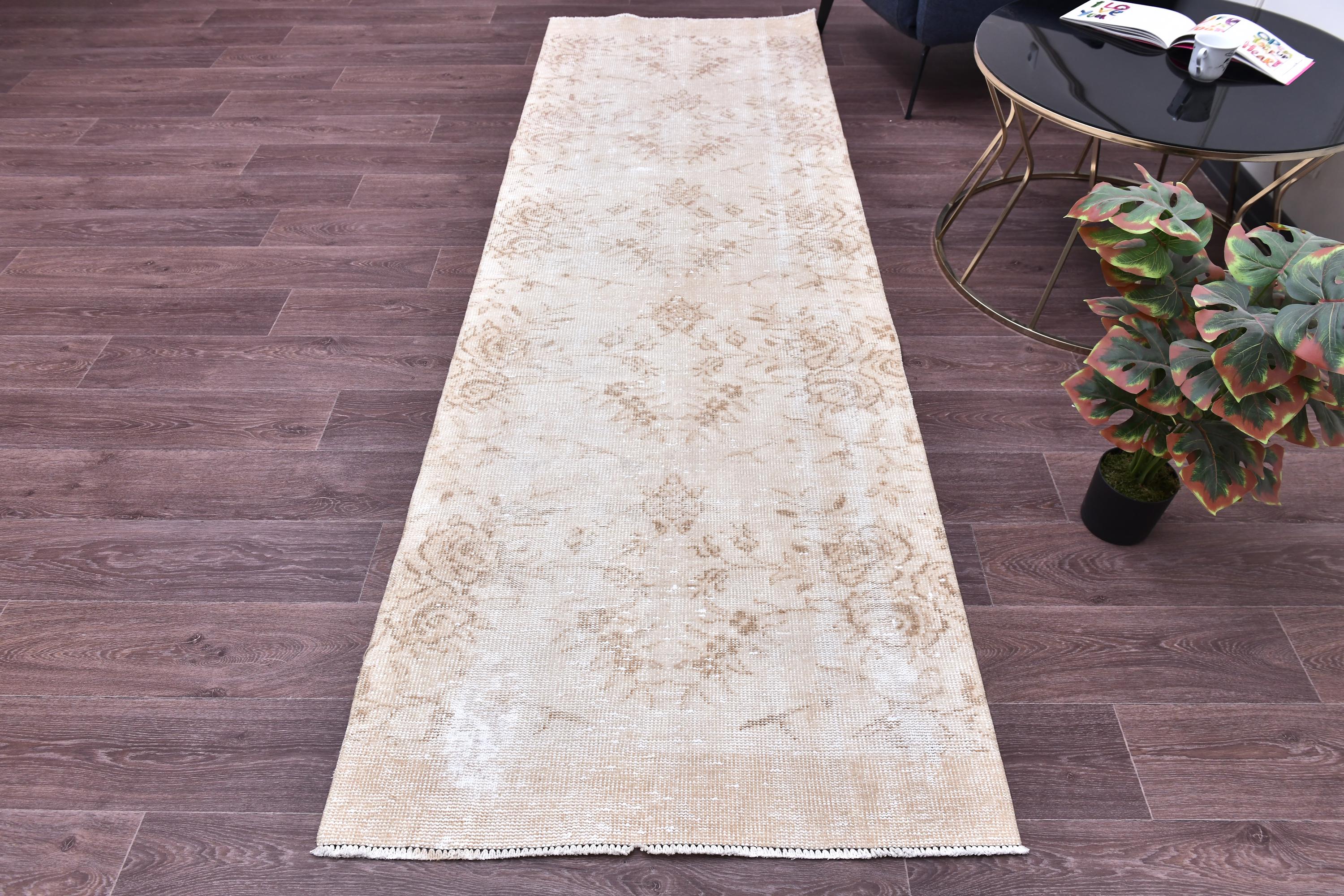 📜📌 Vintage Turkish runner rug in soft beige and cream tones with faded floral medallion patterns. Long narrow hand-knotted wool hallway carpet featuring distressed vintage patina, subtle botanical motifs, and neutral color palette. Perfect for hallways, kitchens, or narrow spaces in bohemian or farmhouse style homes.