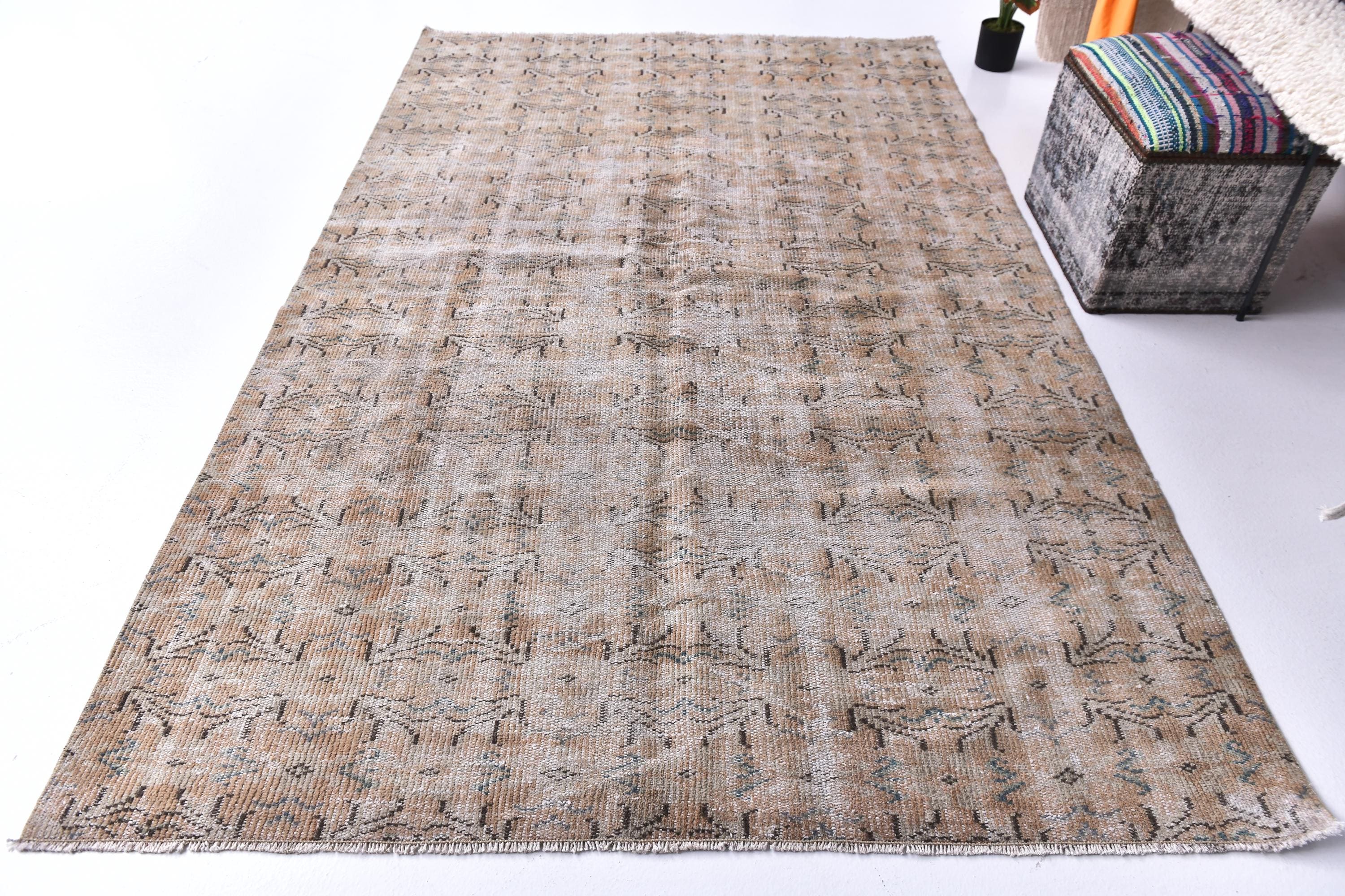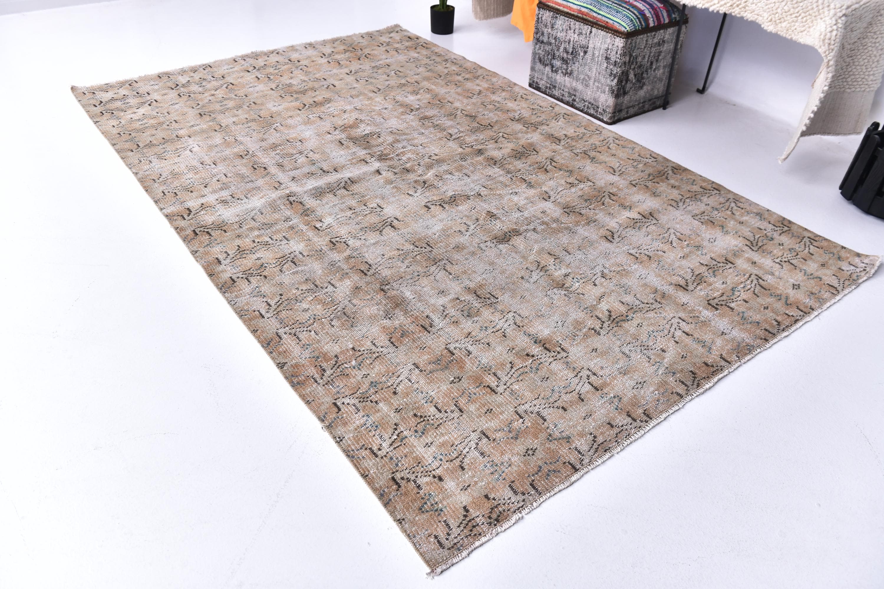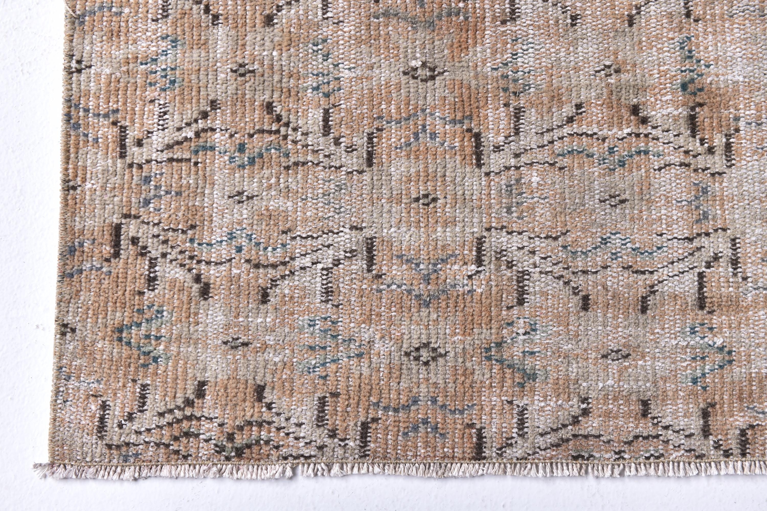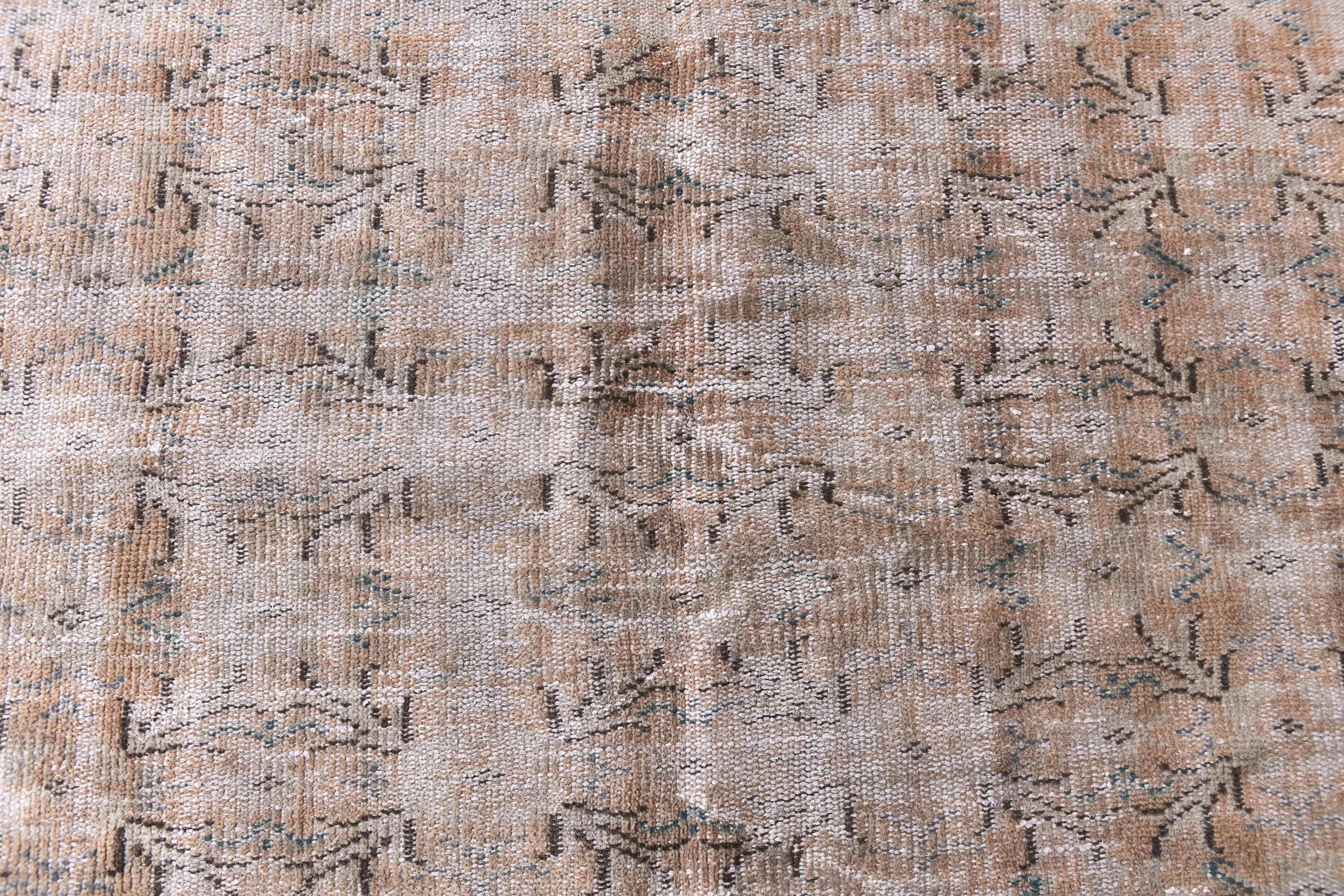 📜📌 Vintage beige Turkish rug featuring distressed floral vine motifs and geometric rosettes in dark brown on neutral taupe background. Hand-knotted wool carpet with faded overdyed finish and natural fringe edges, displaying traditional Oushak-style botanical patterns.