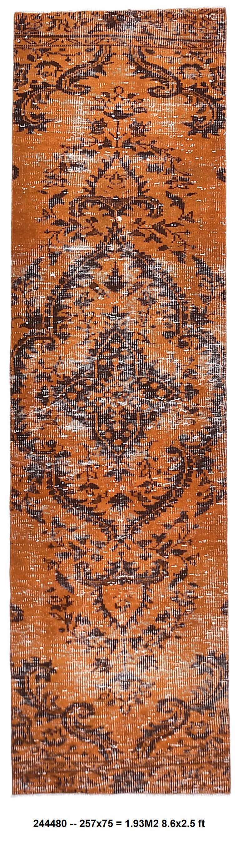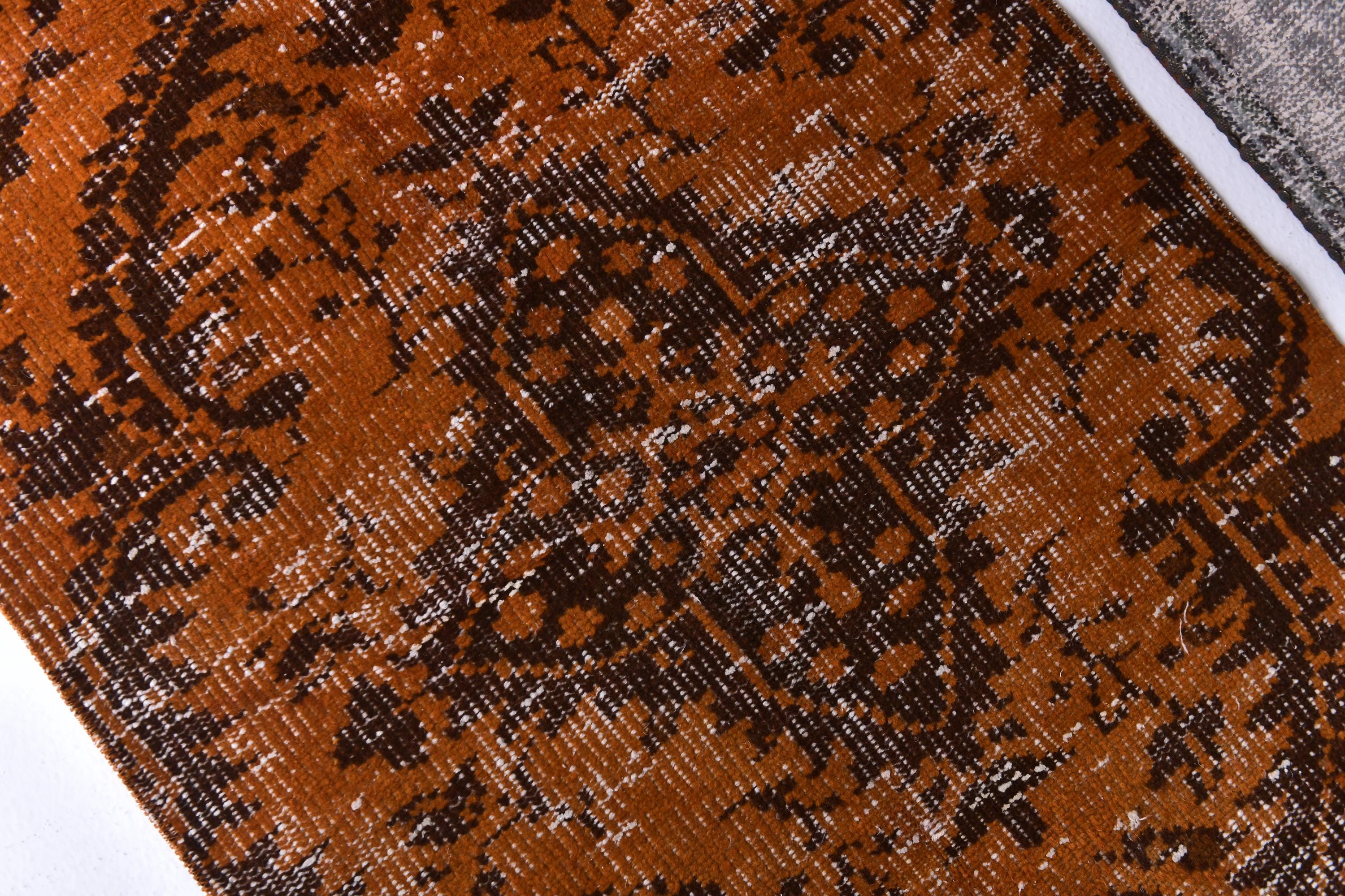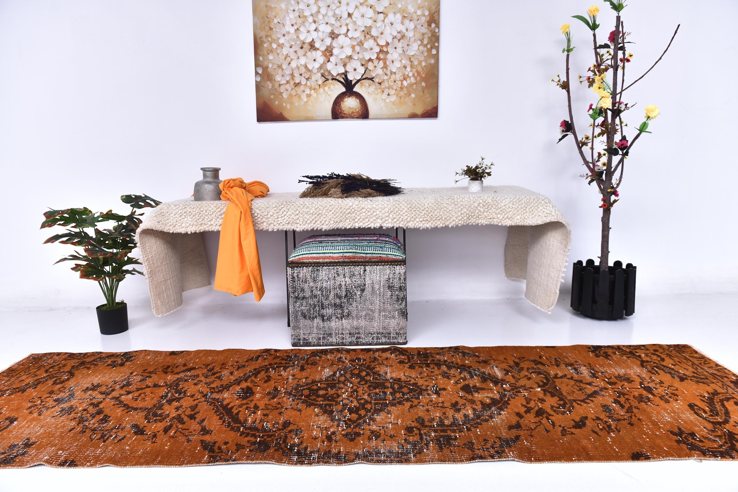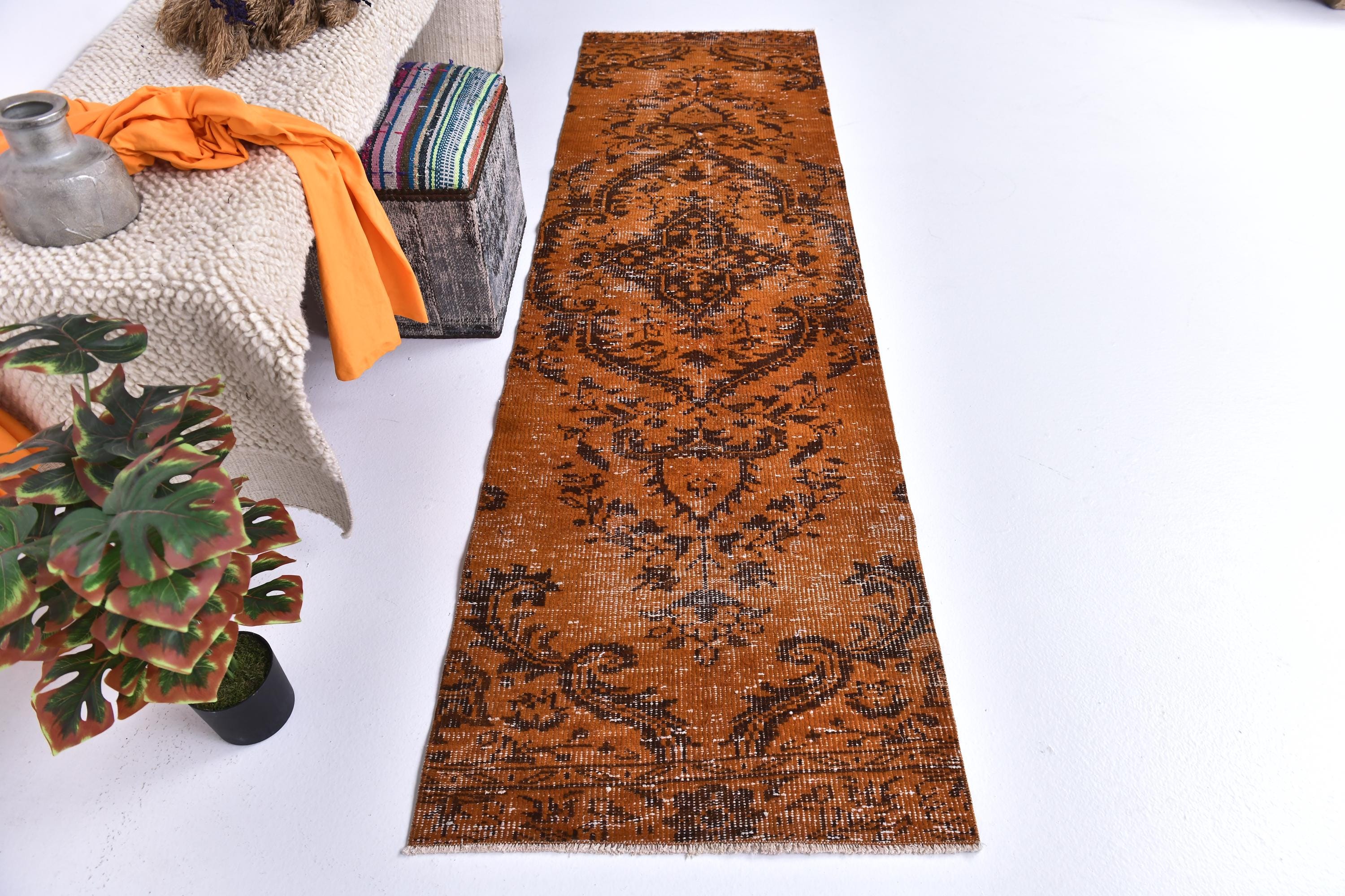 📜📌 Vintage Turkish runner rug featuring sophisticated faded color palette with rich terracotta and black tones, showcasing intricate all-over floral vine pattern with traditional ornate borders, hand-knotted low pile wool with authentic distressed texture and naturally worn appearance, perfect long narrow carpet for hallways, entryways and corridors in bohemian and vintage inspired interiors