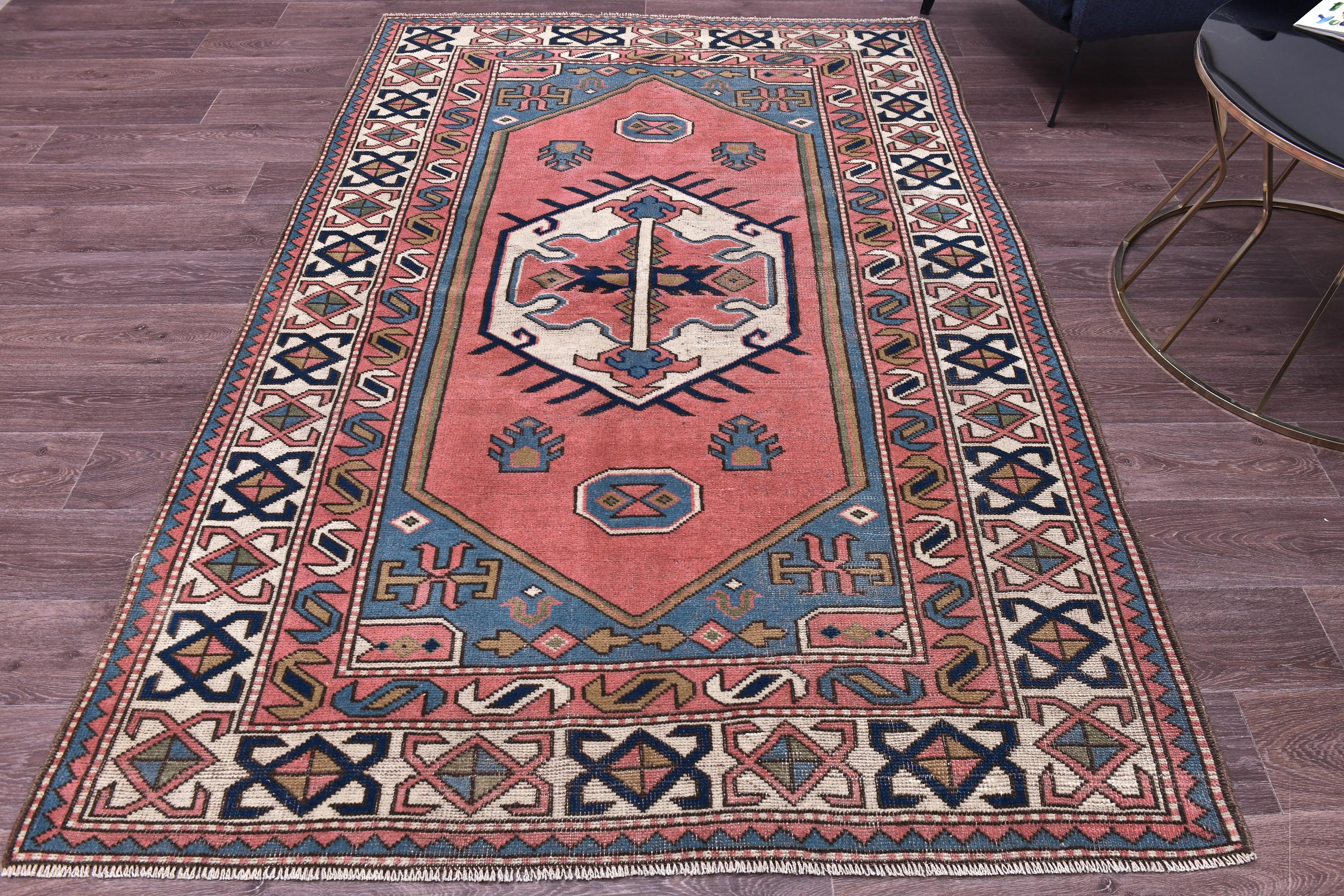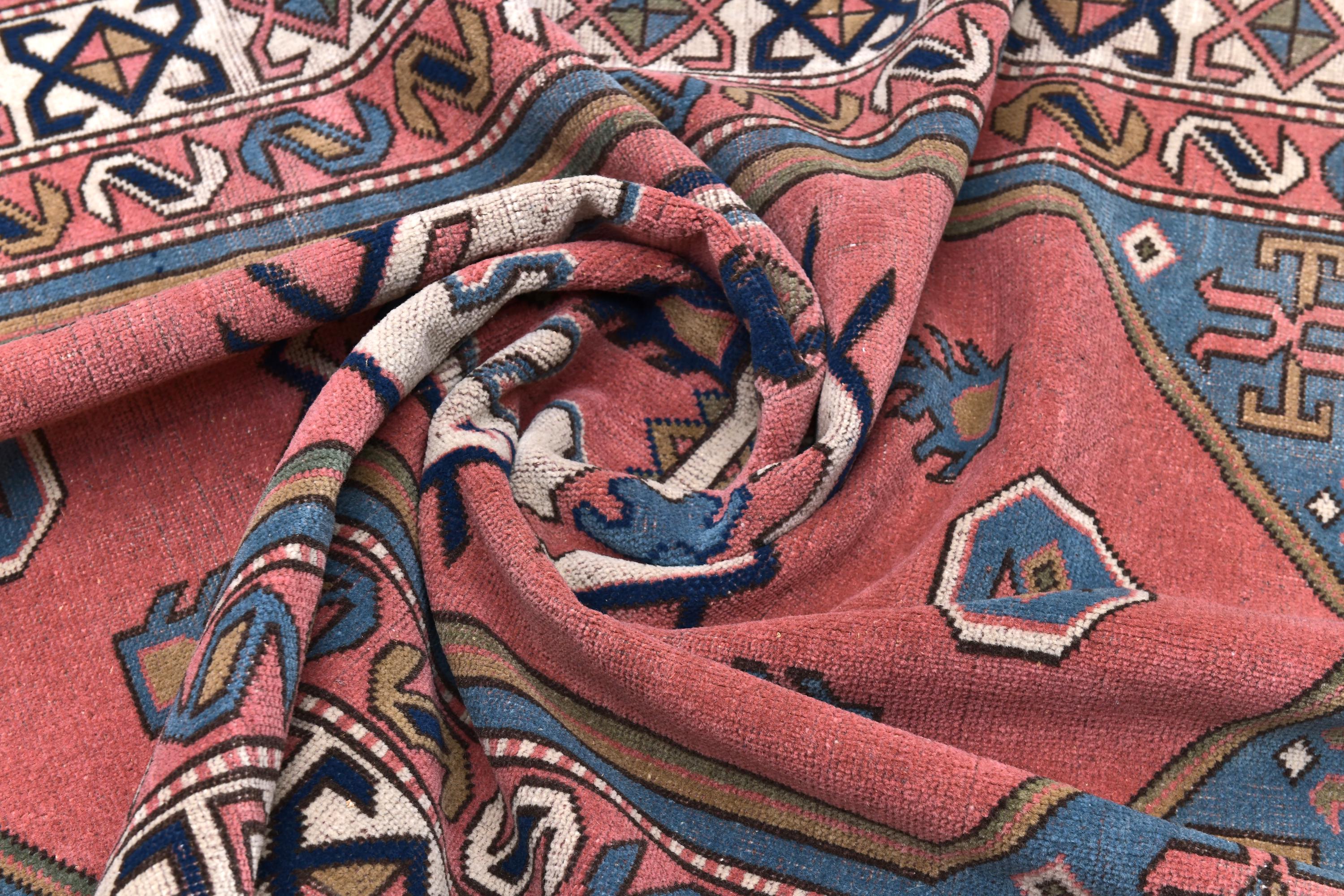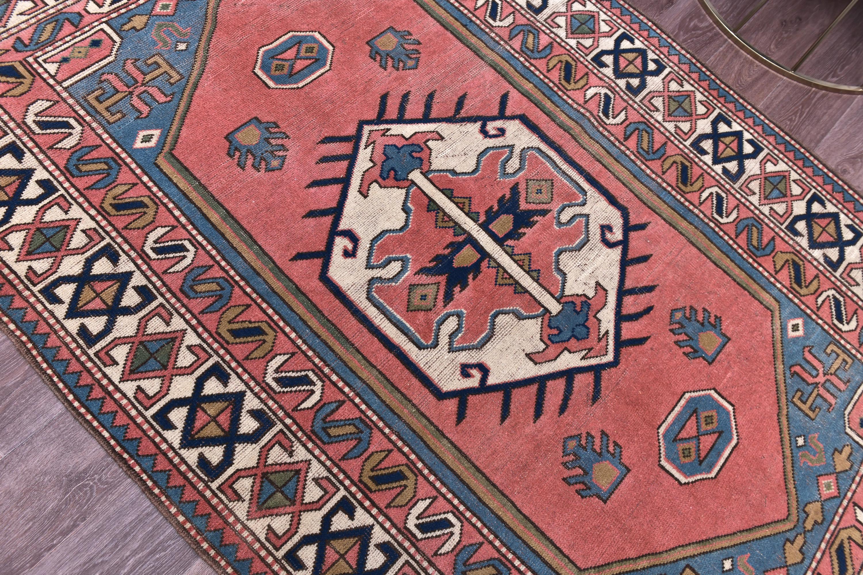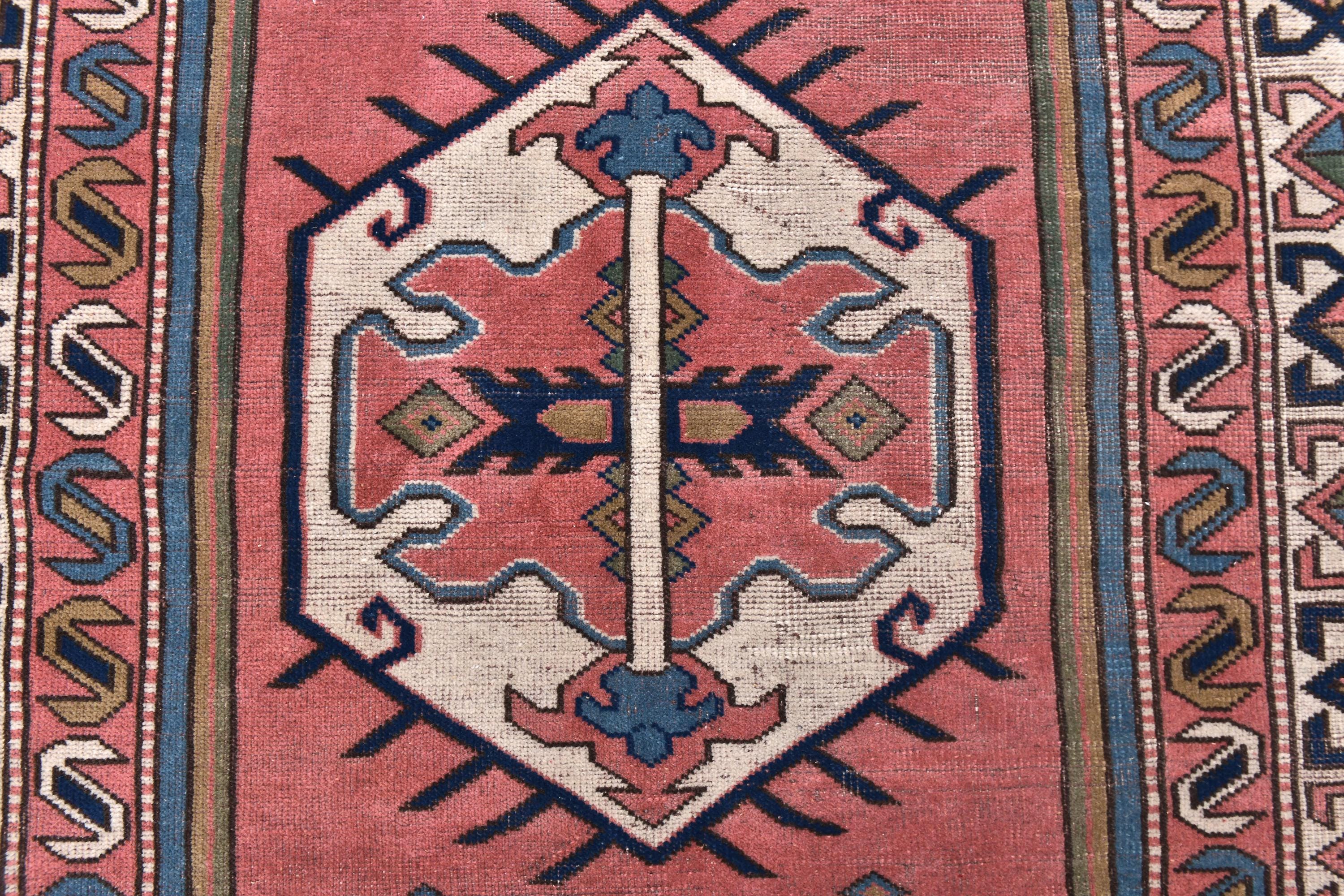 📜📌 Vintage hand-knotted wool area rug featuring a coral pink field with geometric hexagonal medallion in cream and navy blue. The rug displays traditional Caucasian tribal patterns with serrated edges, stylized floral motifs, and intricate border designs in blue, cream, navy, and terracotta colors. The geometric design showcases authentic hand-woven craftsmanship with visible wool texture.