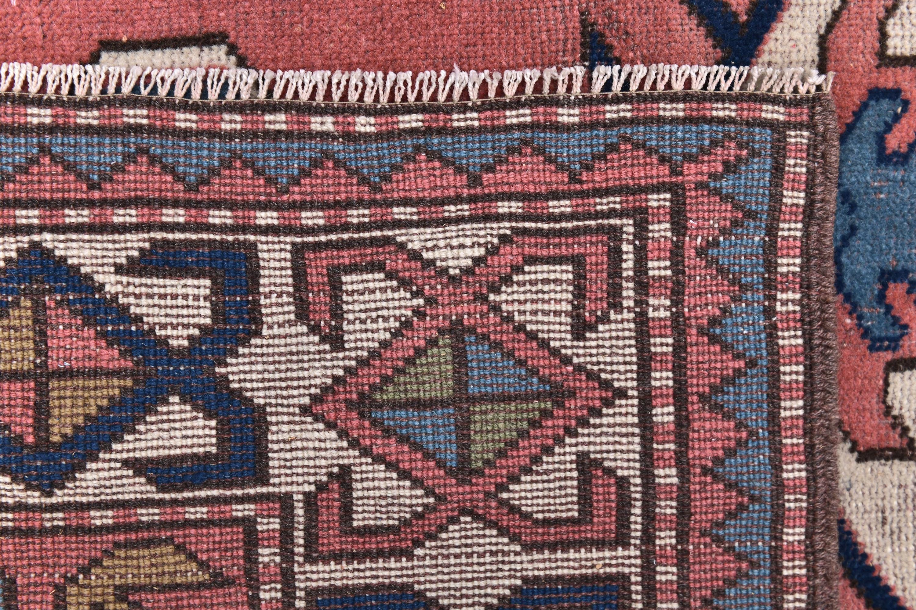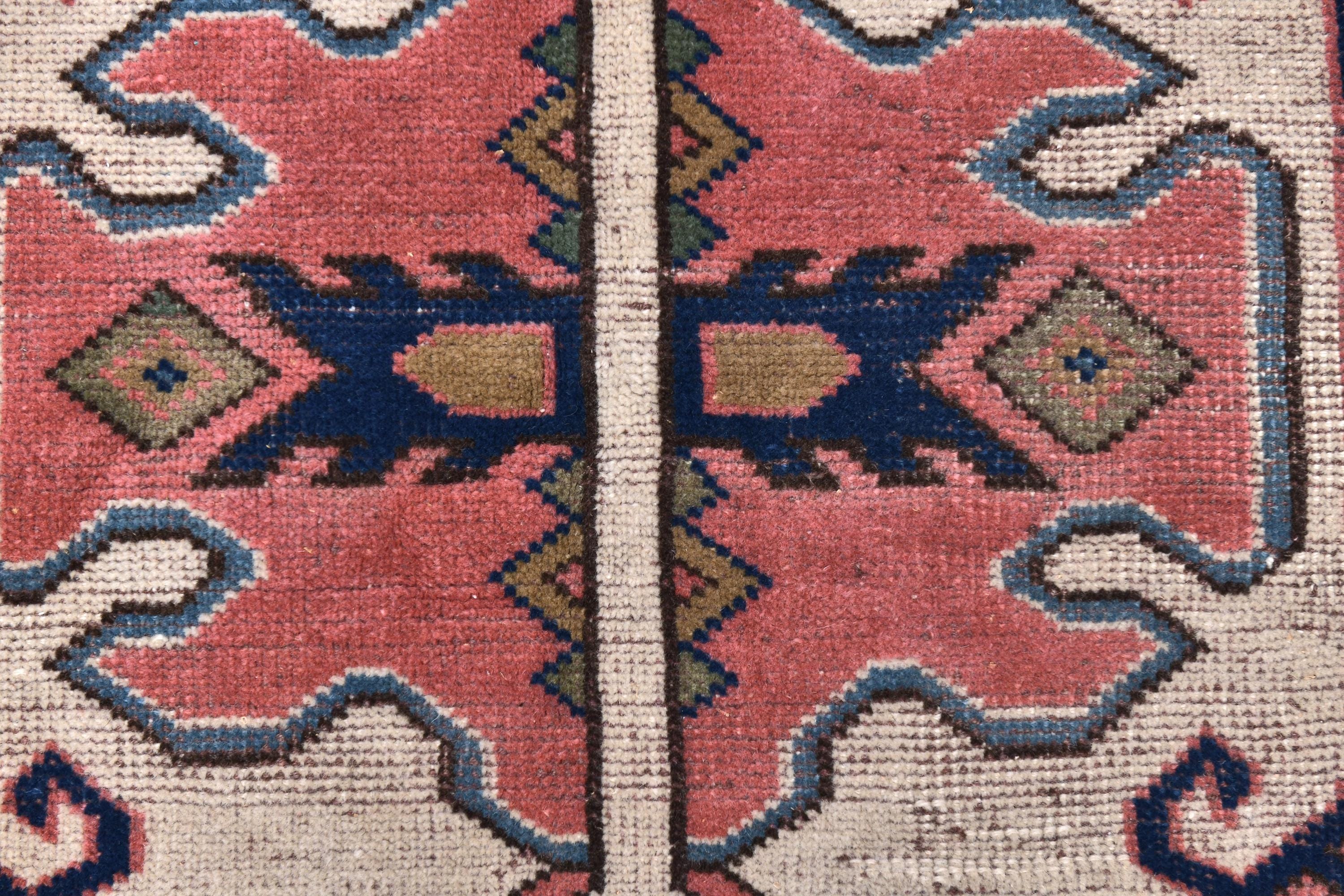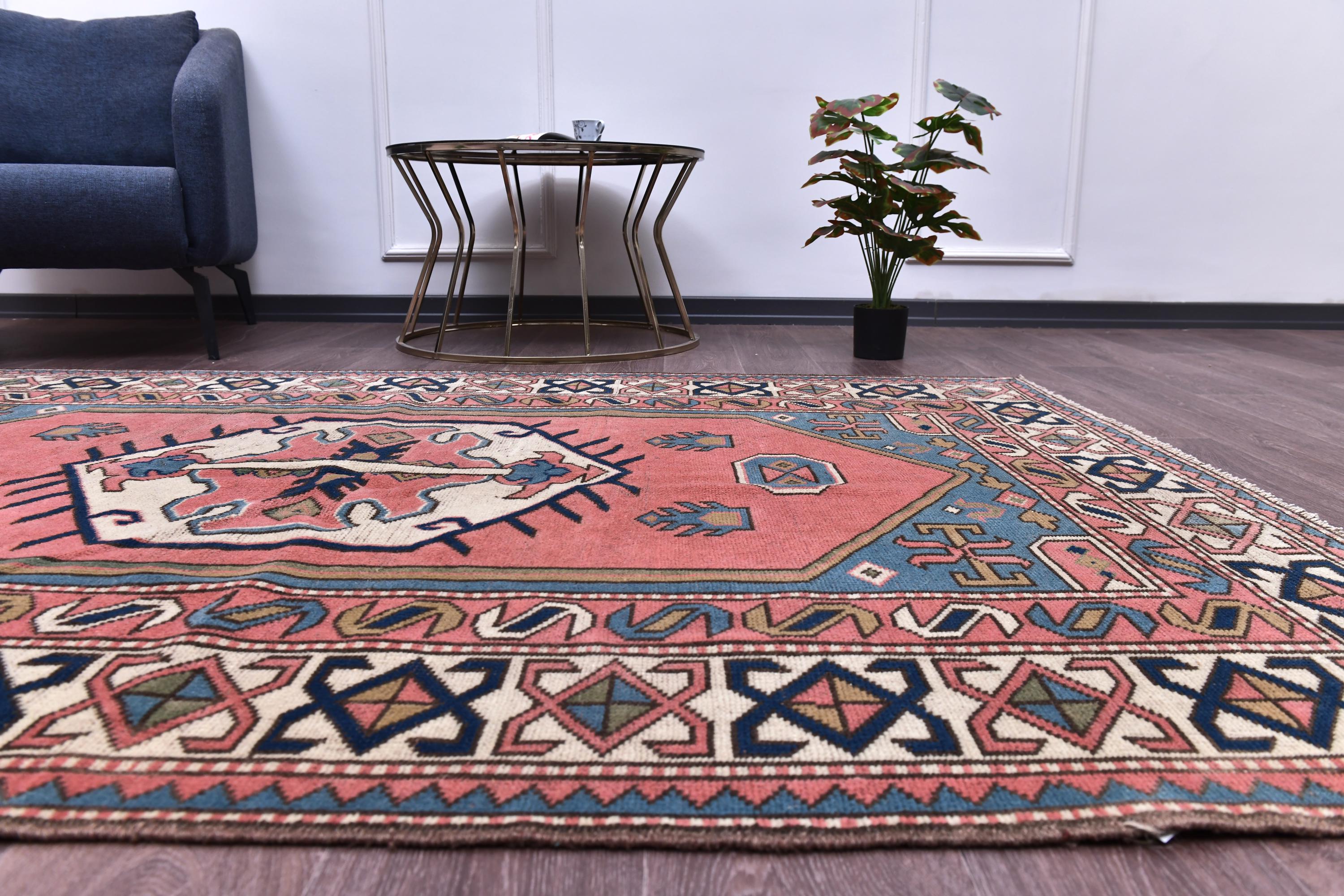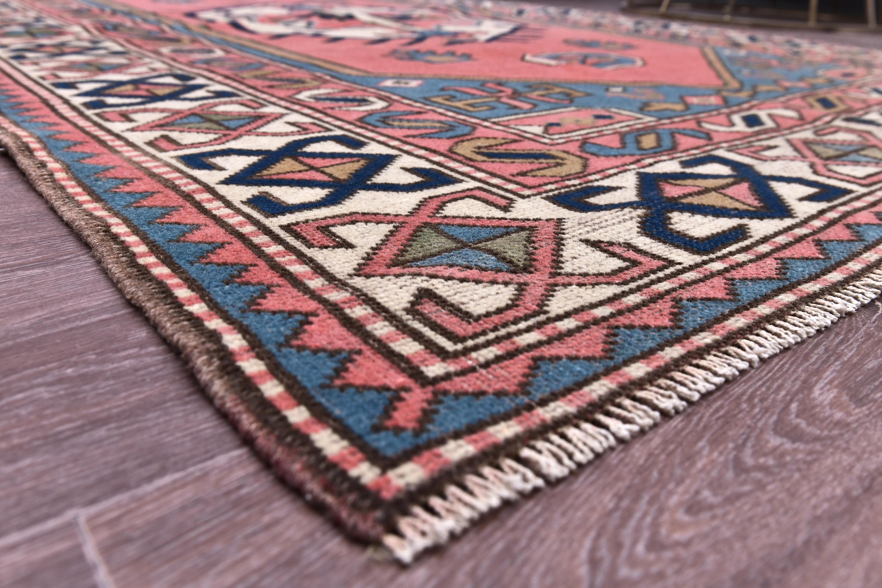 📜📌 Vintage hand-knotted wool area rug featuring a coral pink field with geometric hexagonal medallion in cream and navy blue. The rug displays traditional Caucasian tribal patterns with serrated edges, stylized floral motifs, and intricate border designs in blue, cream, navy, and terracotta colors. The geometric design showcases authentic hand-woven craftsmanship with visible wool texture.