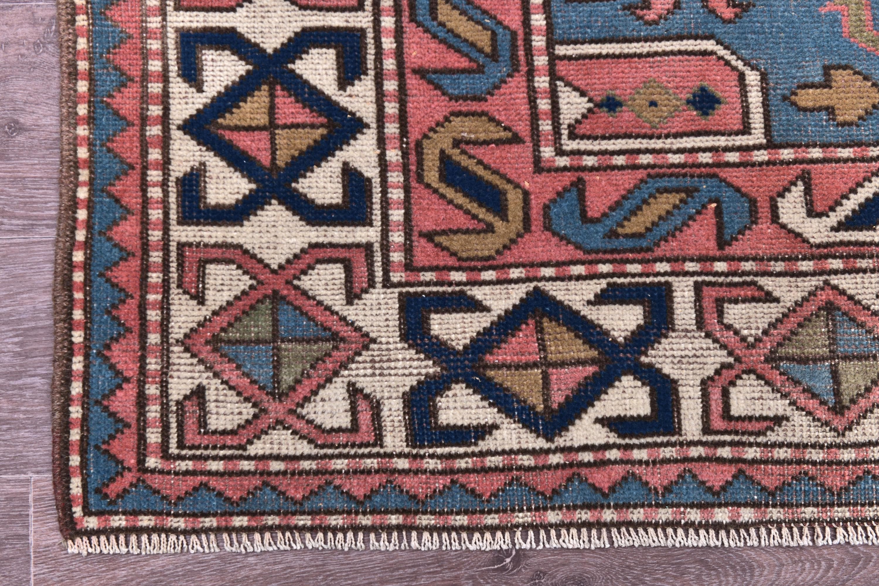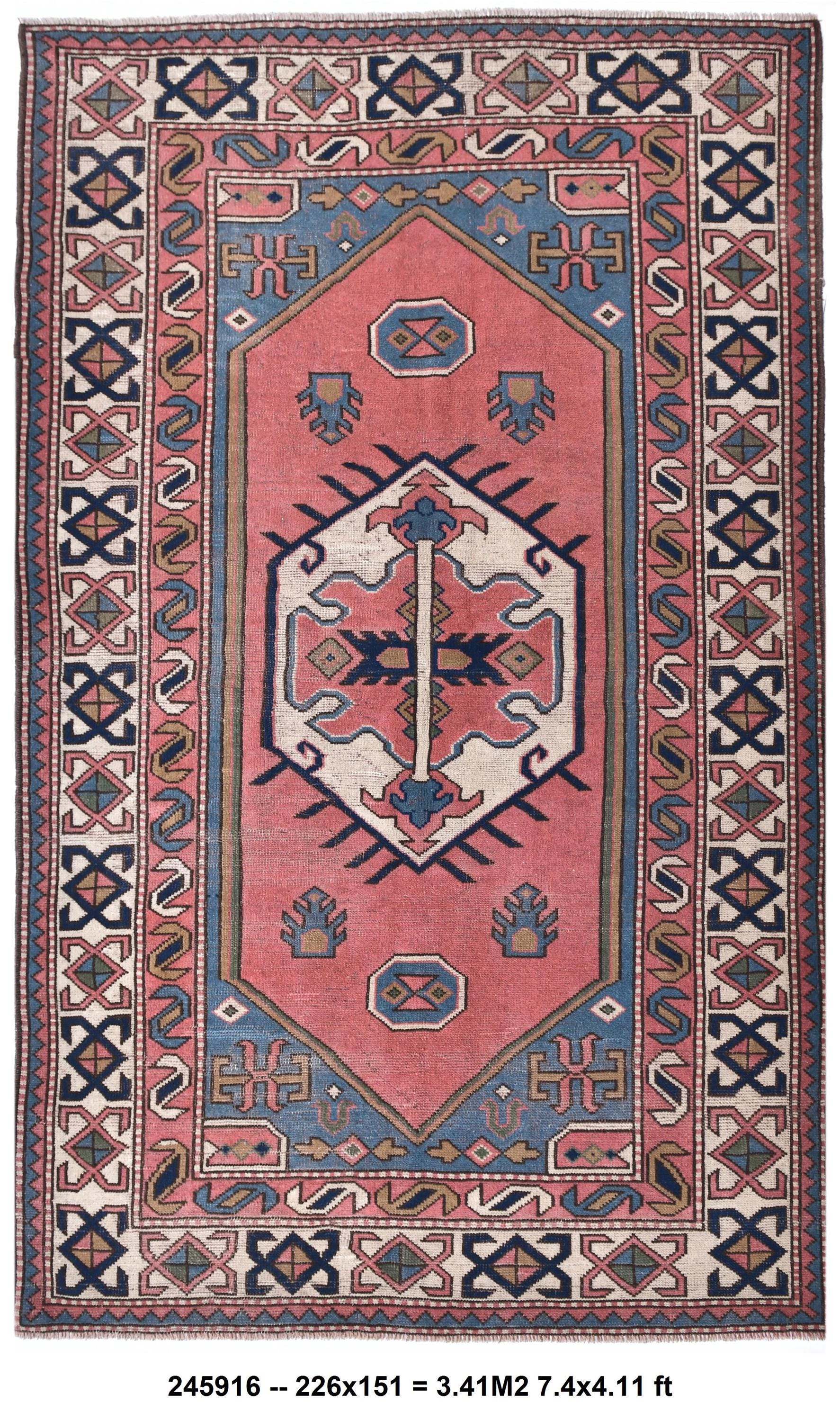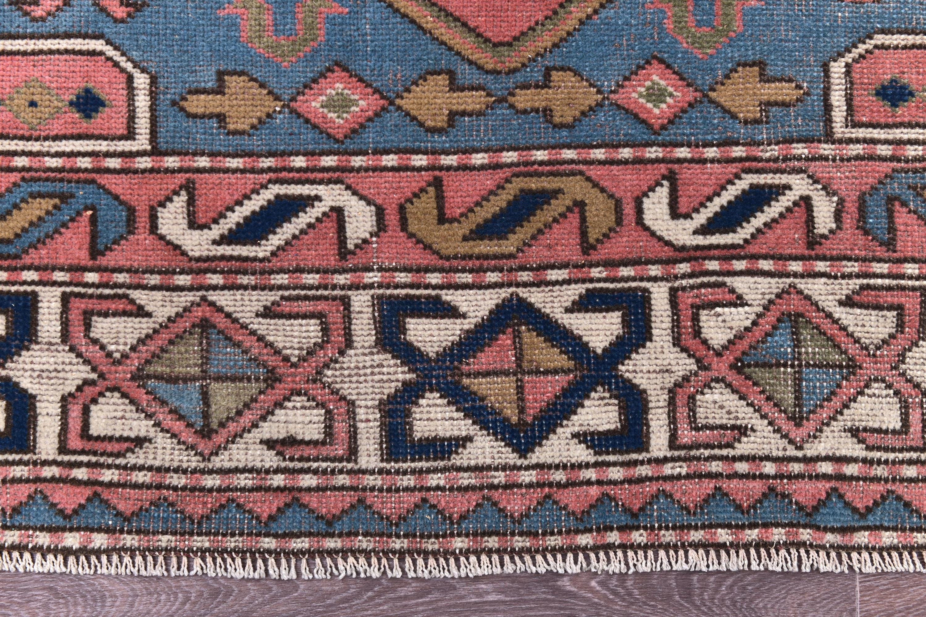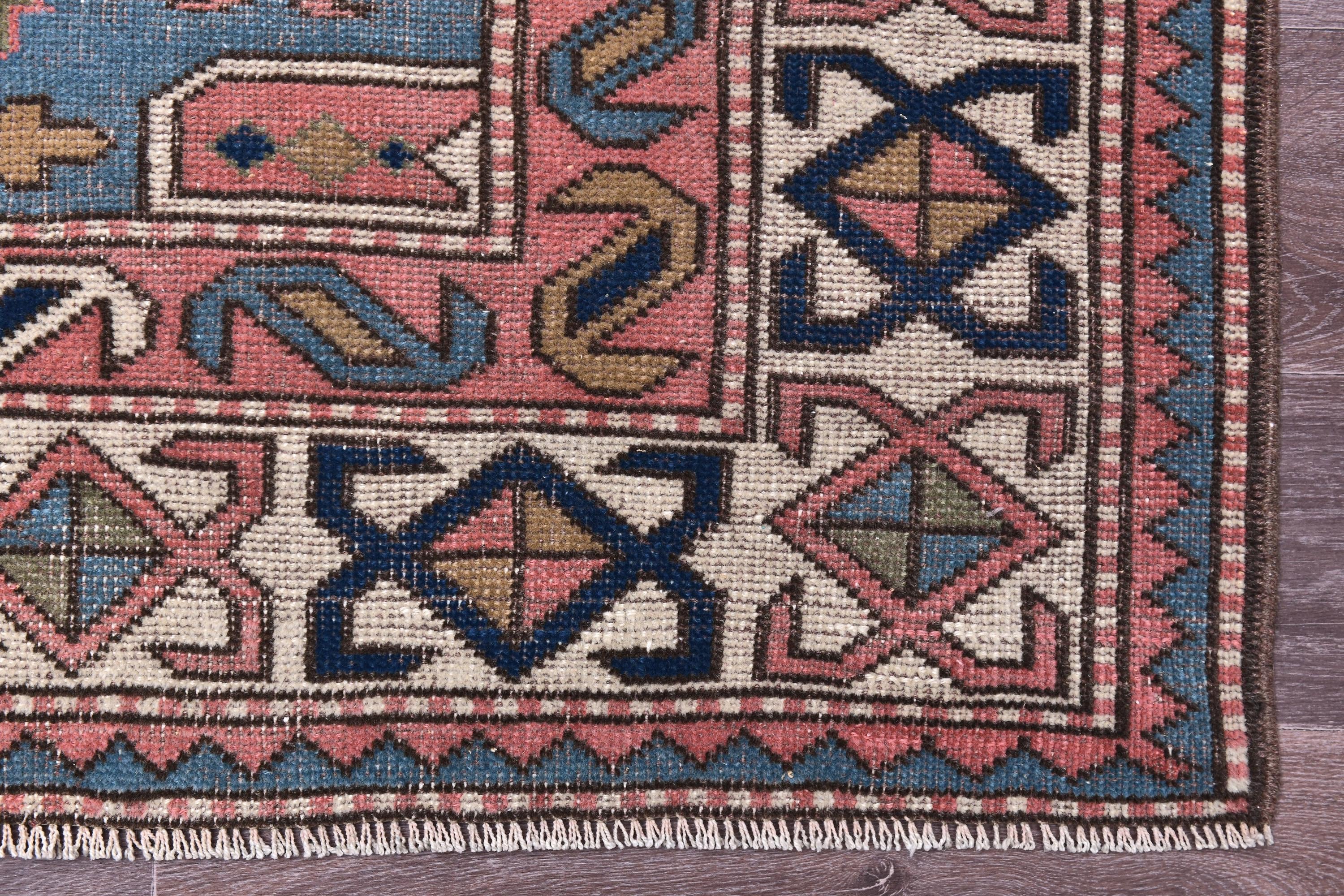 📜📌 Vintage hand-knotted wool area rug featuring a coral pink field with geometric hexagonal medallion in cream and navy blue. The rug displays traditional Caucasian tribal patterns with serrated edges, stylized floral motifs, and intricate border designs in blue, cream, navy, and terracotta colors. The geometric design showcases authentic hand-woven craftsmanship with visible wool texture.