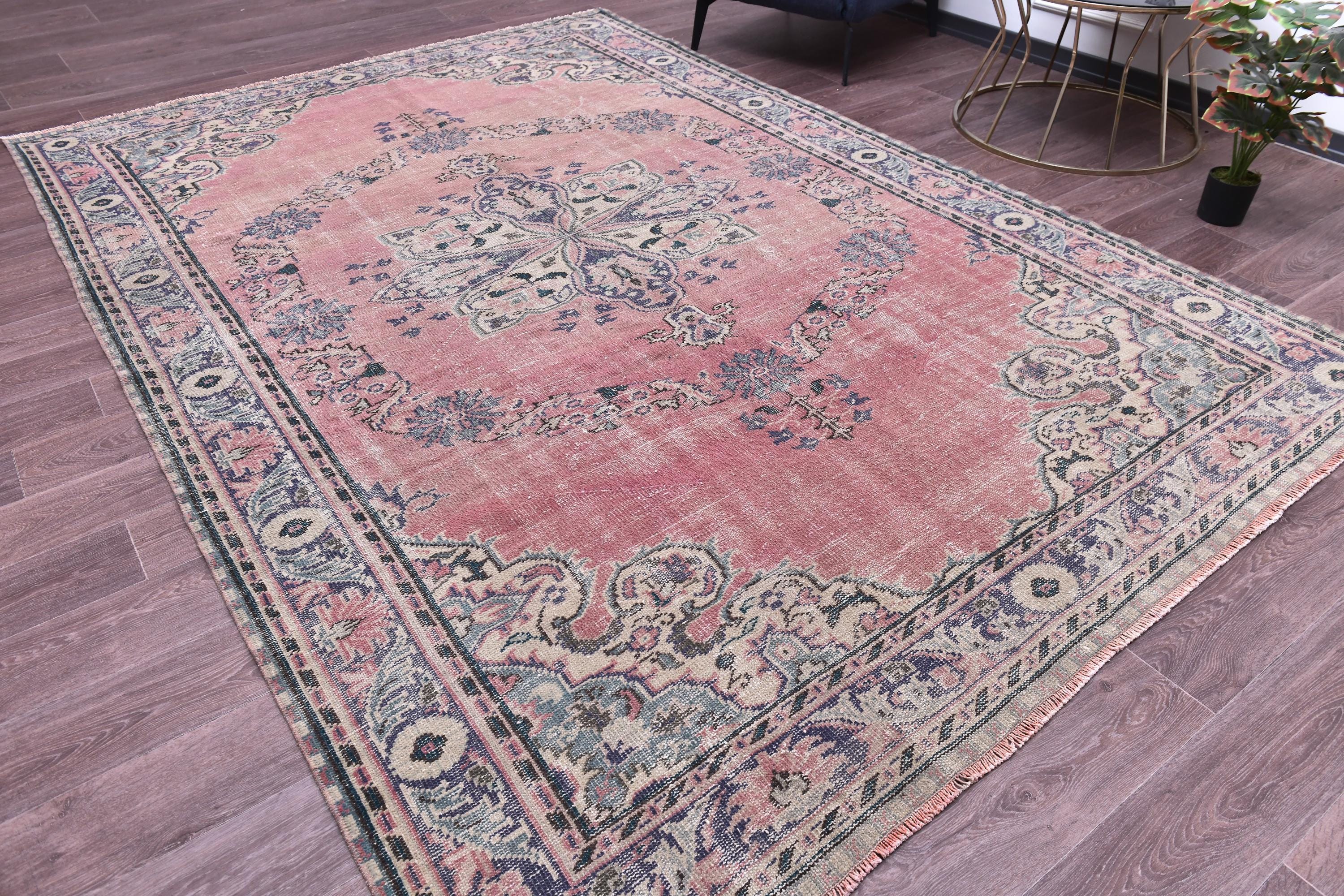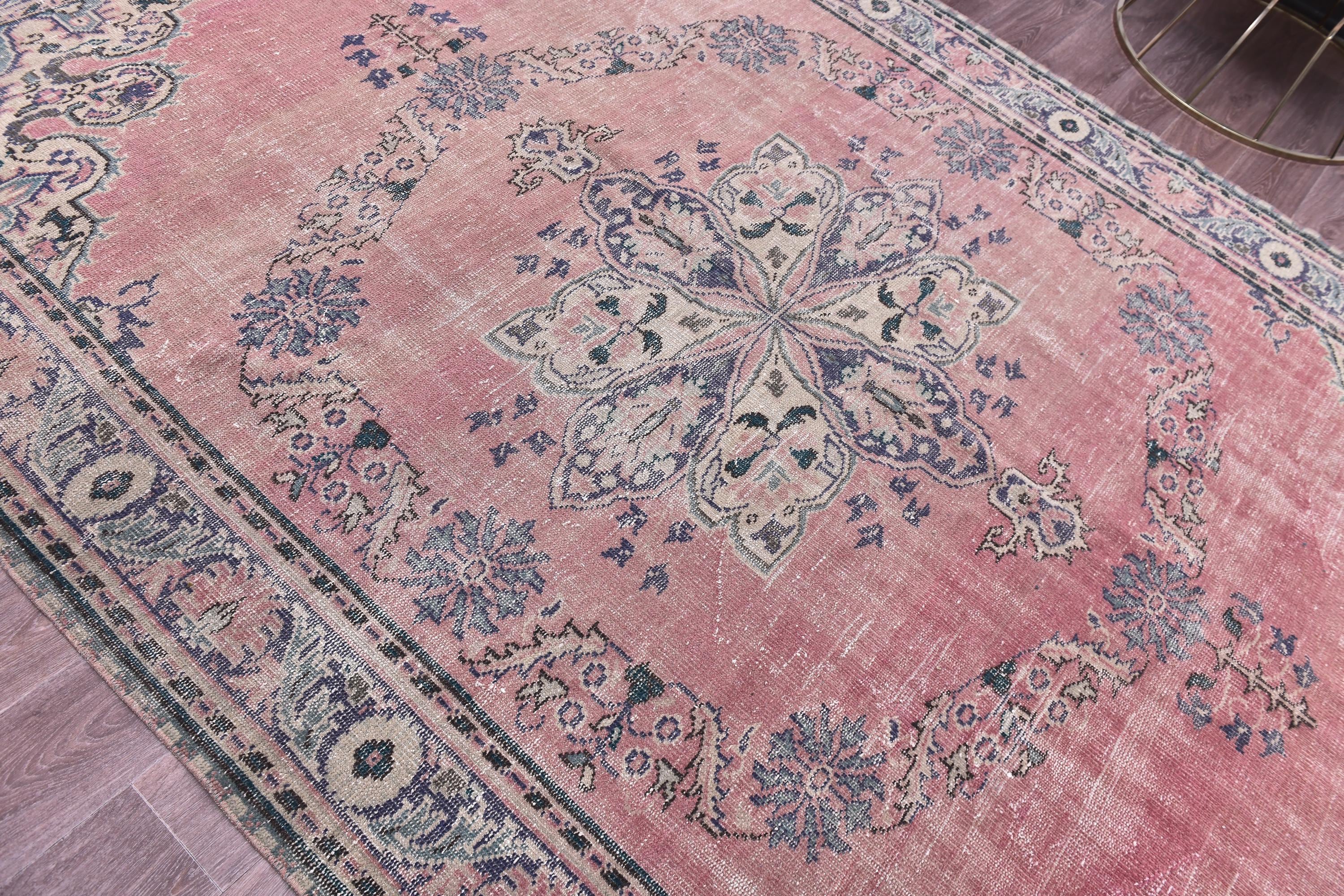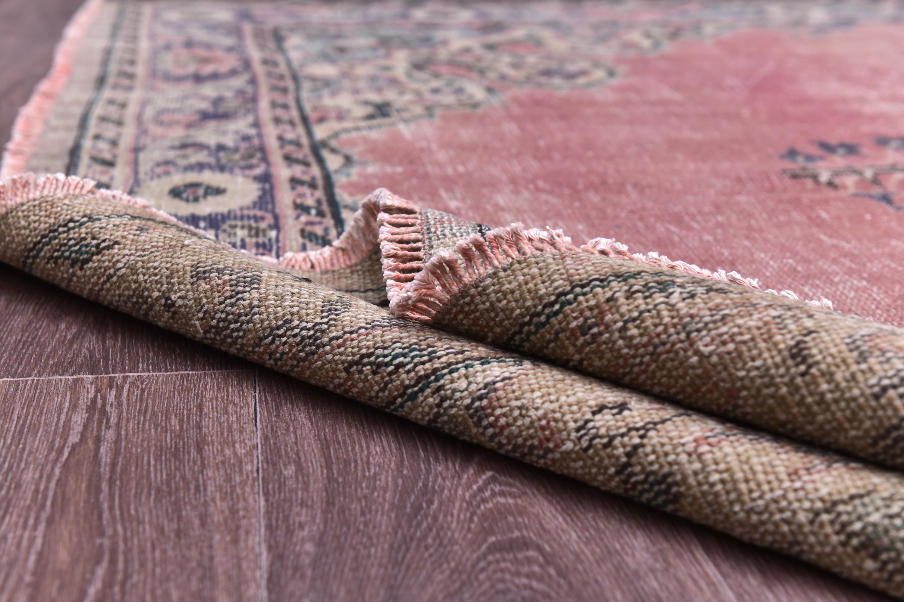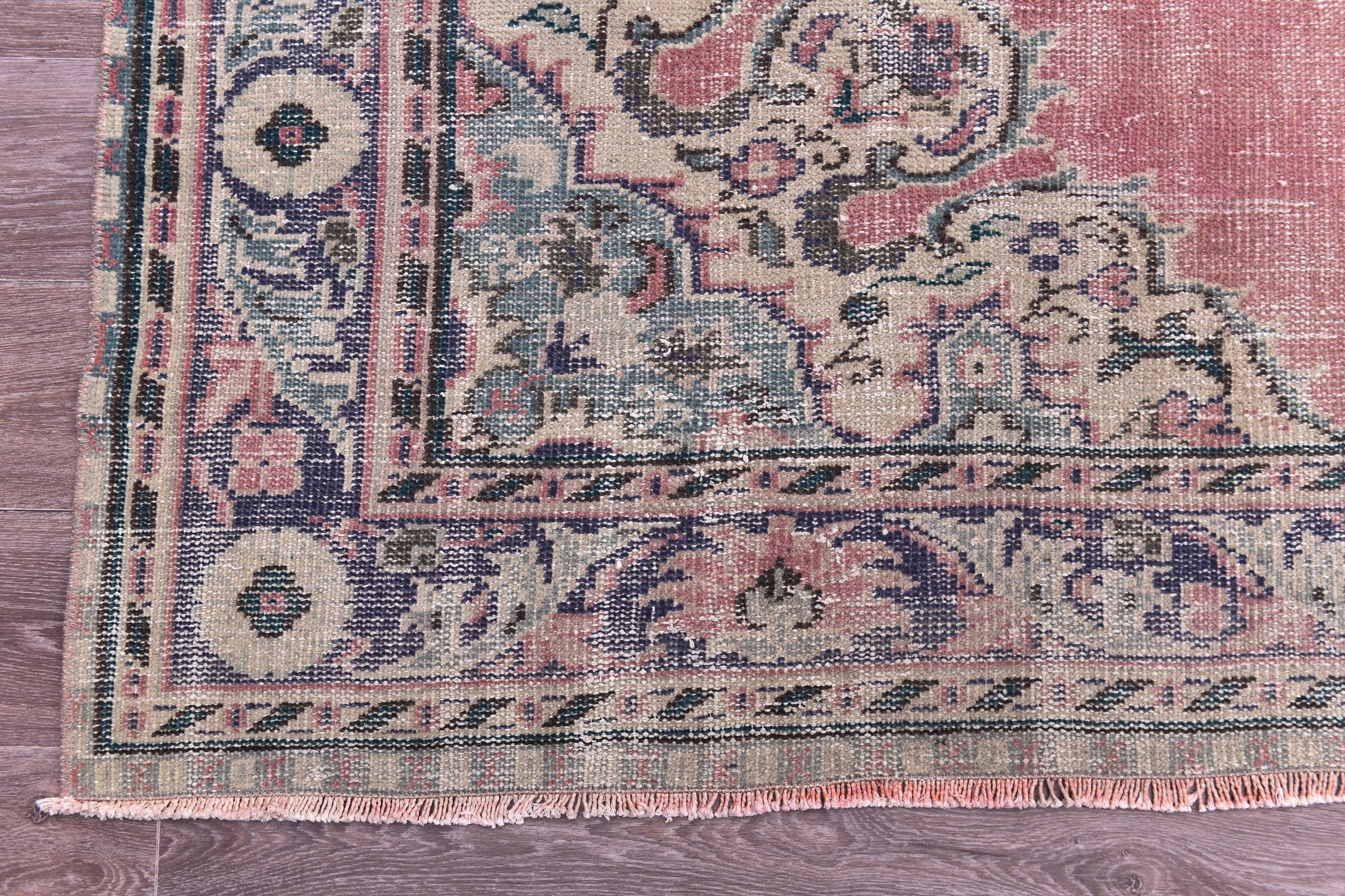 📜📌 Antique Turkish area rug with salmon pink background and traditional central medallion design in ivory and indigo blue. The hand-woven wool rug features classical Oushak style with delicate floral motifs, scrolling vines in the border, and corner medallions. Distressed finish shows desirable vintage fading, color variations, and worn patina characteristic of authentic antique Turkish carpets displayed on hardwood floor.