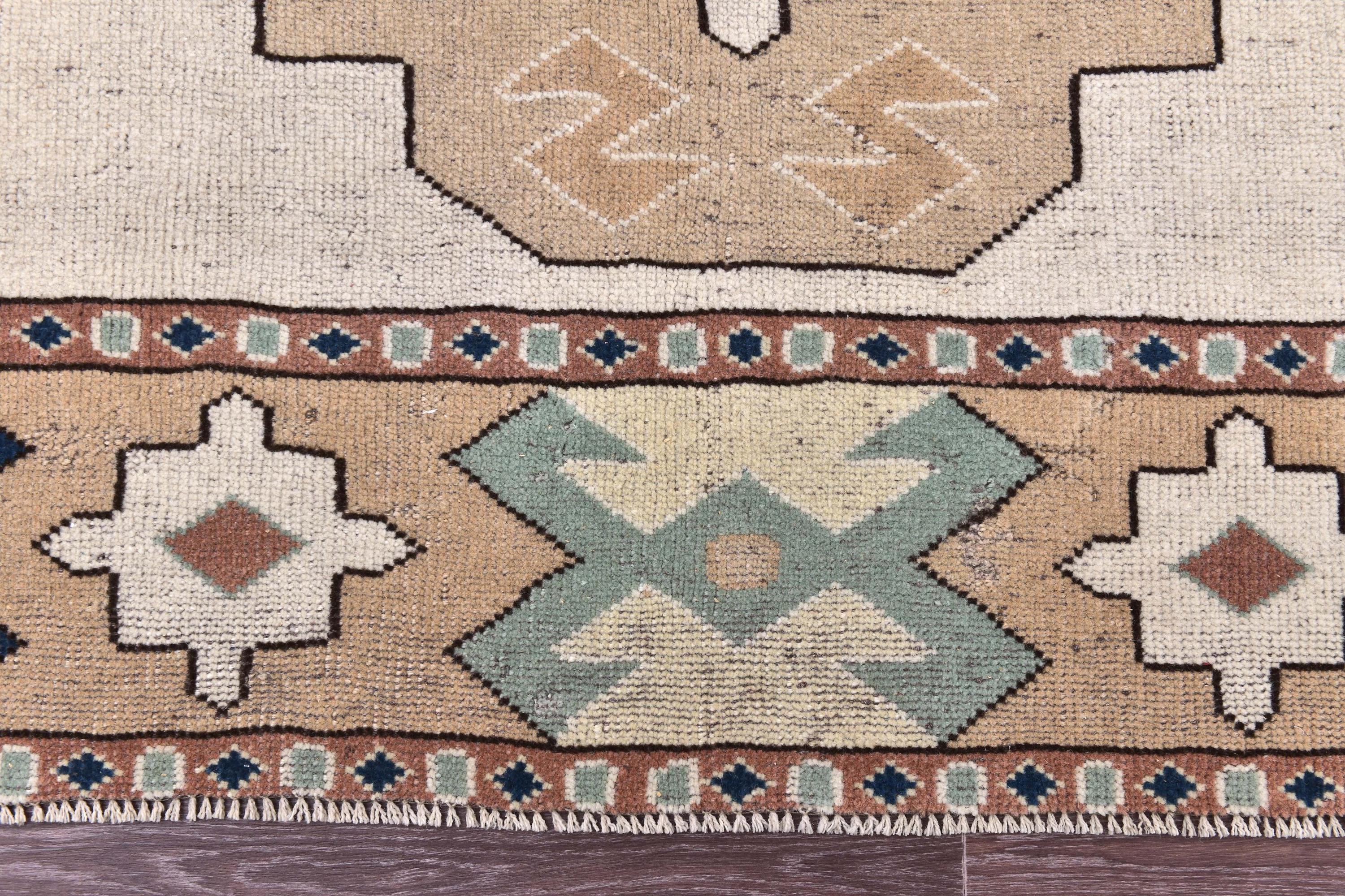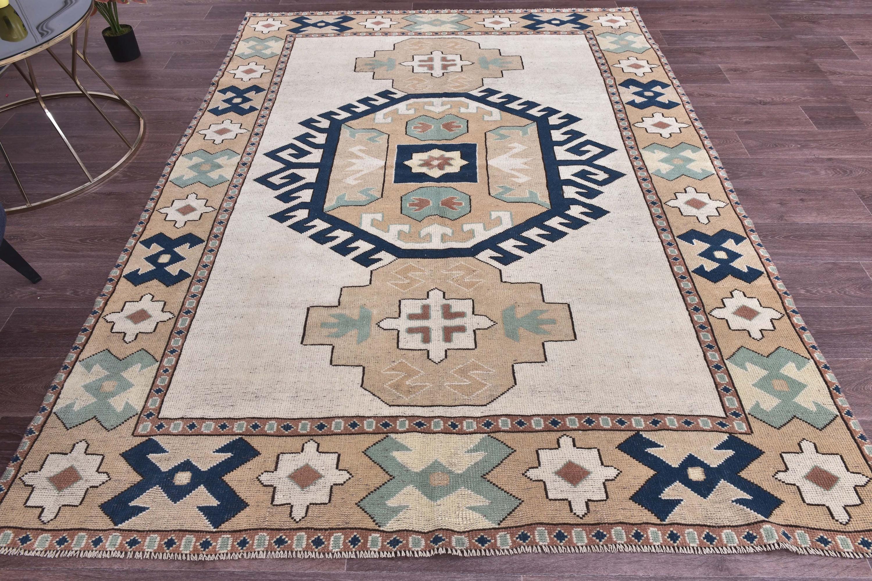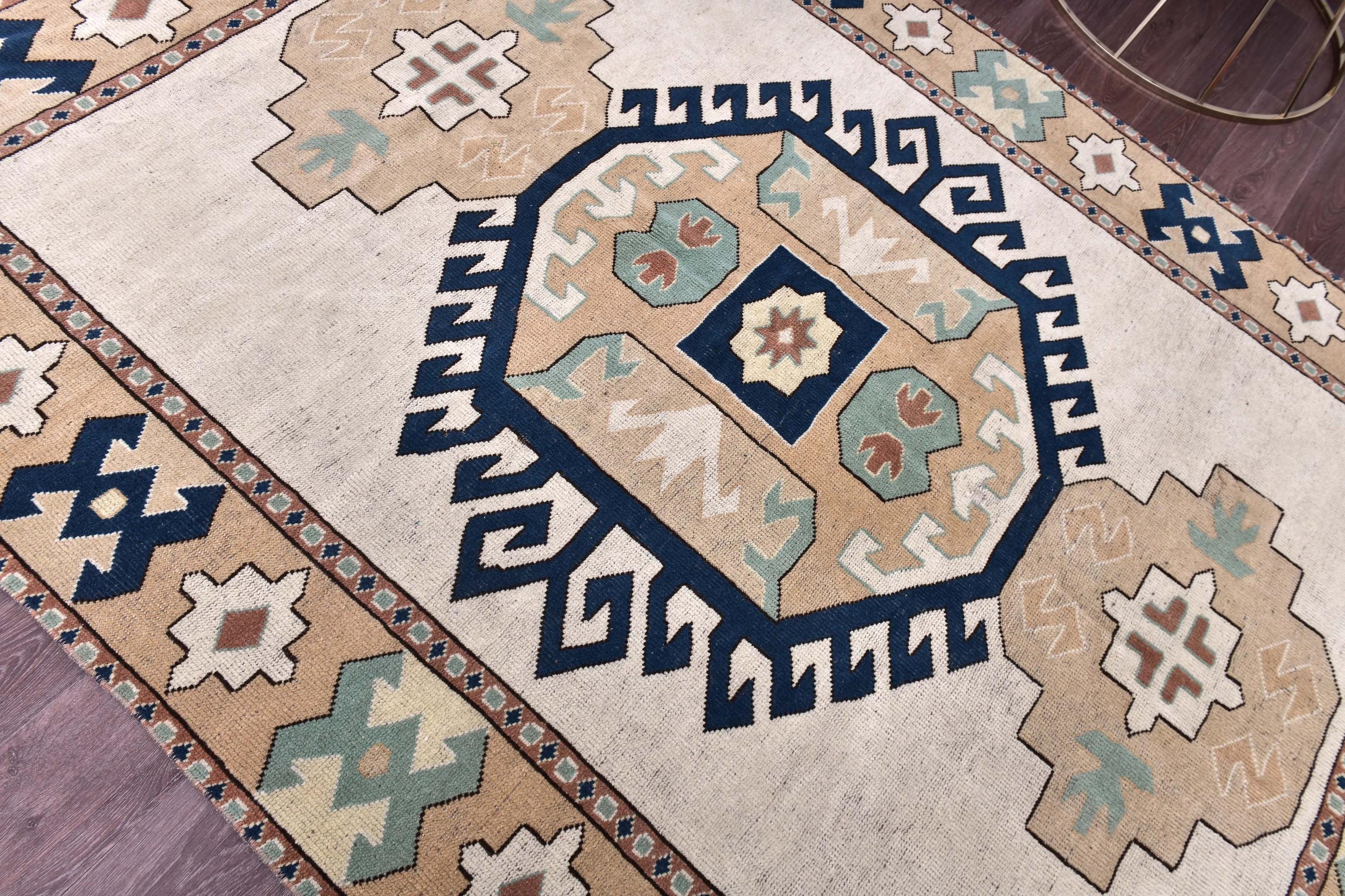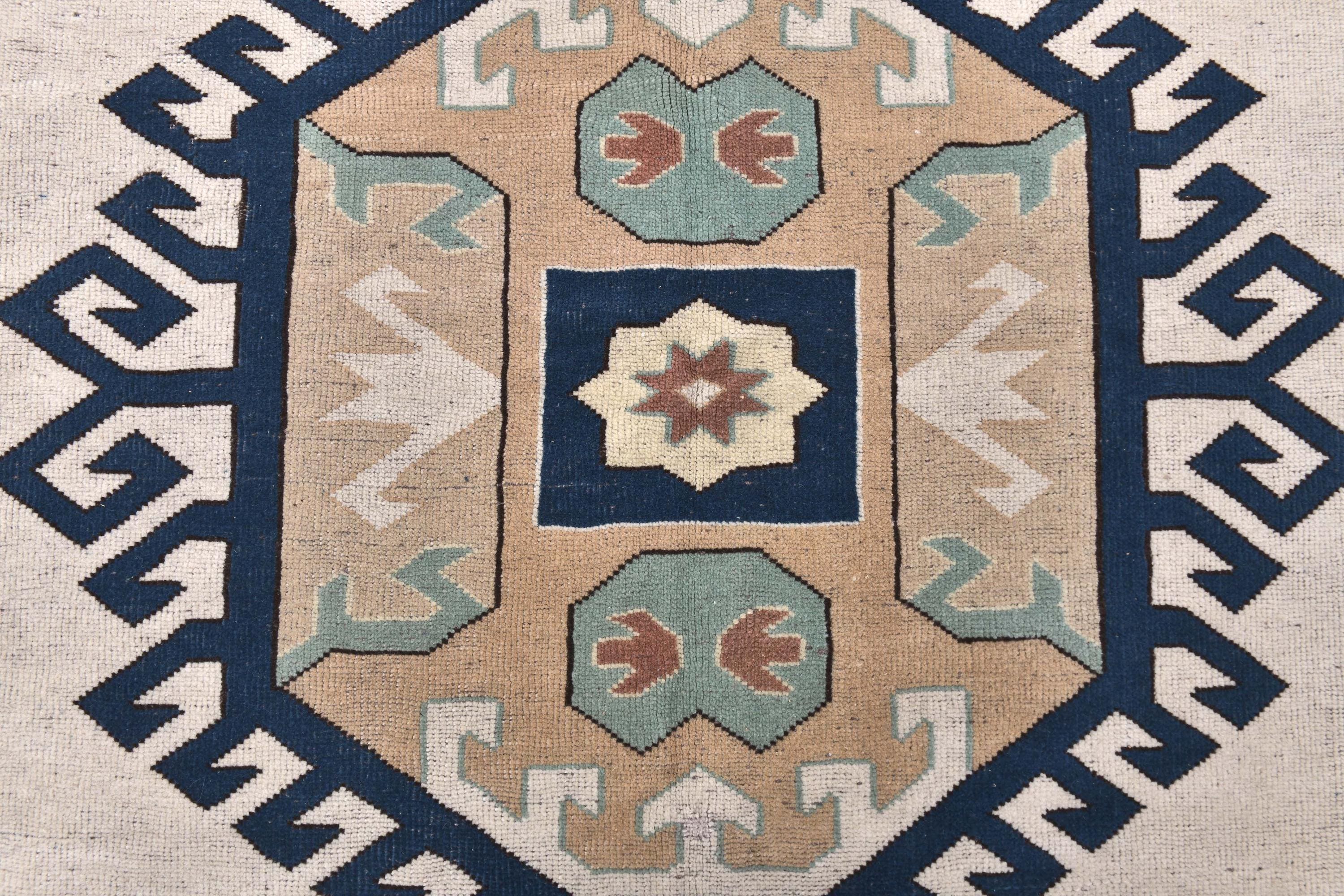 📜📌Vintage hand-knotted Turkish wool area rug featuring a cream ivory field with a bold navy blue octagonal medallion surrounded by serrated edges. The geometric rug displays tribal corner motifs in sage green, tan, and rust colors with stylized crosses and hexagonal patterns. Wide camel-colored border showcases traditional Anatolian designs with navy geometric symbols and floral medallions in aqua, white, and terracotta tones.