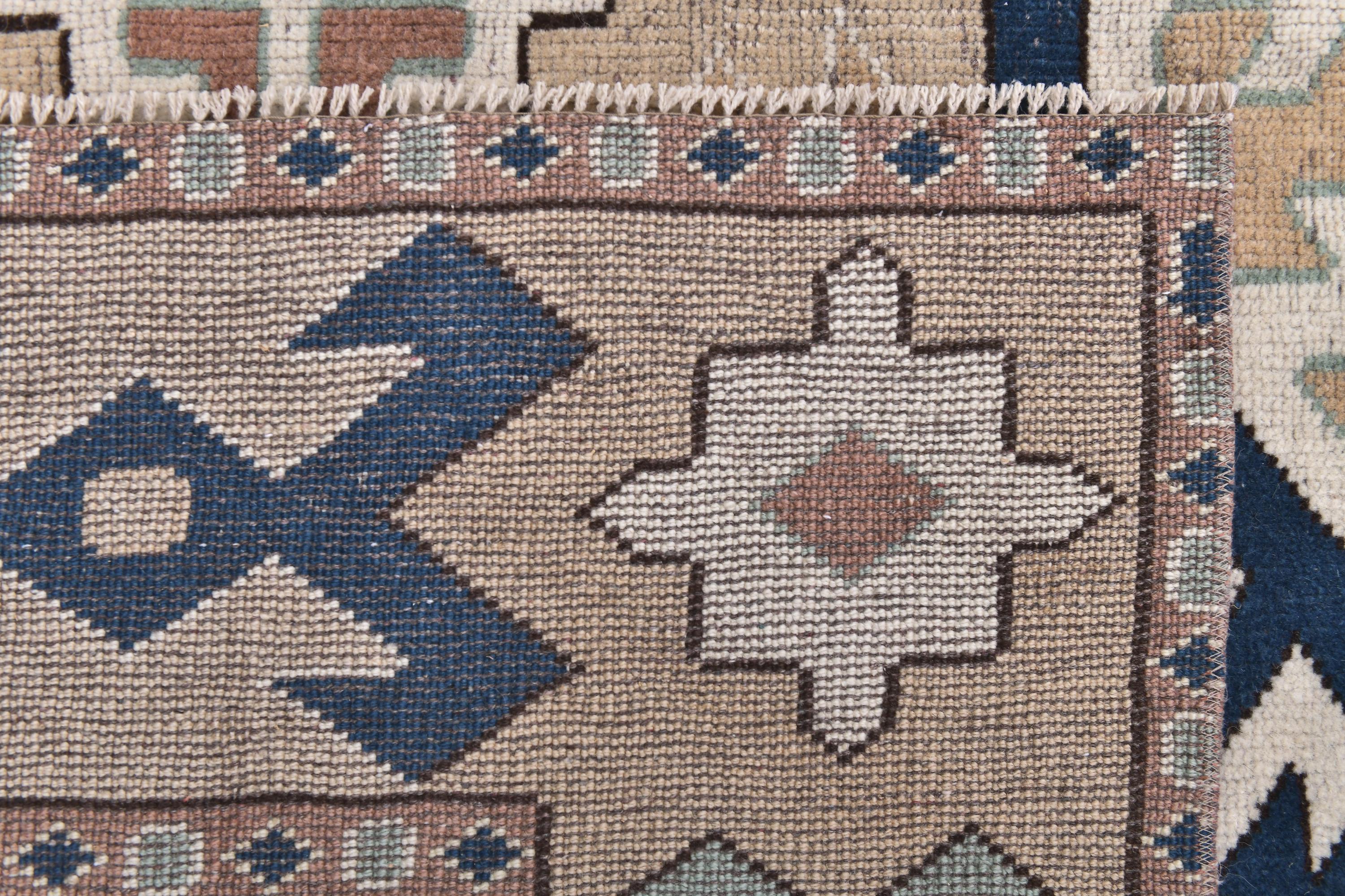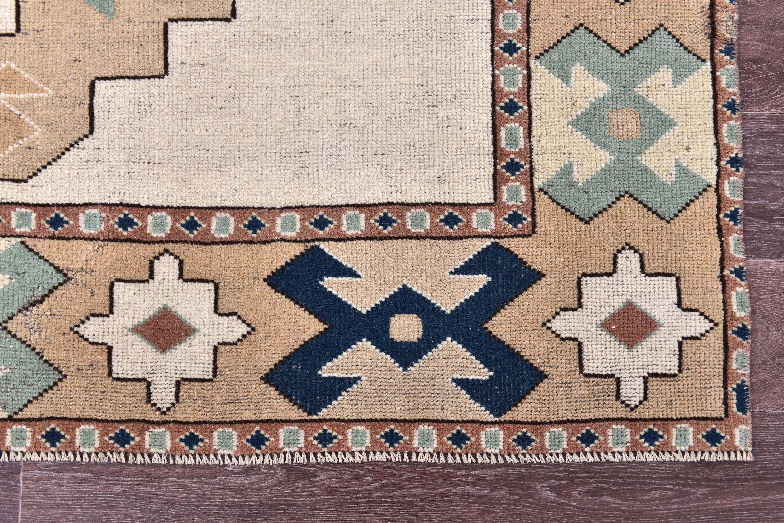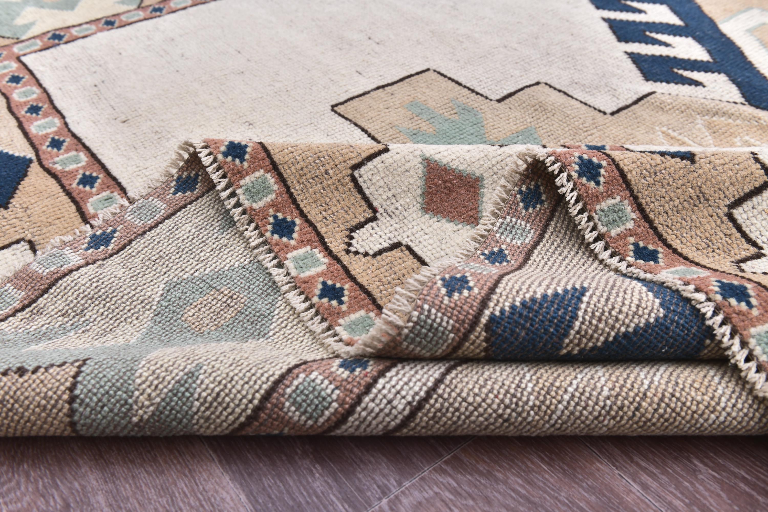 📜📌Vintage hand-knotted Turkish wool area rug featuring a cream ivory field with a bold navy blue octagonal medallion surrounded by serrated edges. The geometric rug displays tribal corner motifs in sage green, tan, and rust colors with stylized crosses and hexagonal patterns. Wide camel-colored border showcases traditional Anatolian designs with navy geometric symbols and floral medallions in aqua, white, and terracotta tones.