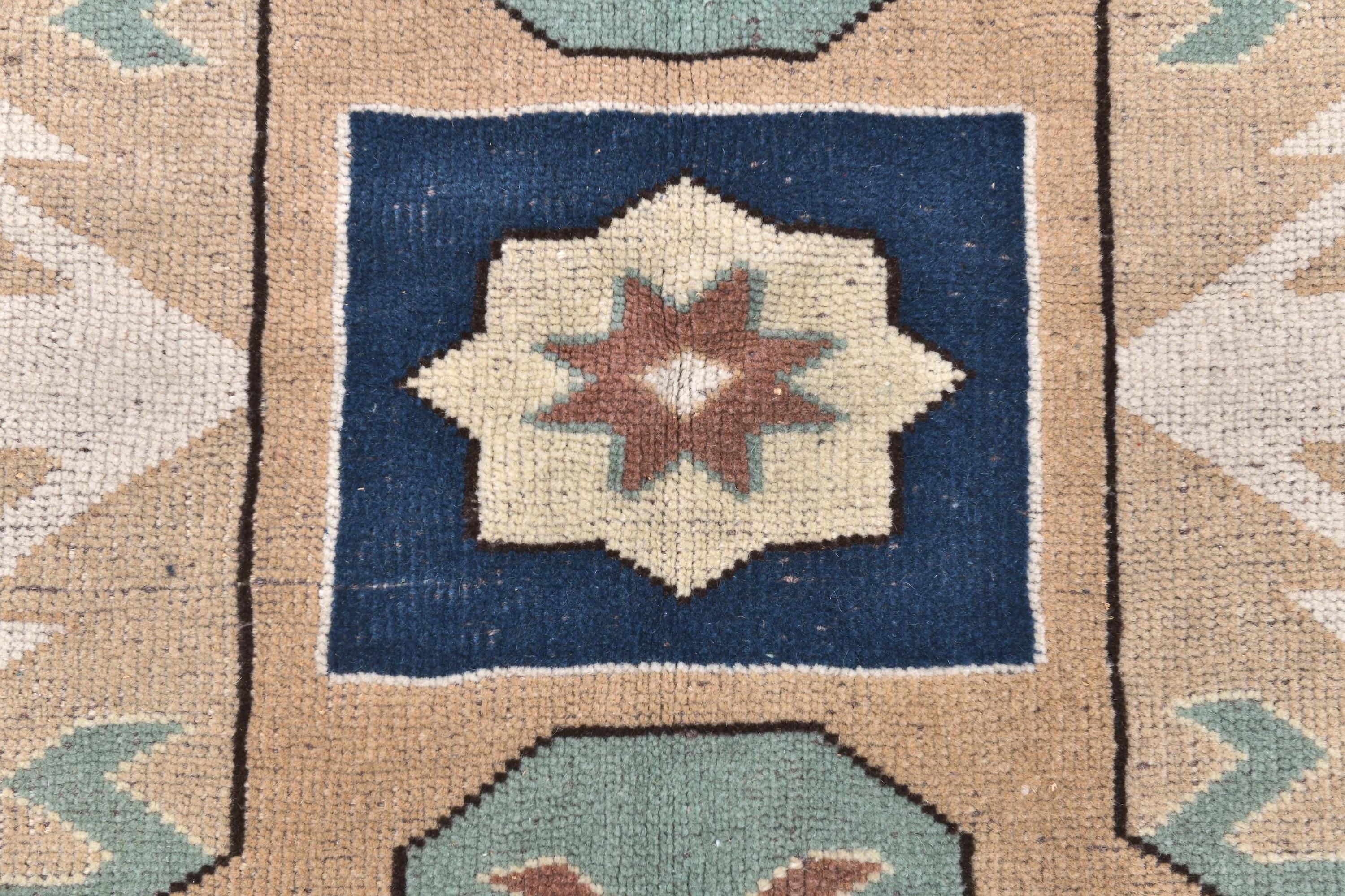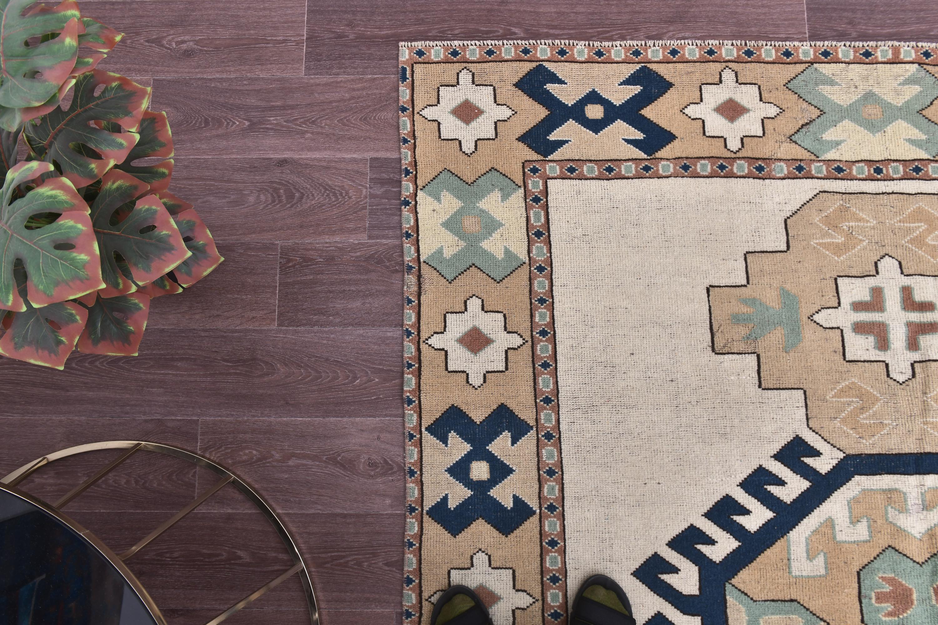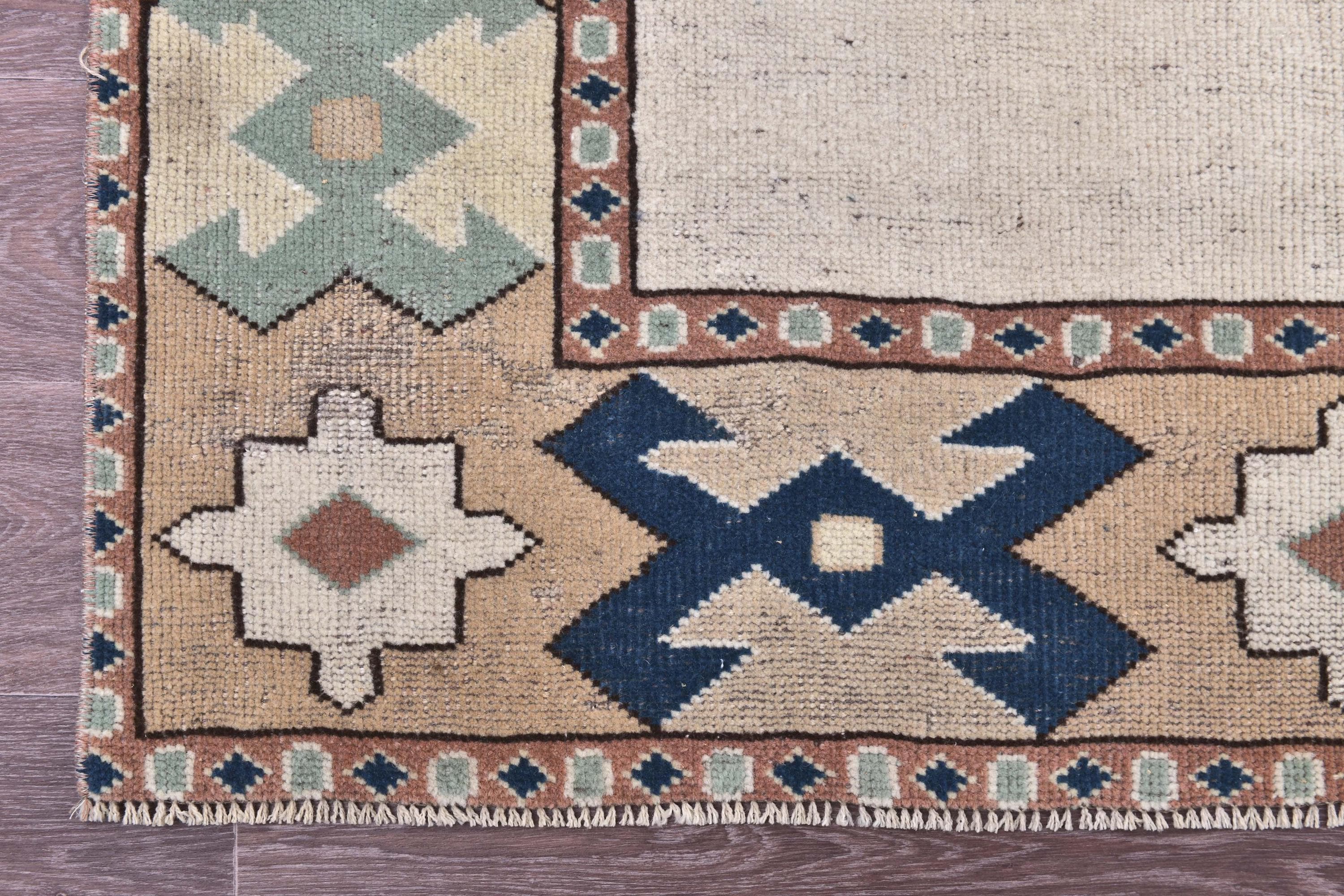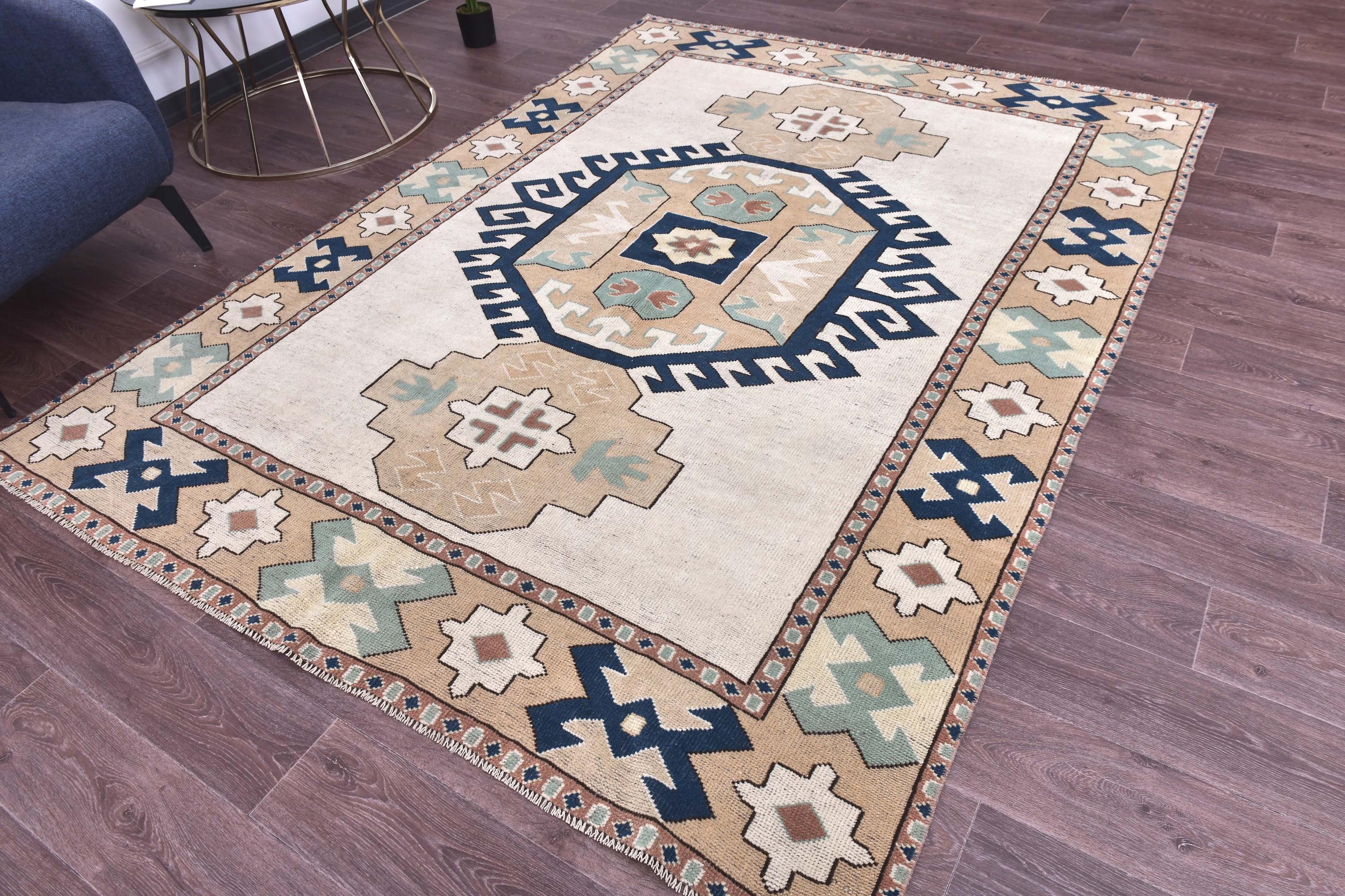 📜📌Vintage hand-knotted Turkish wool area rug featuring a cream ivory field with a bold navy blue octagonal medallion surrounded by serrated edges. The geometric rug displays tribal corner motifs in sage green, tan, and rust colors with stylized crosses and hexagonal patterns. Wide camel-colored border showcases traditional Anatolian designs with navy geometric symbols and floral medallions in aqua, white, and terracotta tones.