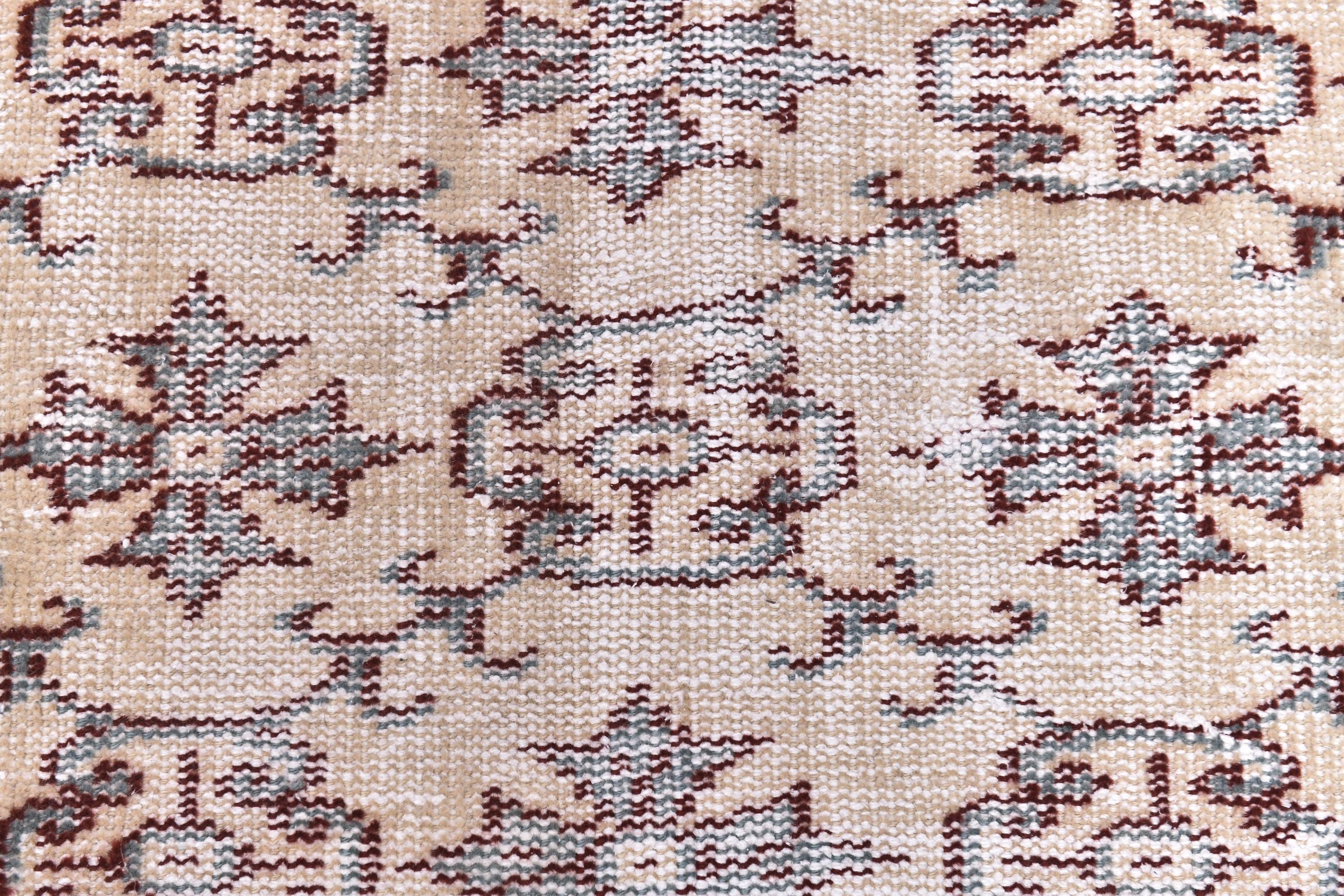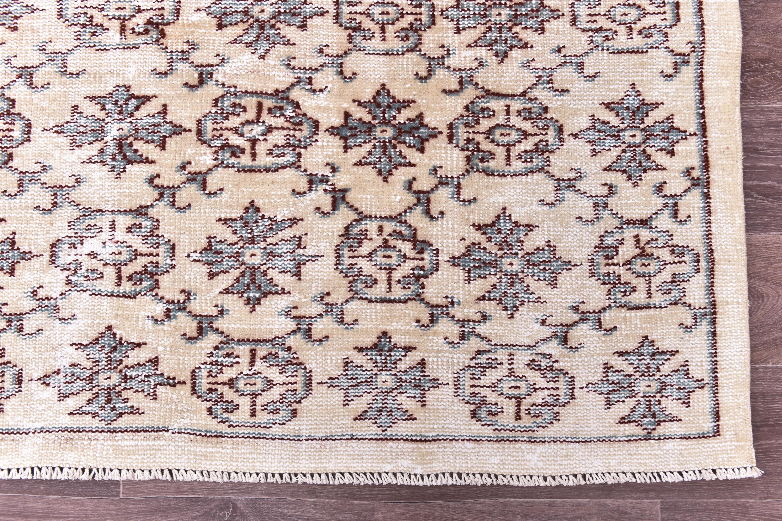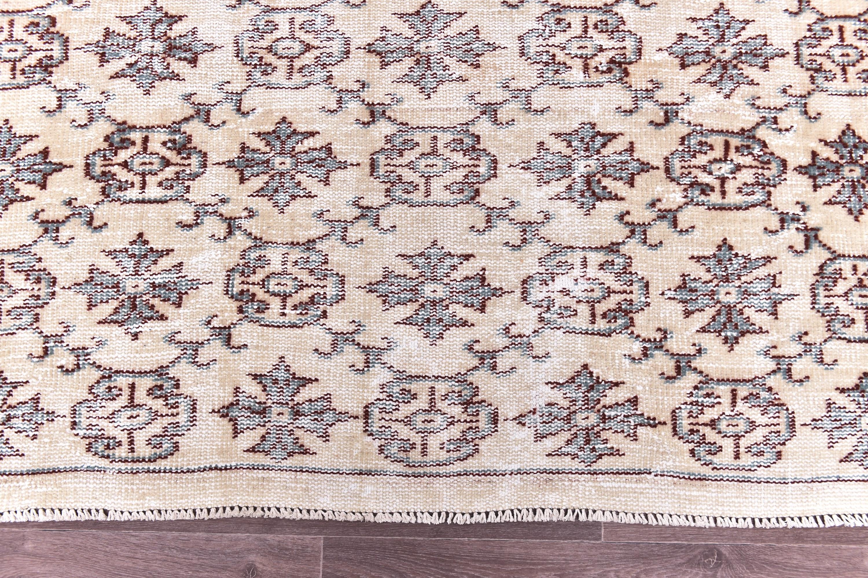 📜📌 Vintage hand-knotted Turkish area rug in muted beige and cream tones featuring an all-over repeating floral medallion pattern with soft brown and gray botanical motifs on distressed wool pile