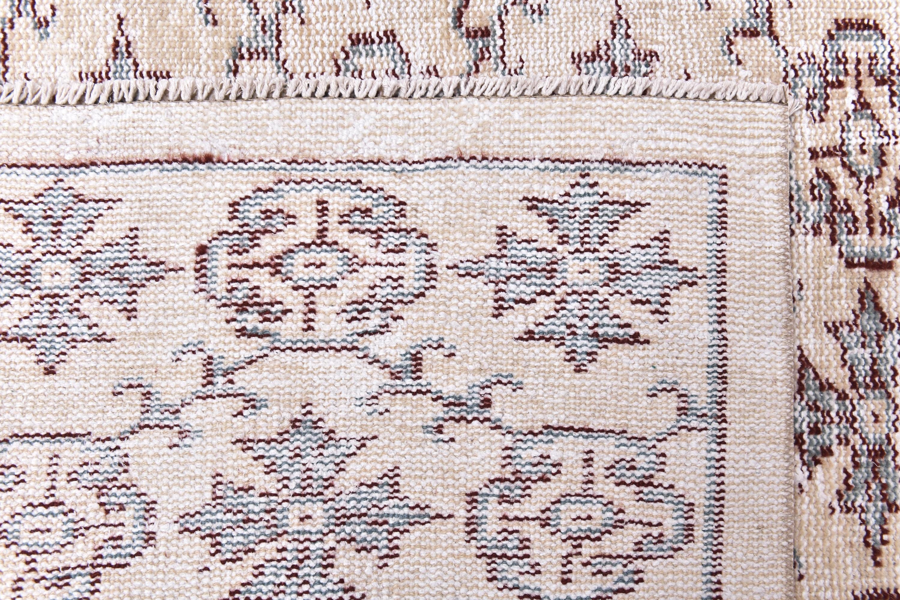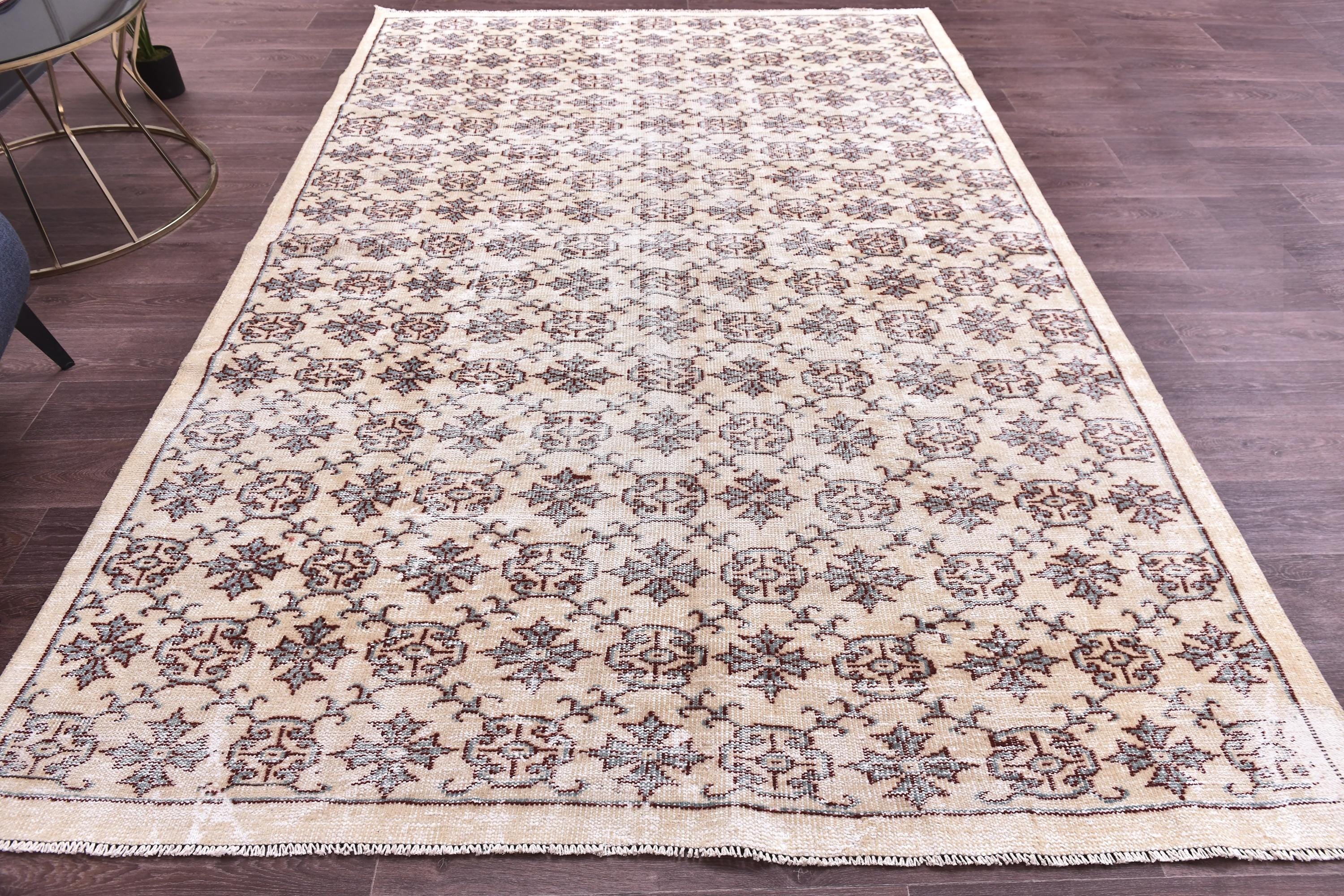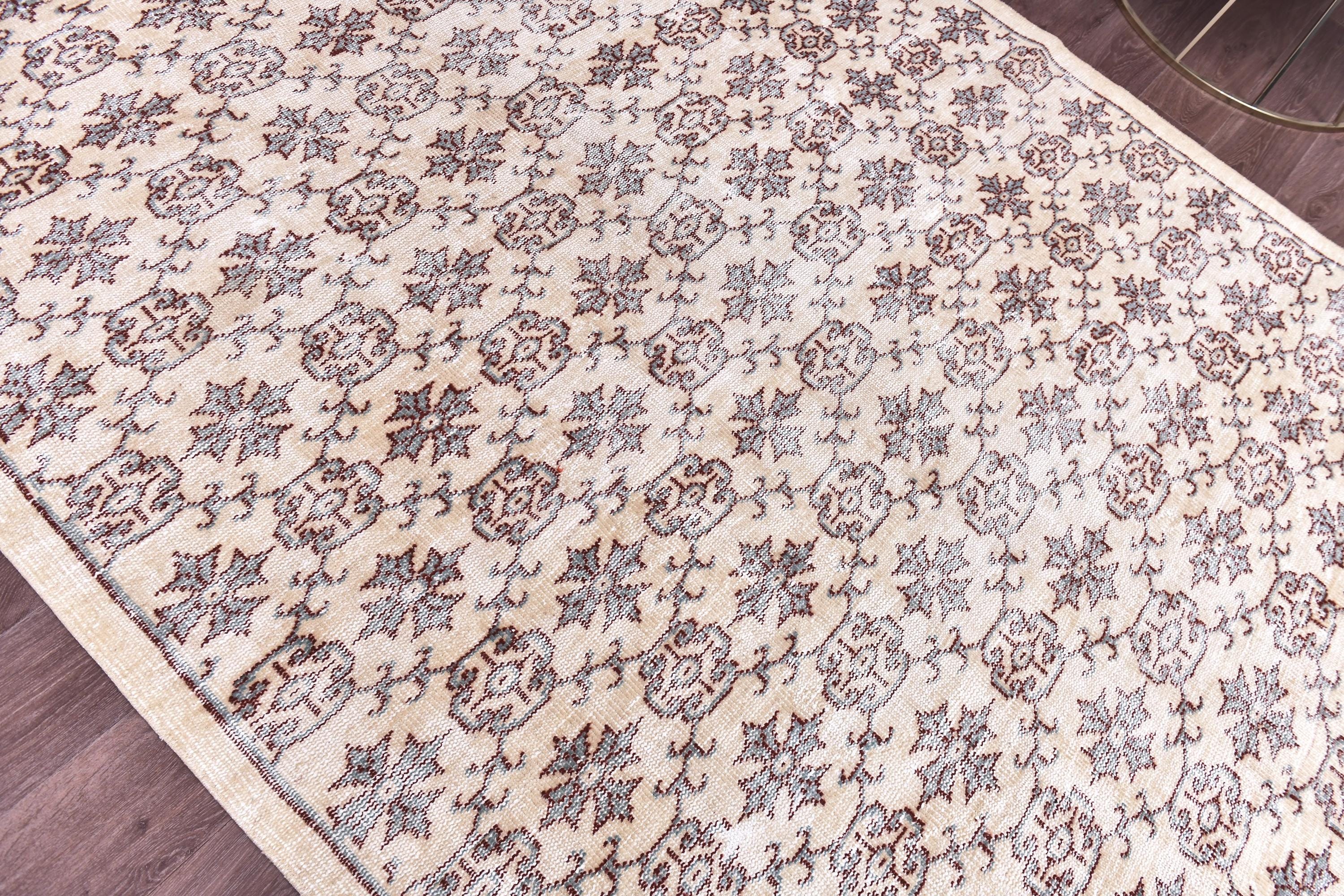📜📌 Vintage hand-knotted Turkish area rug in muted beige and cream tones featuring an all-over repeating floral medallion pattern with soft brown and gray botanical motifs on distressed wool pile