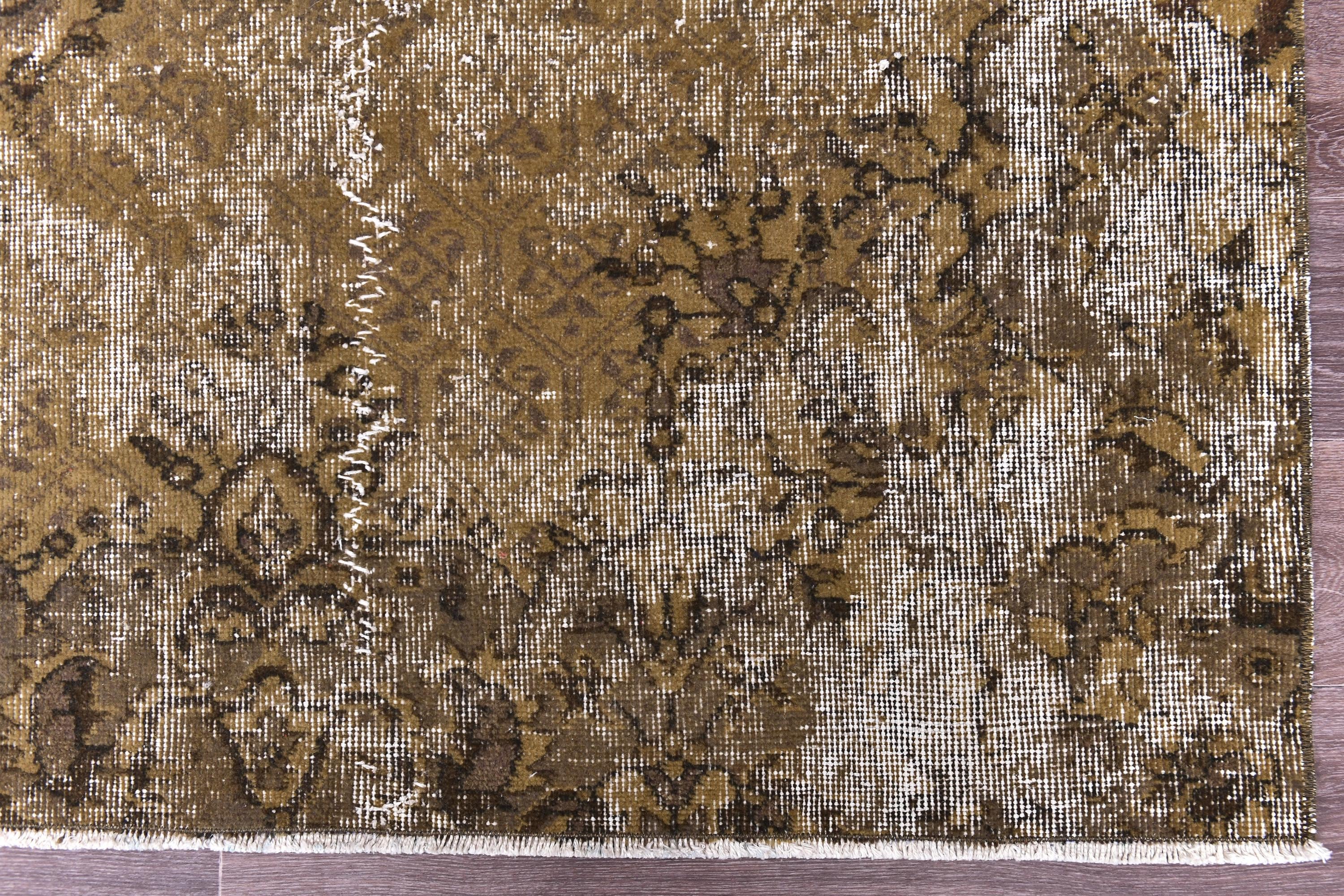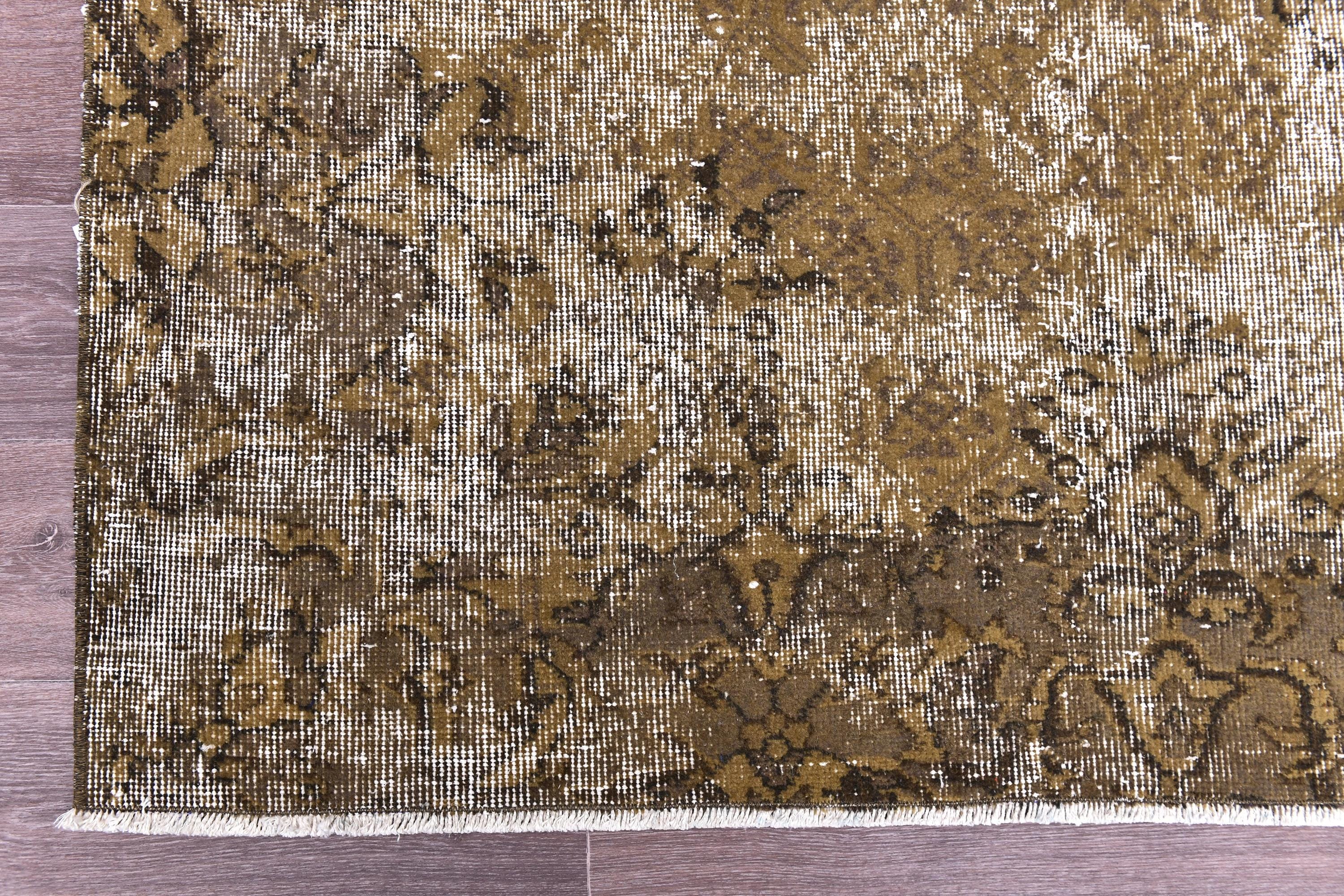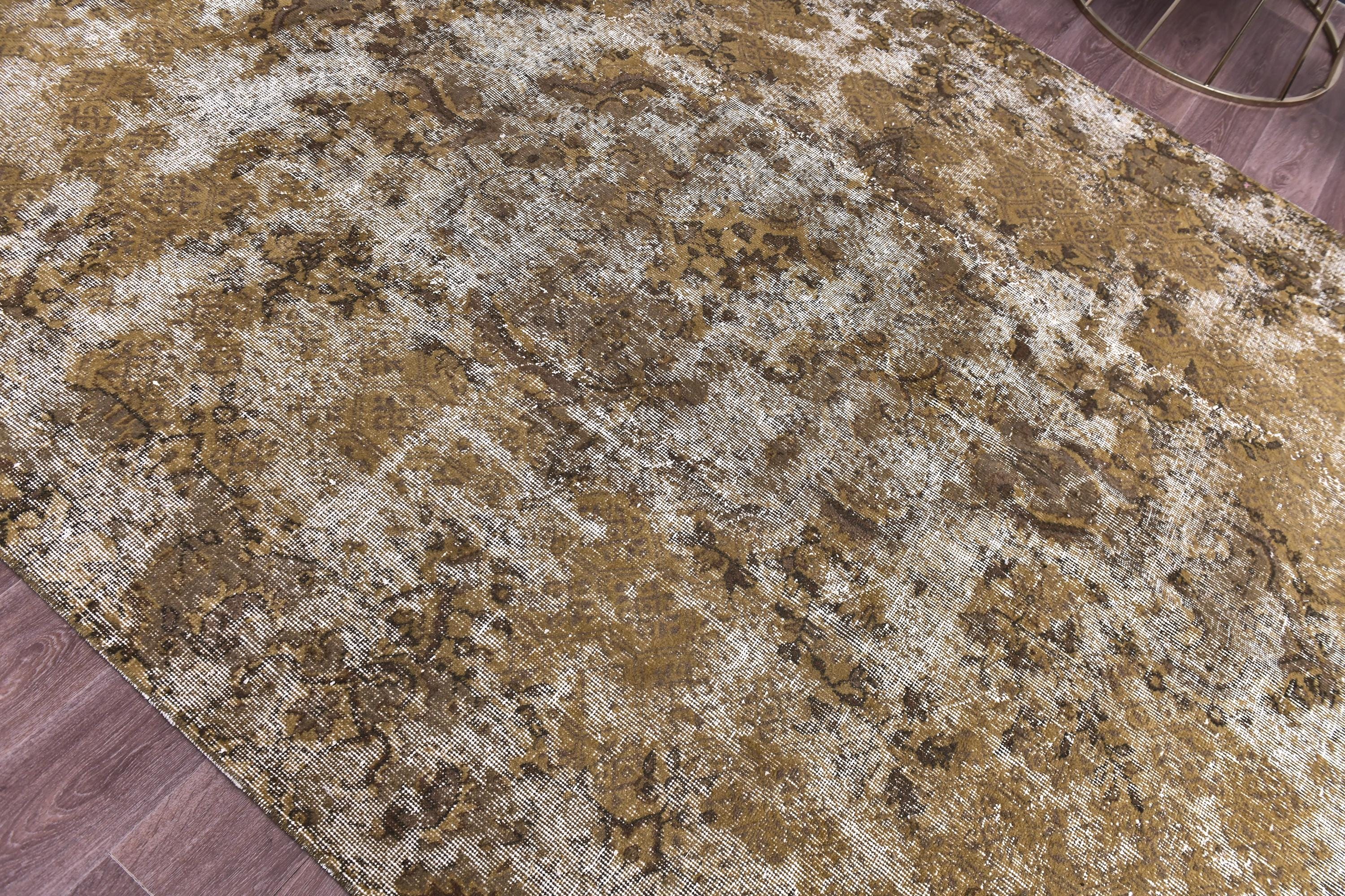 📜📌 Overdyed vintage Turkish area rug featuring heavily distressed abstract pattern in olive green, mustard gold, and cream tones with faded medallion design on worn wool pile creating modern artistic effect