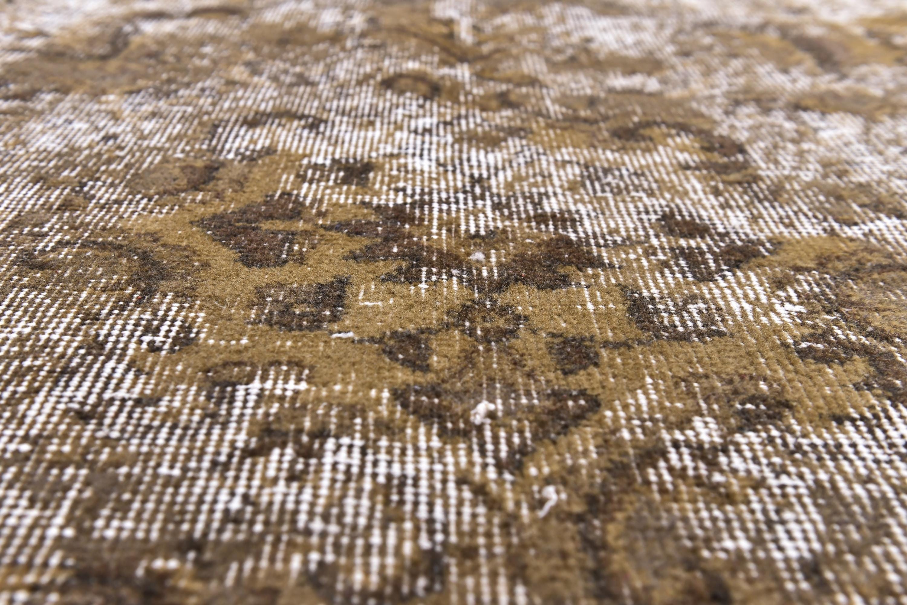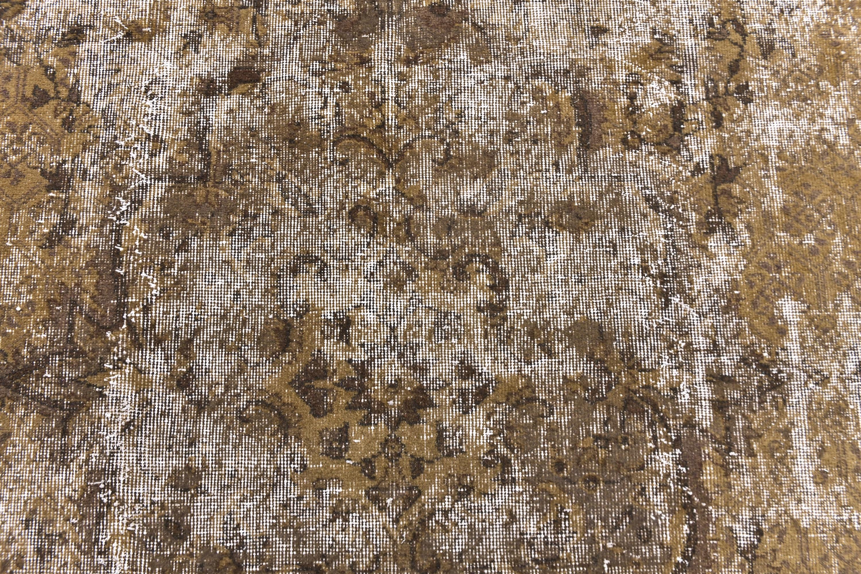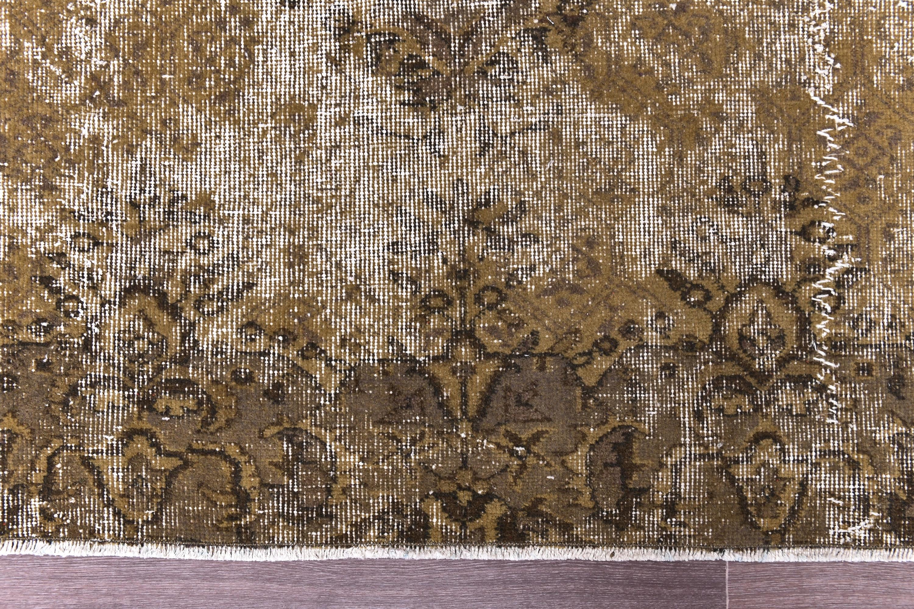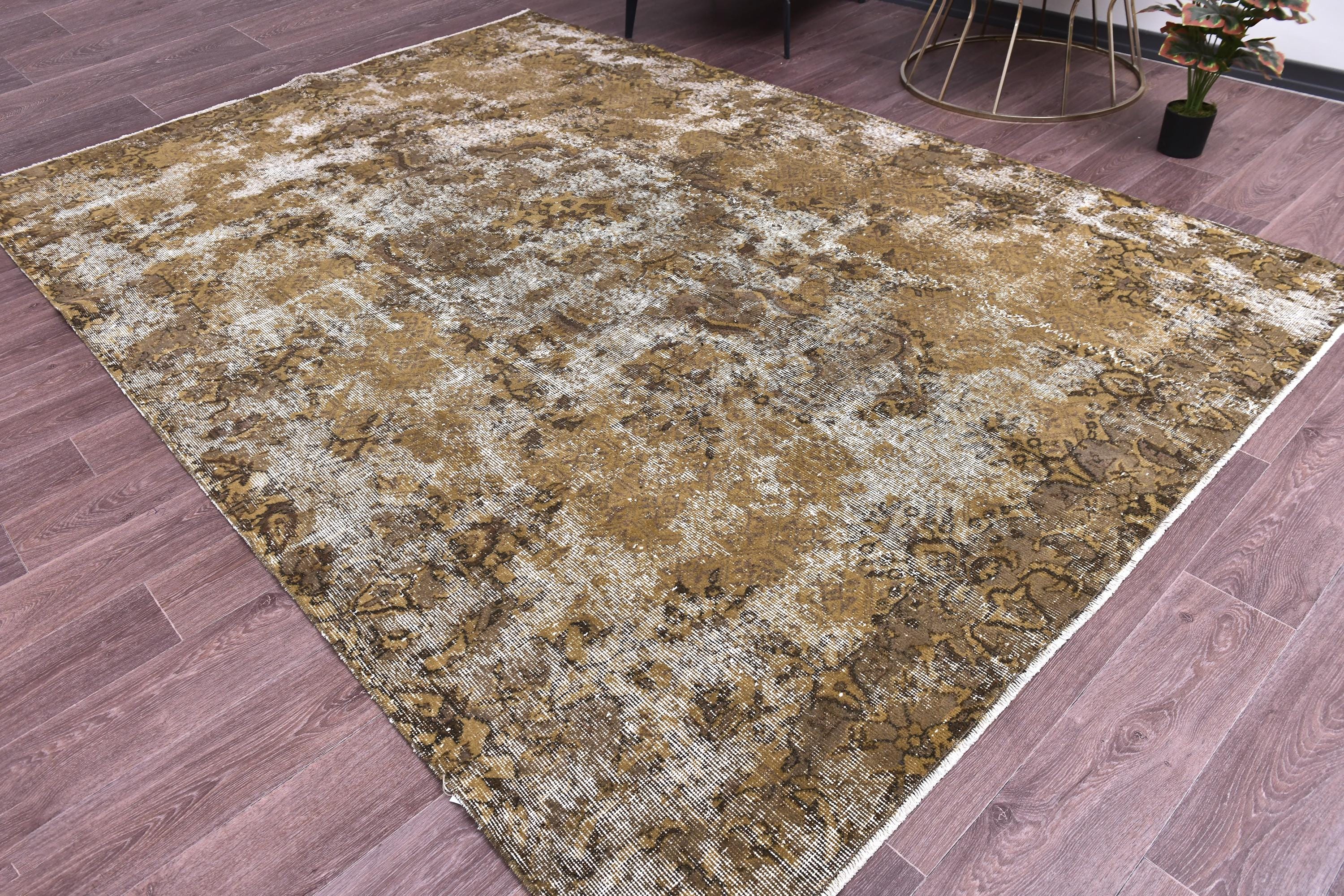 📜📌 Overdyed vintage Turkish area rug featuring heavily distressed abstract pattern in olive green, mustard gold, and cream tones with faded medallion design on worn wool pile creating modern artistic effect