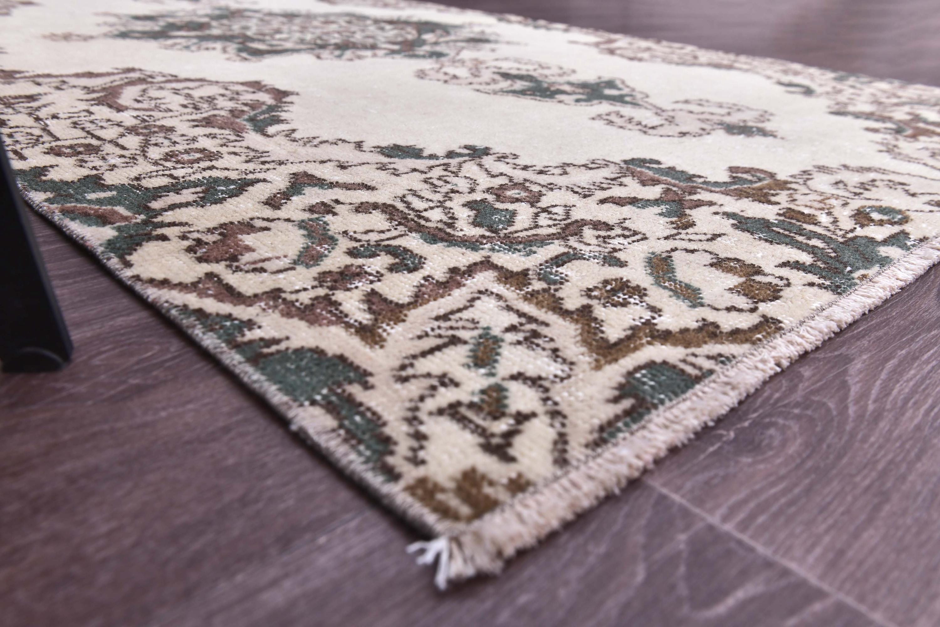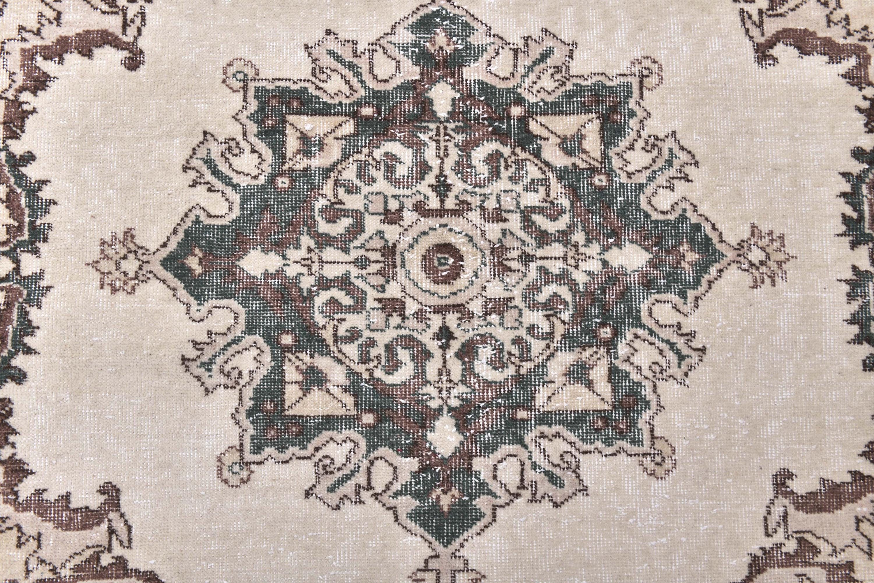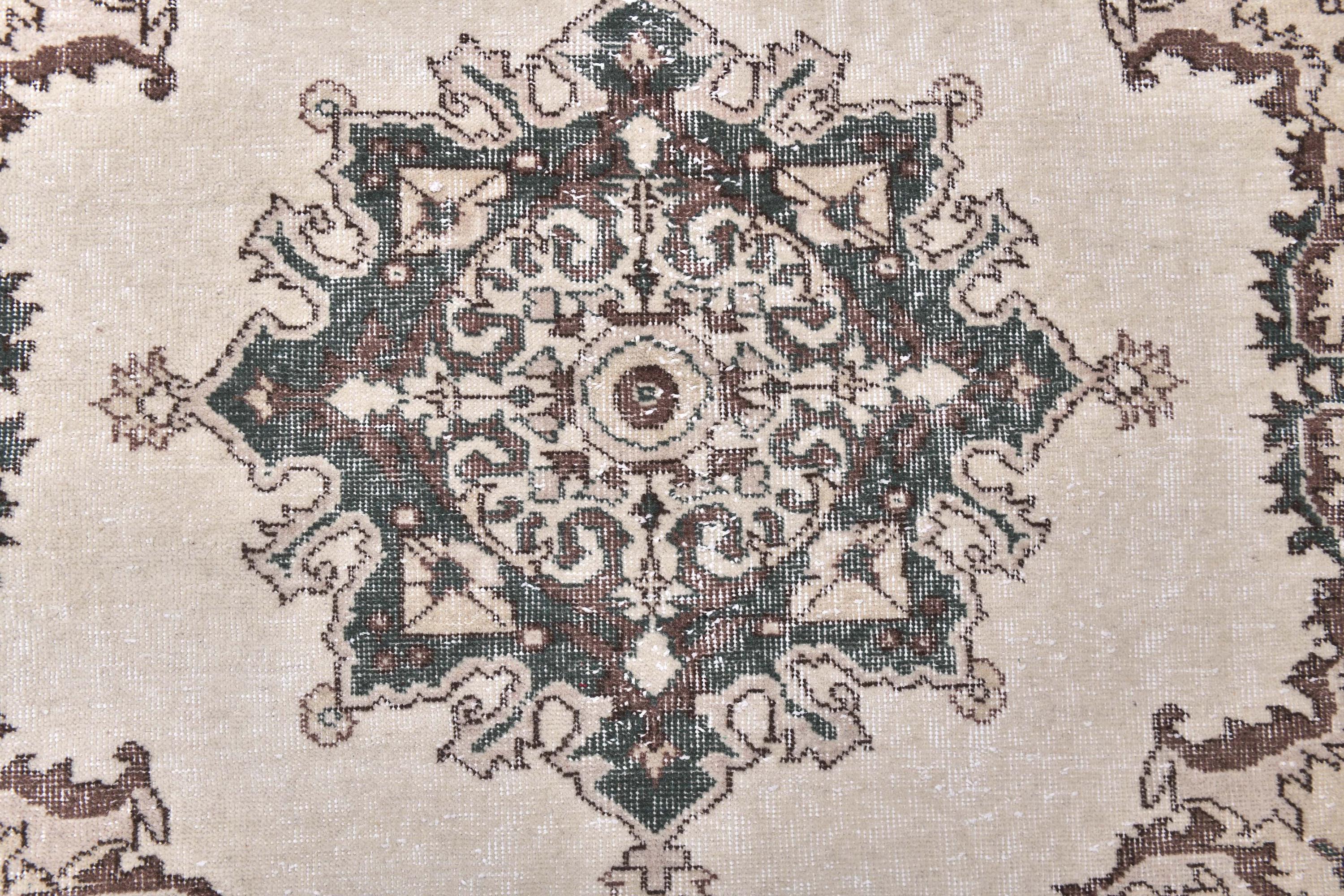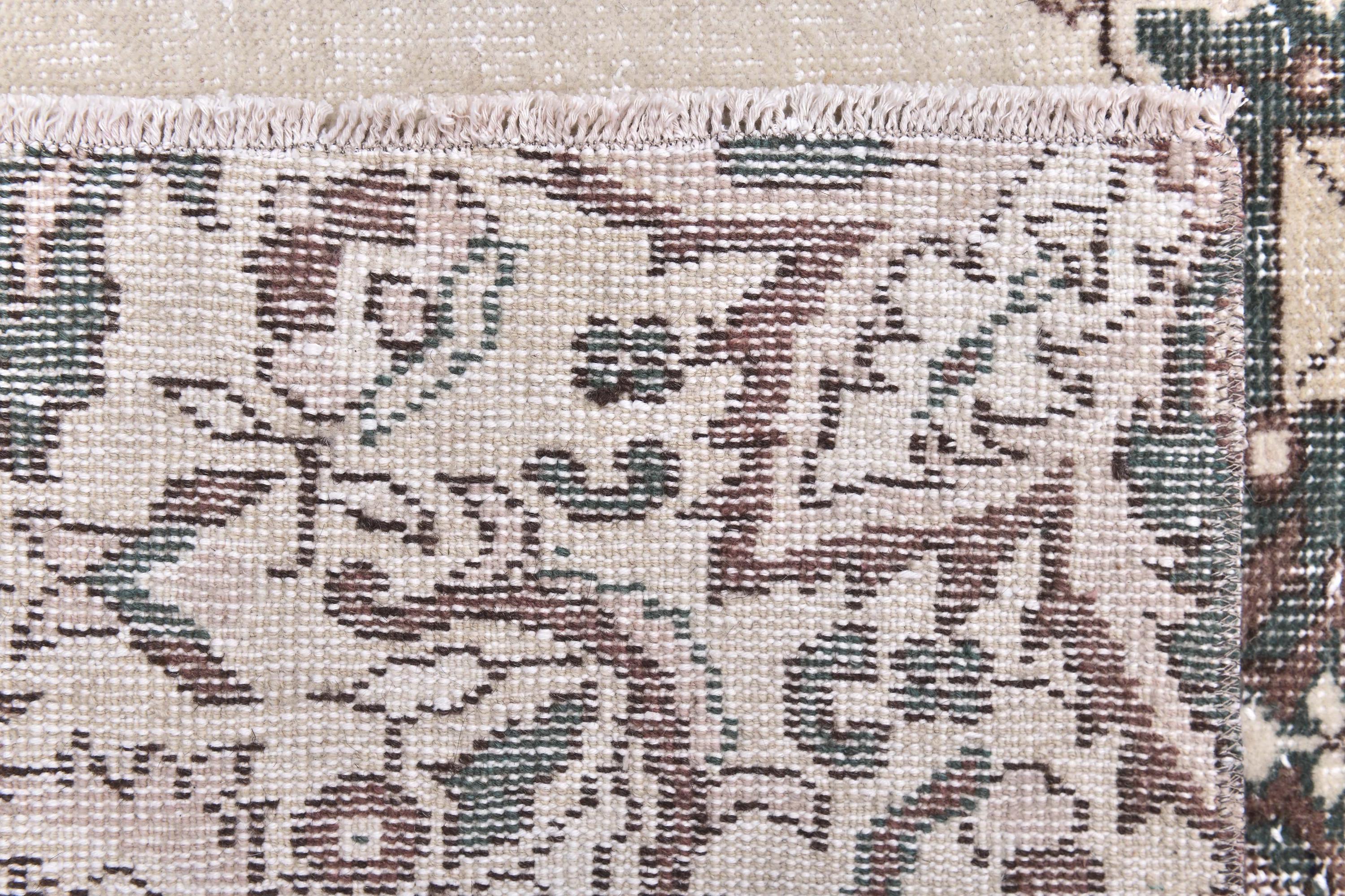 📜📌 Vintage hand-knotted Turkish area rug featuring elegant central medallion design in hunter green and brown on cream ivory field with ornate floral border scrollwork and traditional fringed edges