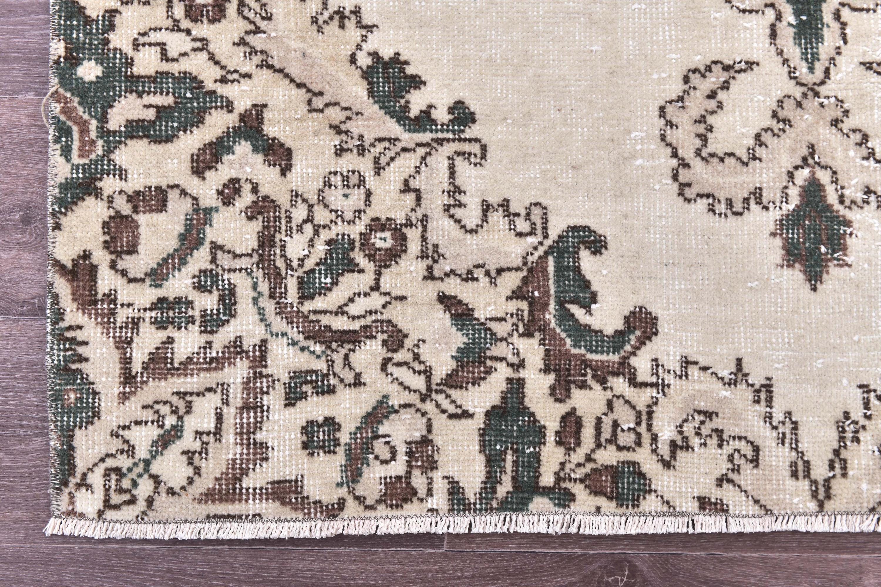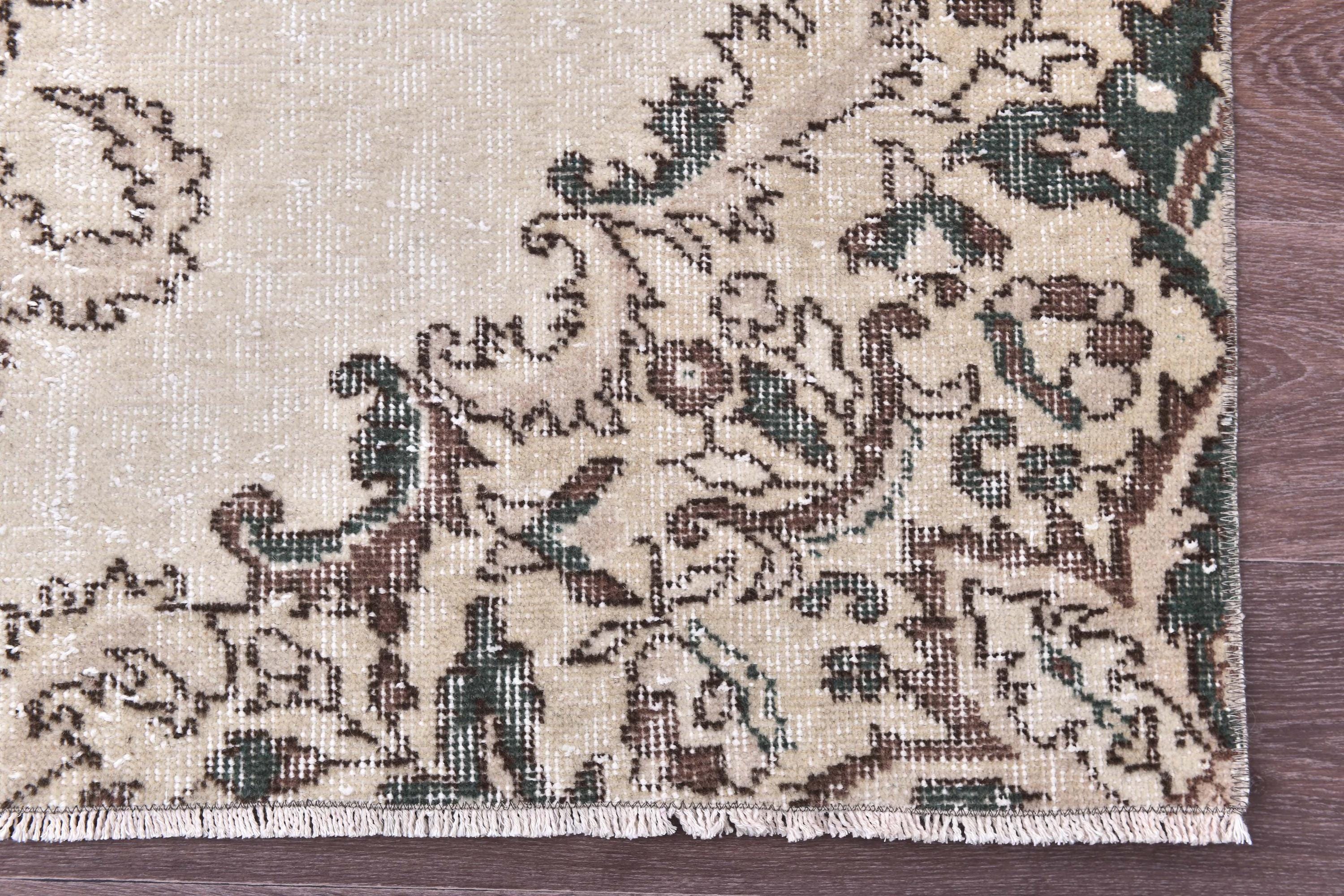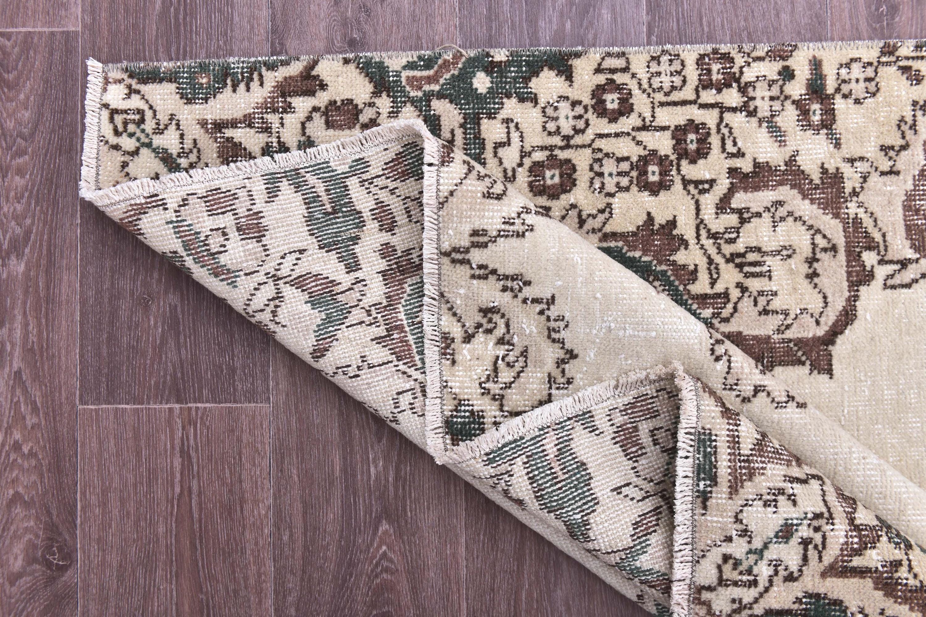 📜📌 Vintage hand-knotted Turkish area rug featuring elegant central medallion design in hunter green and brown on cream ivory field with ornate floral border scrollwork and traditional fringed edges