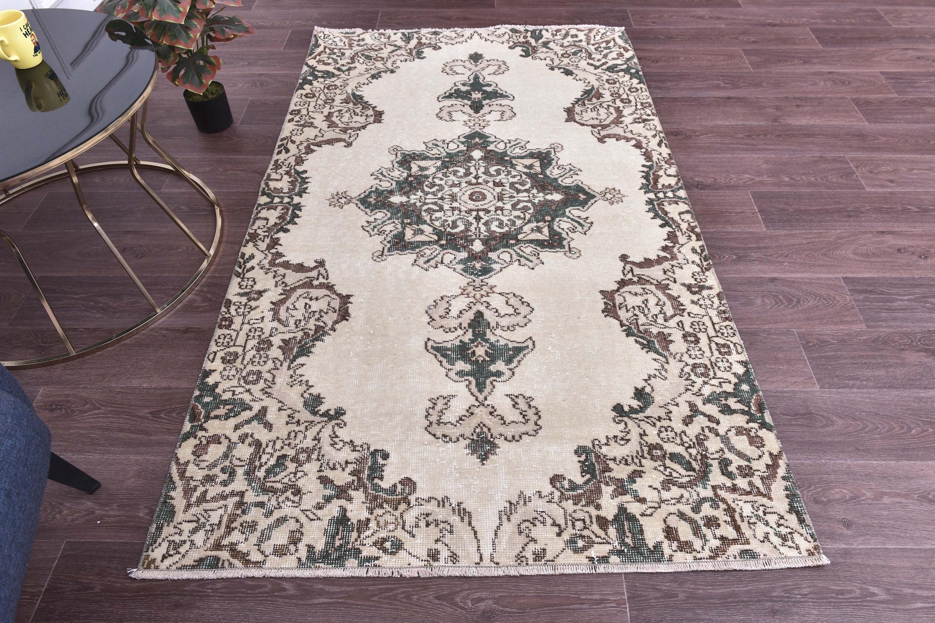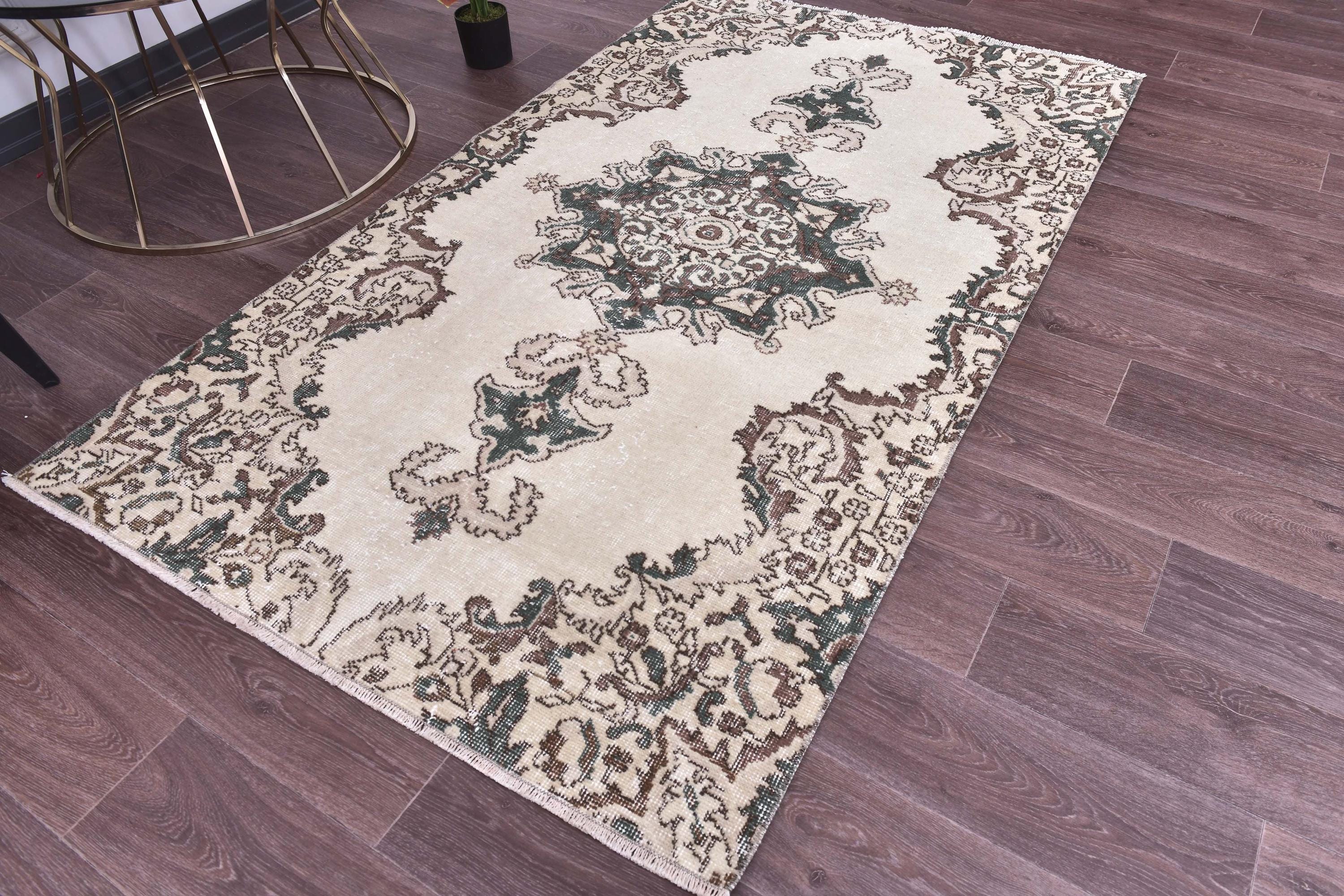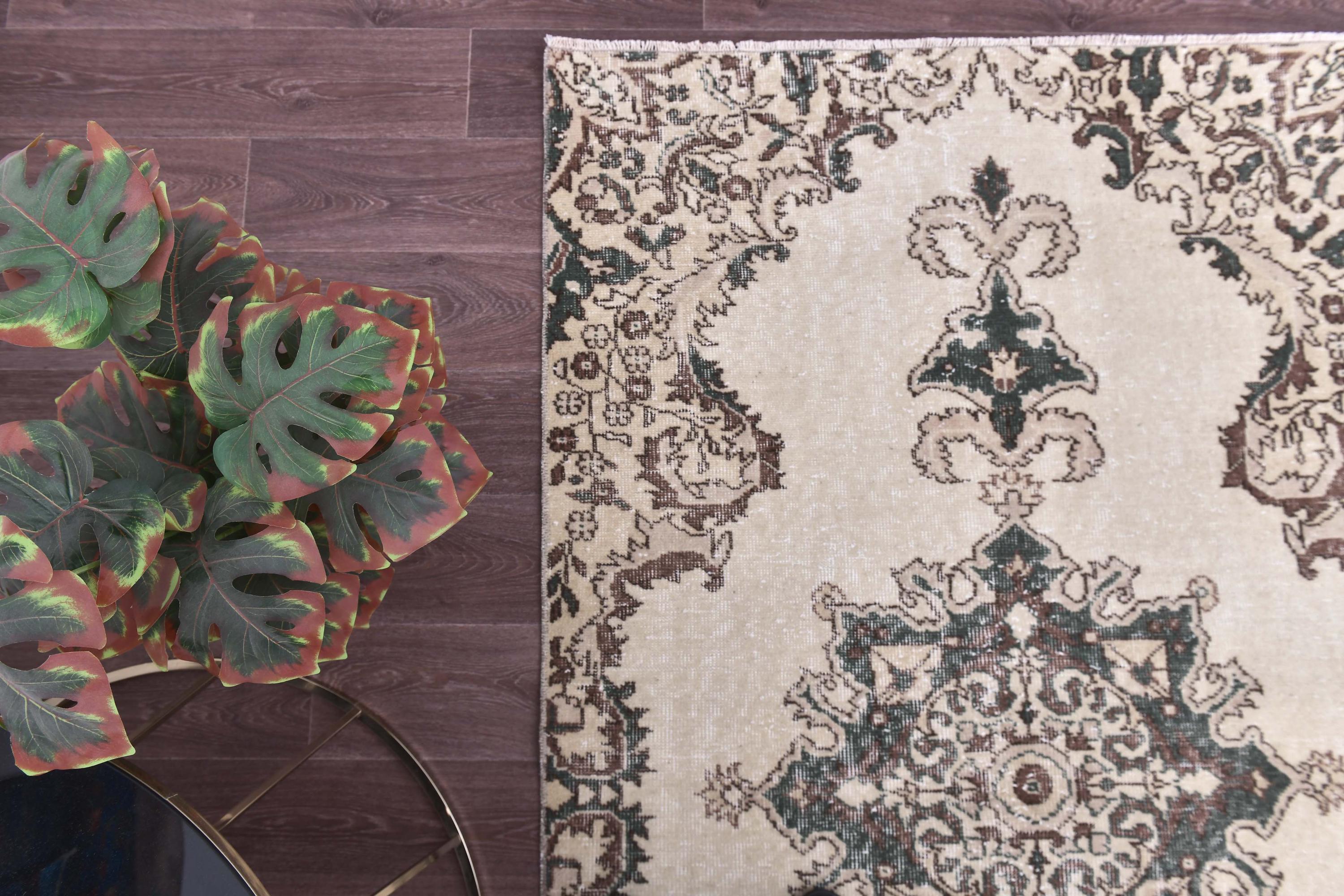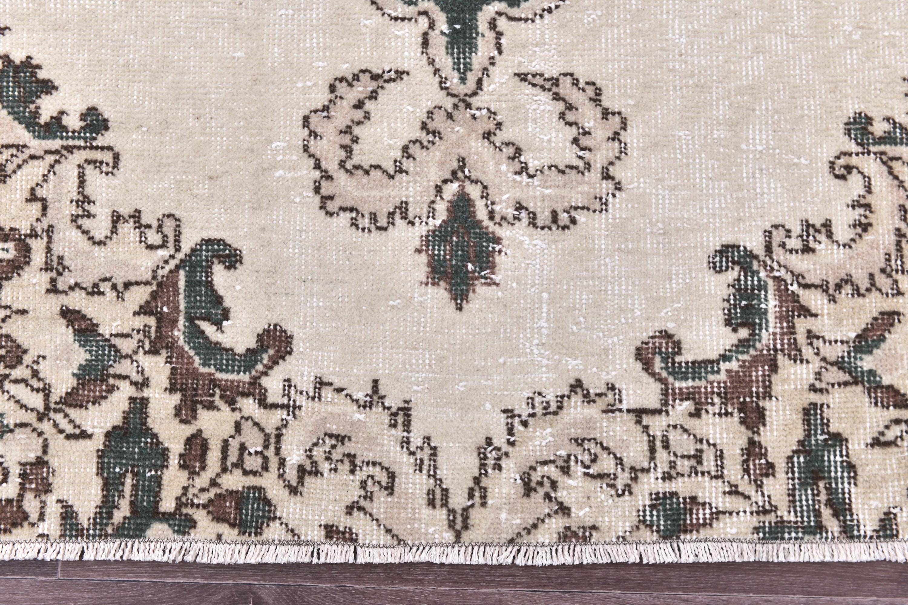 📜📌 Vintage hand-knotted Turkish area rug featuring elegant central medallion design in hunter green and brown on cream ivory field with ornate floral border scrollwork and traditional fringed edges