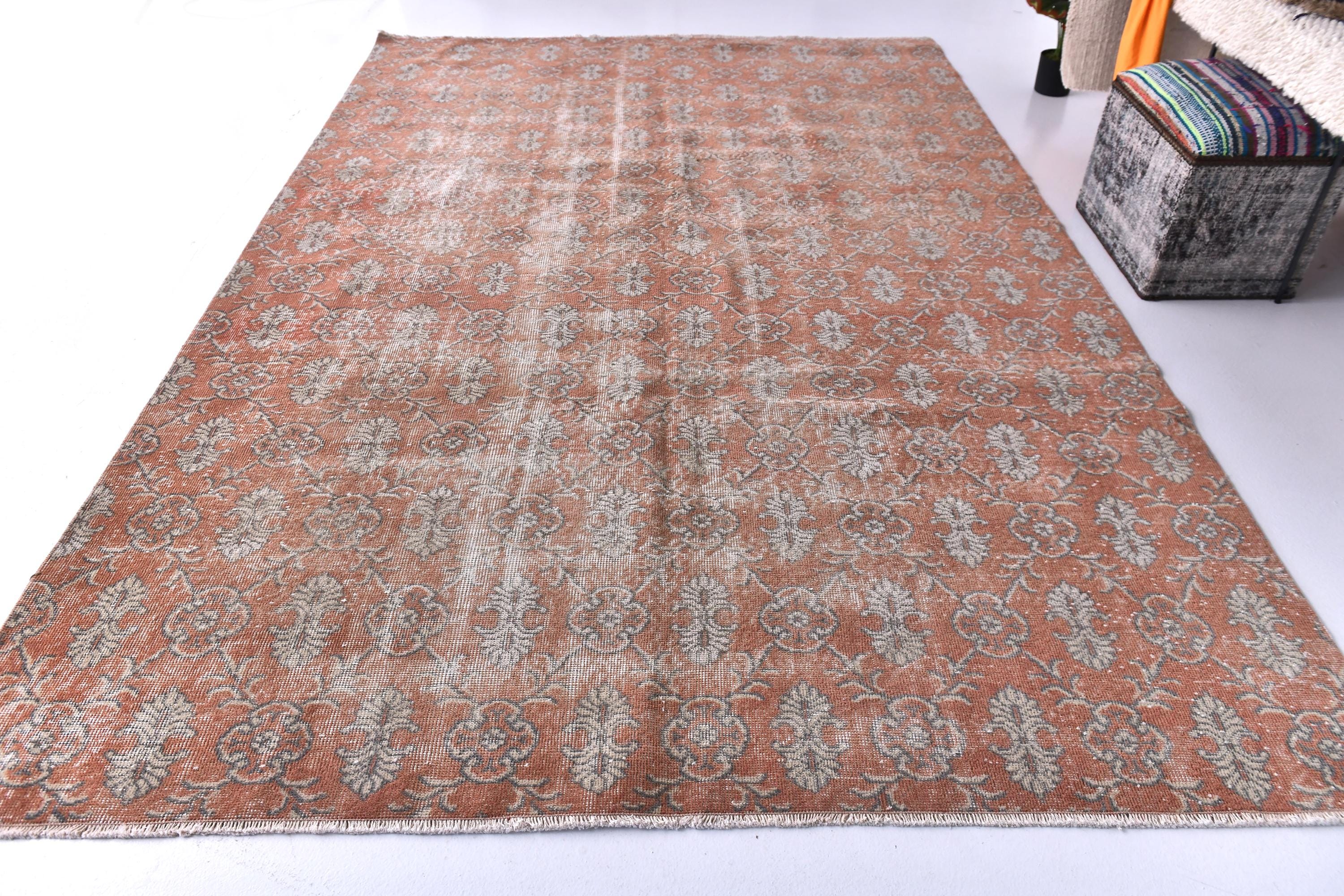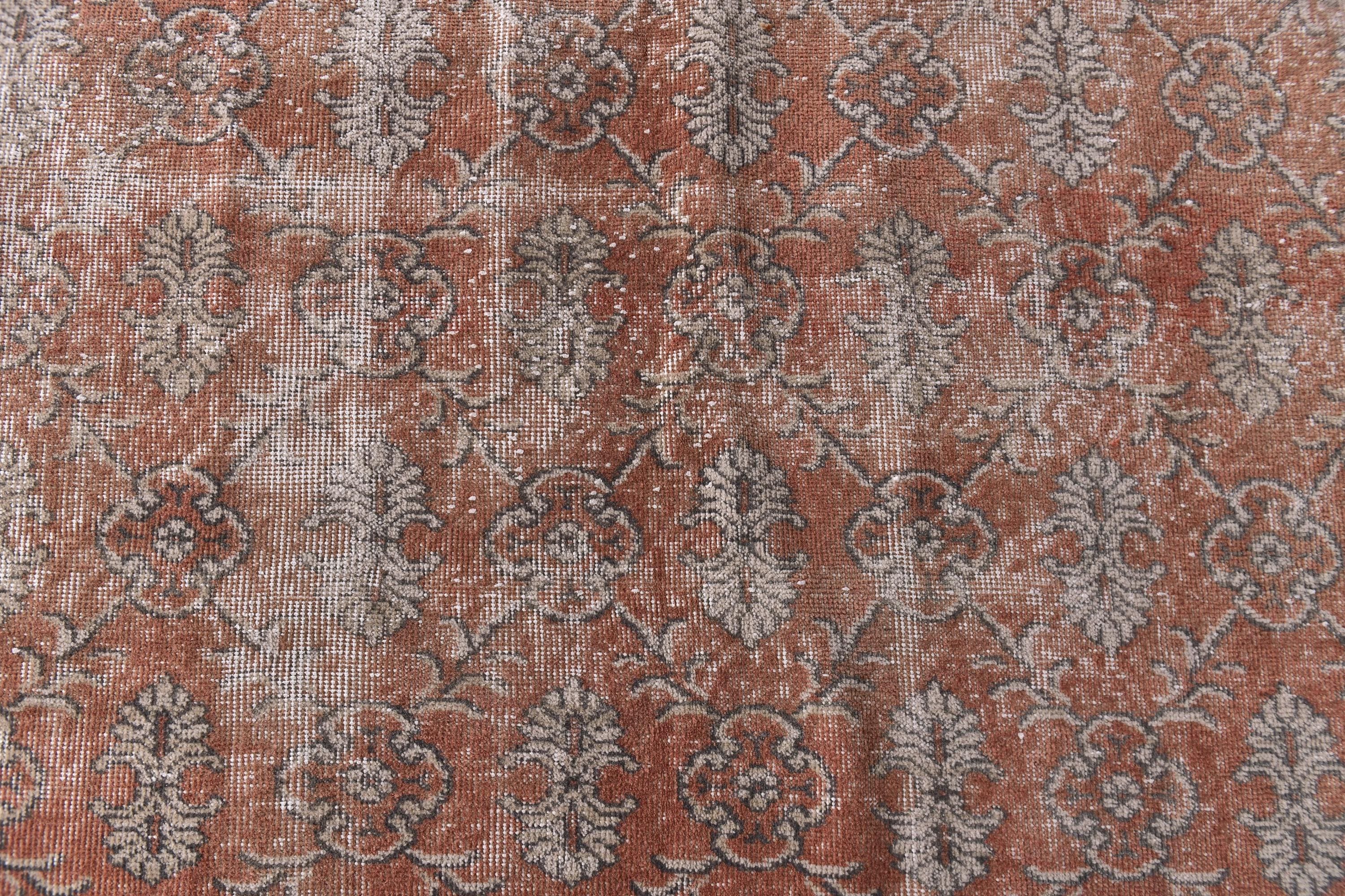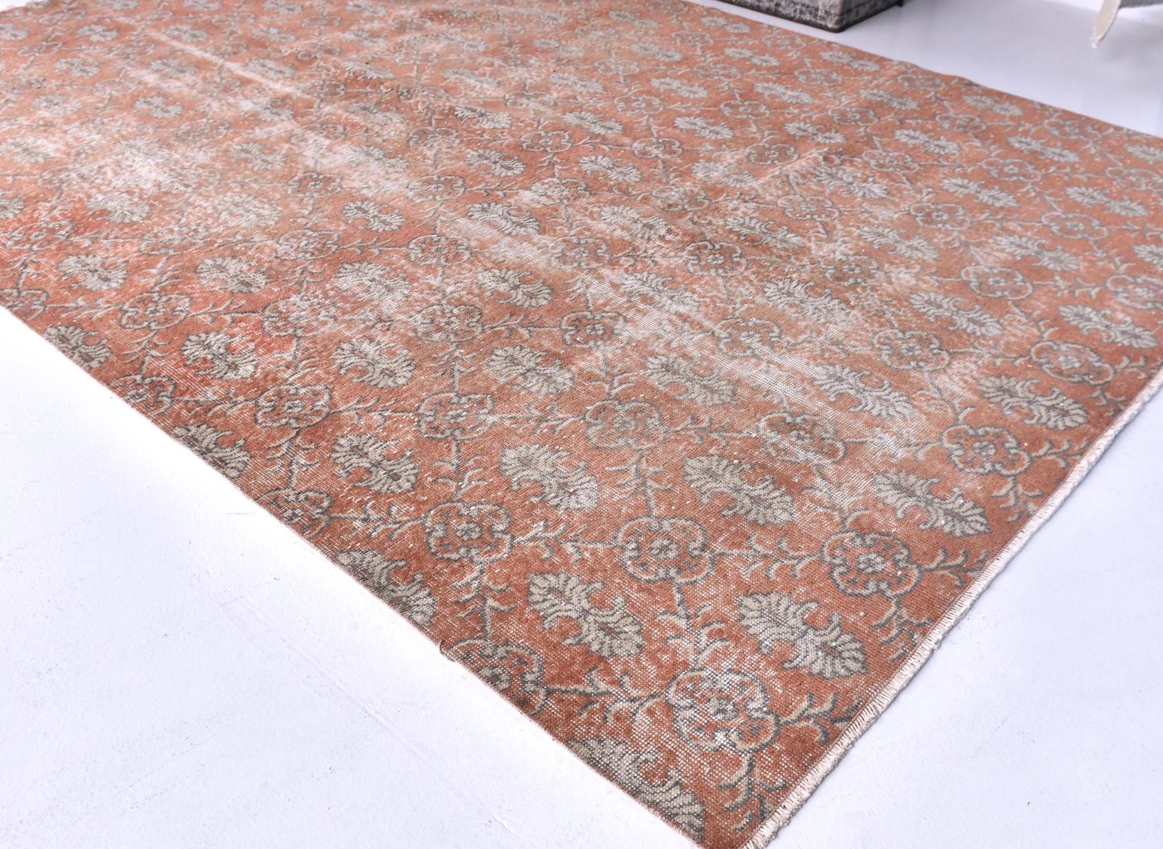 📜📌 Vintage hand-knotted Turkish area rug featuring distressed coral red and terracotta base with sage green and beige floral medallion patterns. The worn, faded appearance showcases authentic age and character with visible warp threads creating a textured, time-worn aesthetic perfect for bohemian or eclectic interiors.